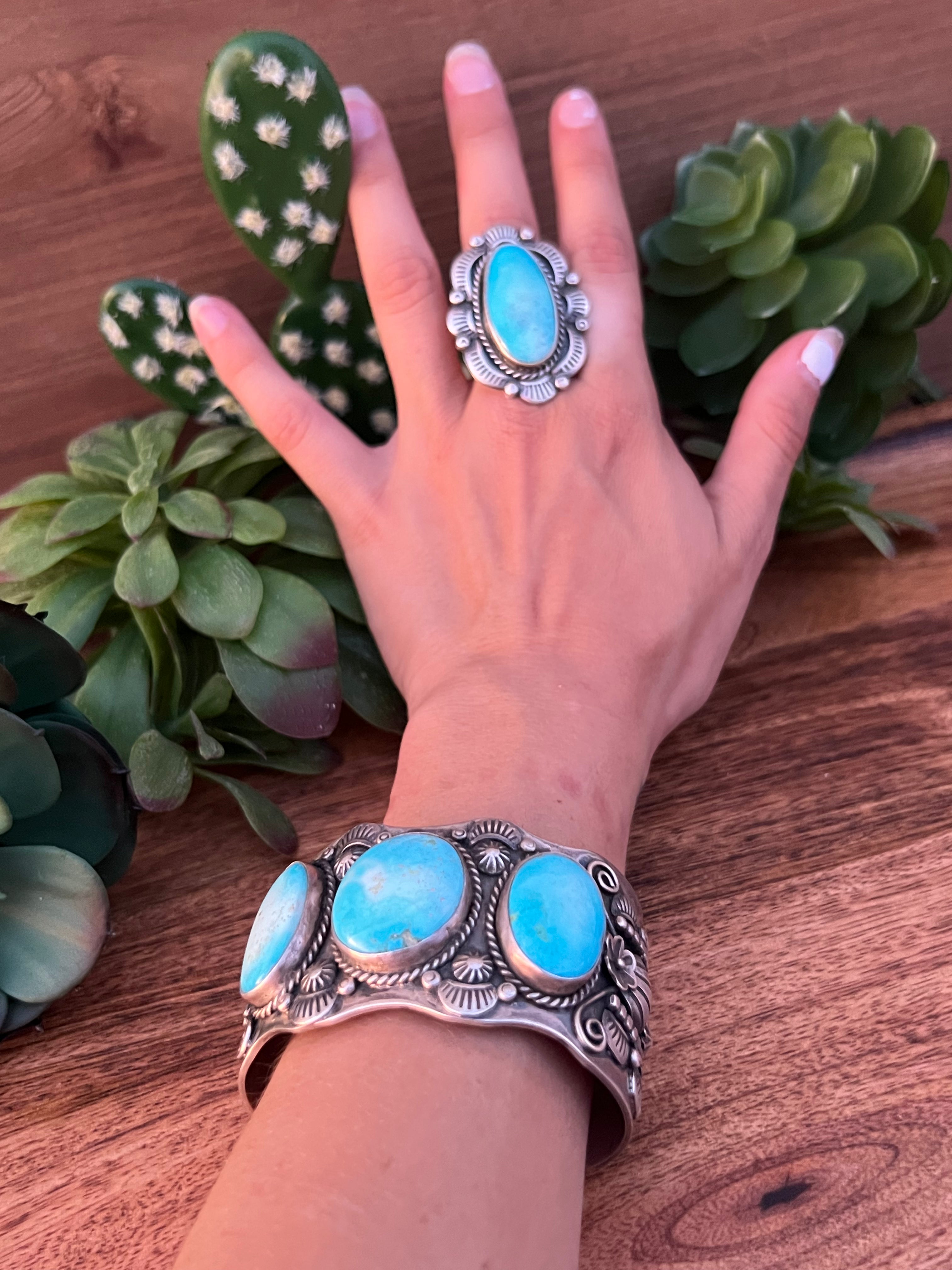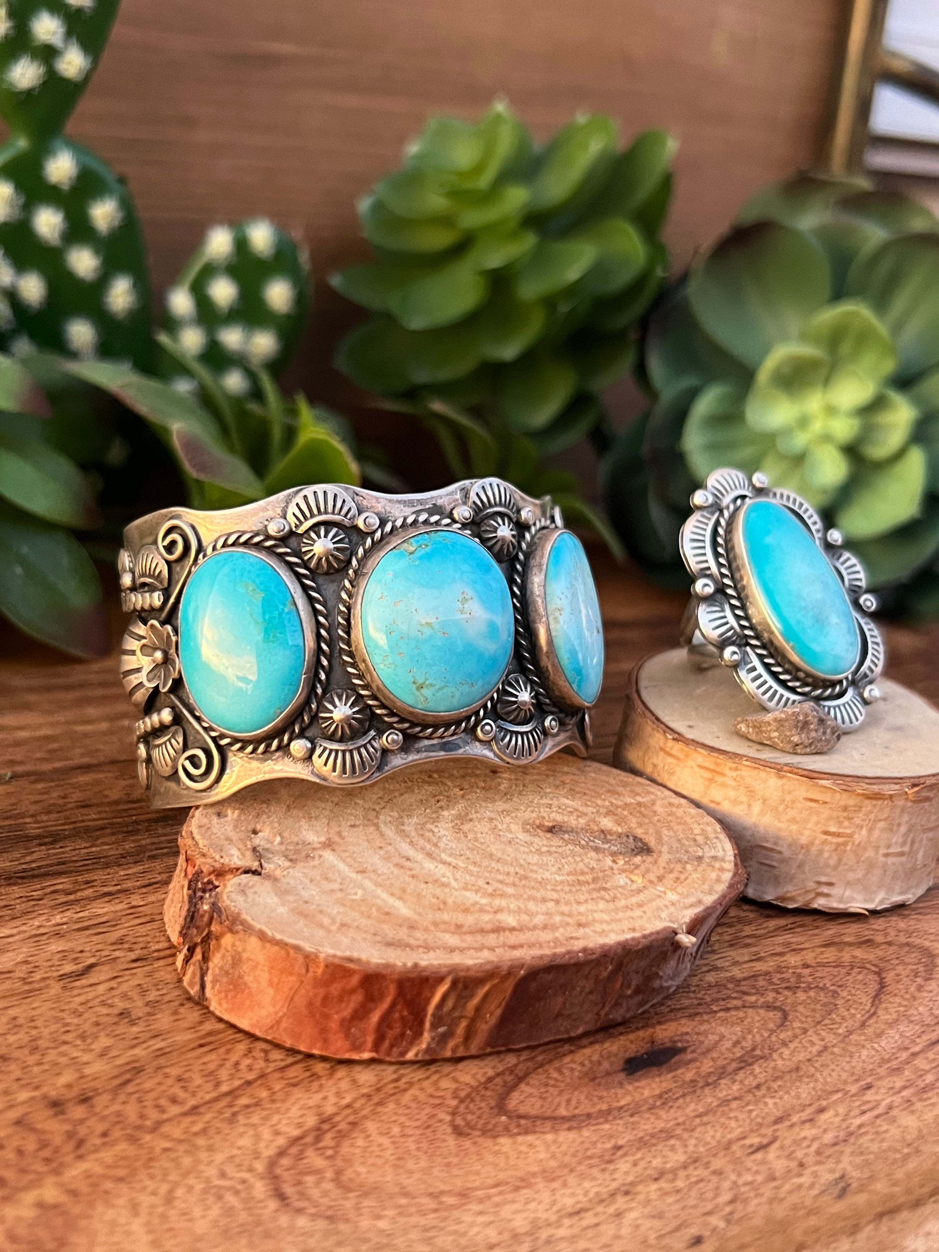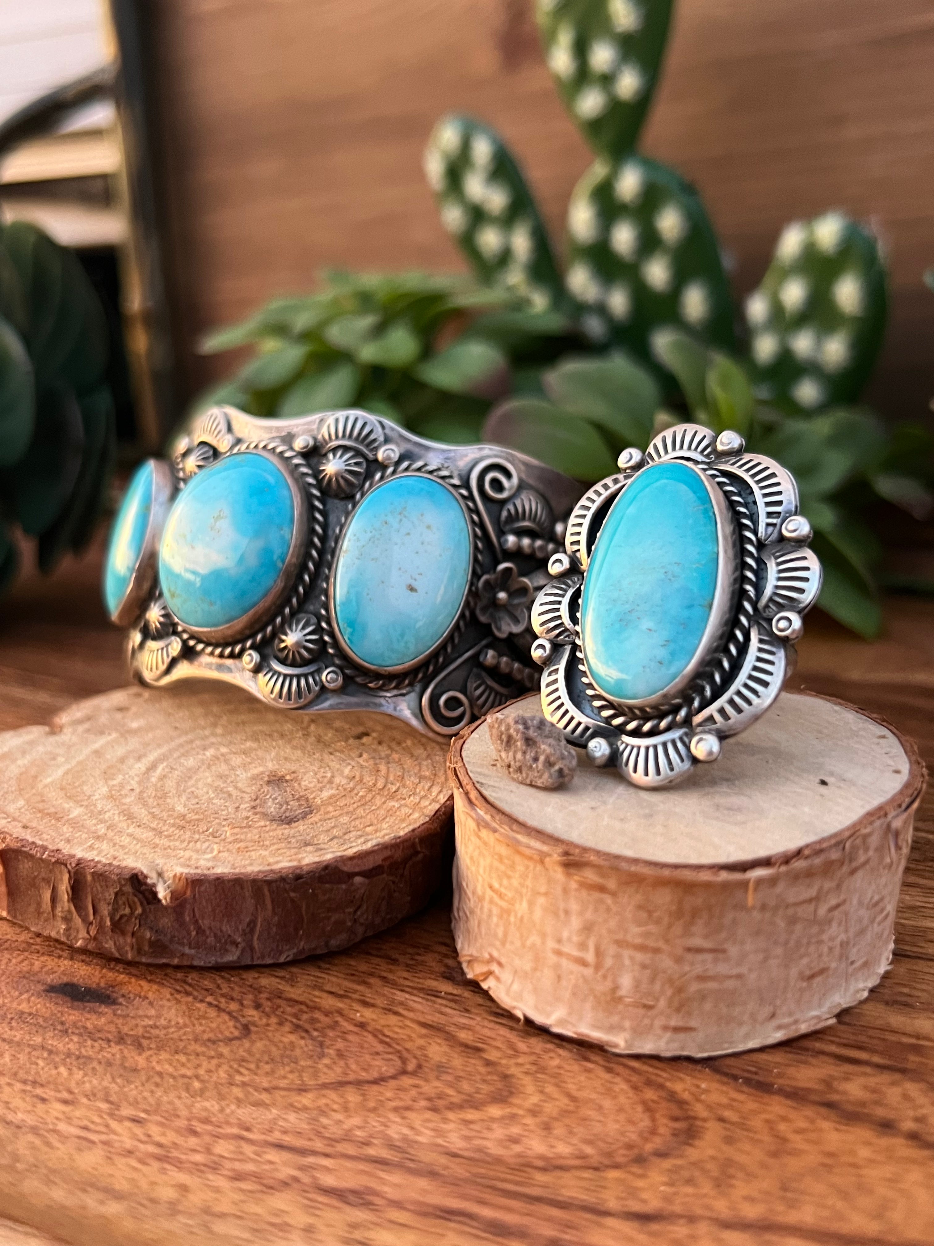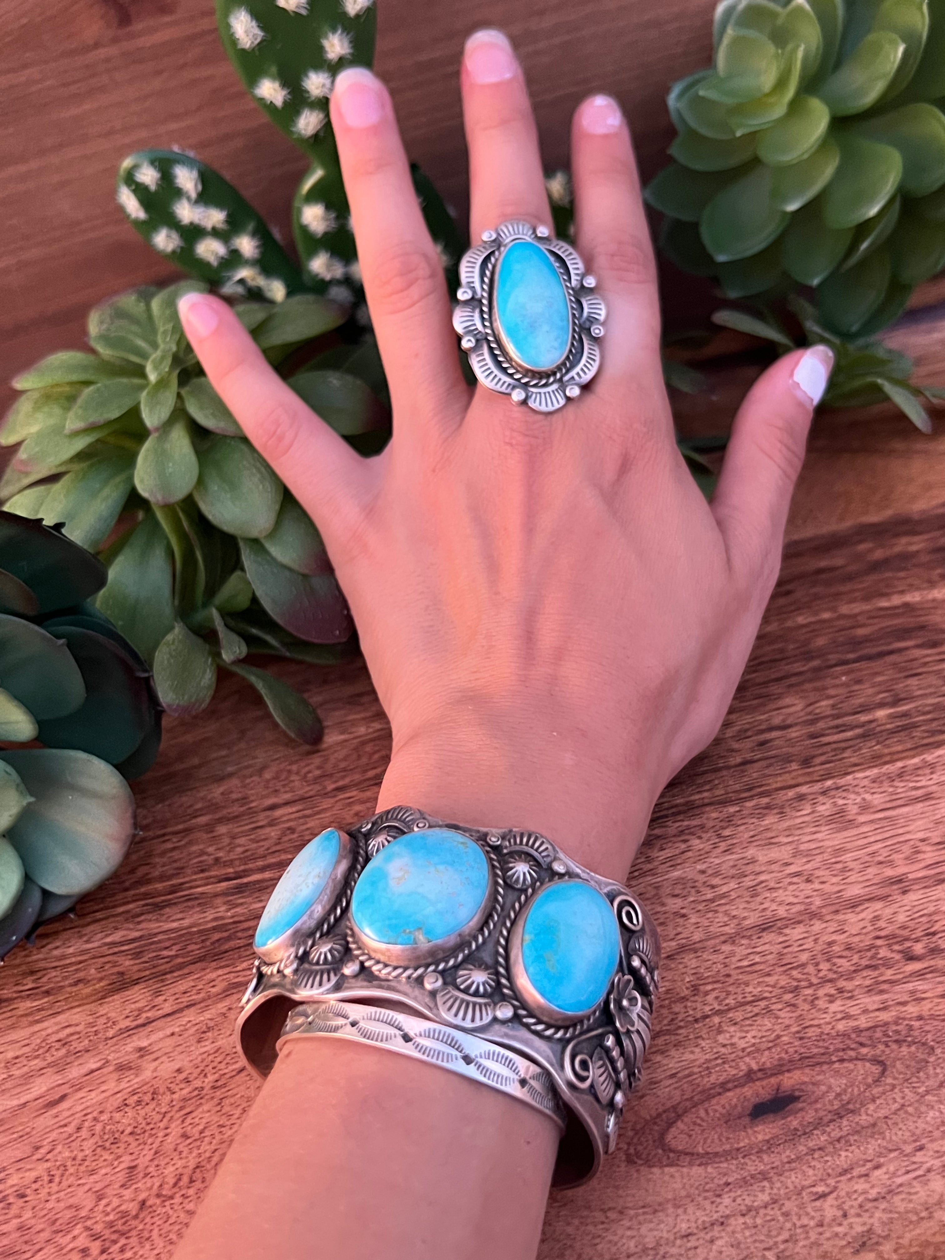 Navajo Big Nugget Turquoise & Sterling Silver Cuff Bracelet & Ring Set Size 8