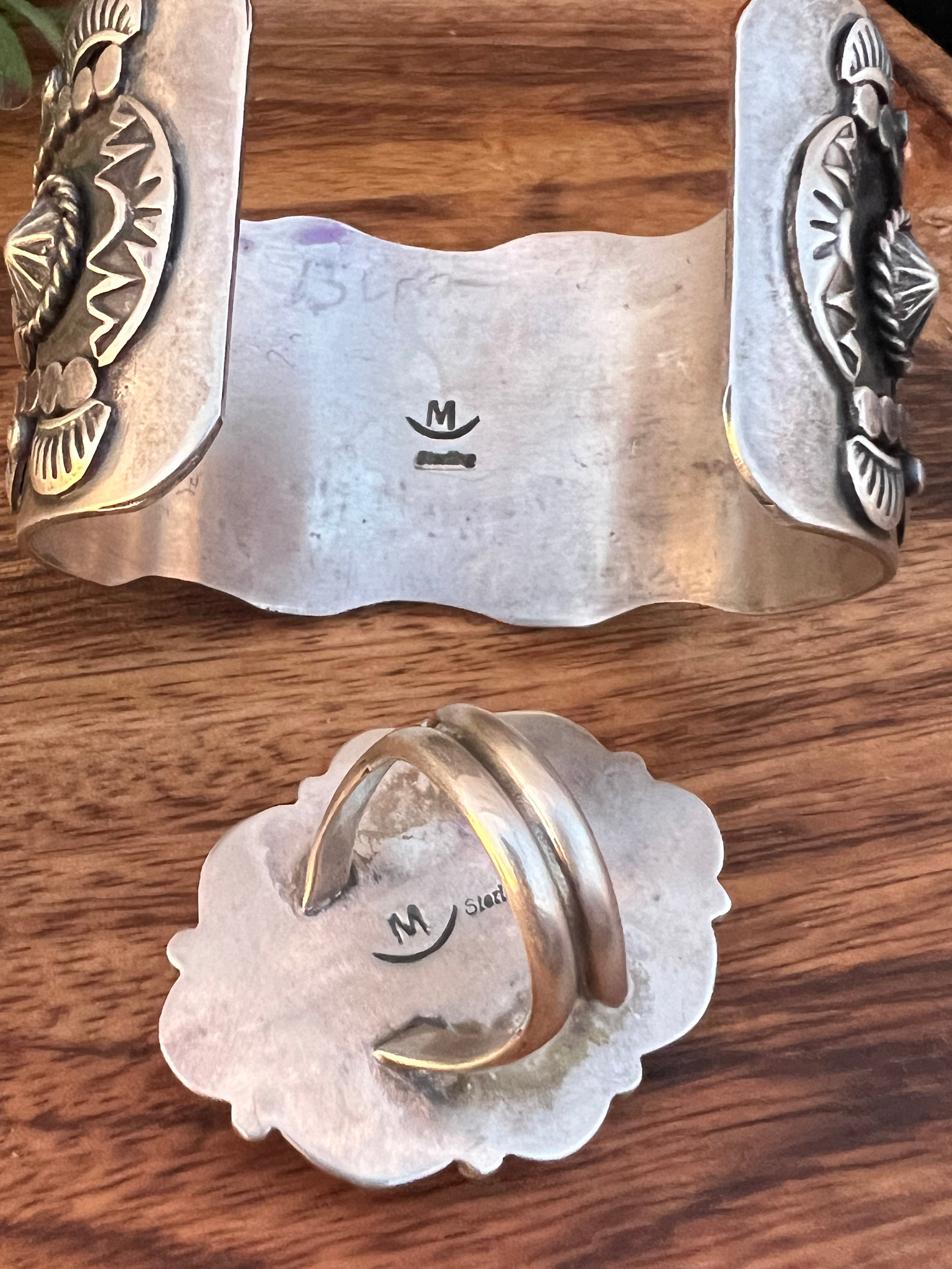 Navajo Big Nugget Turquoise & Sterling Silver Cuff Bracelet & Ring Set Size 8. The cuff measures 1 1/2 inches wide with an inside circumference of 5 1/4 inches & a gap of 1 1/8 inches while the ring is 1 5/8 inches long & 1 1/4 inches wide. Signed by the artist and stamped sterling silver.