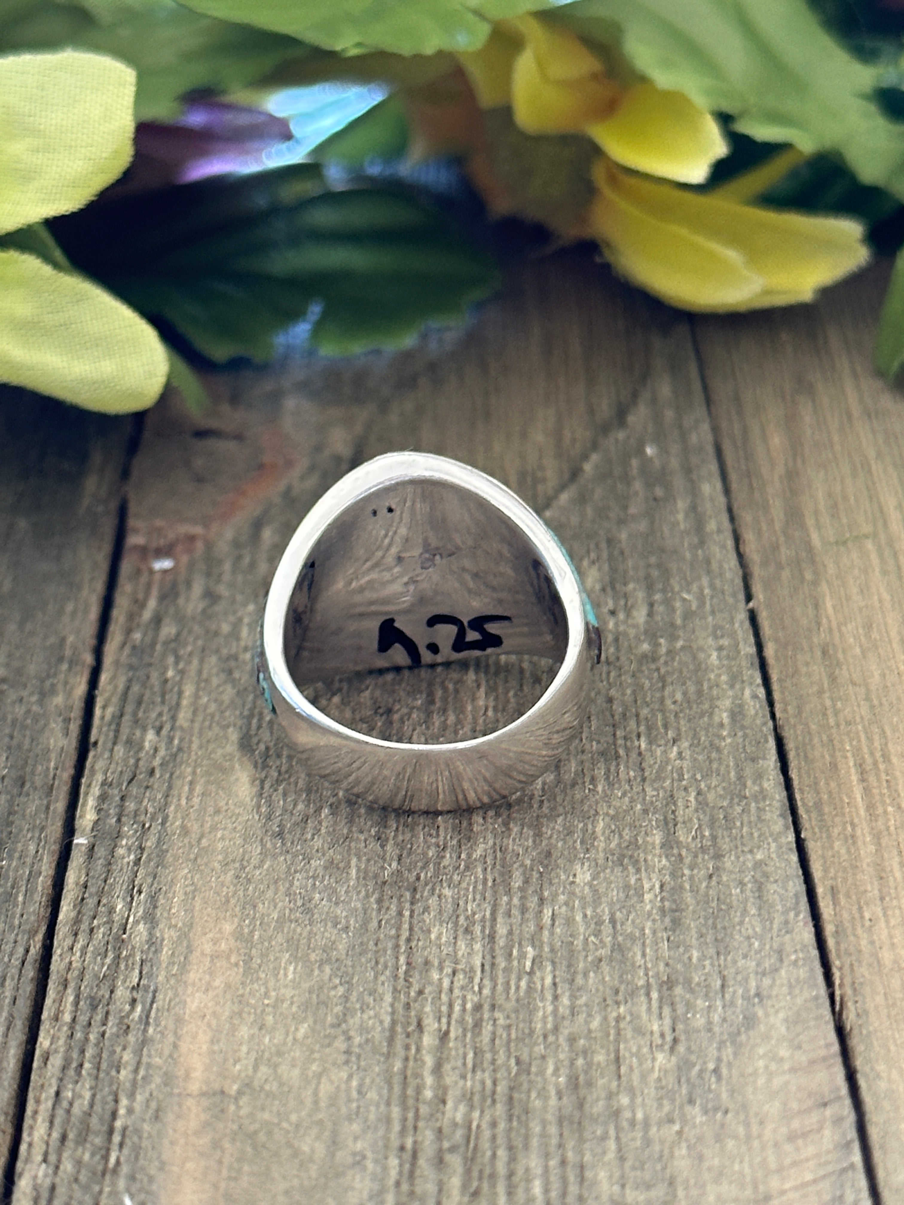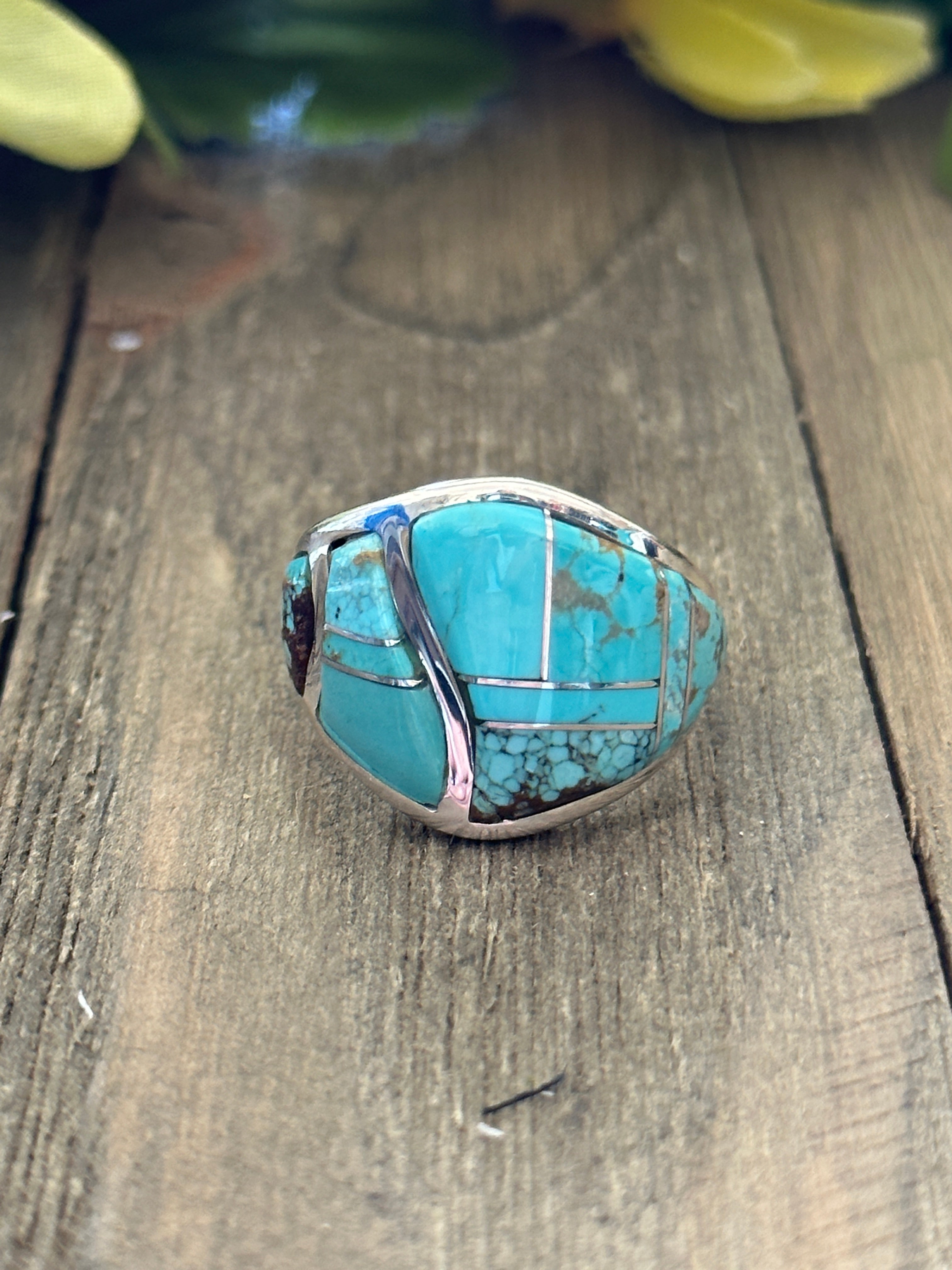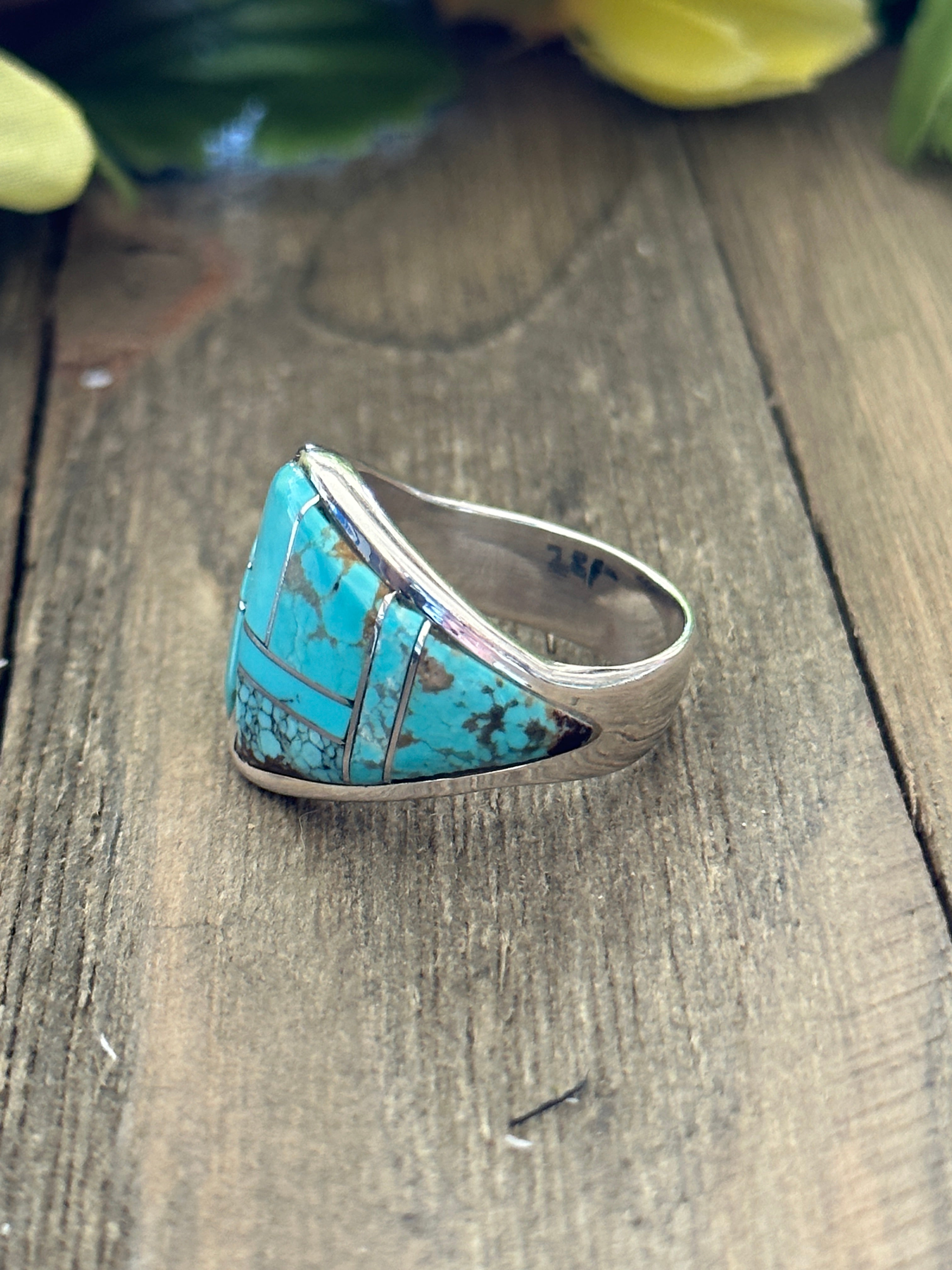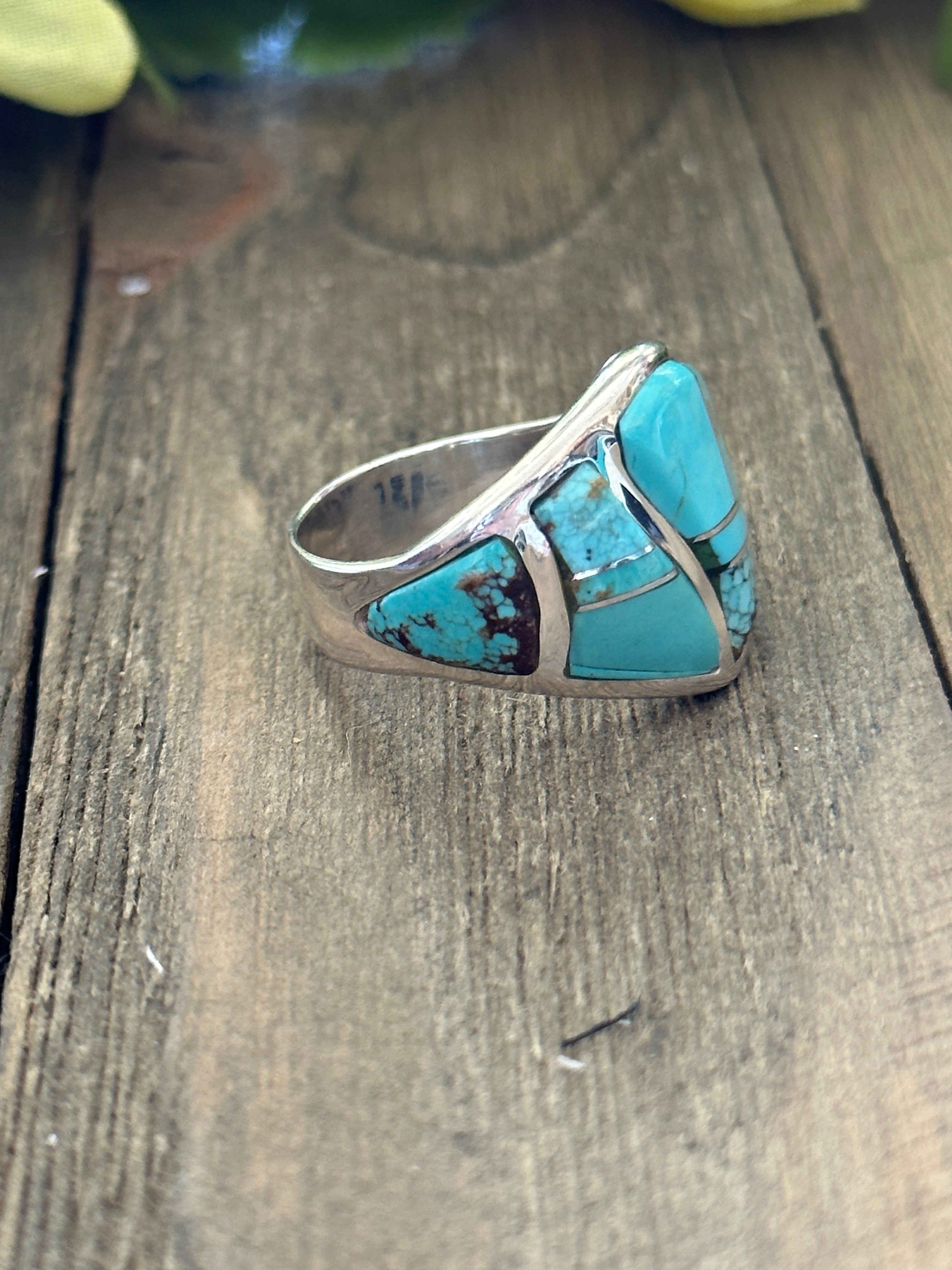 Navajo Made #8 Turquoise & Sterling Silver Inlay Ring Size 9.25