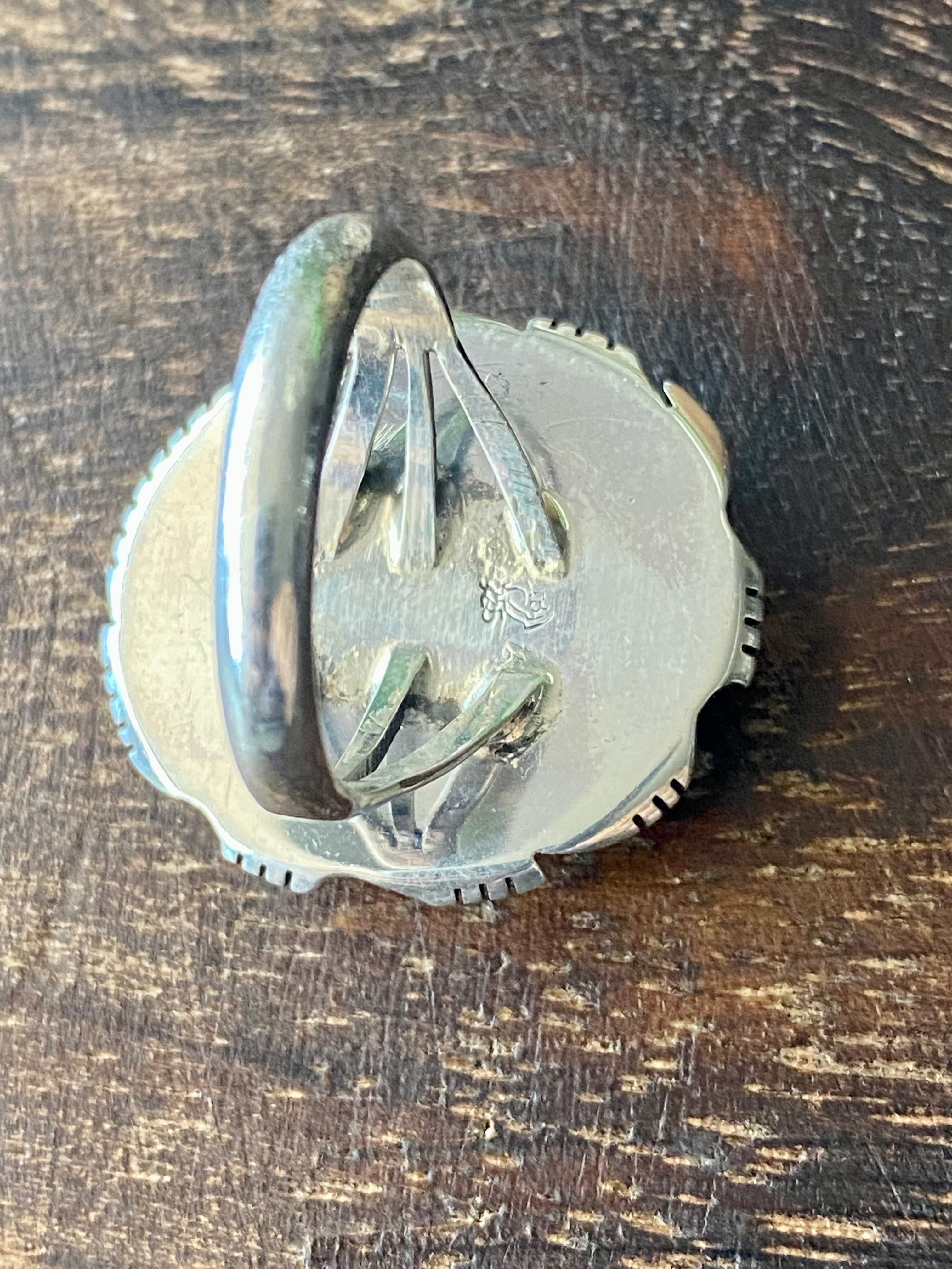 Navajo Made Australian Gaspeite & Sterling Silver Ring Size 7.5. It measures just over 1 inch long and 1 inch wide. Signed by the artist and stamped sterling silver.
