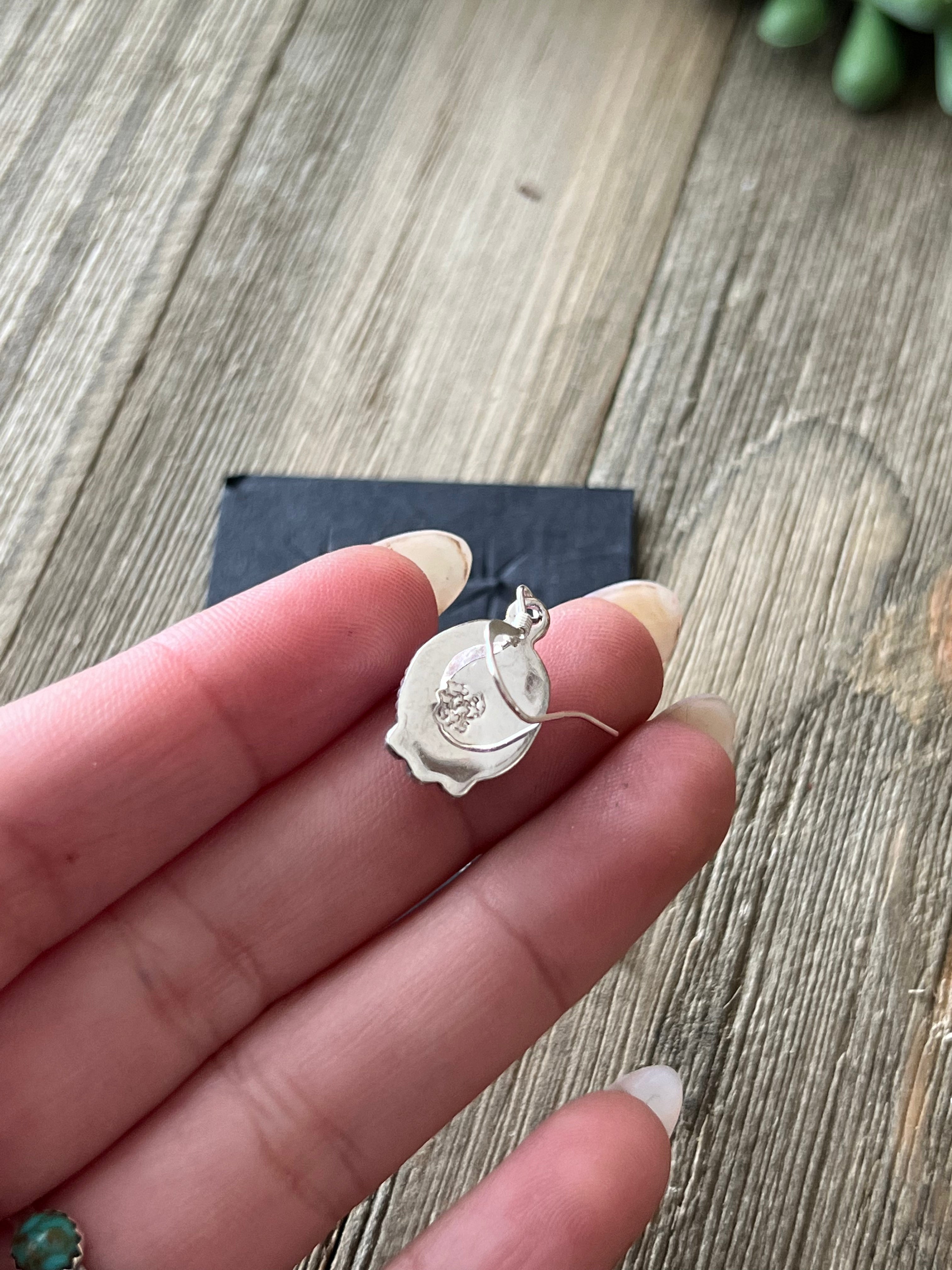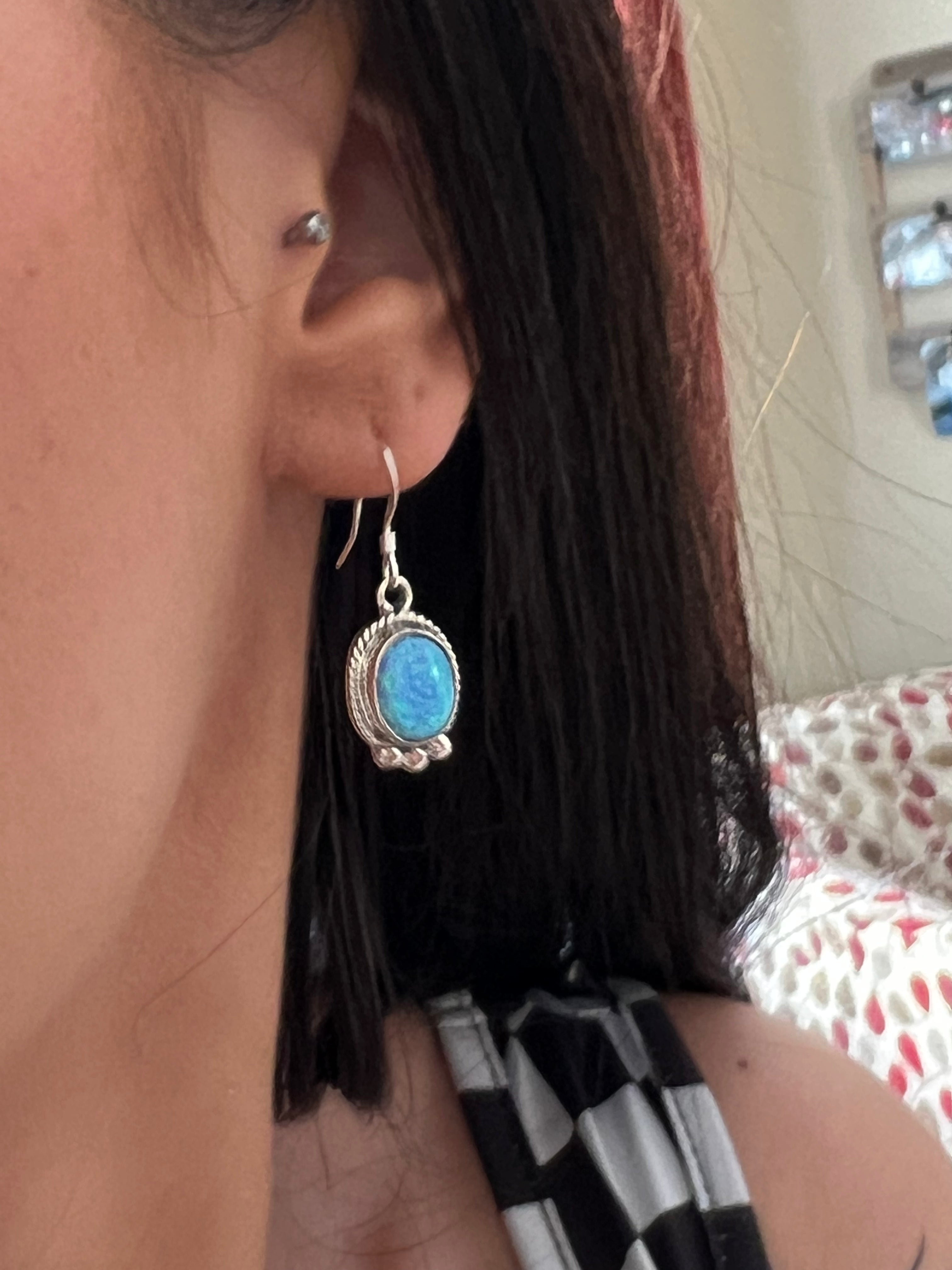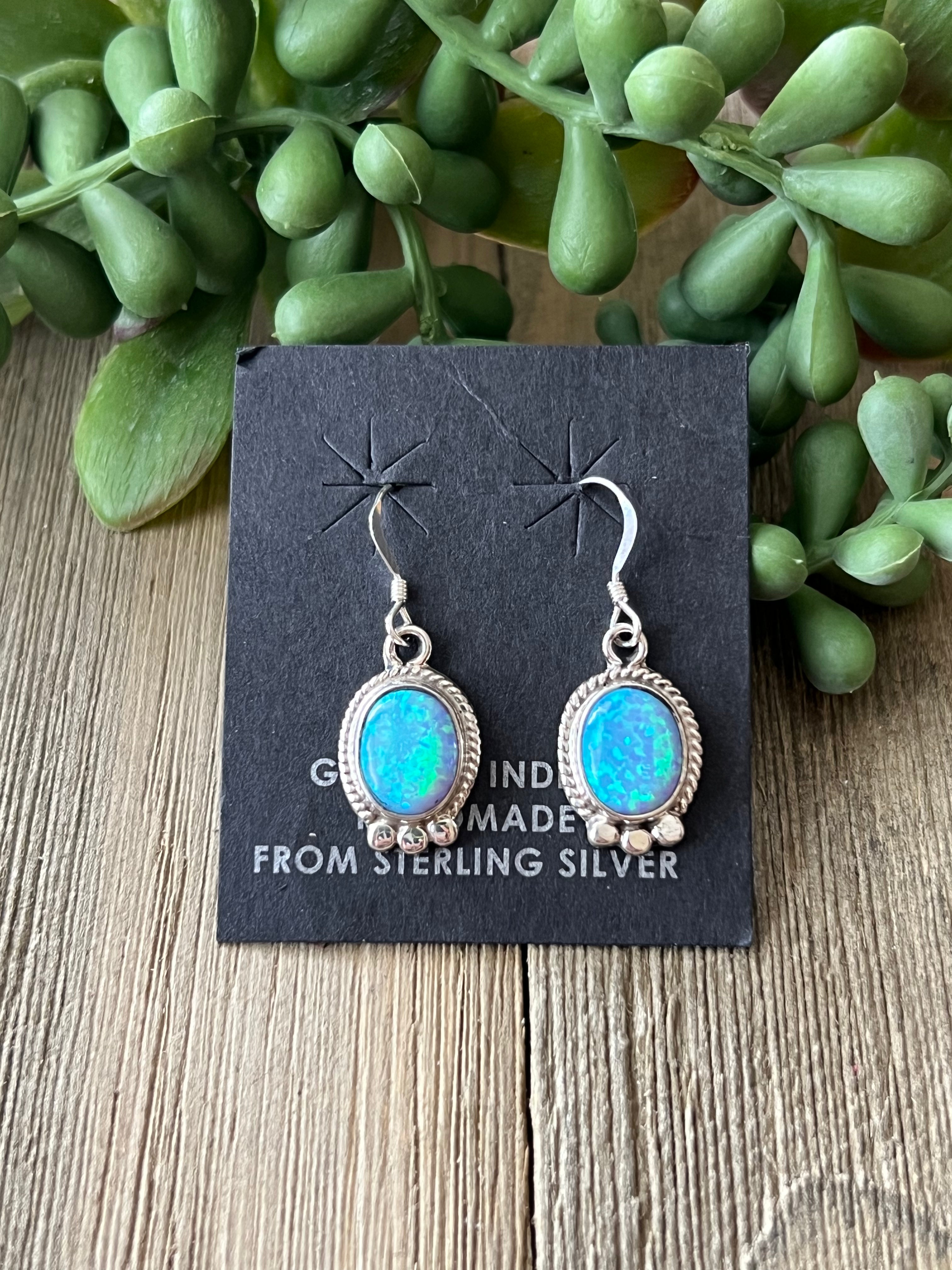 Navajo Made Blue Opal (Man-Made) & Sterling Silver Dangle Earrings. It measures 1 1/8 inches long and just over 1/2 of an inch wide. Signed by artist and stamped sterling silver.