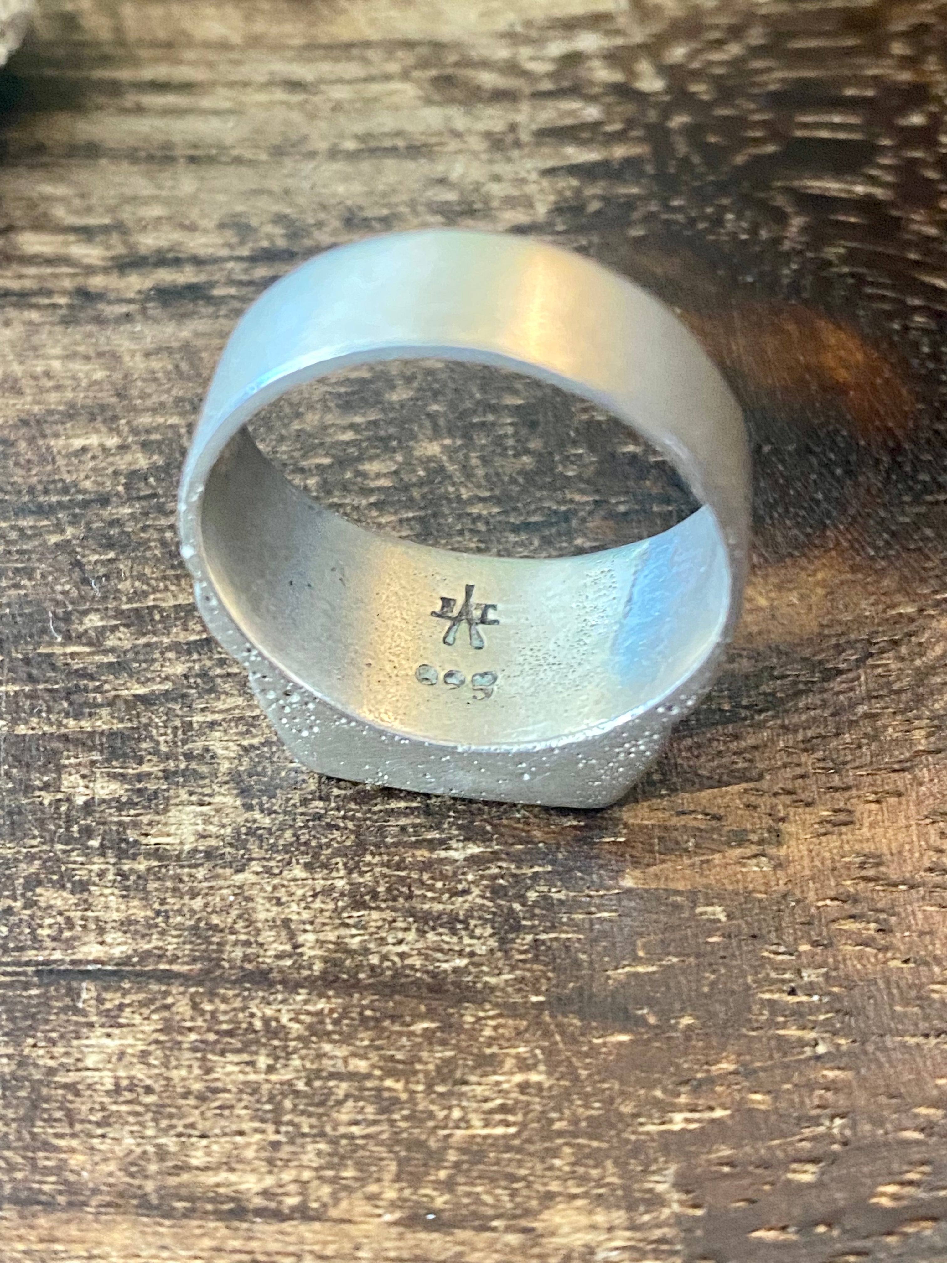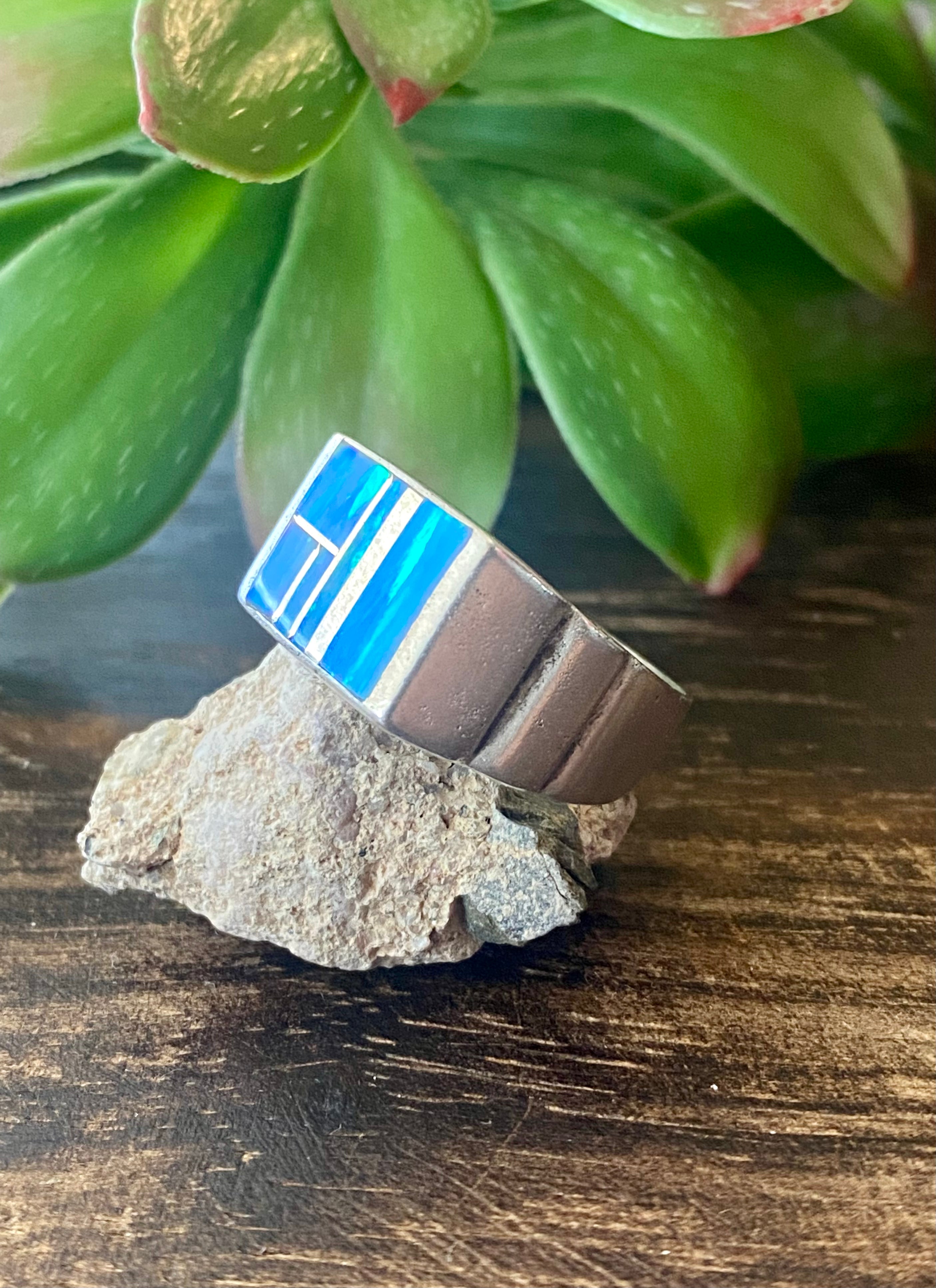 Navajo Made Blue Opal (Man-Made) & Sterling Silver Inlay Ring Size 9.5. It measures just over 3/8 of an inch long and 5/8 of an inch wide. Singed by the artist and stamped sterling silver.