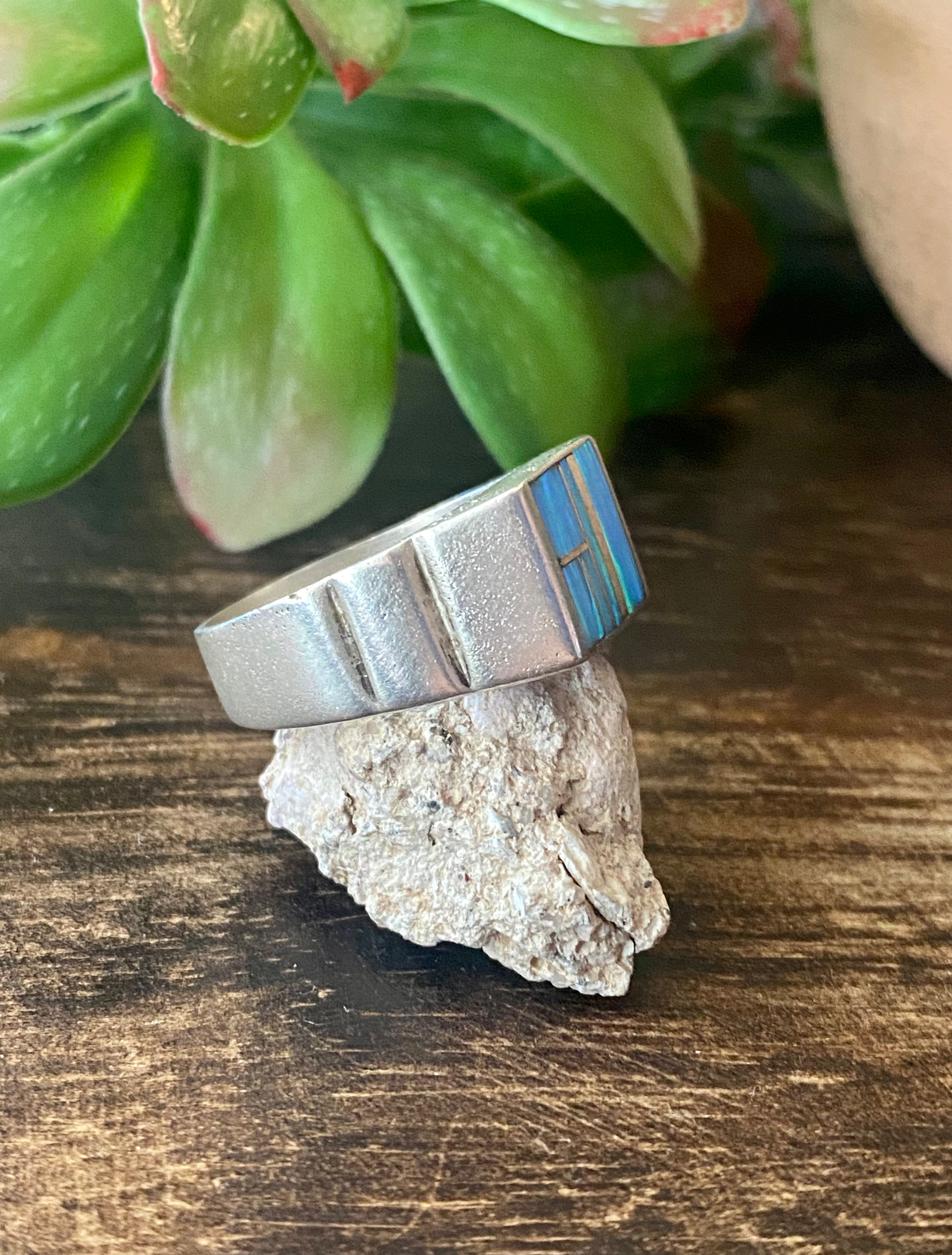 Navajo Made Blue Opal & Sterling Silver Inlay Ring Size 9.5