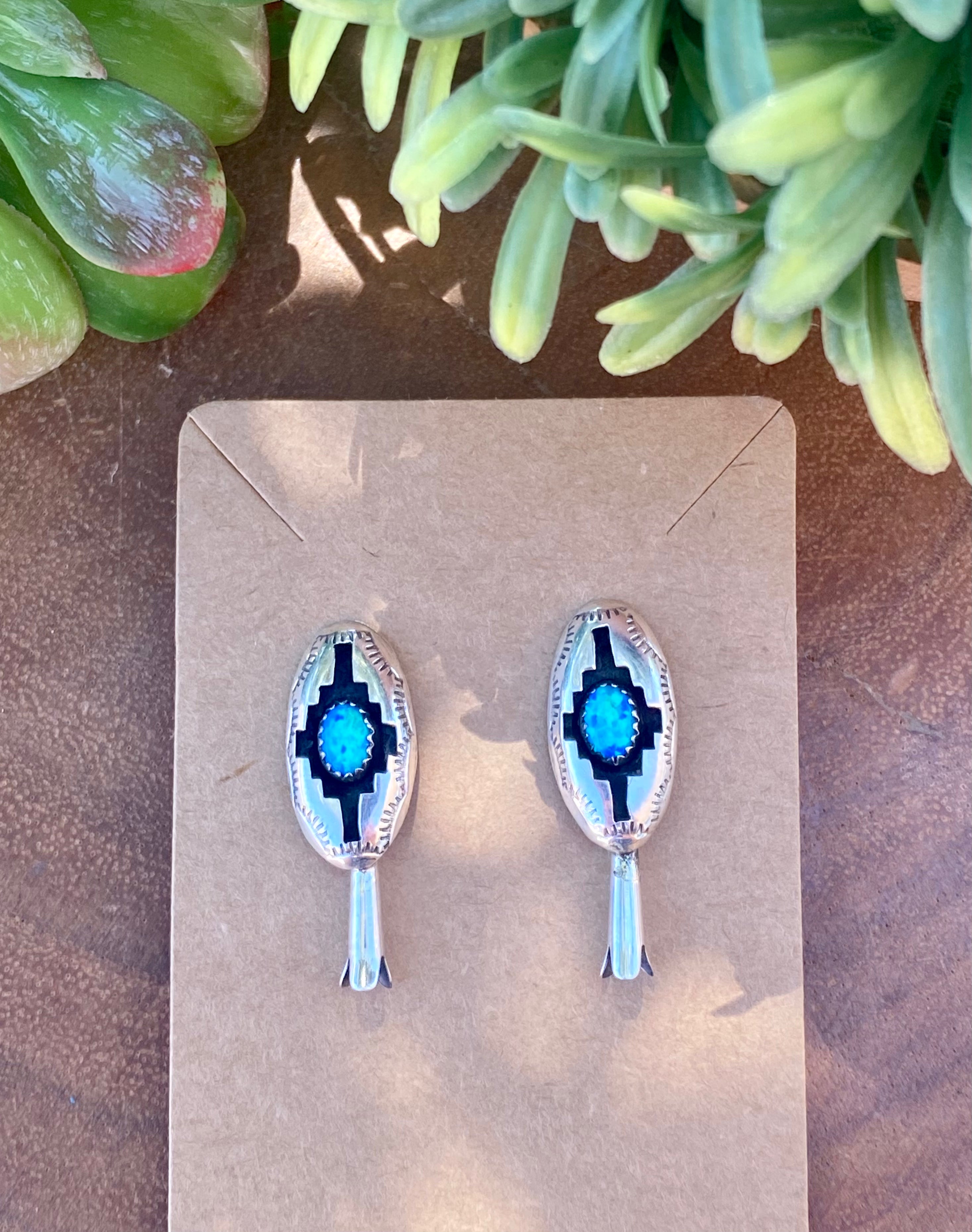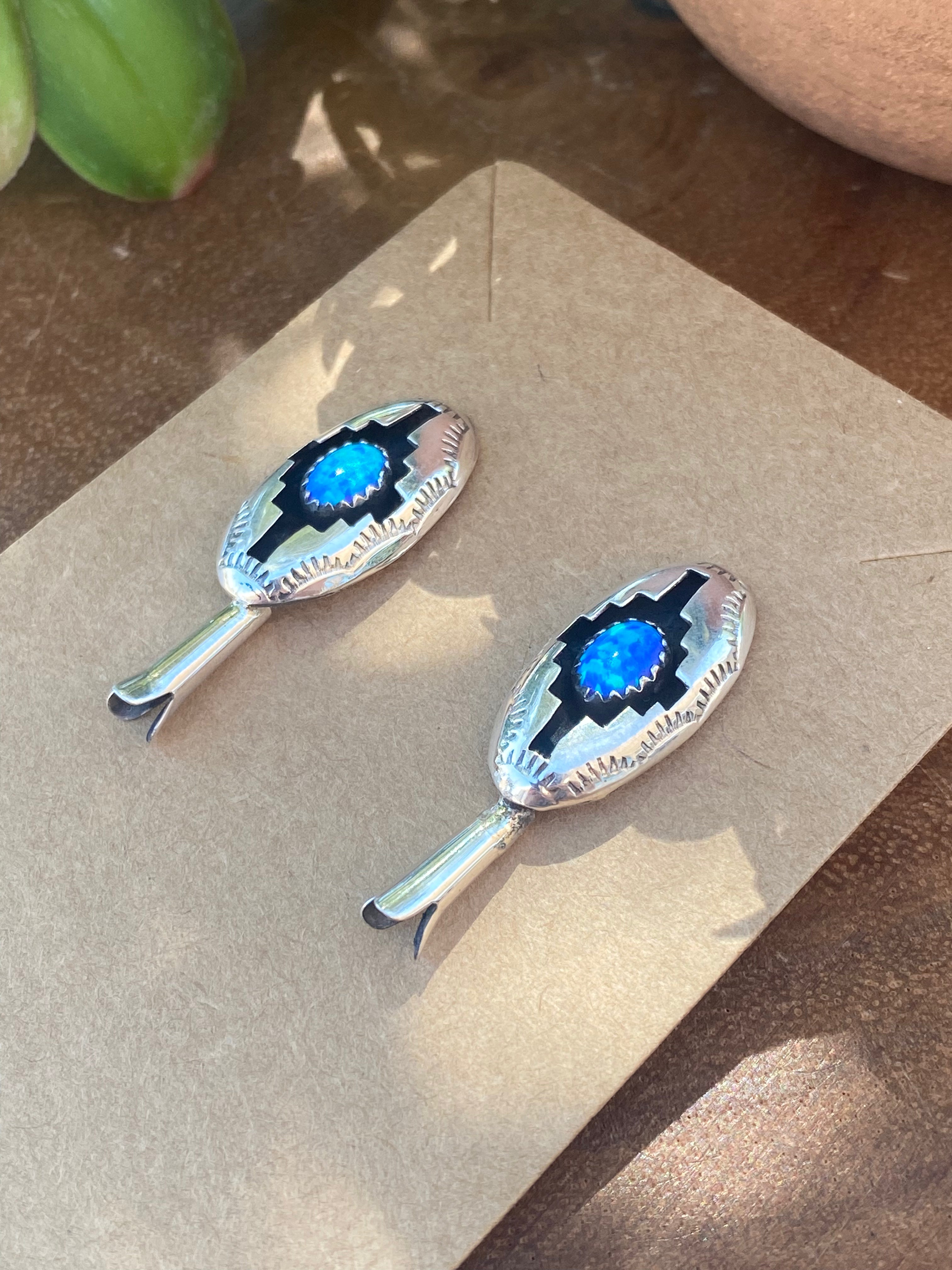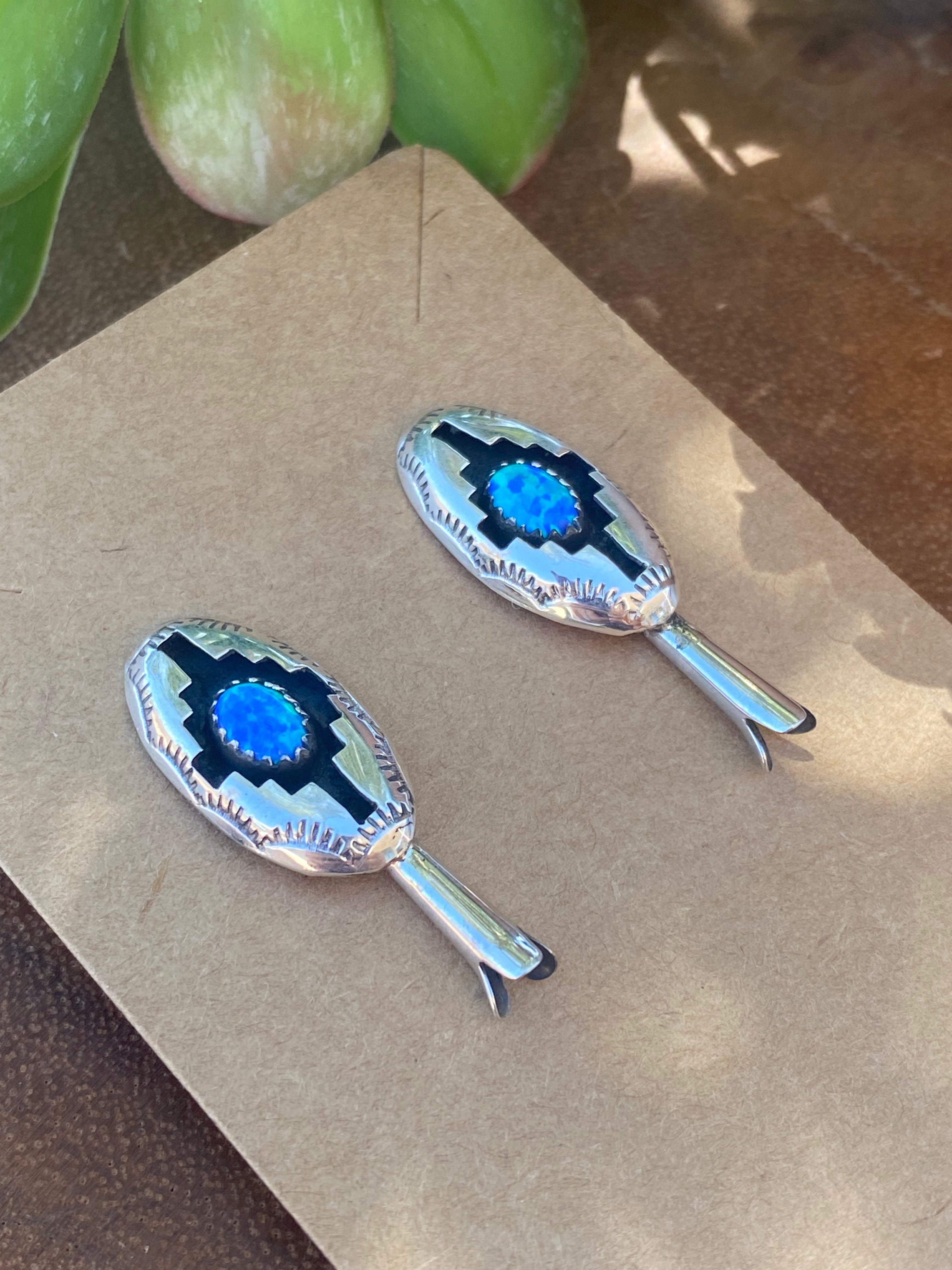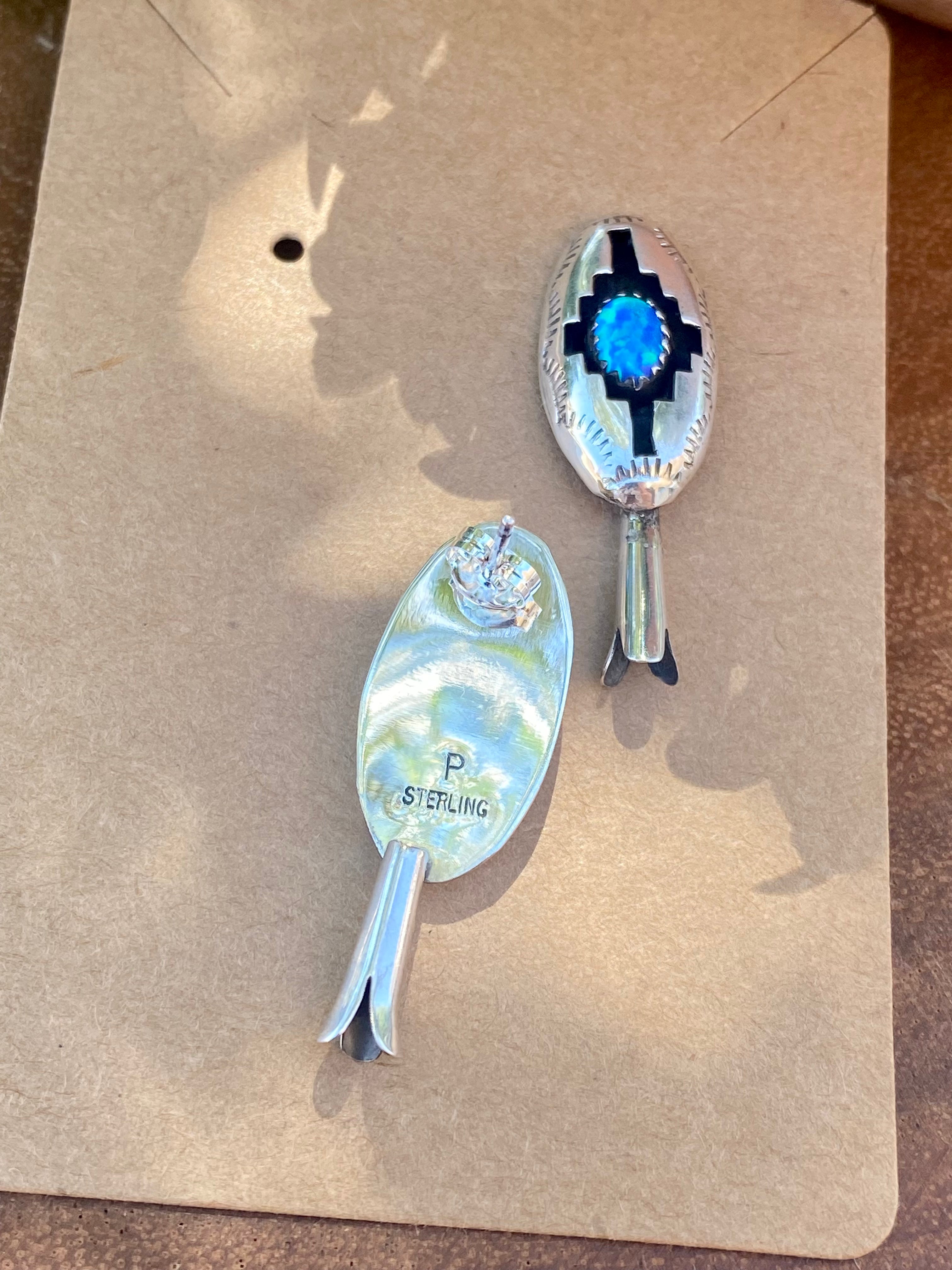 Navajo Made Blue Opal & Sterling Silver Blossom Post Dangle Earrings
