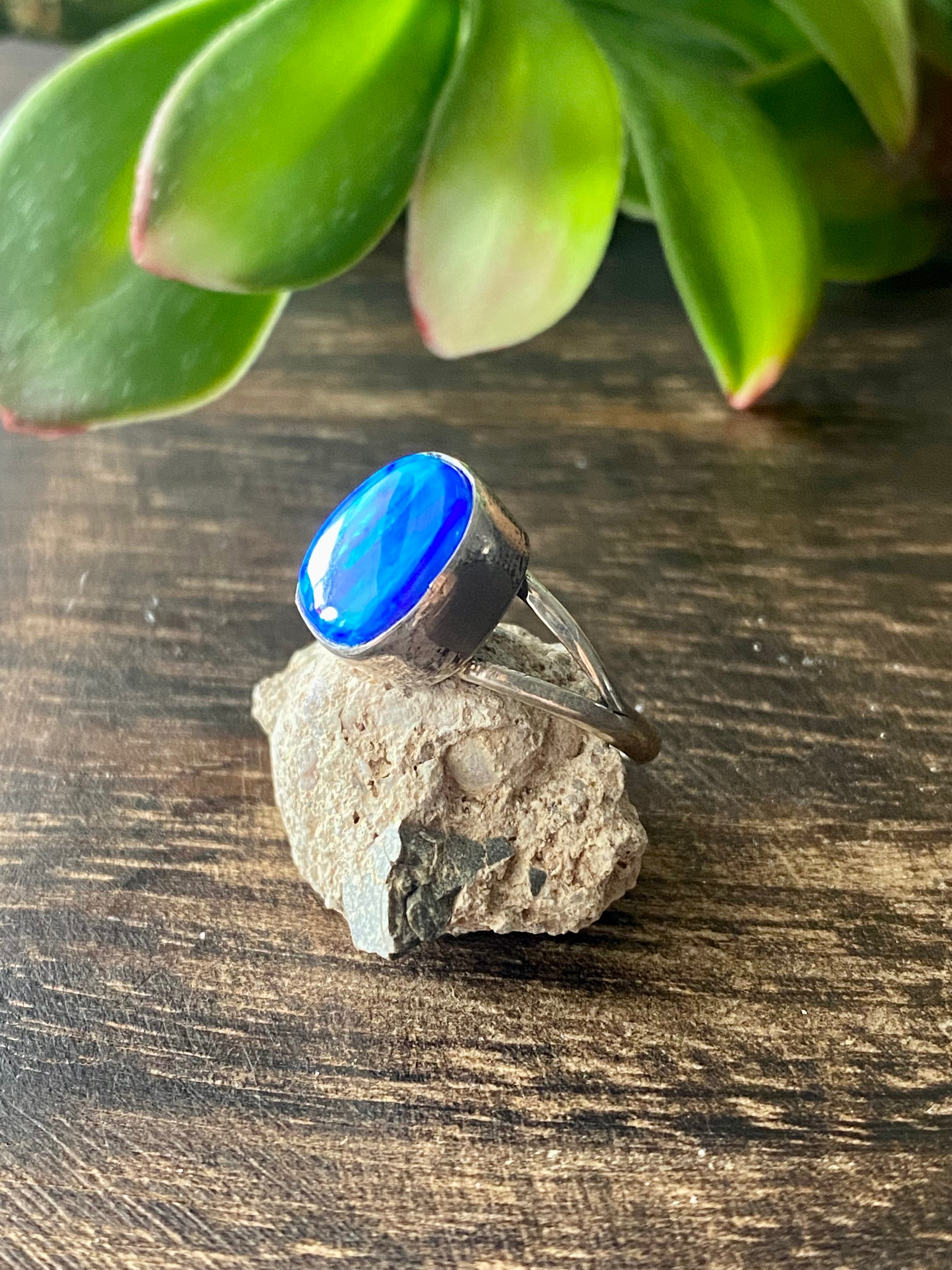 Navajo Made Blue Opal(man-made) & Sterling Silver Ring Size 5. It measures 3/8 of an inch long and 3/8 of an inch wide. Signed by the artist and stamped sterling silver. Stones will differ.