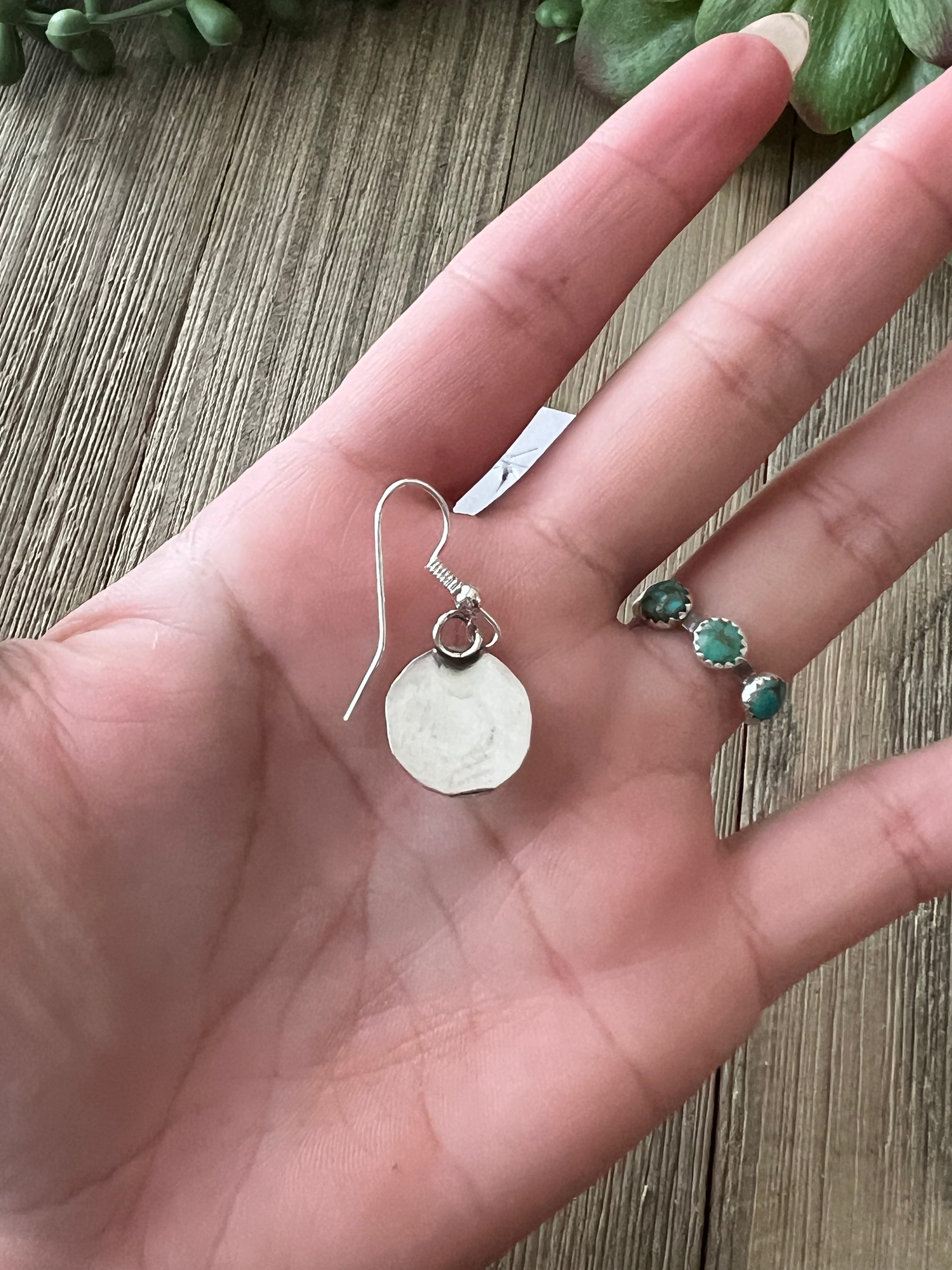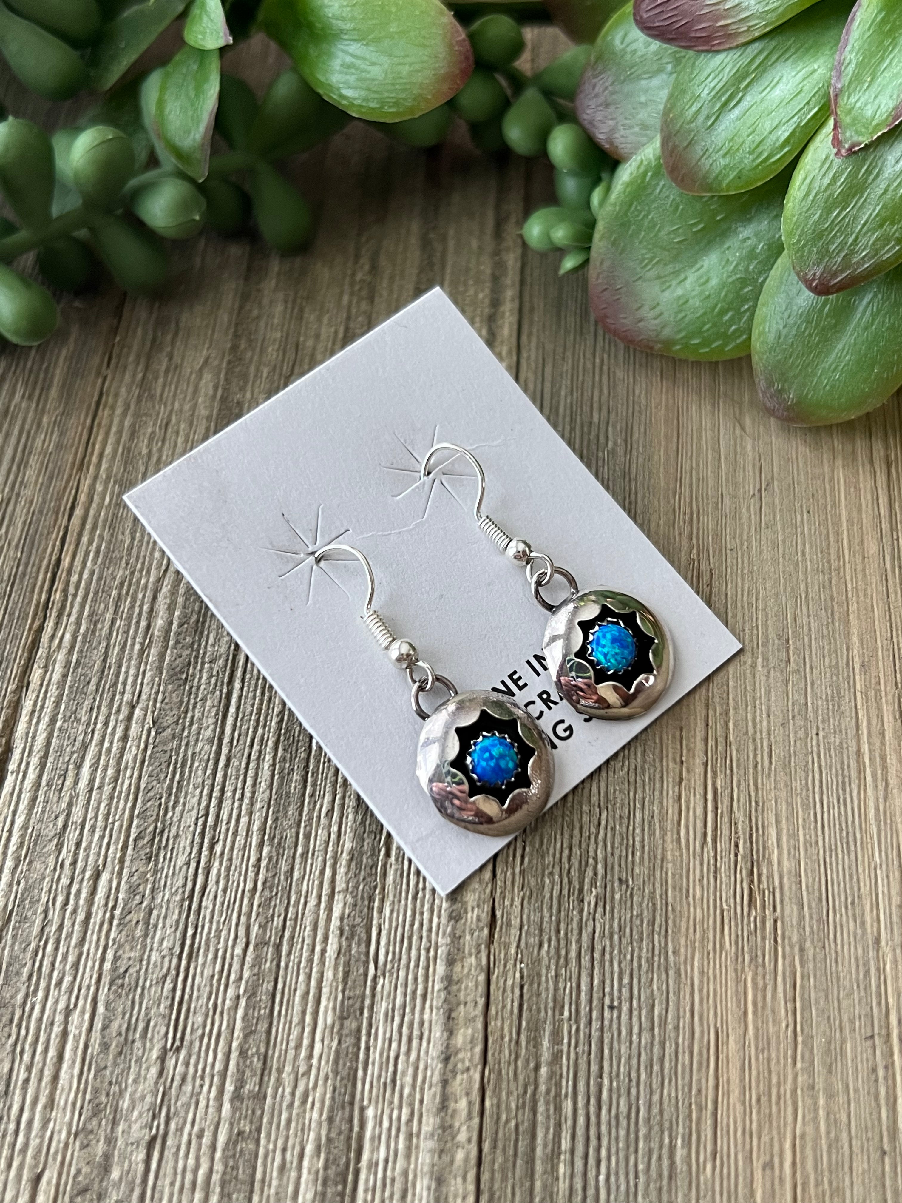Navajo Made Blue Opal(Man-Made) & Sterling Silver Dangle Earrings. It measures 1 3/8 inches long and just over 1/2 of an inch wide. Signed by artist and stamped sterling silver.