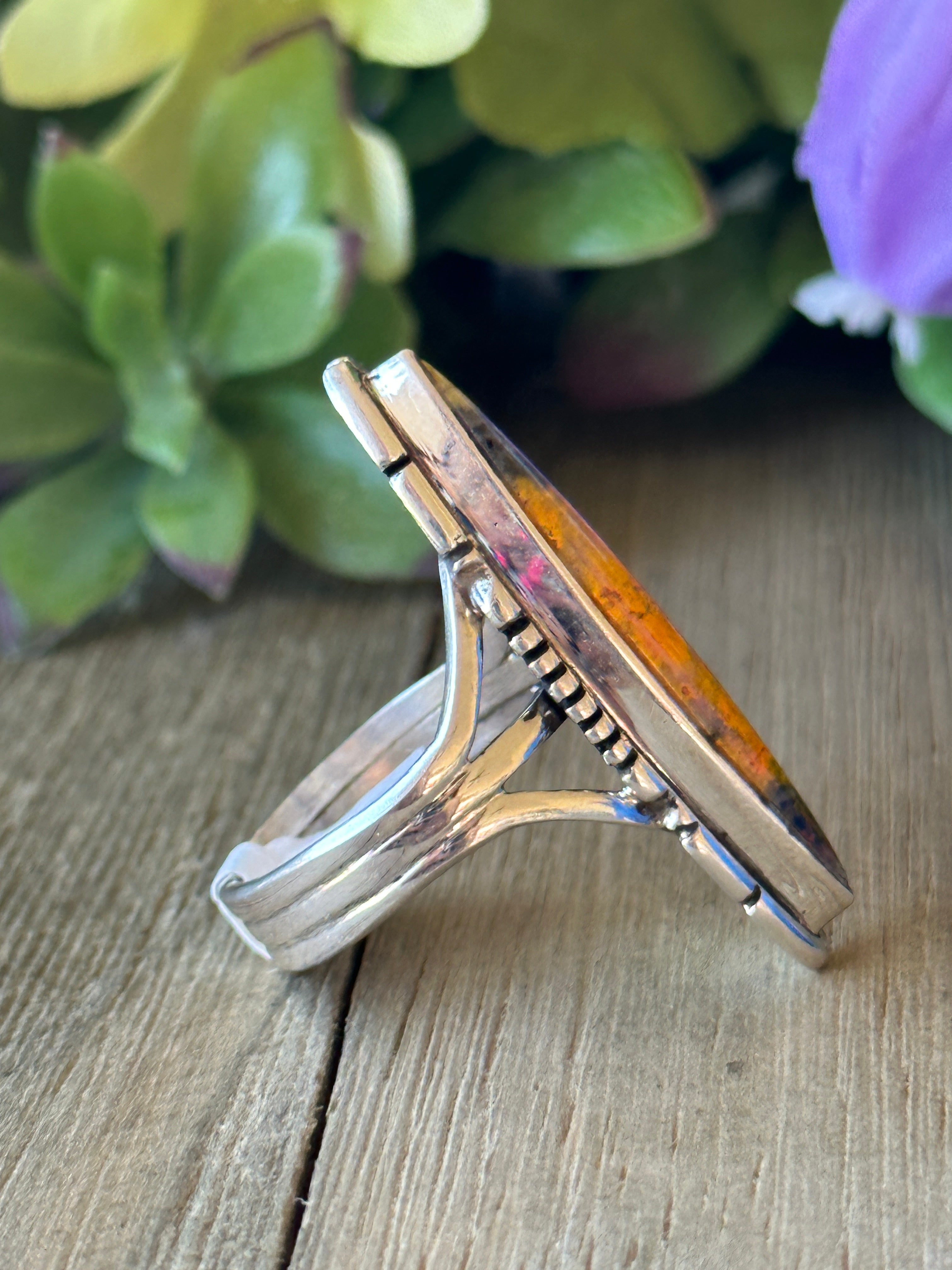 Navajo Made Bumblebee Jasper & Sterling Silver Ring Size 9.75. It measures 2 5/8 inches long and 1/2 of an inch wide. Signed by artist and stamped sterling silver.