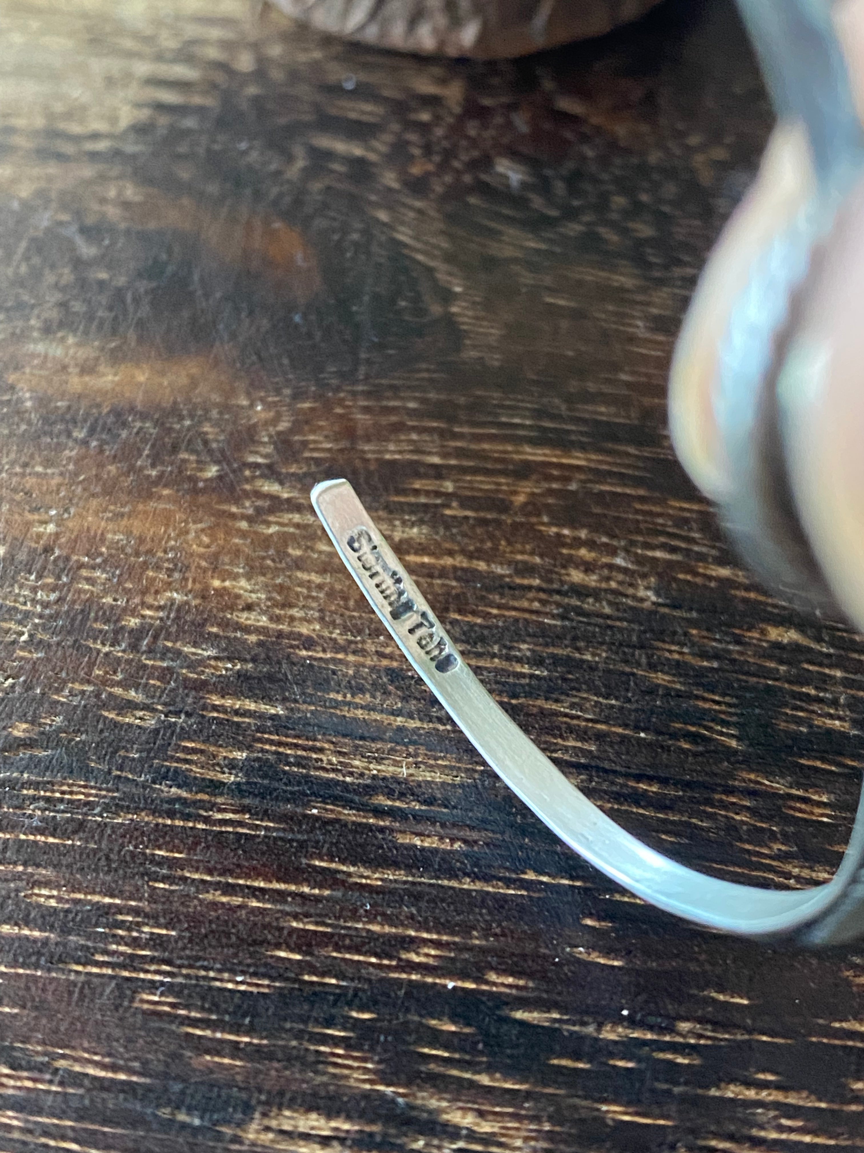 Navajo Made Charoite & Sterling Silver Cuff Bracelet. It measures 5/8 of an inch wide with an inside circumference of 5 3/8 inches and a gap of 1 inch. Signed by the artist and stamped sterling silver.