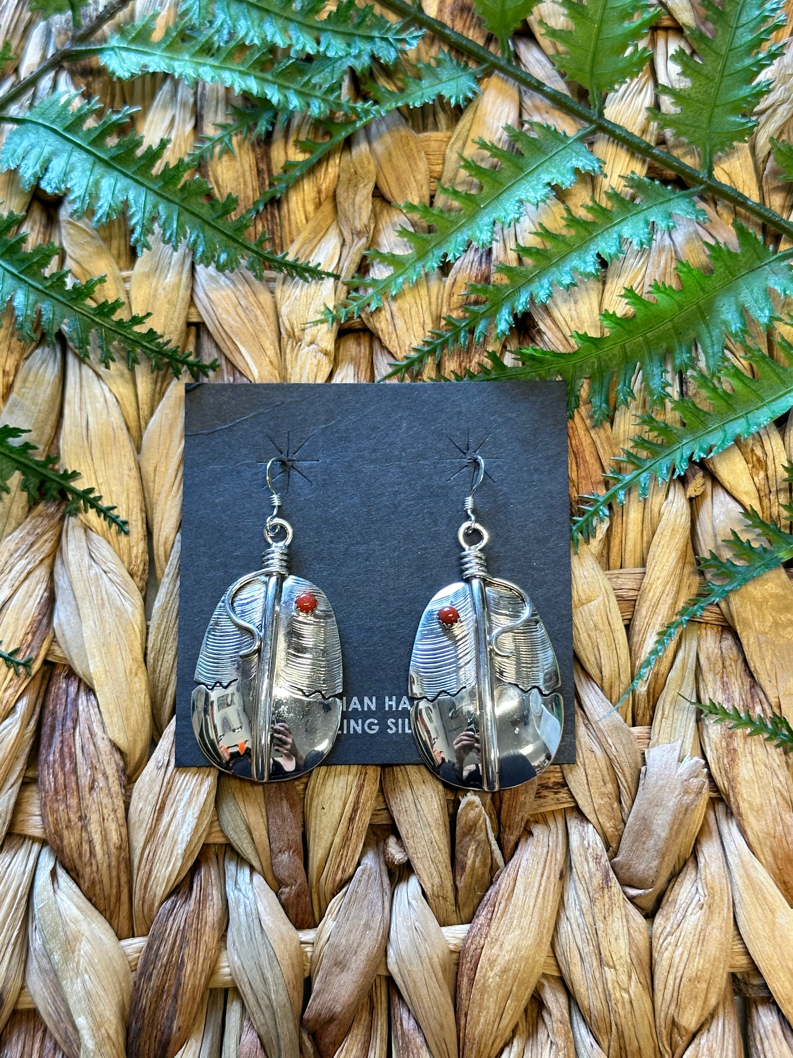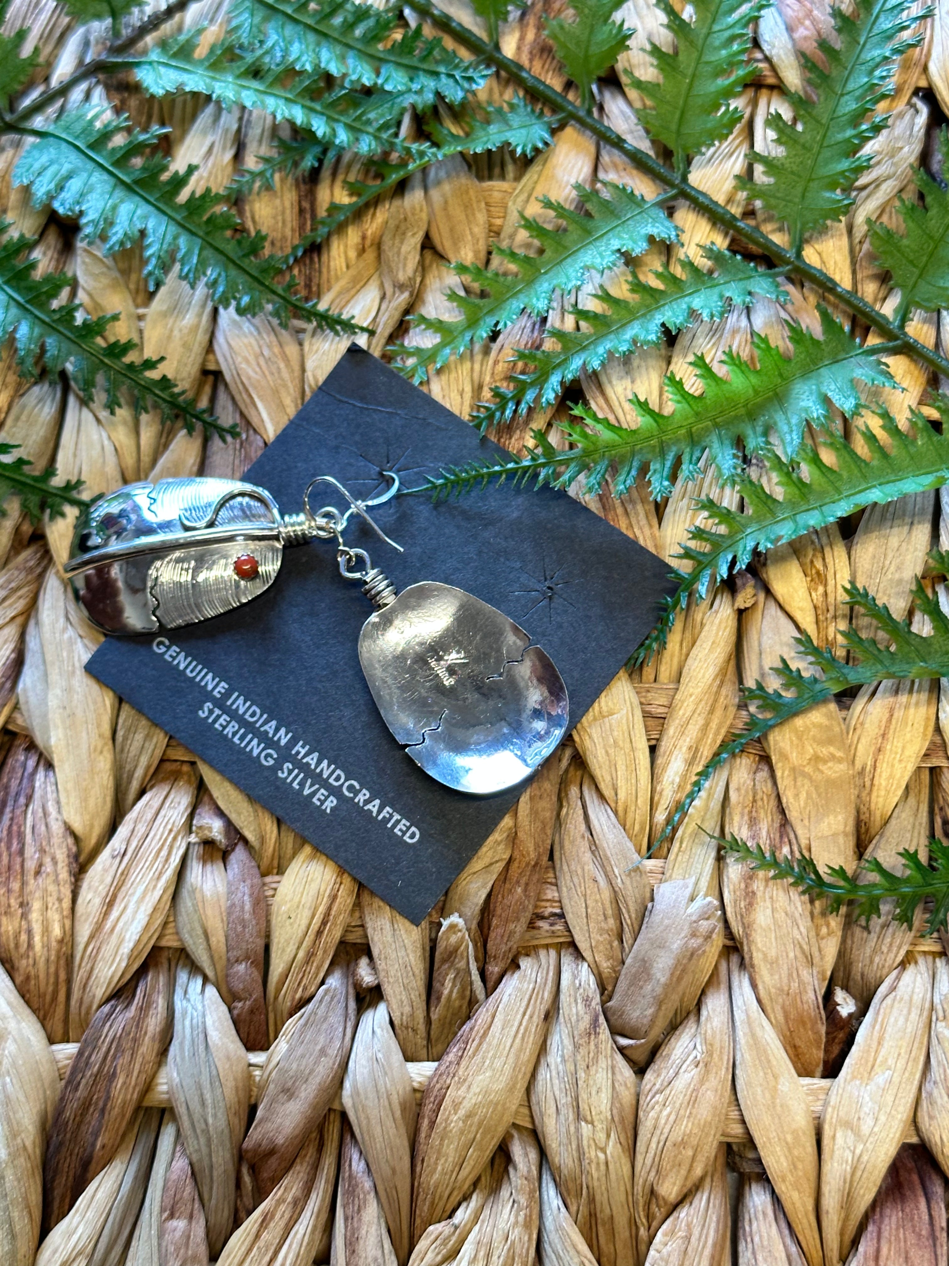Navajo Made Coral & Sterling Silver Dangle Feather Earrings