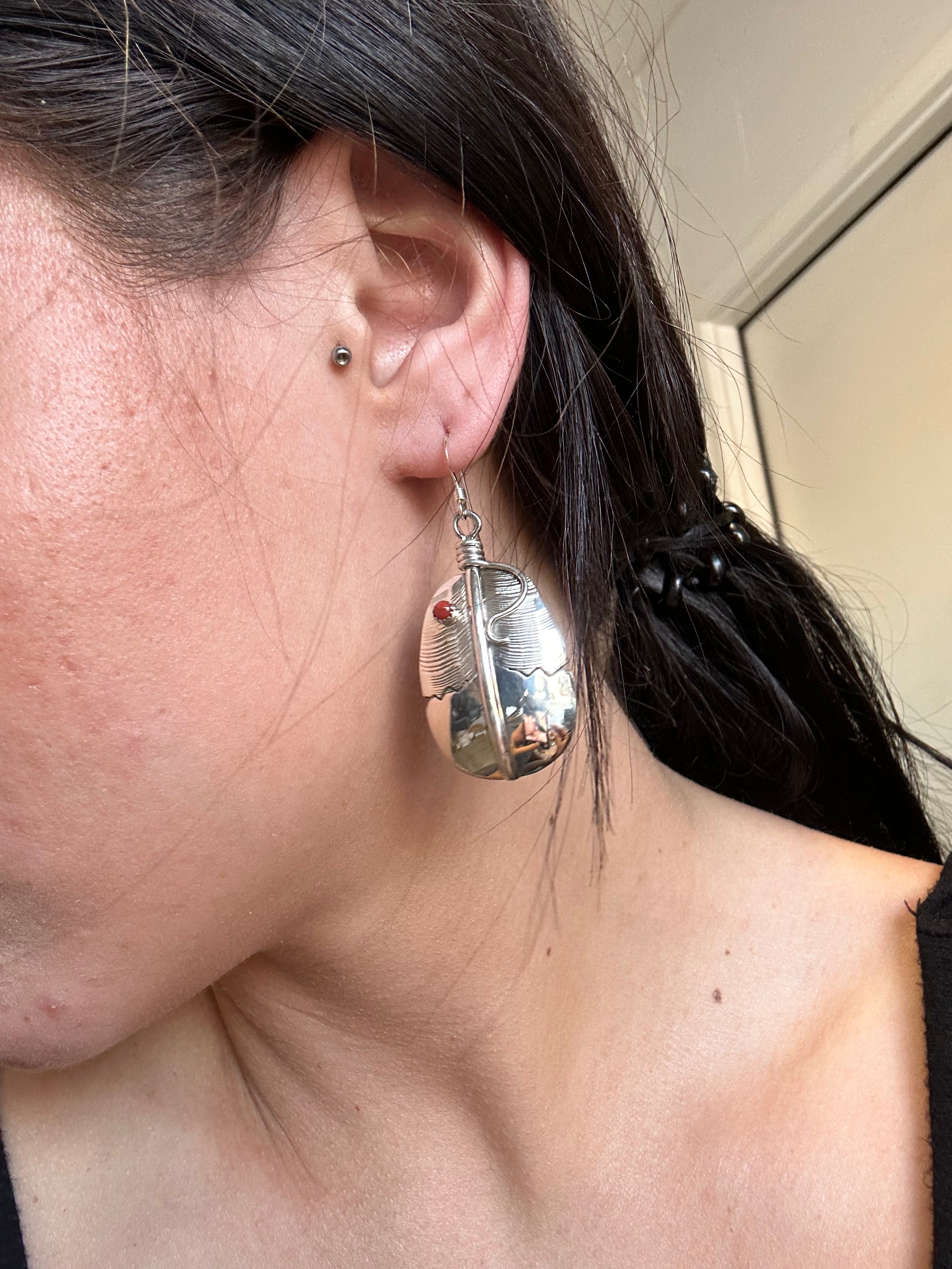 - Beautiful earrings, perfect for your everyday wear. Navajo Made Coral & Sterling Silver Dangle Feather Earrings. It measures 2 inches long and just over 7/8 of an inch wide.