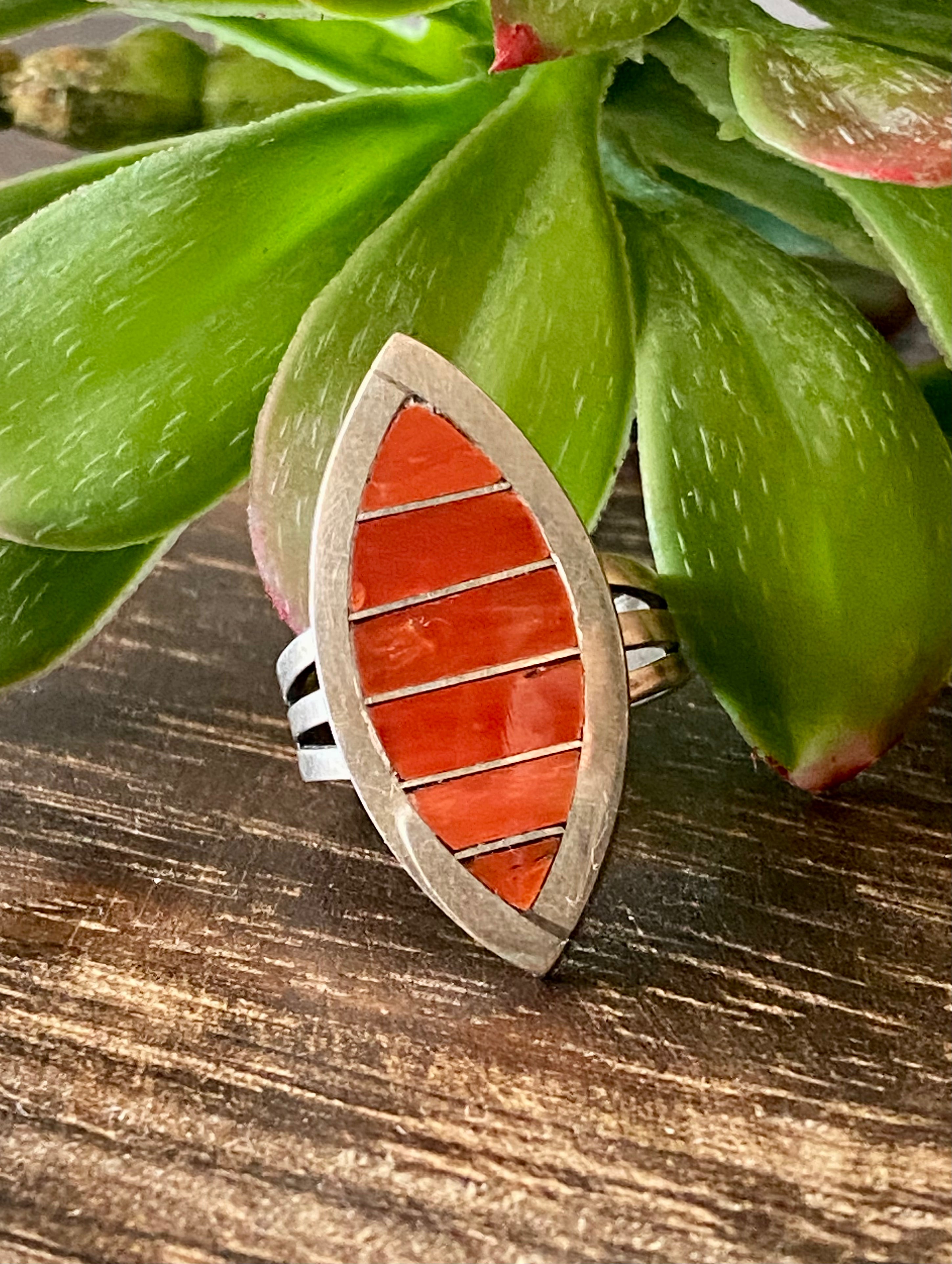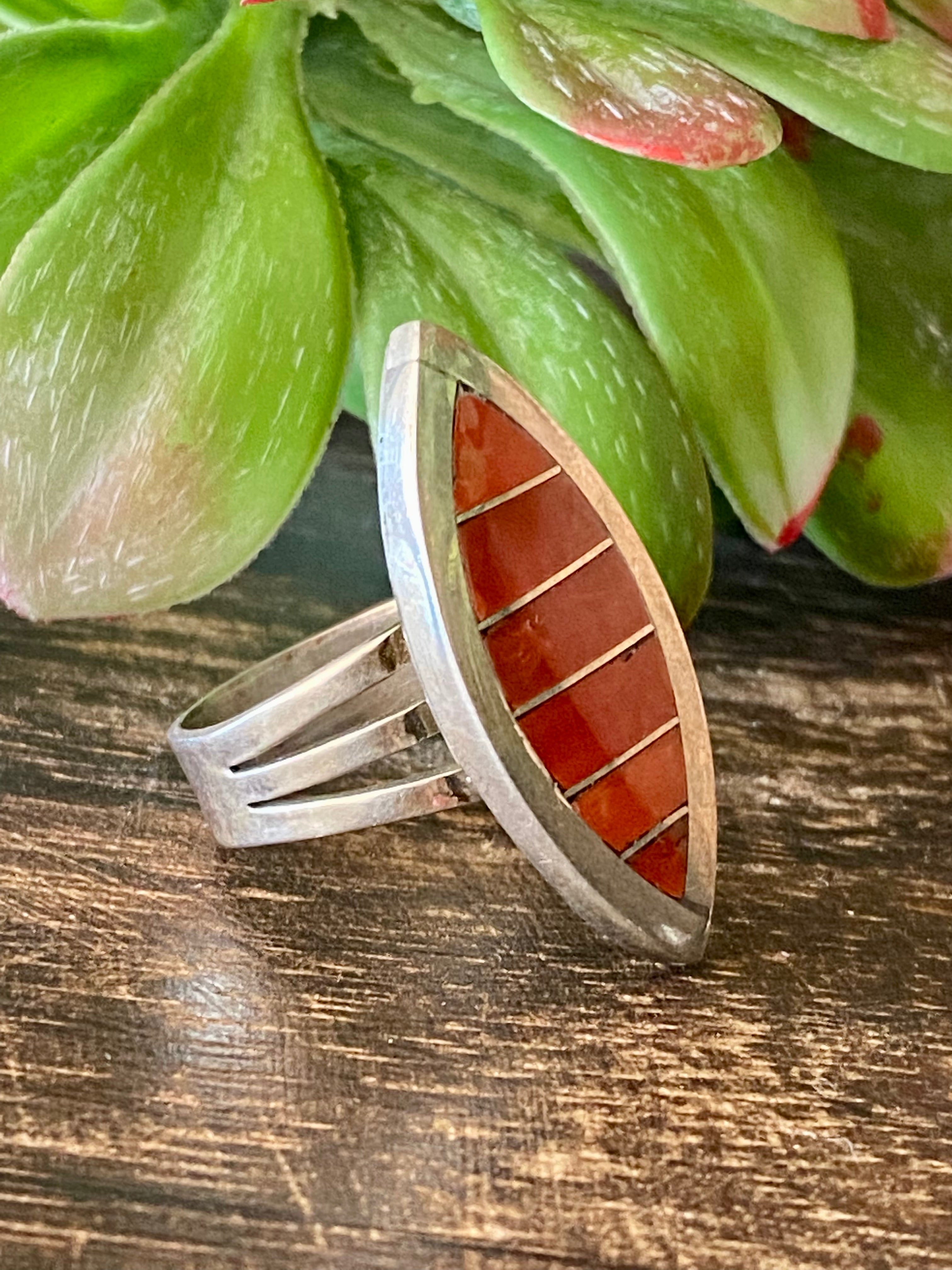 Navajo Made Coral & Sterling Silver Inlay Ring Size 9