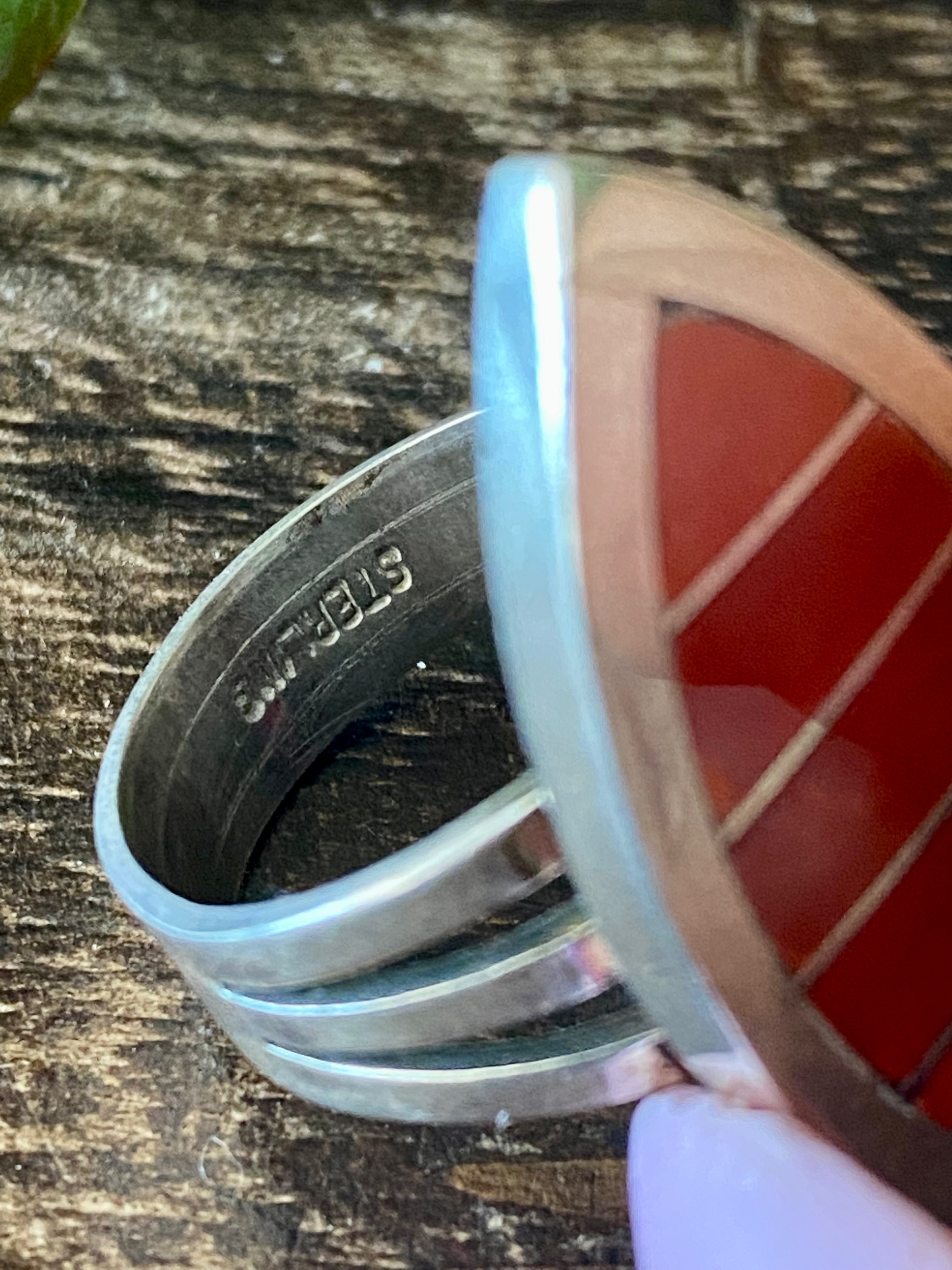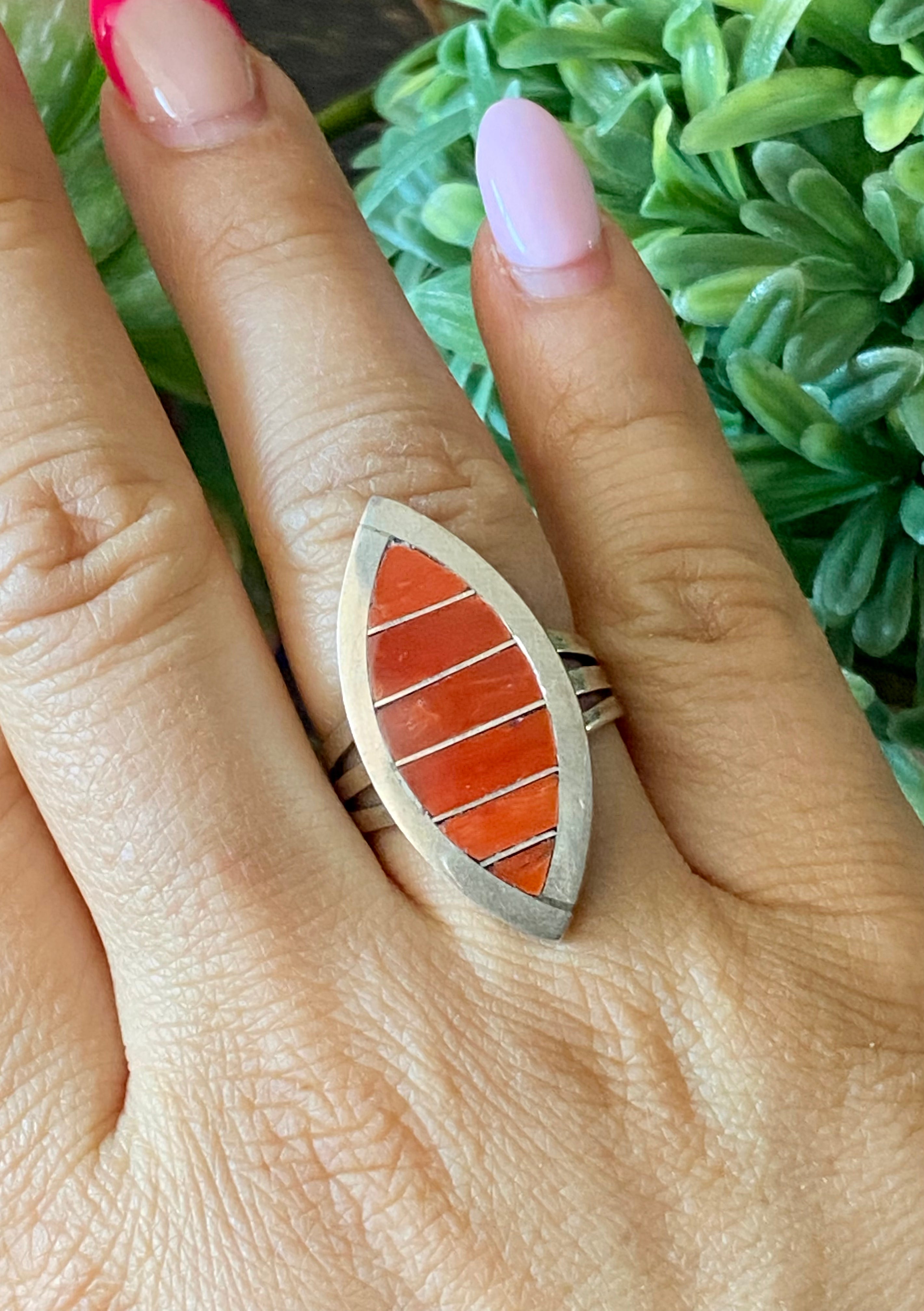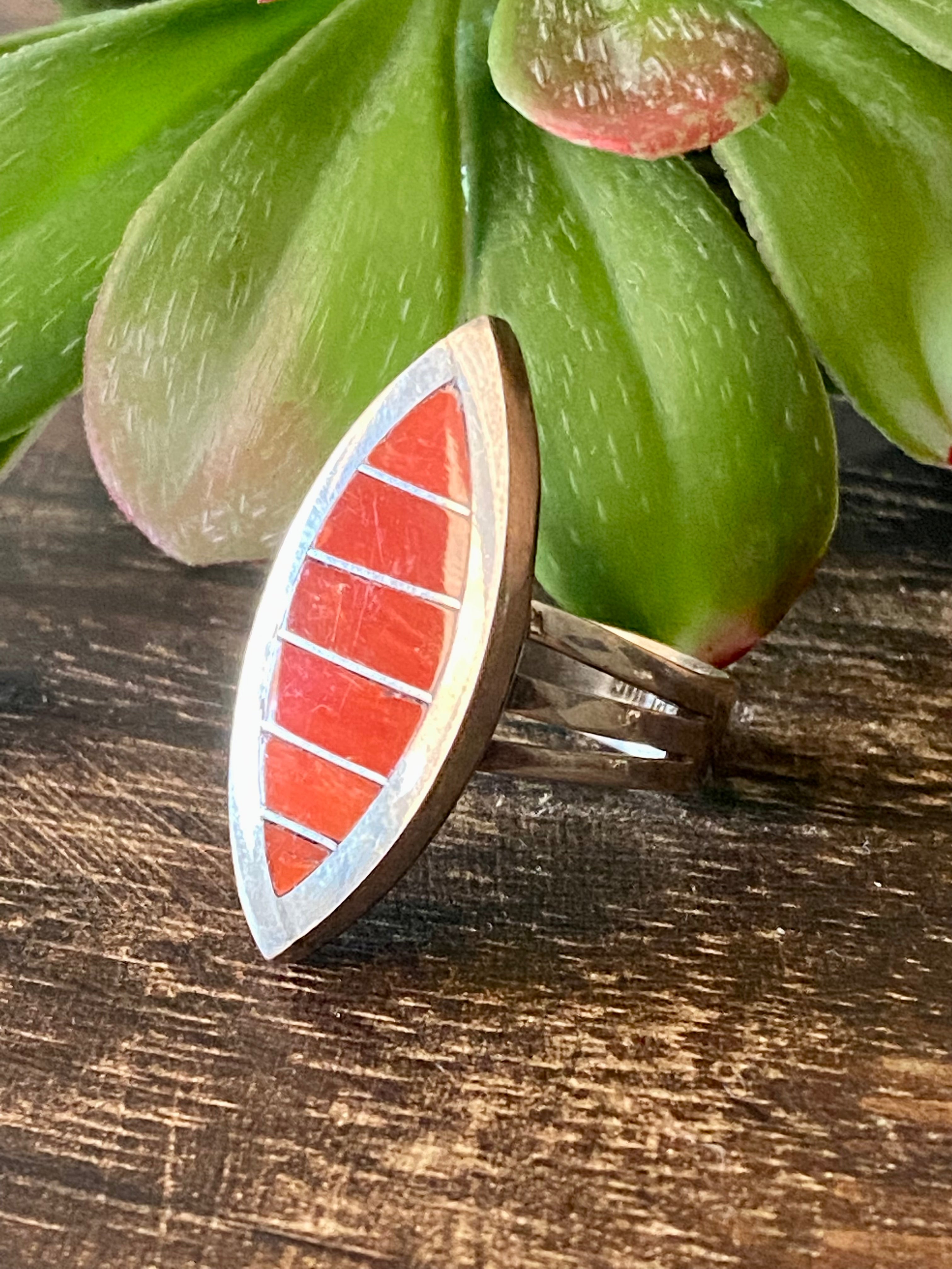 Navajo Made Coral & Sterling Silver Inlay Ring Size 9. It measures 1 3/8 inches long and 5/8 of an inch wide. Stamped sterling silver.