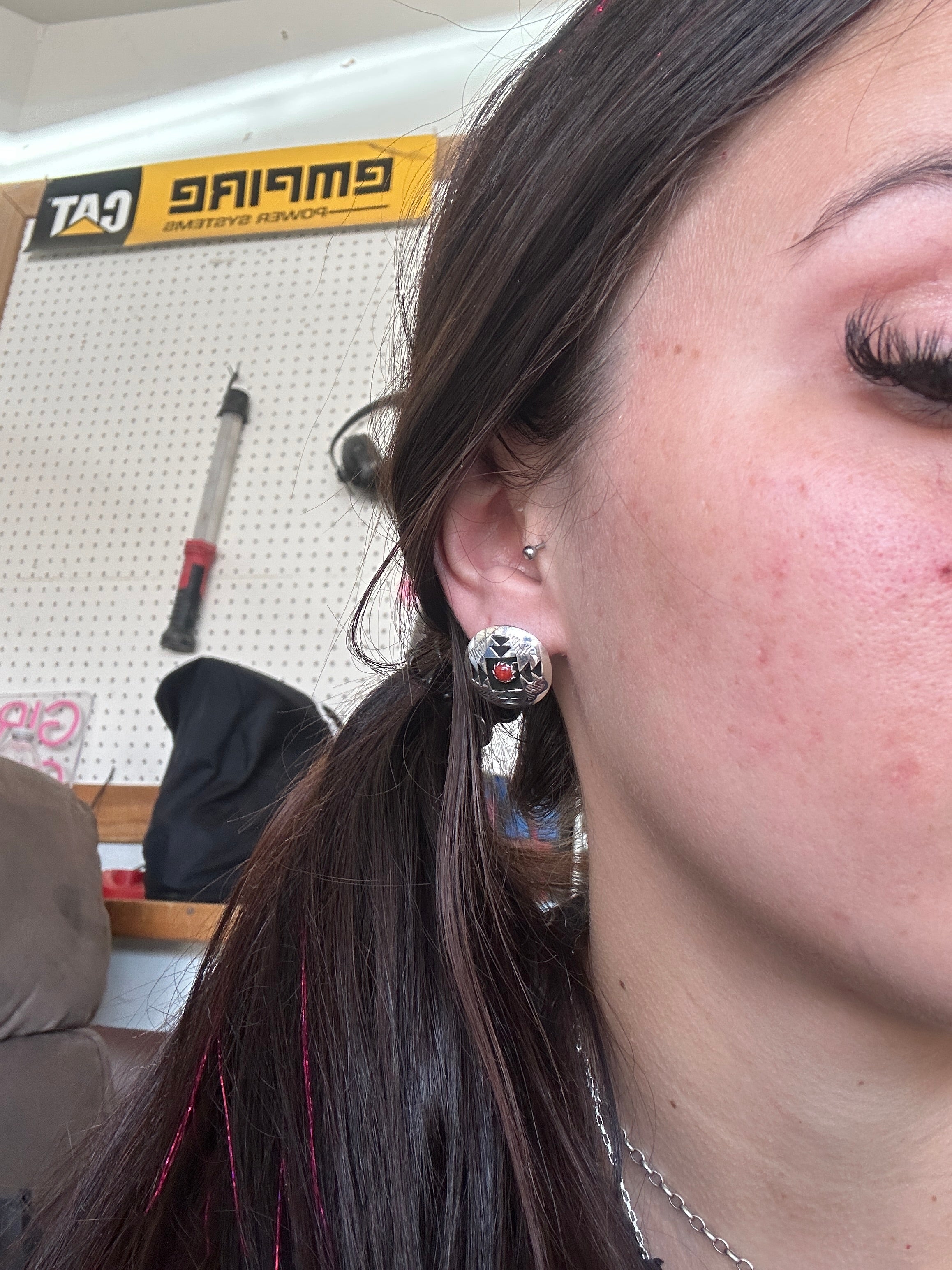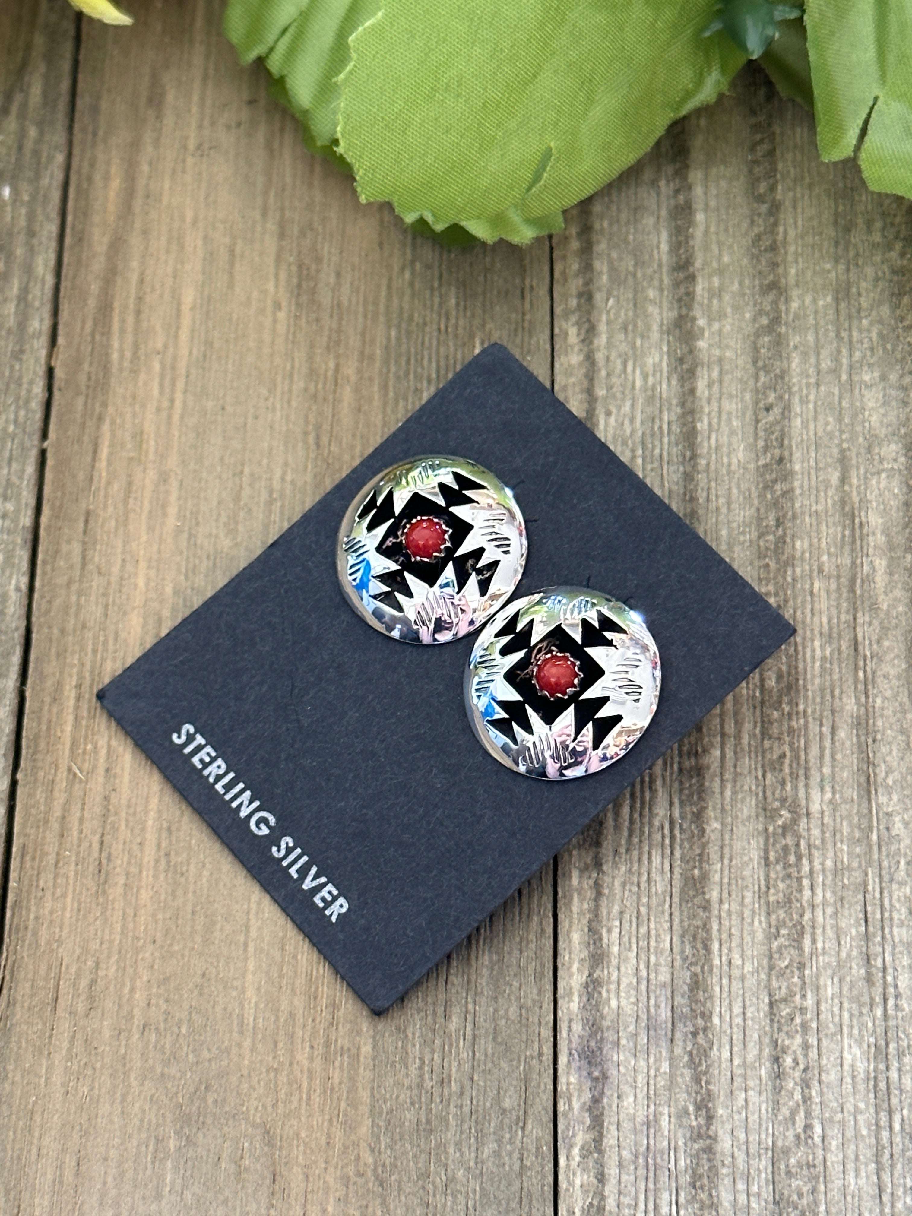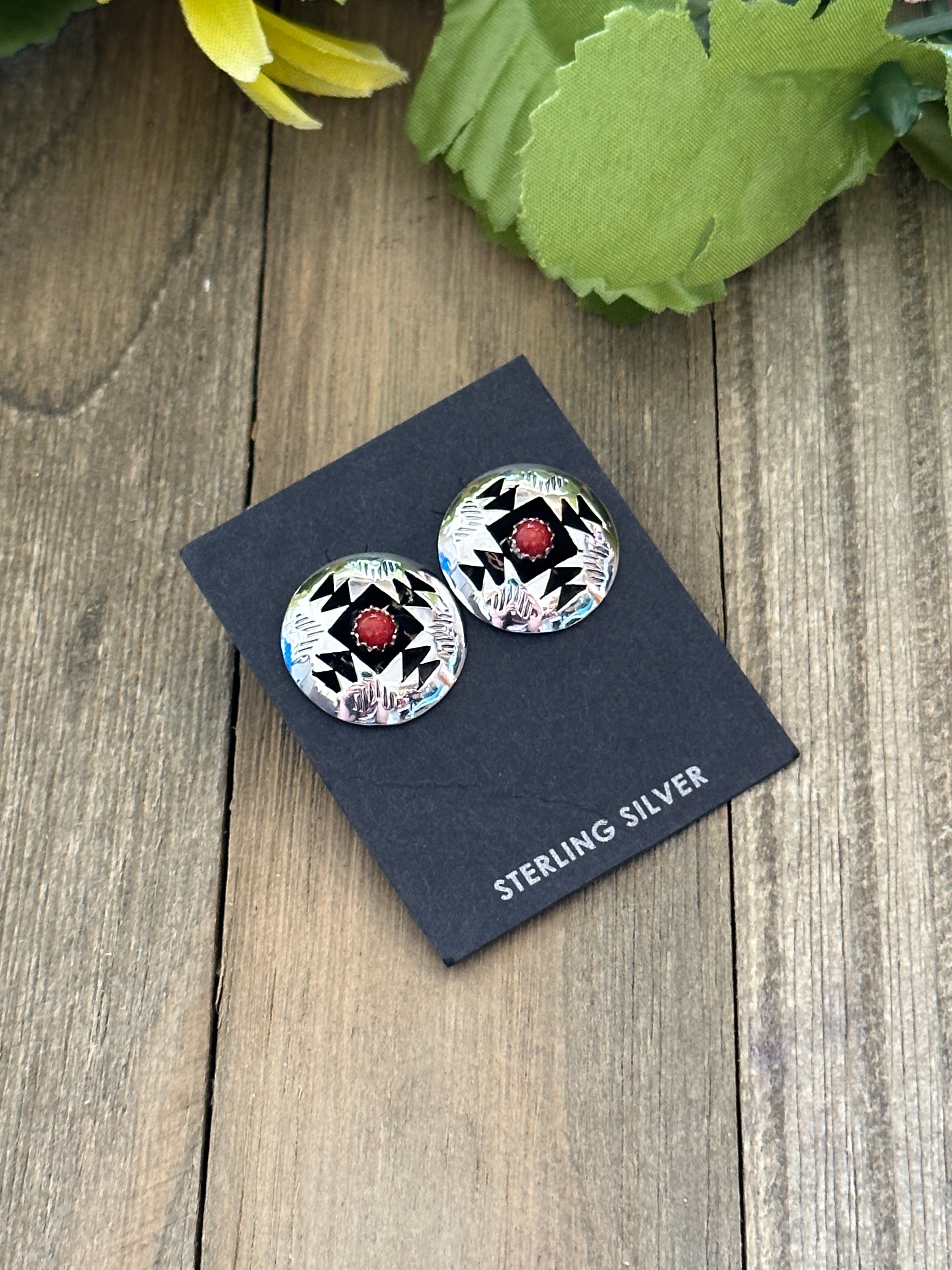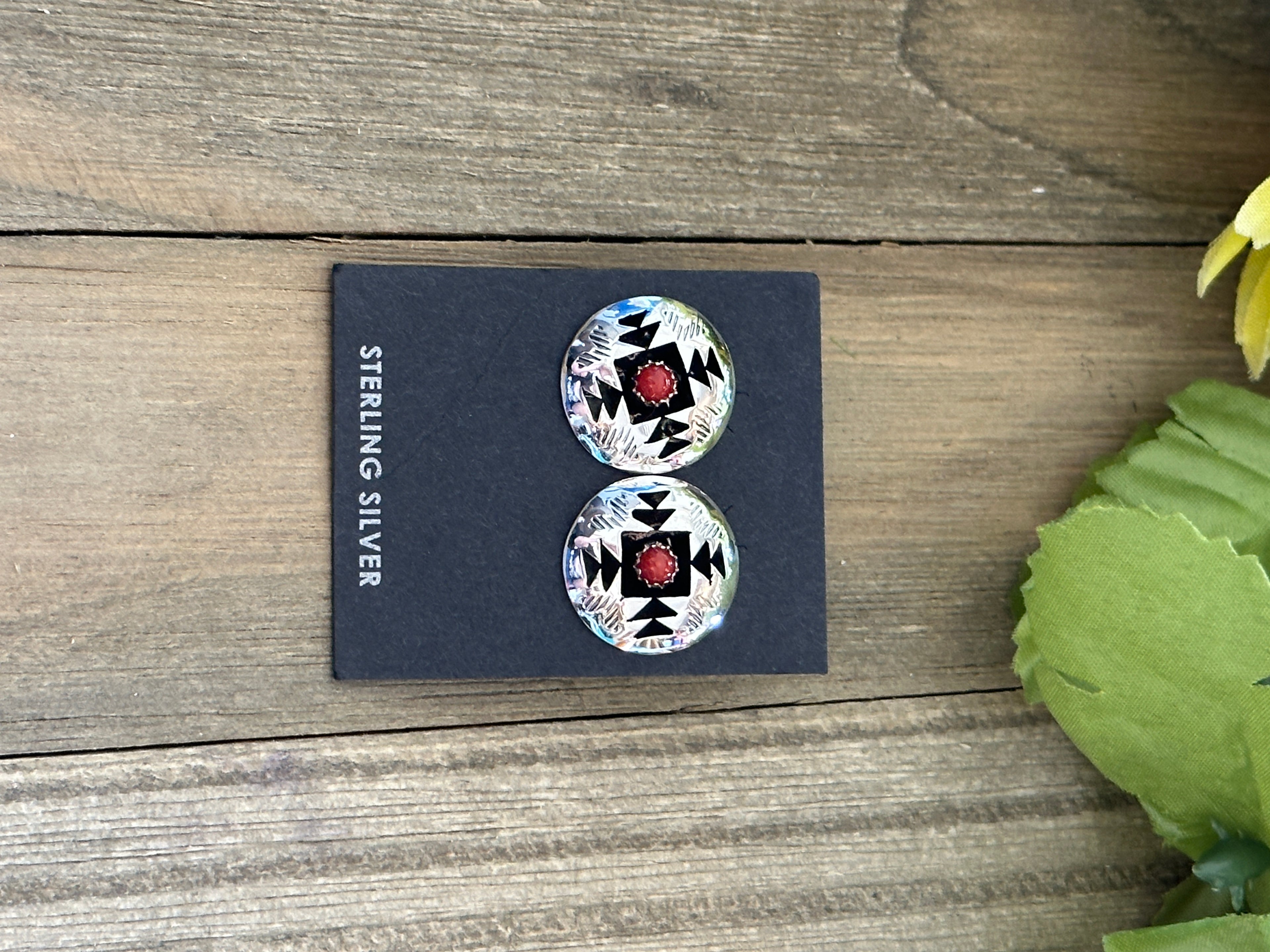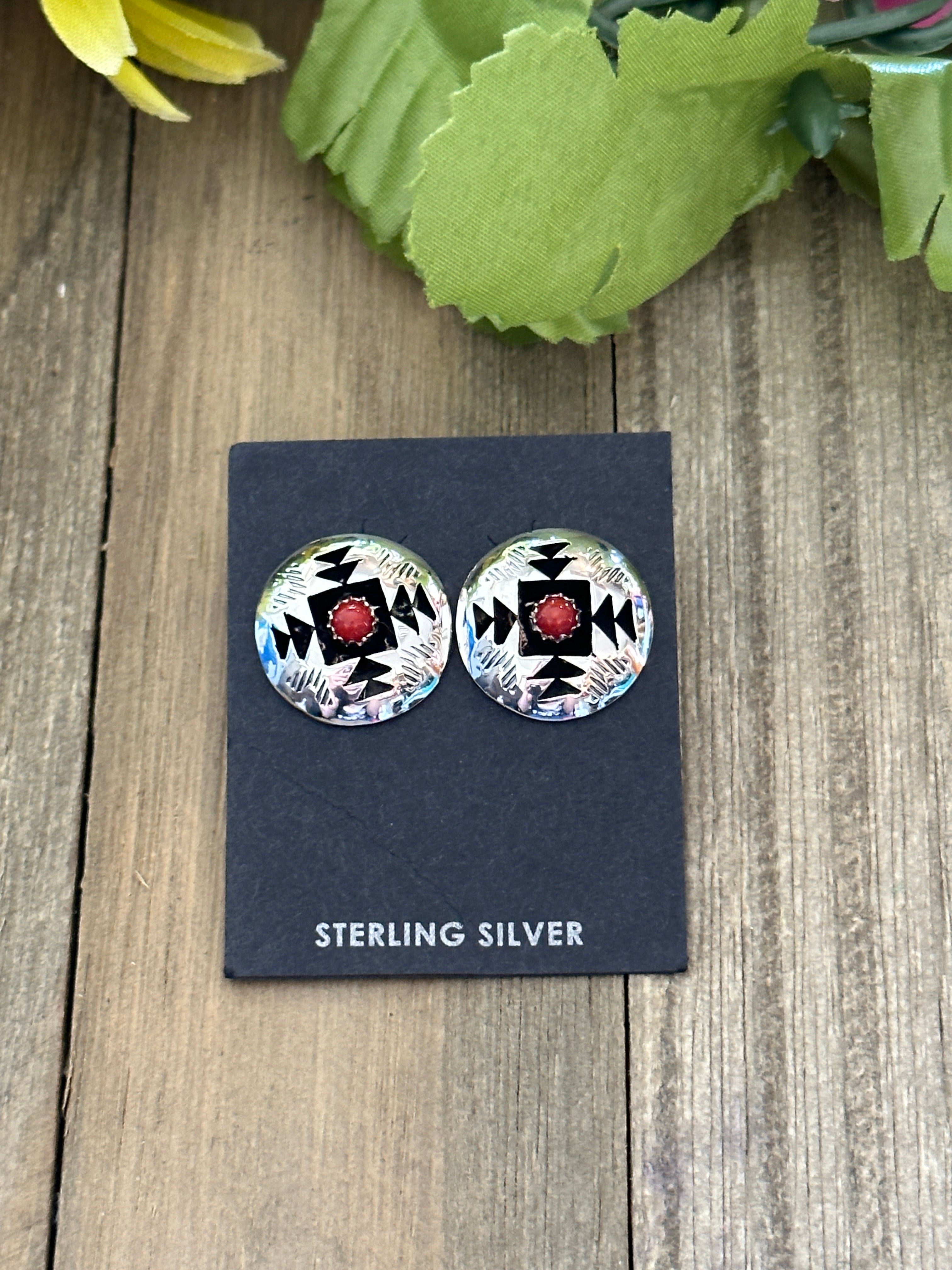 Navajo Made Coral & Sterling Silver Post Earrings. It measures 3/4 of an inch round. Signed by artist and stamped sterling silver.