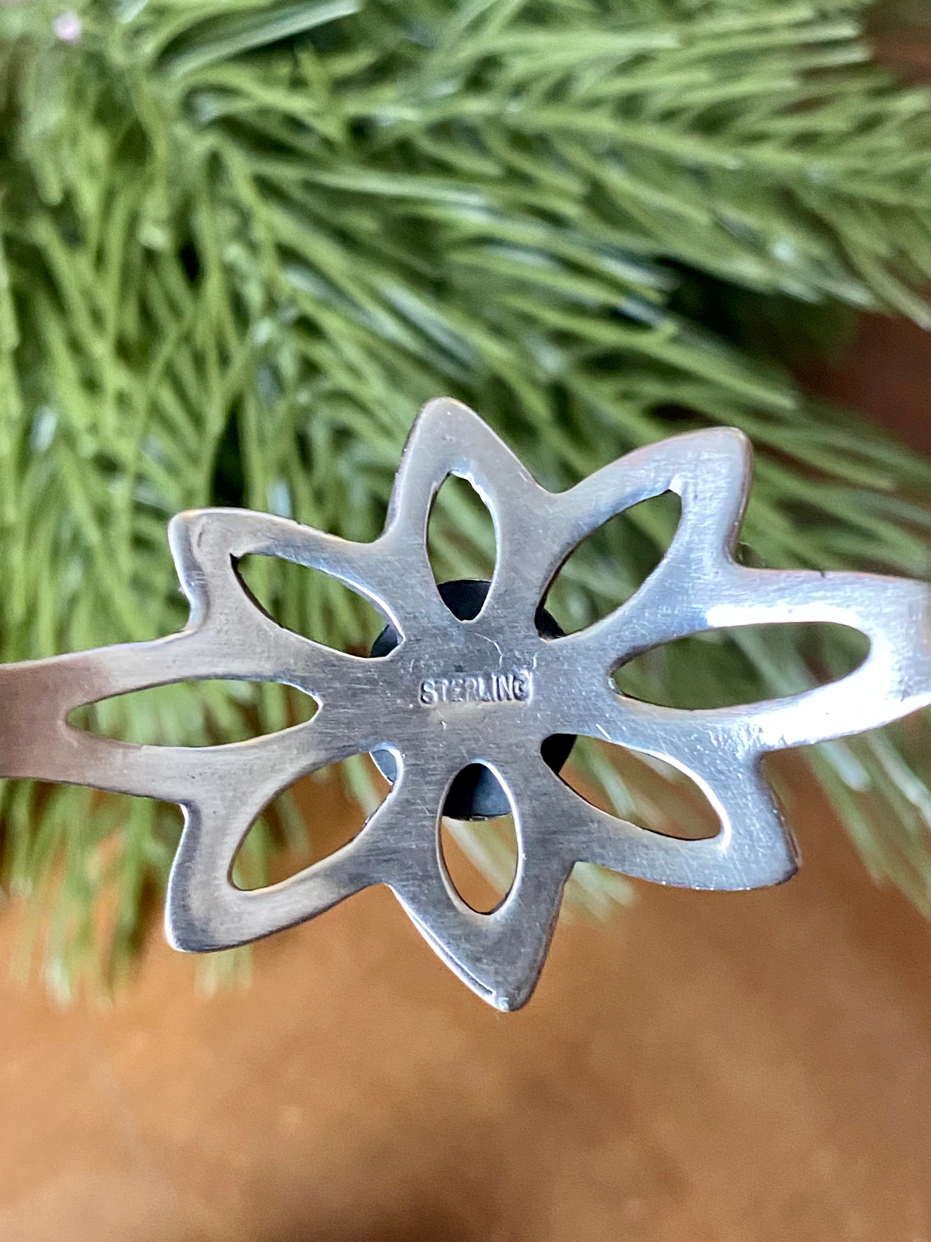 Navajo Made Golden Hill’s Turquoise & Sterling Silver Cuff Bracelet. It measures 1 1/8 inches wide with an inside circumference of 5 inches and a gap of 1 1/8 inches. Stamped sterling silver.