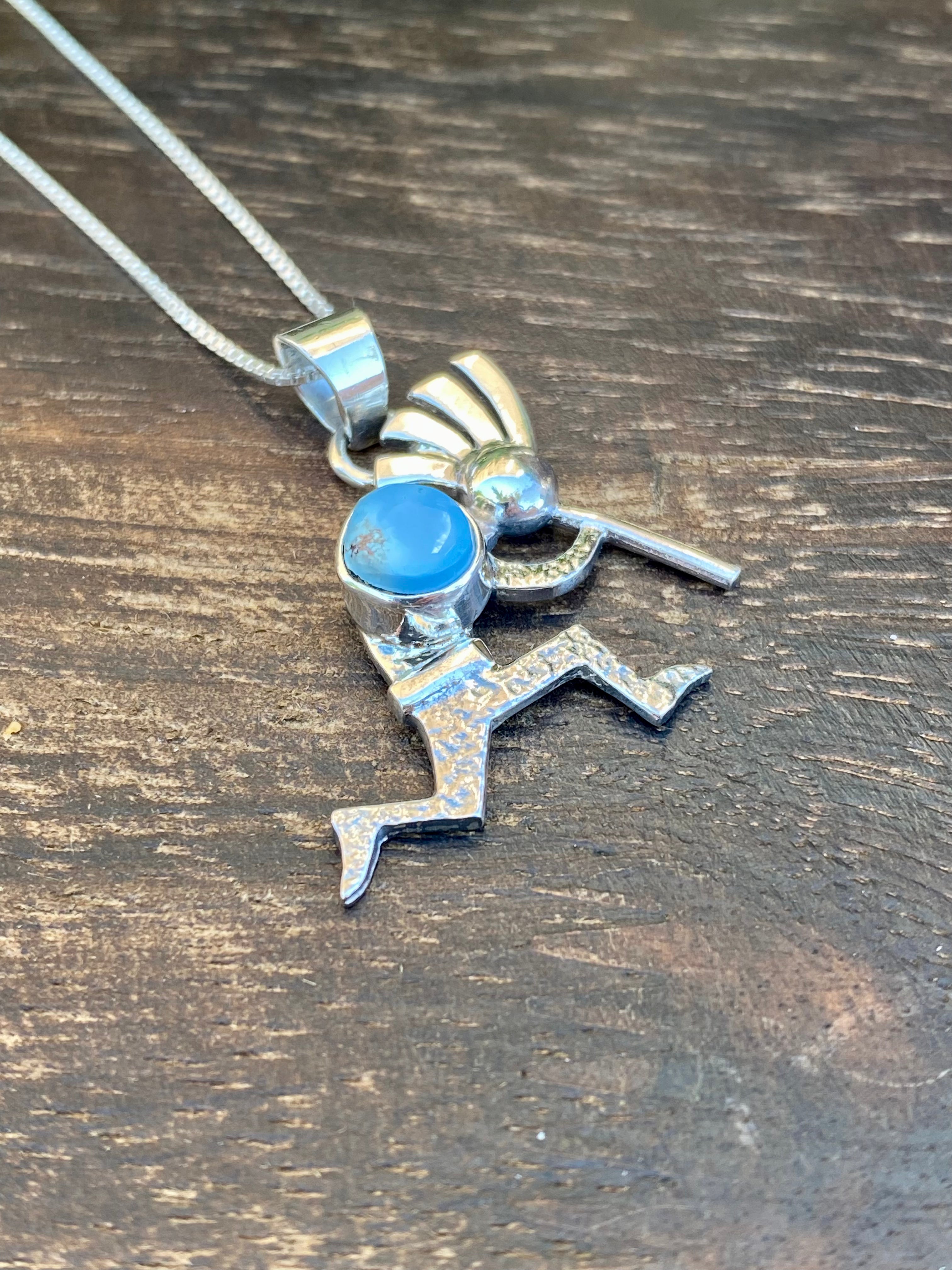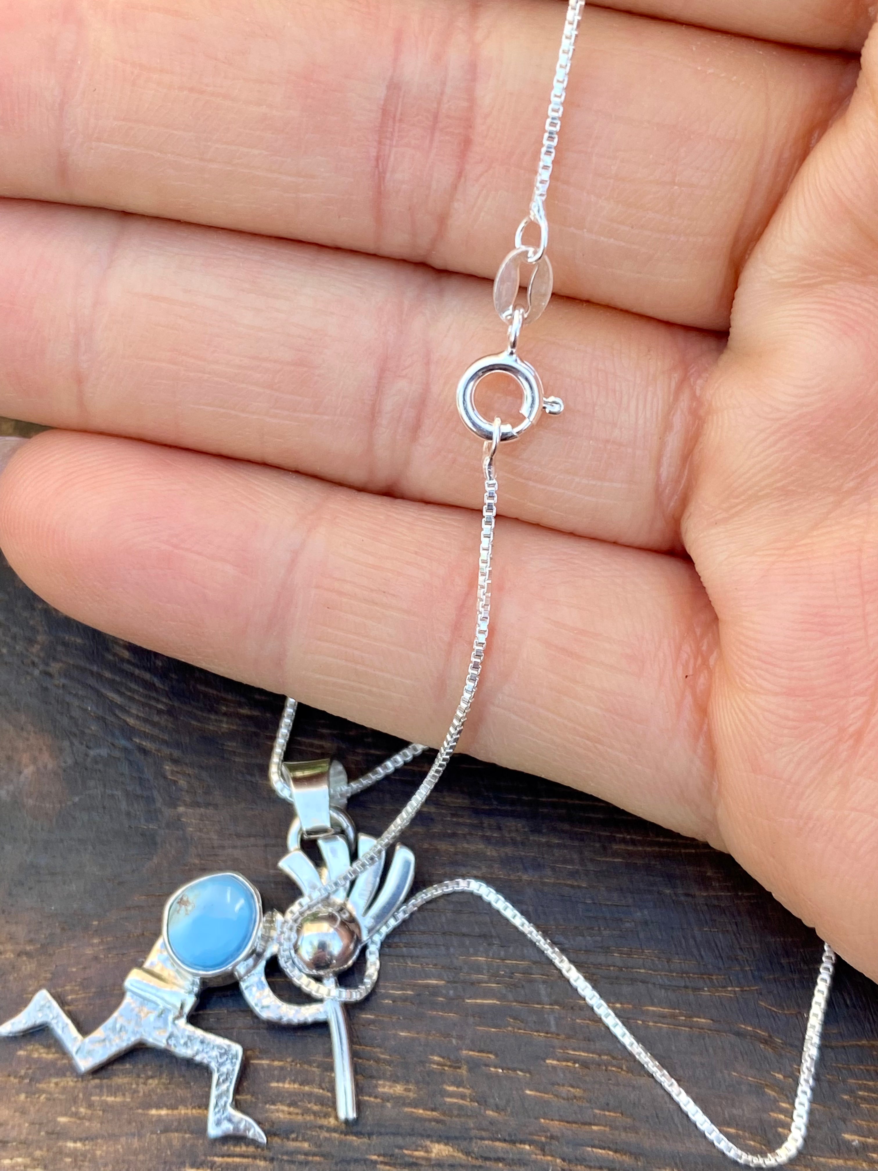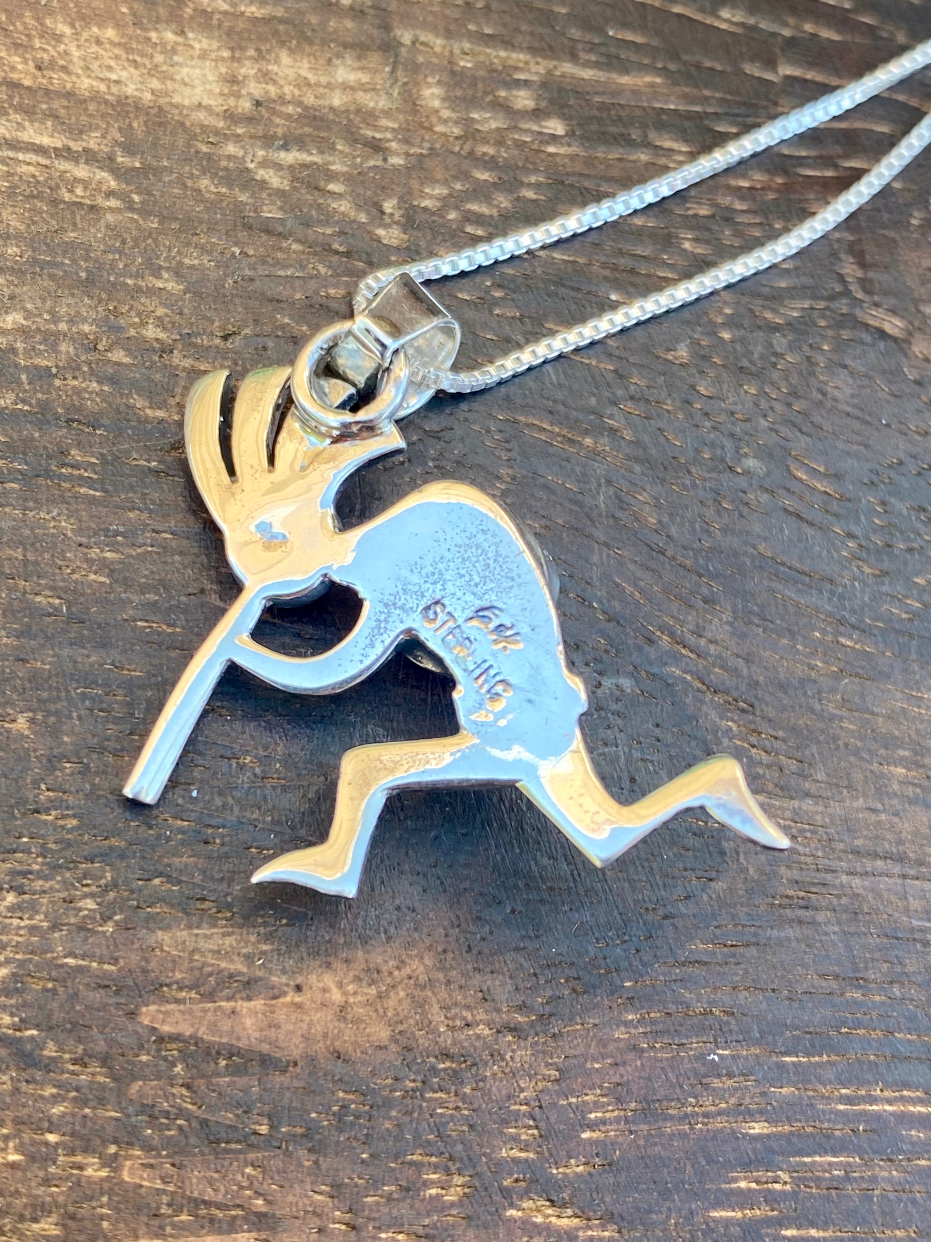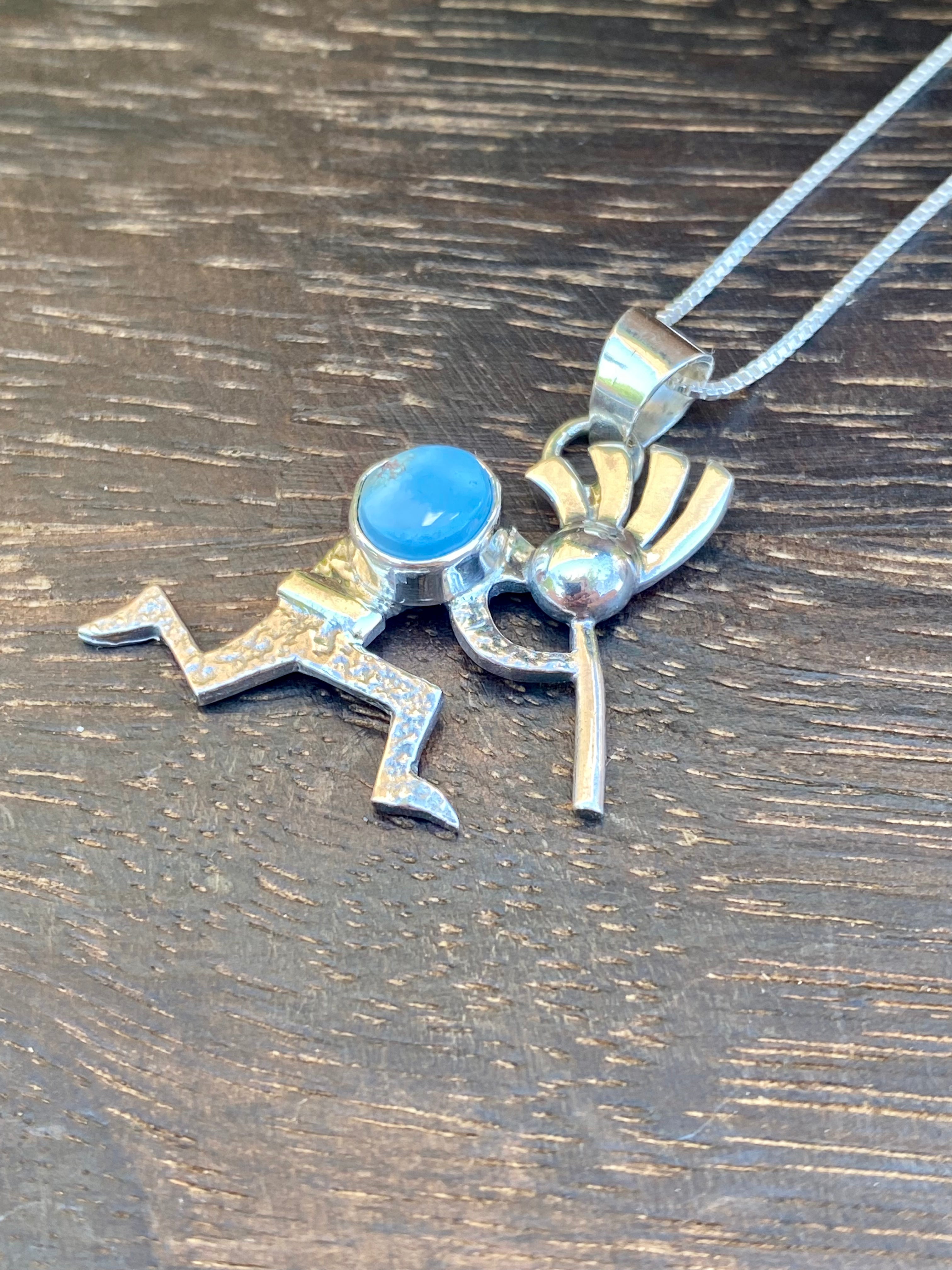 Navajo Made Golden Hill’s Turquoise & Sterling Silver Kokopelli Necklace. It measures just over 20 inches long with hang while the chain by itself measures 18 inches long. Signed by the artist and stamped sterling silver.