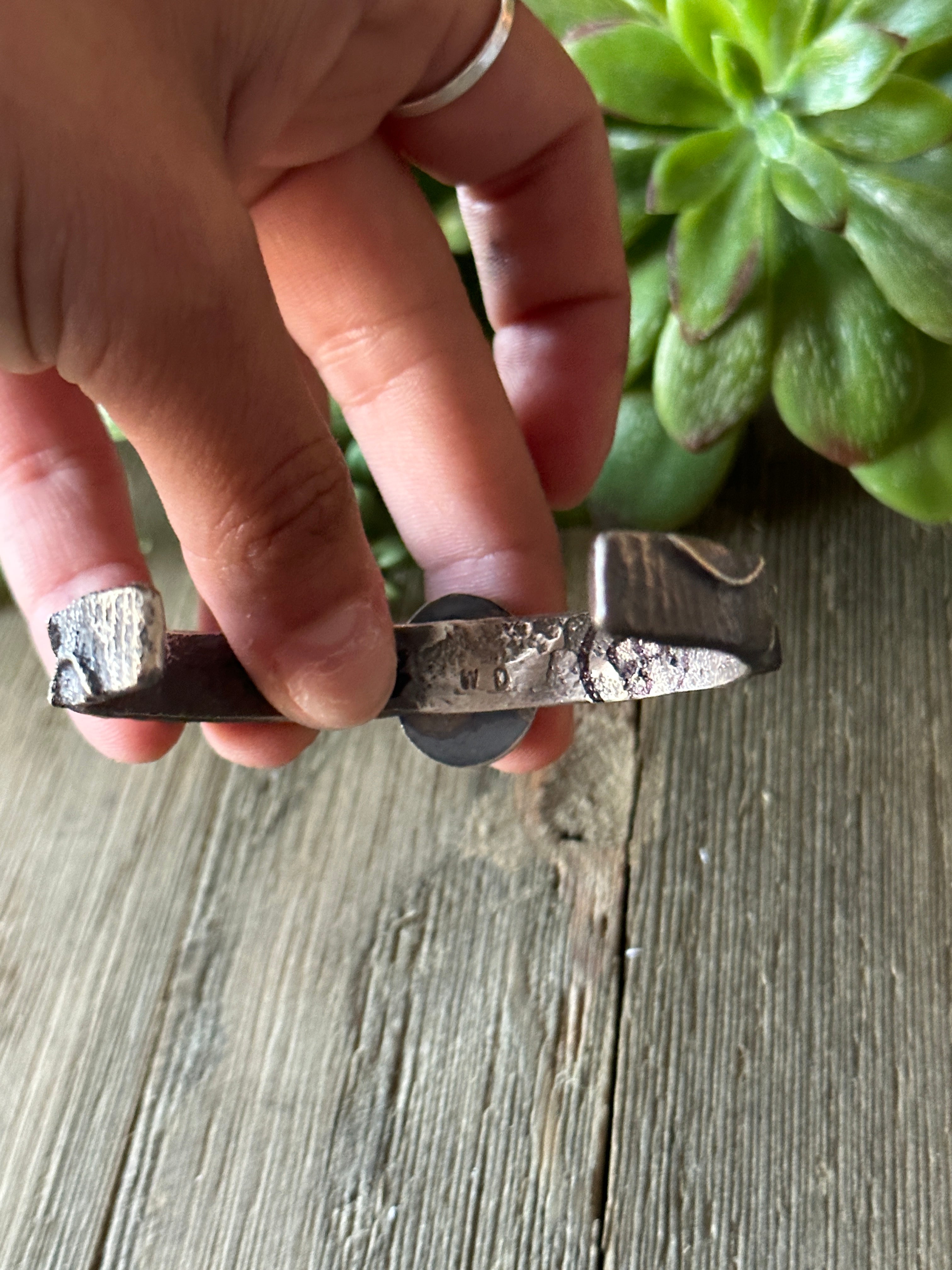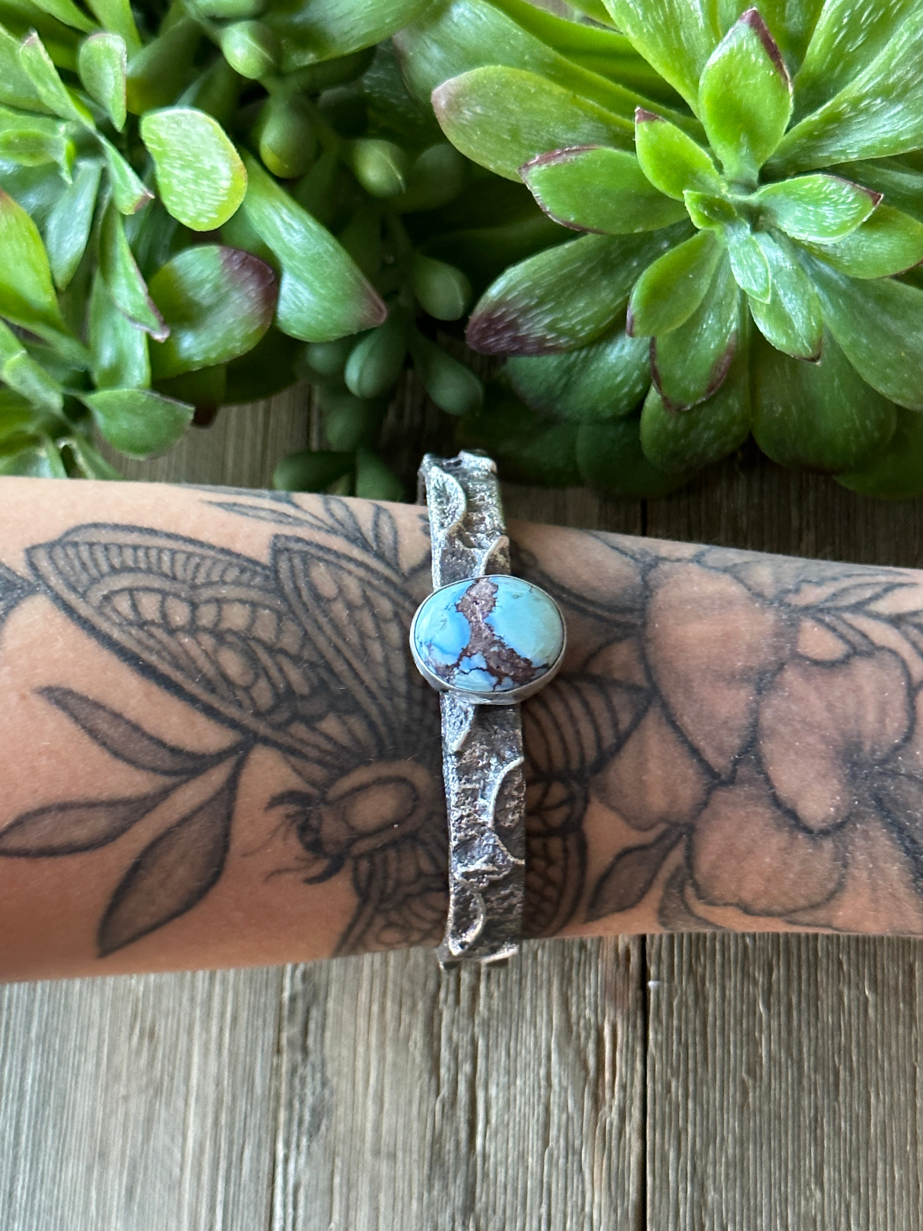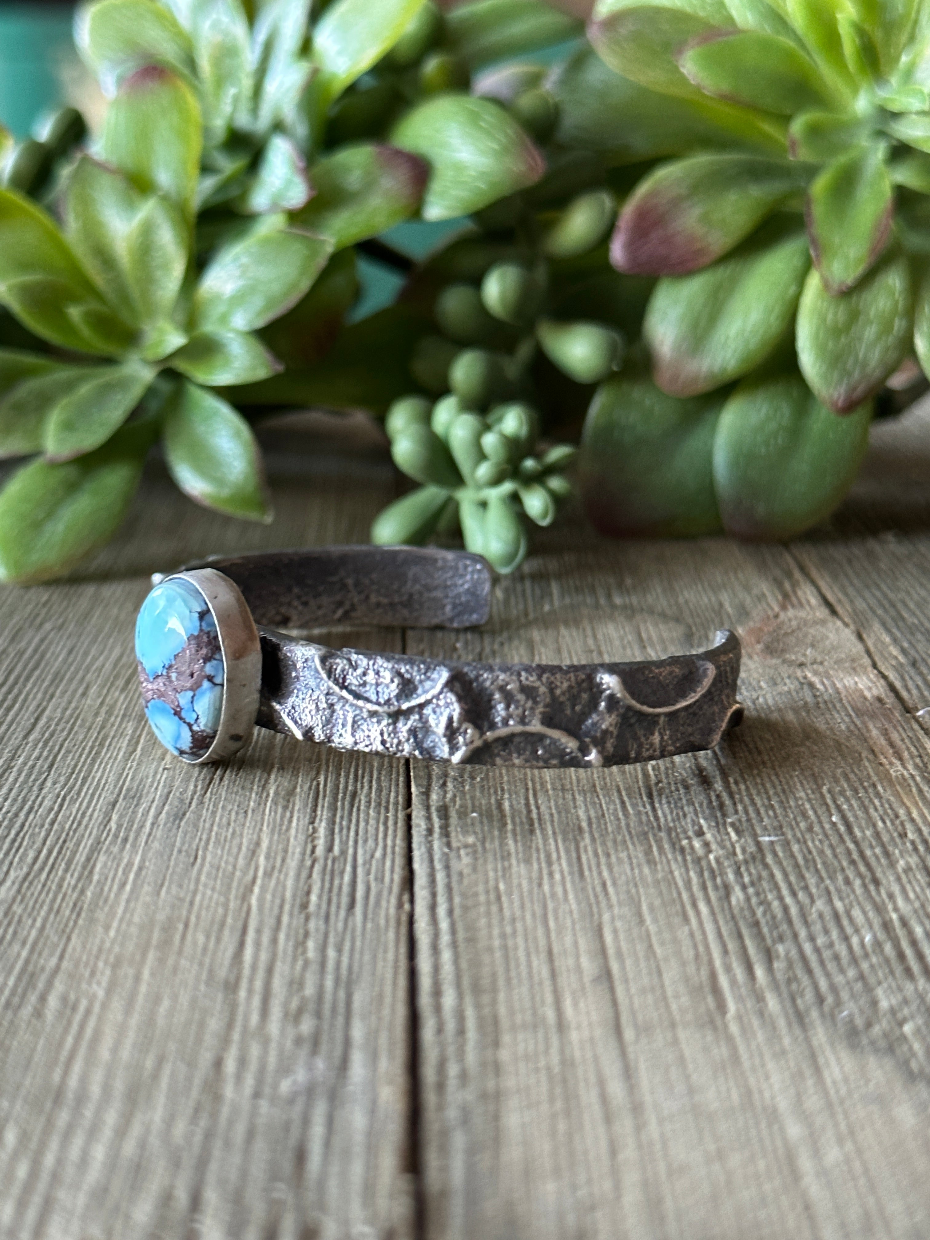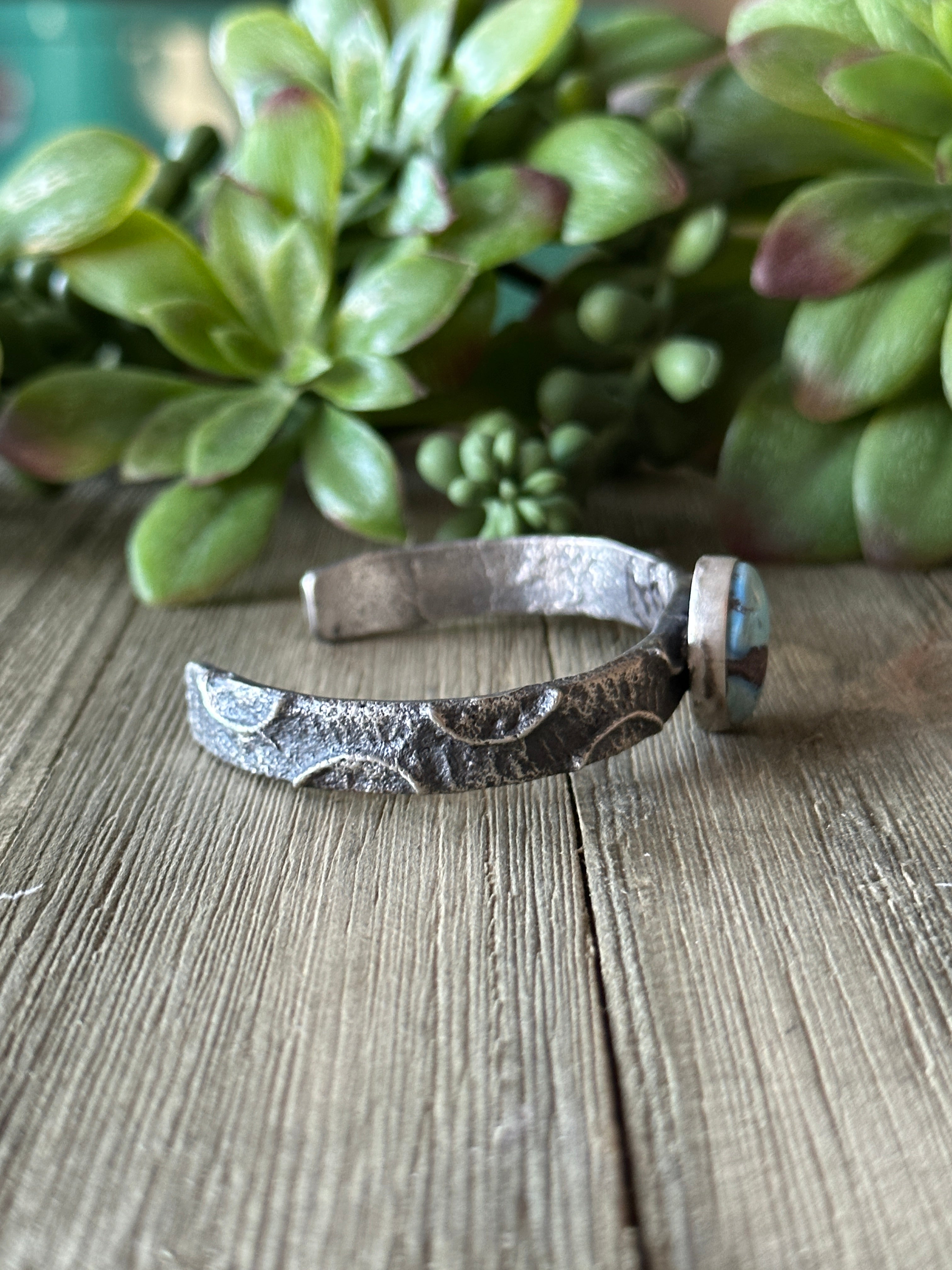 Navajo Made Golden Hills Turquoise & Sterling Silver Tufa Cast Cuff Bracelet. It measures just under 3/4 of an inch wide with an inside circumference of 5 1/8 inches and a gap of 1 3/8 inches. Signed by the artist and stamped sterling silver.