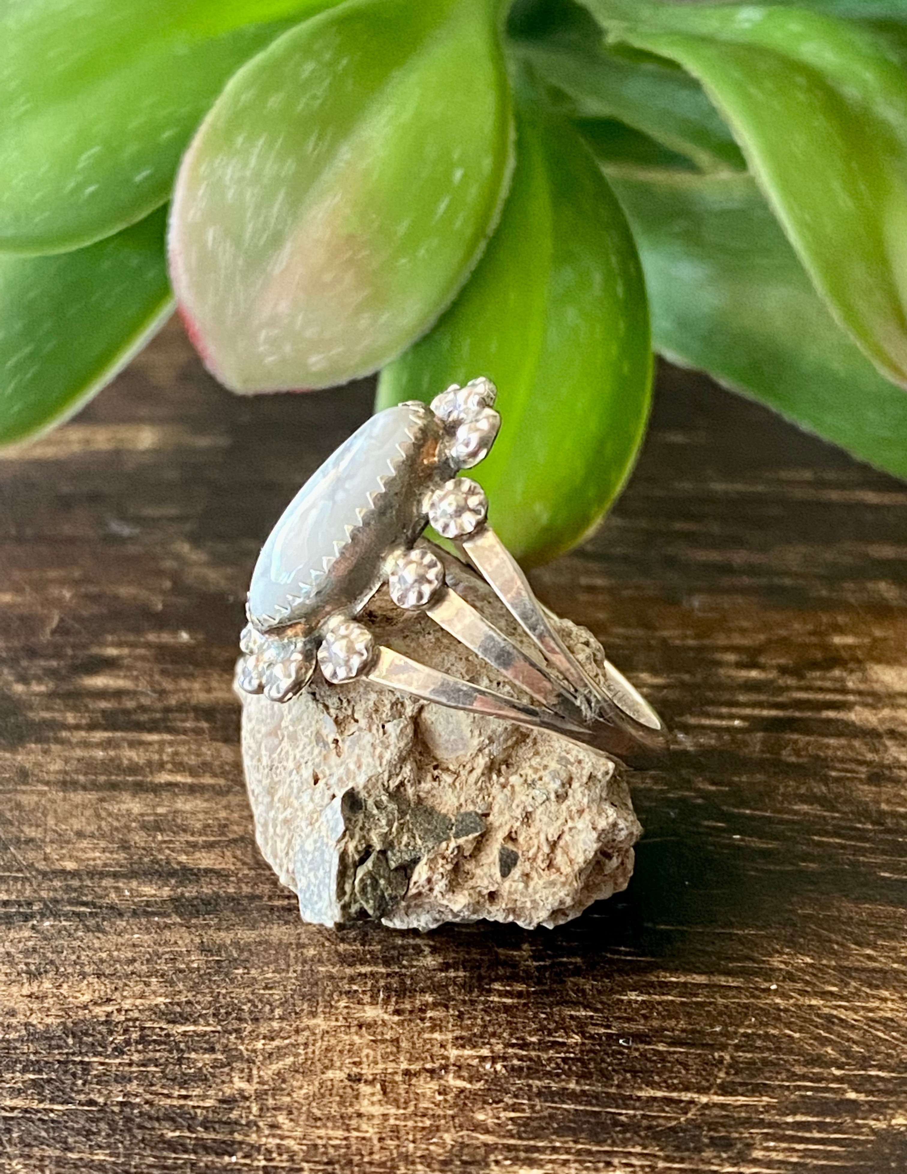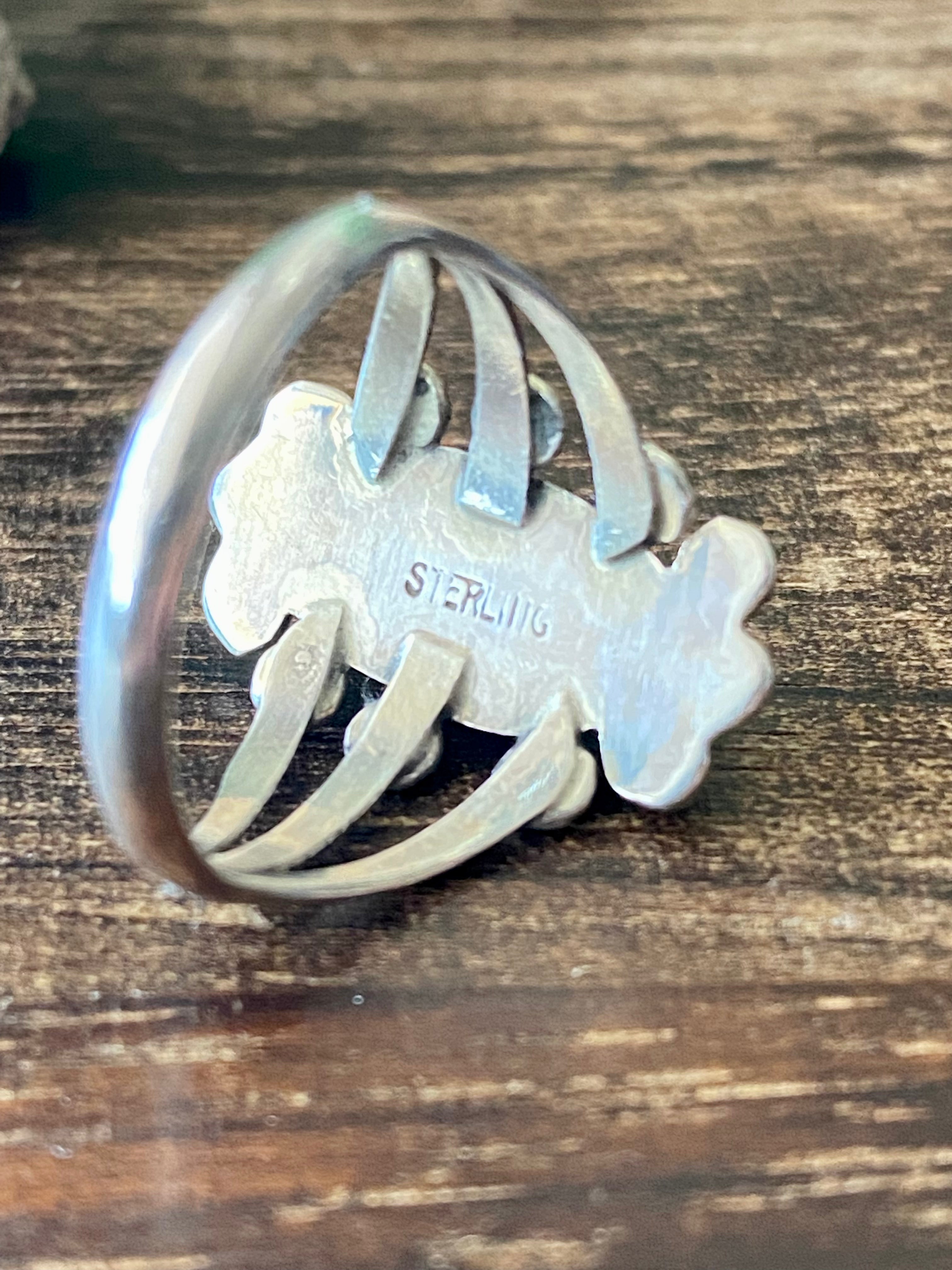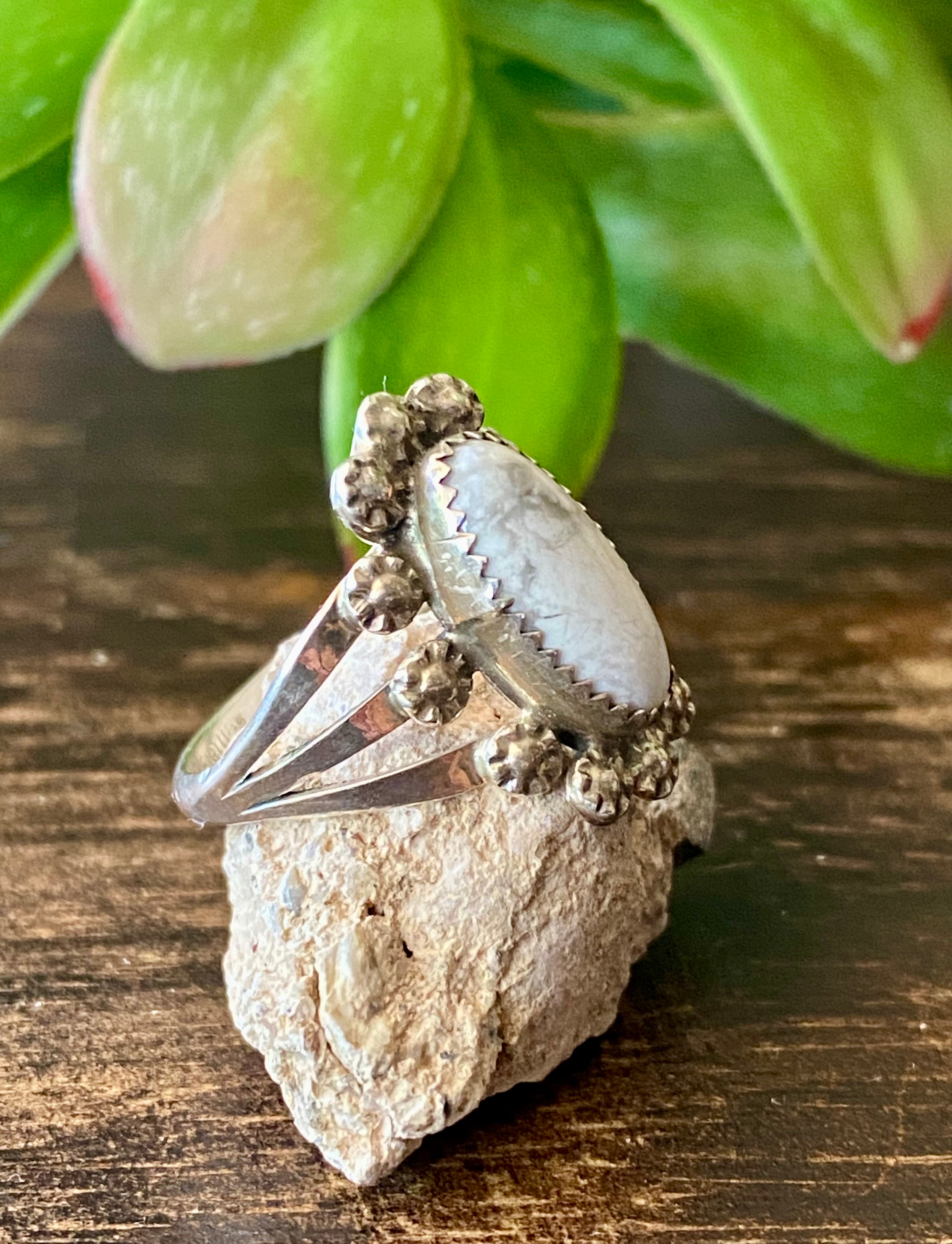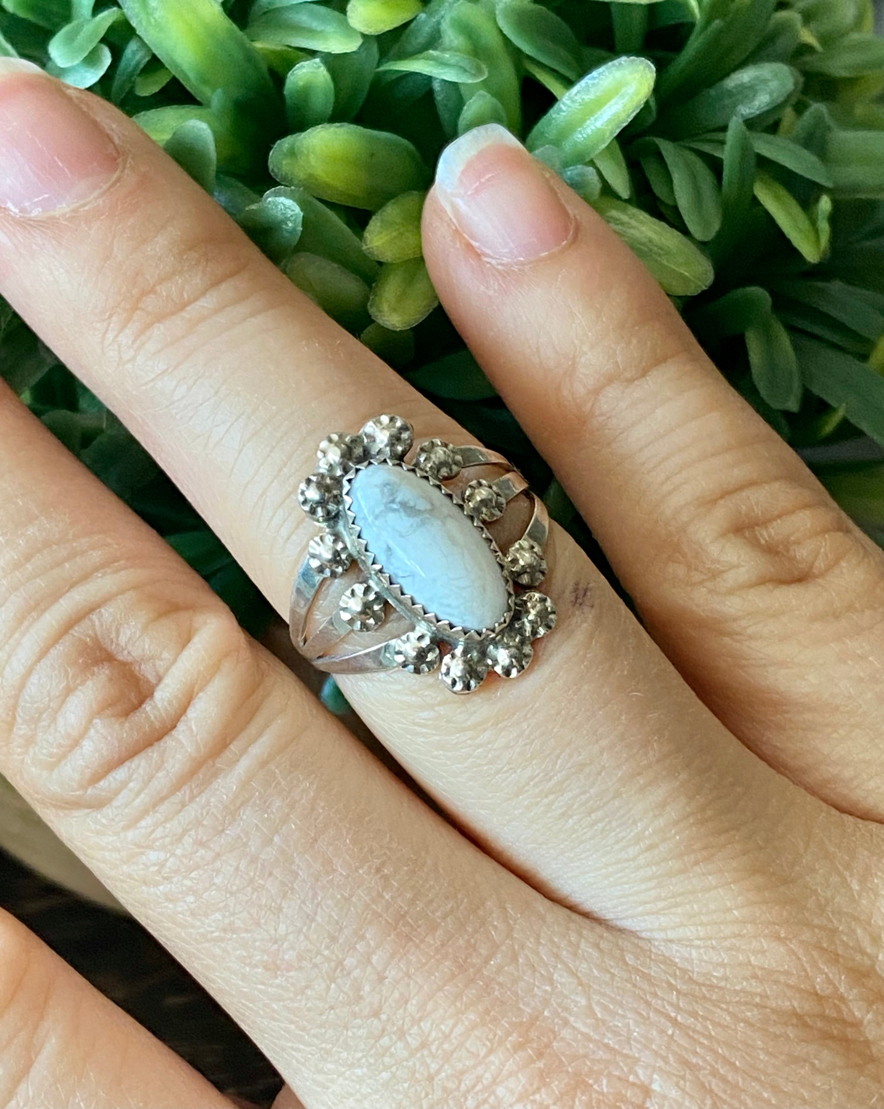 Navajo Made Howlite & Sterling Silver Ring Size 8. It measures just over 3/4 of an inch long and 3/4 of an inch wide. Stones will differ due to natural stones. Stamped sterling silver.