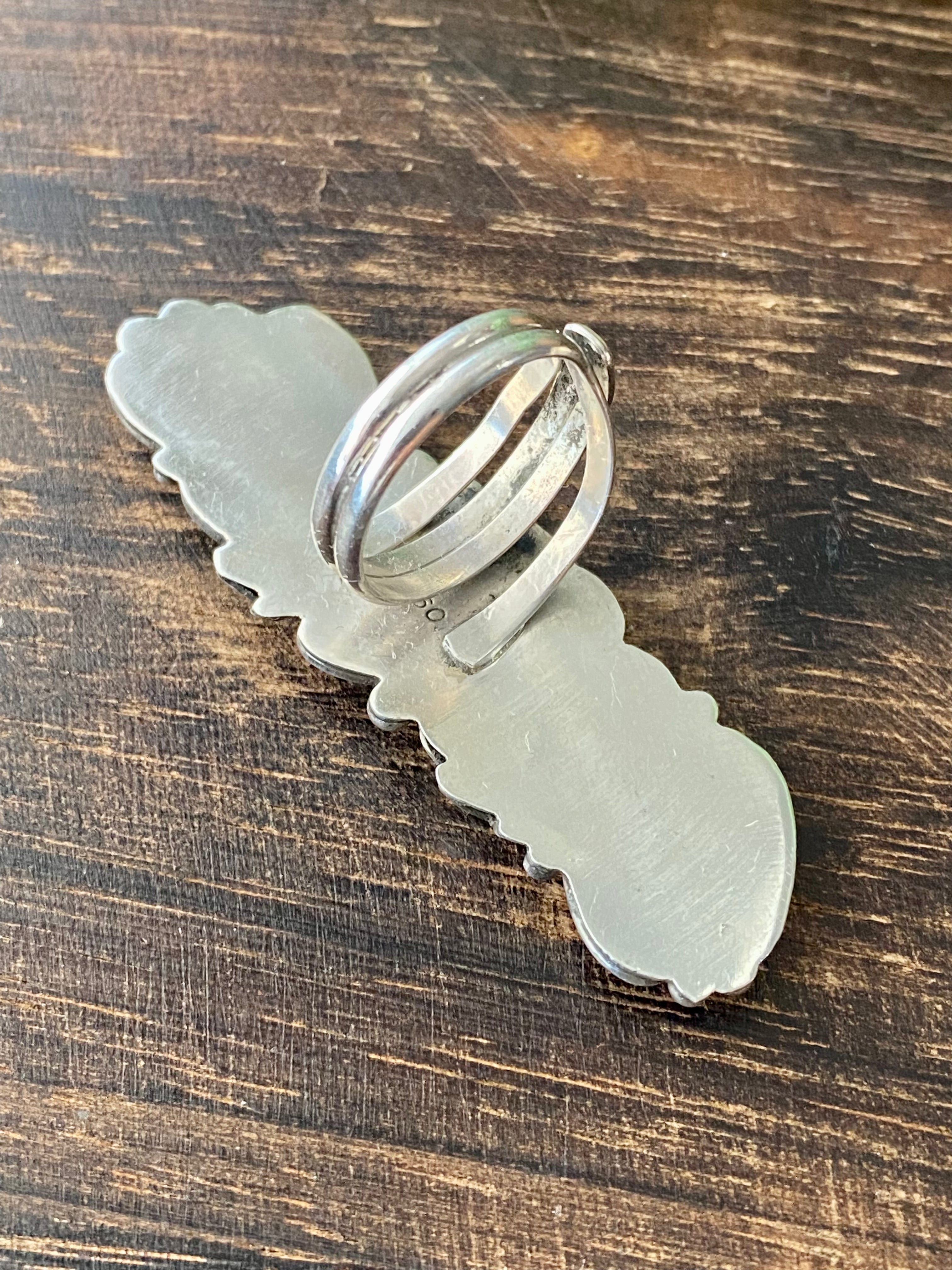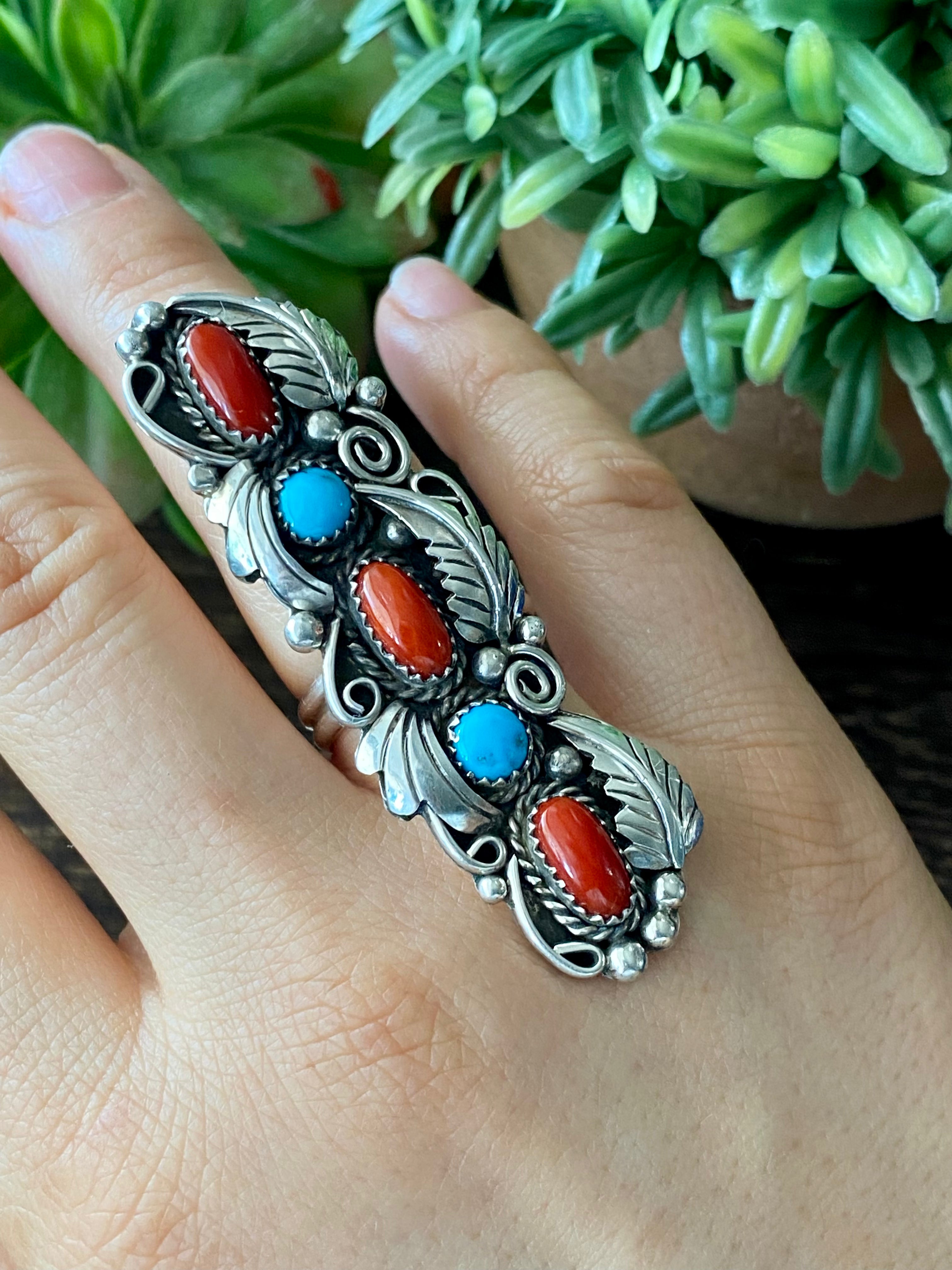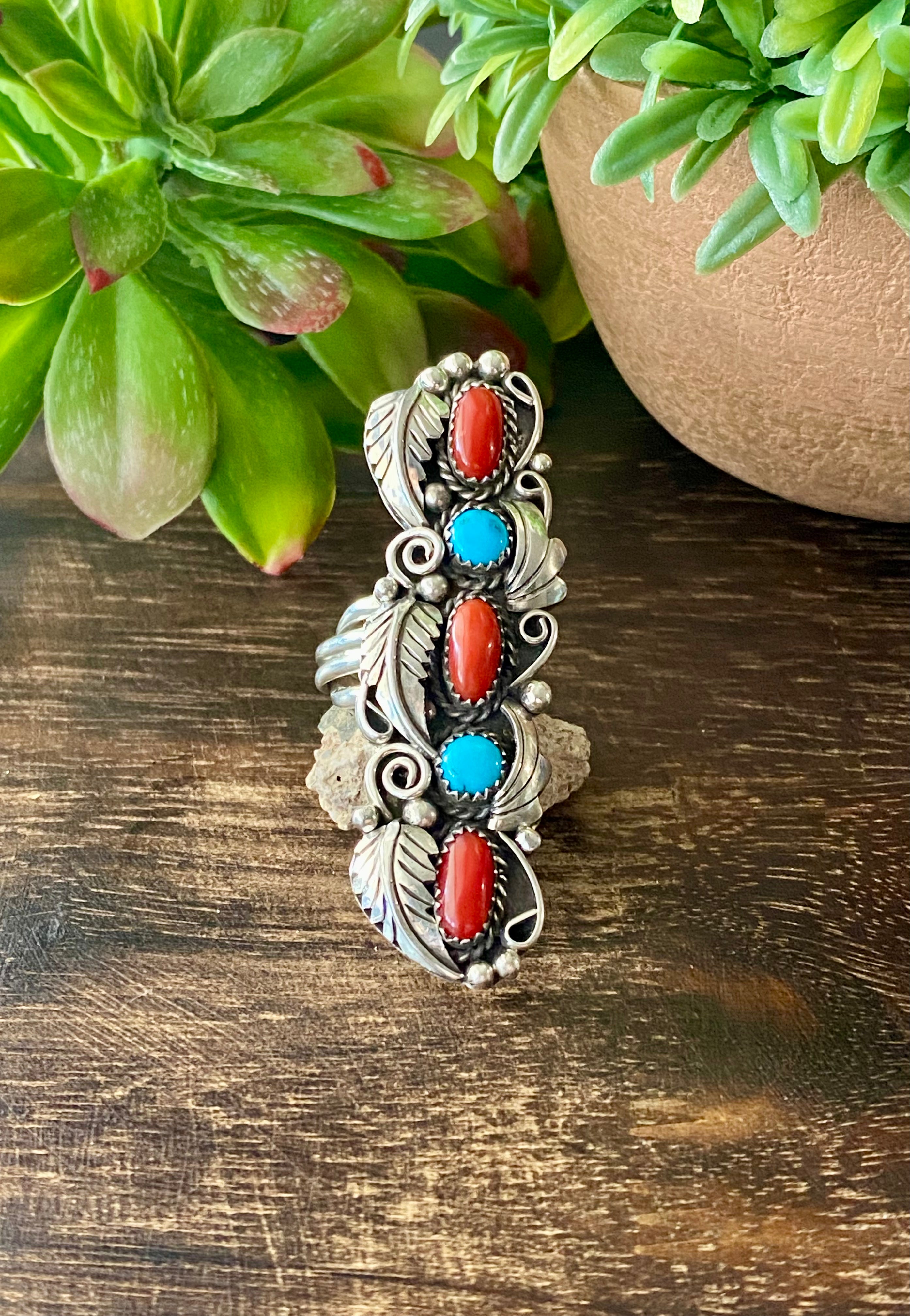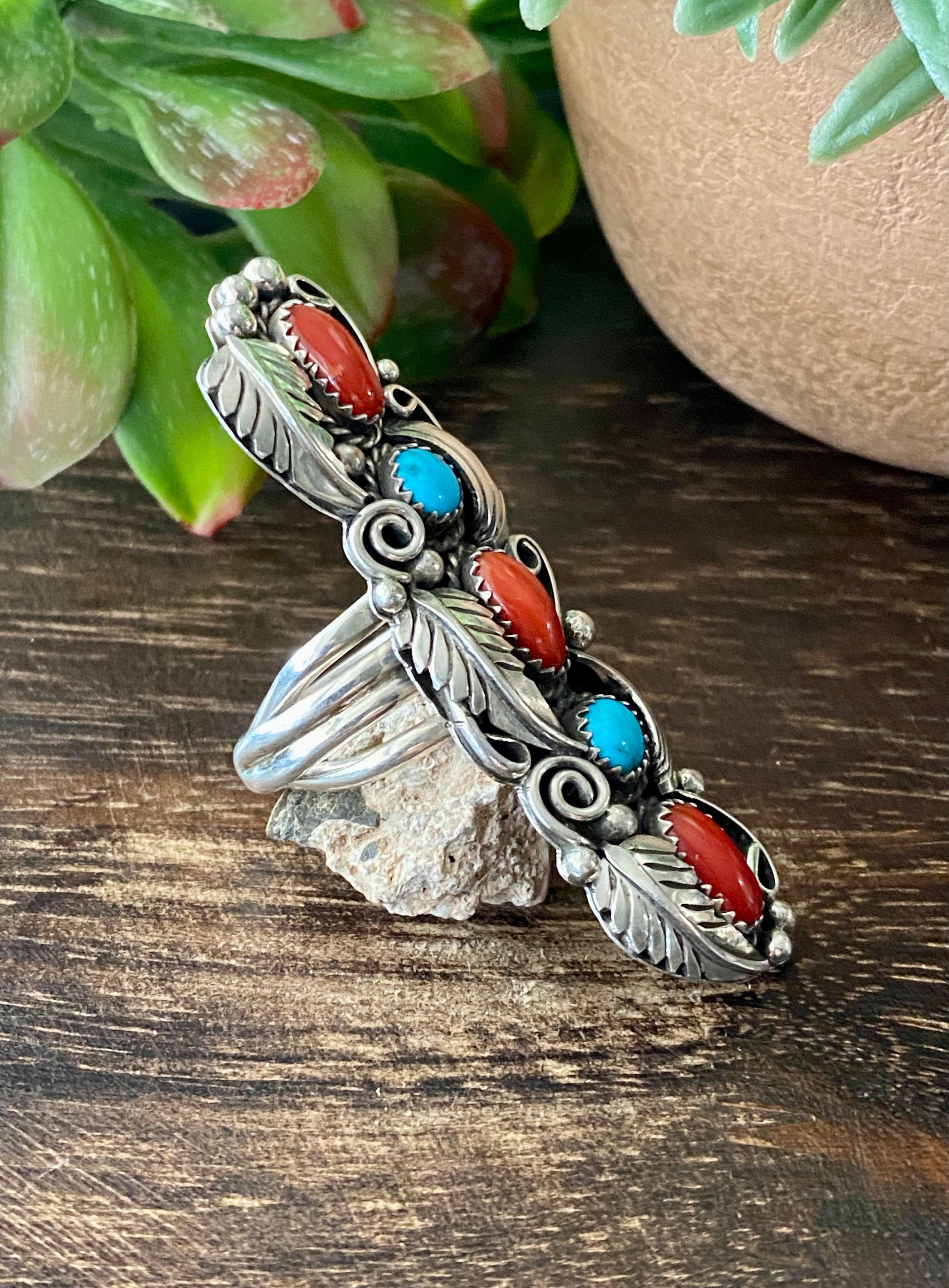 Navajo Made Kingman Turquoise & Coral Sterling Silver Adjustable Ring Size 8.5. It measures 2 1/2 inches long and 3/4 of an inch wide. Signed by the artist and stamped sterling silver.