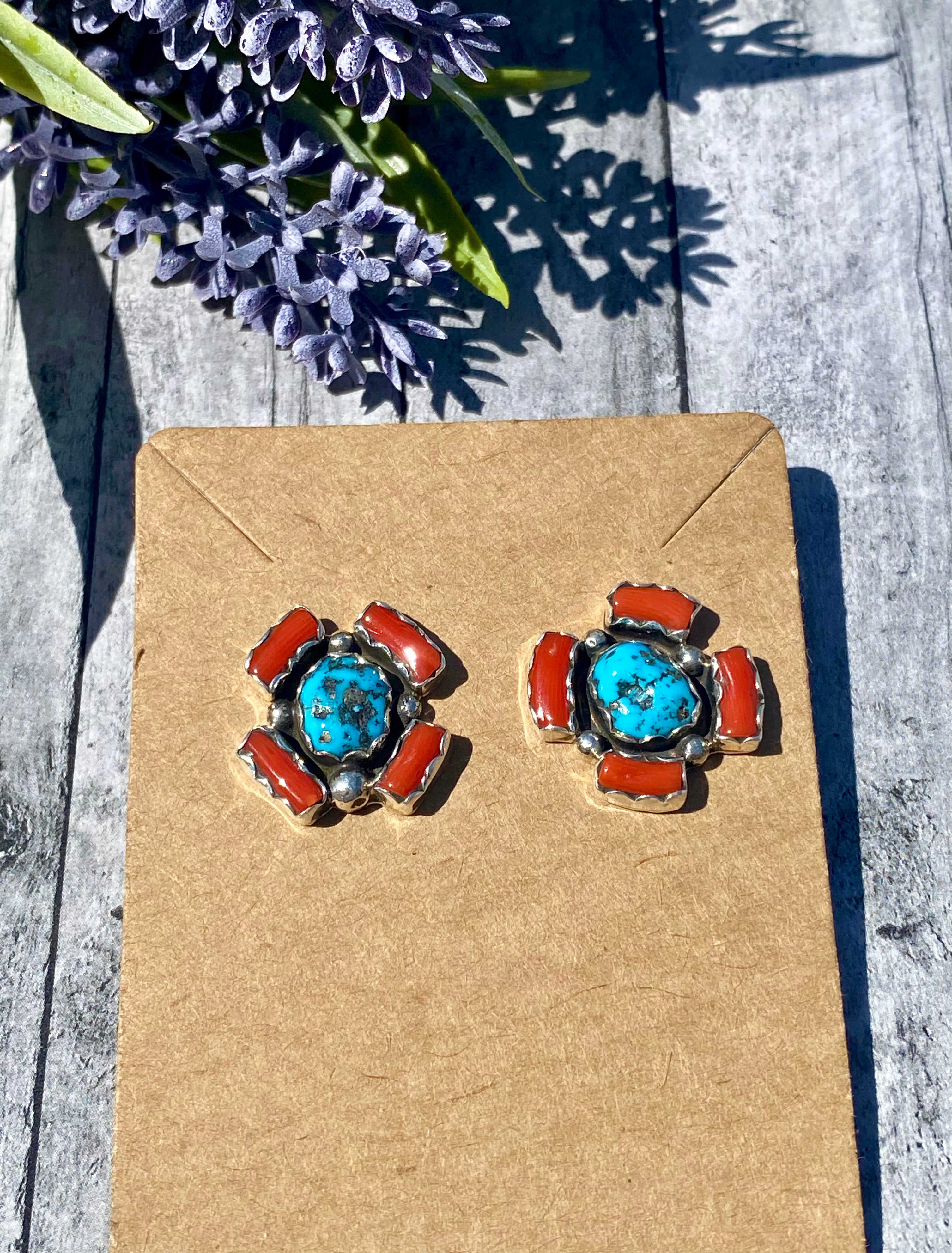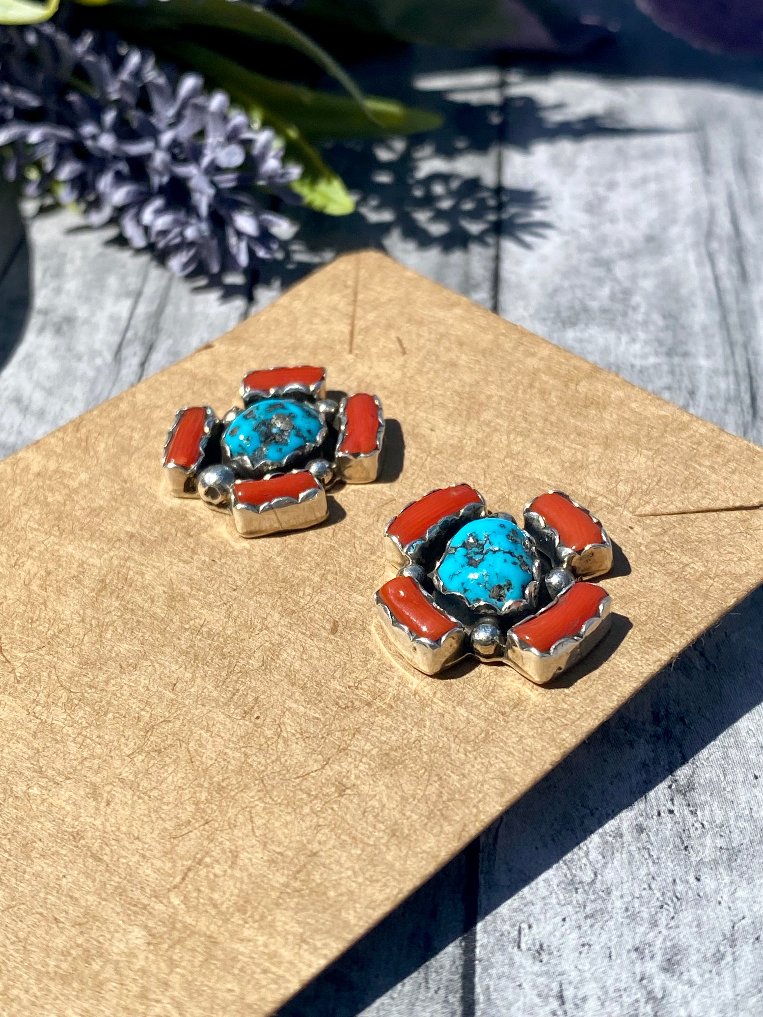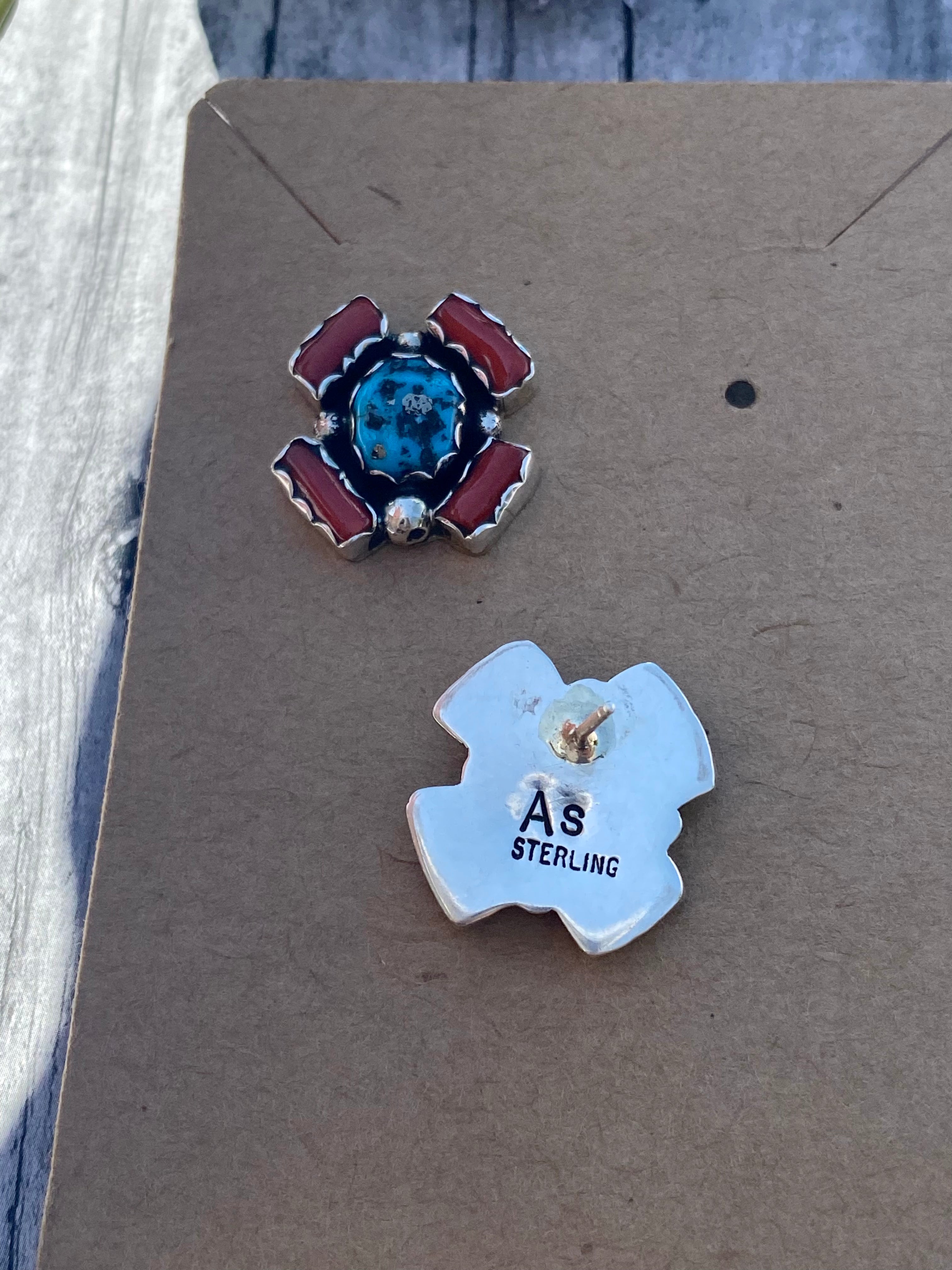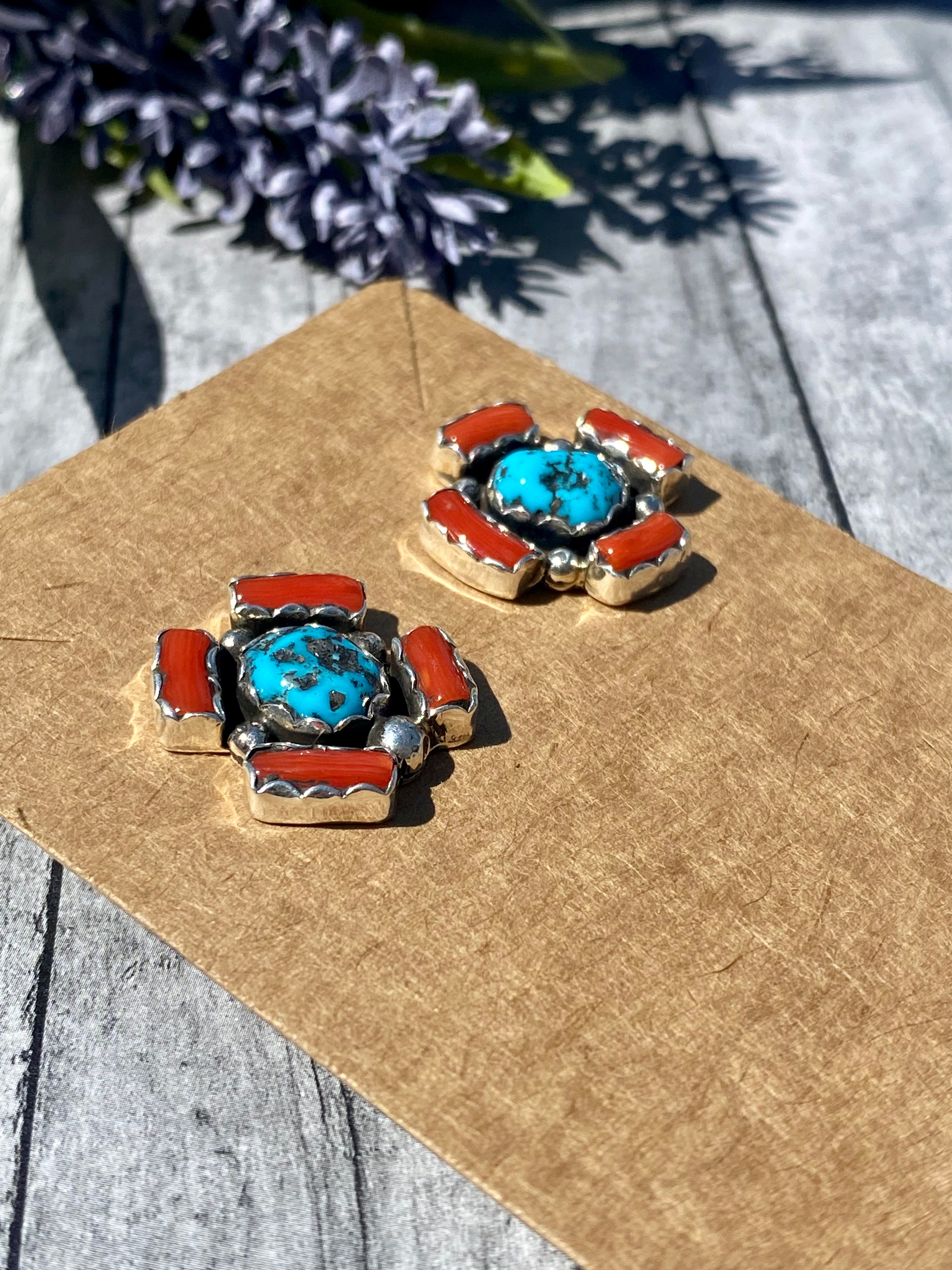 Navajo Made Kingman Turquoise & Coral Sterling Silver Post Earrings