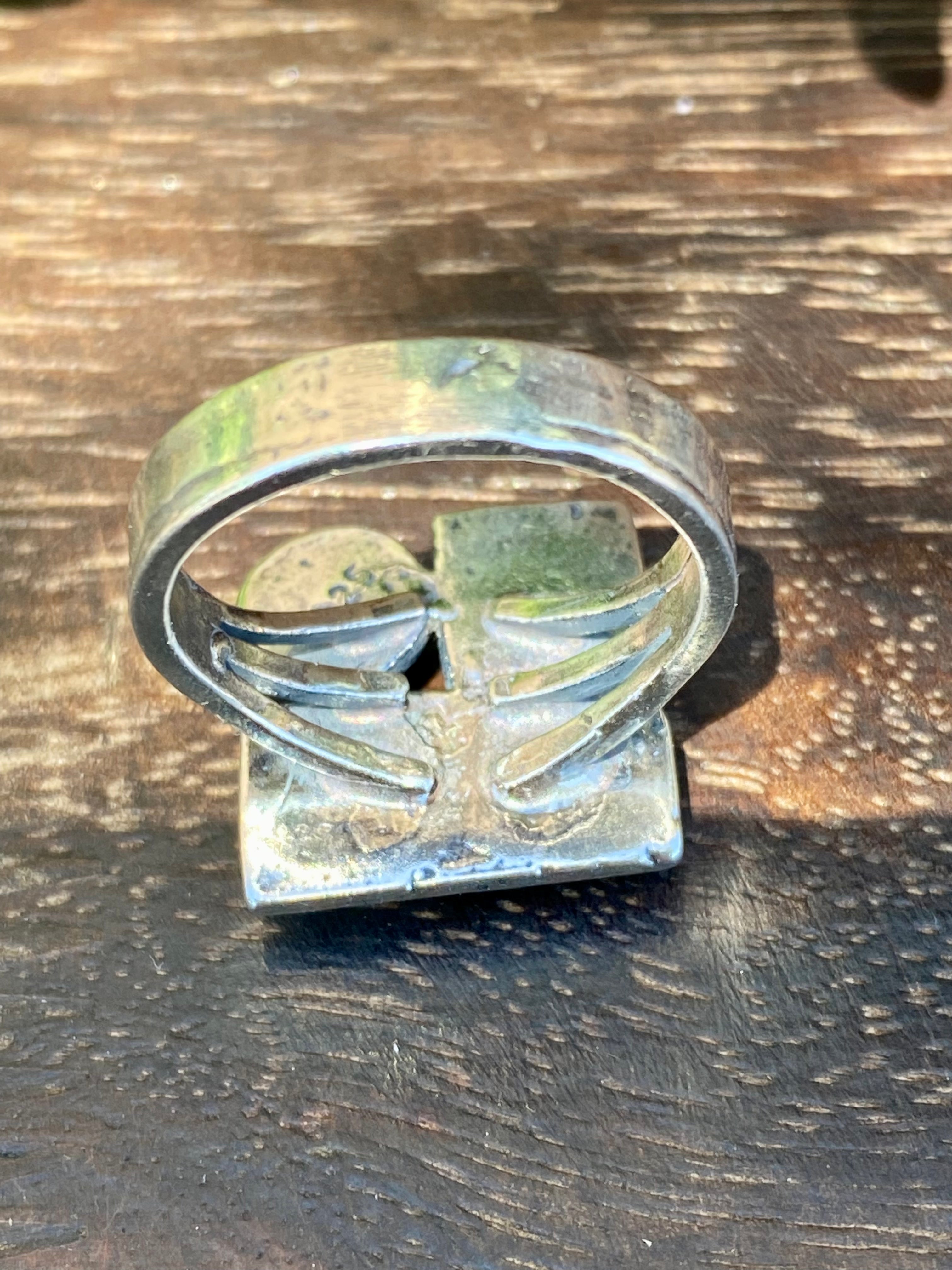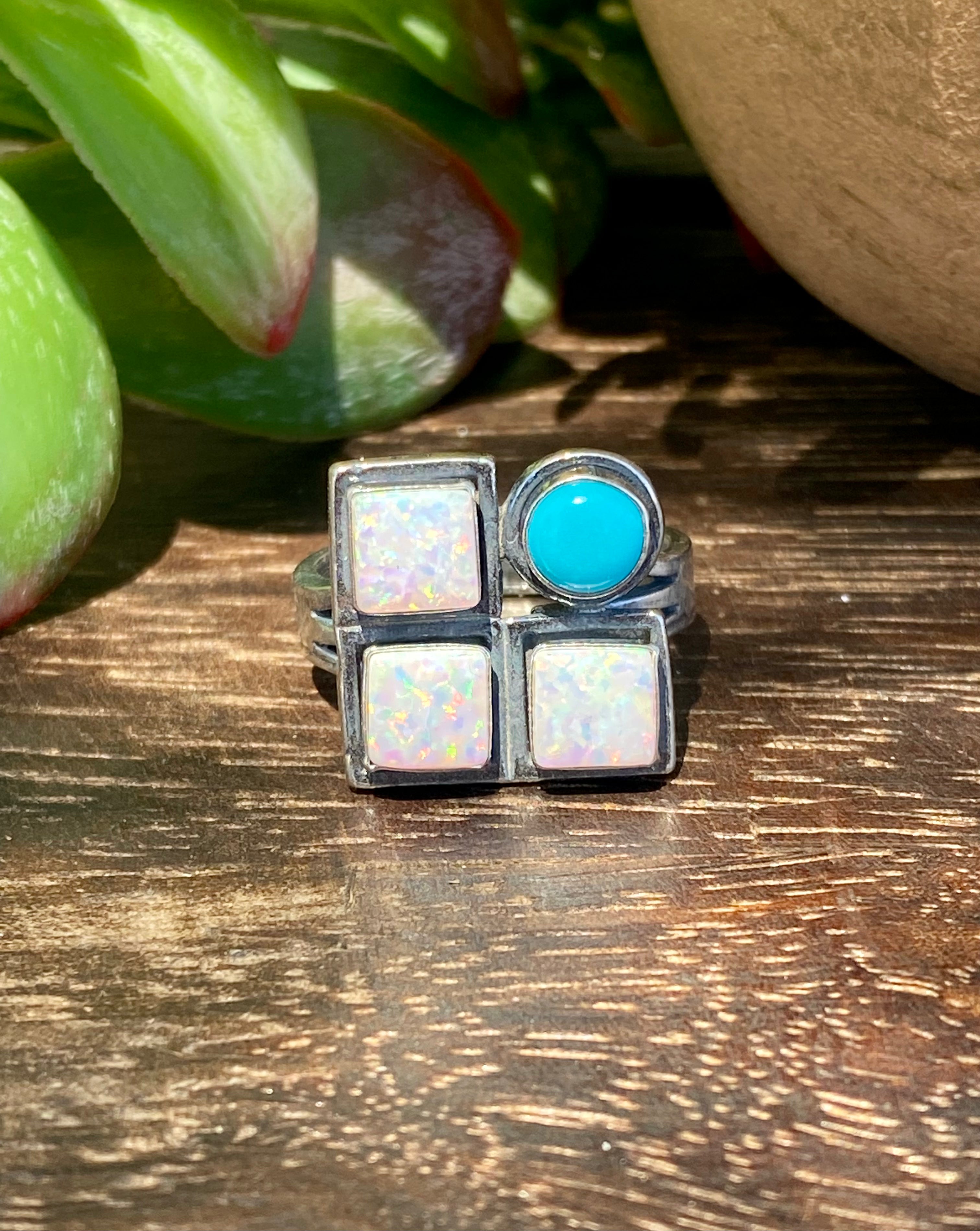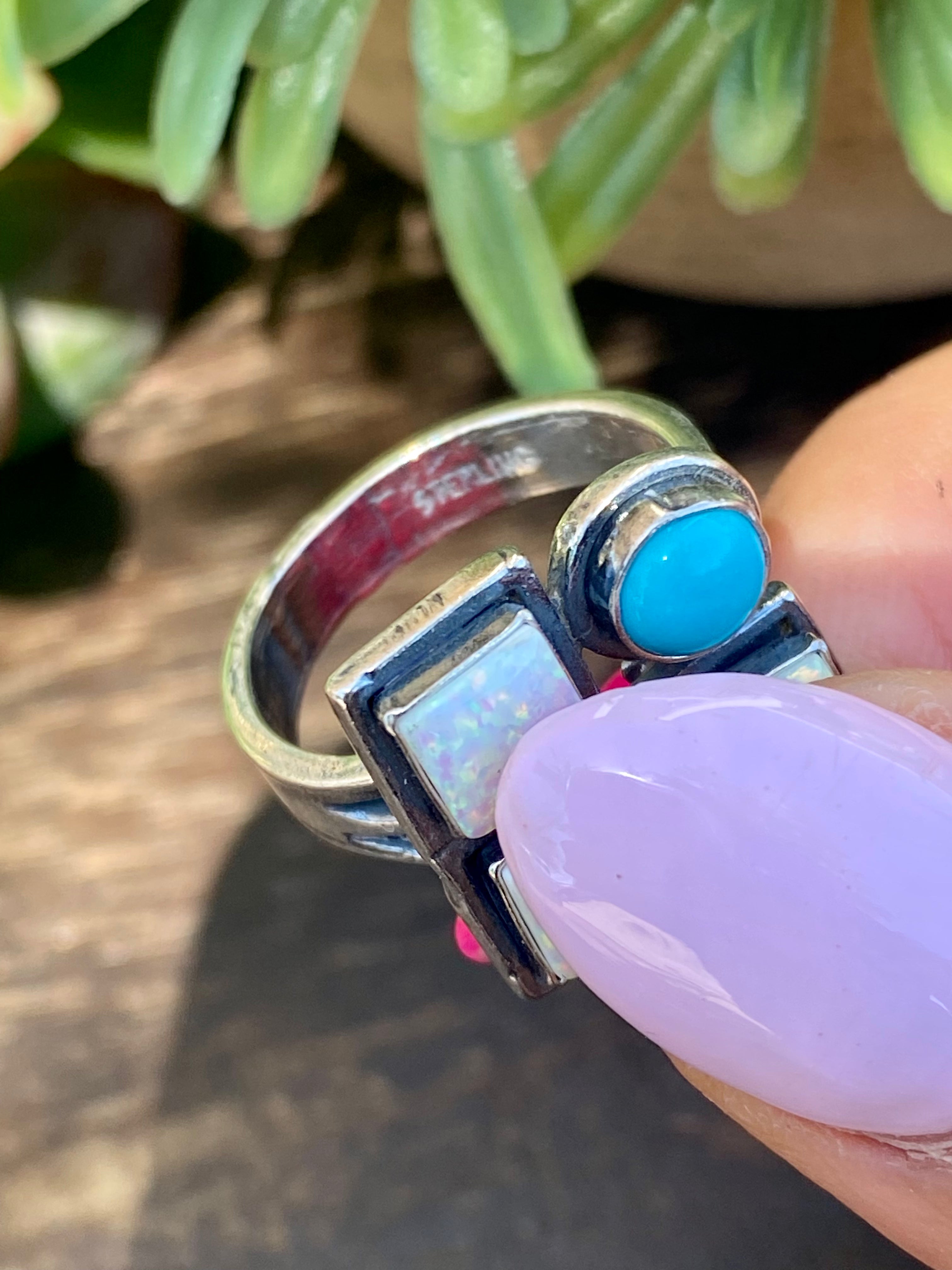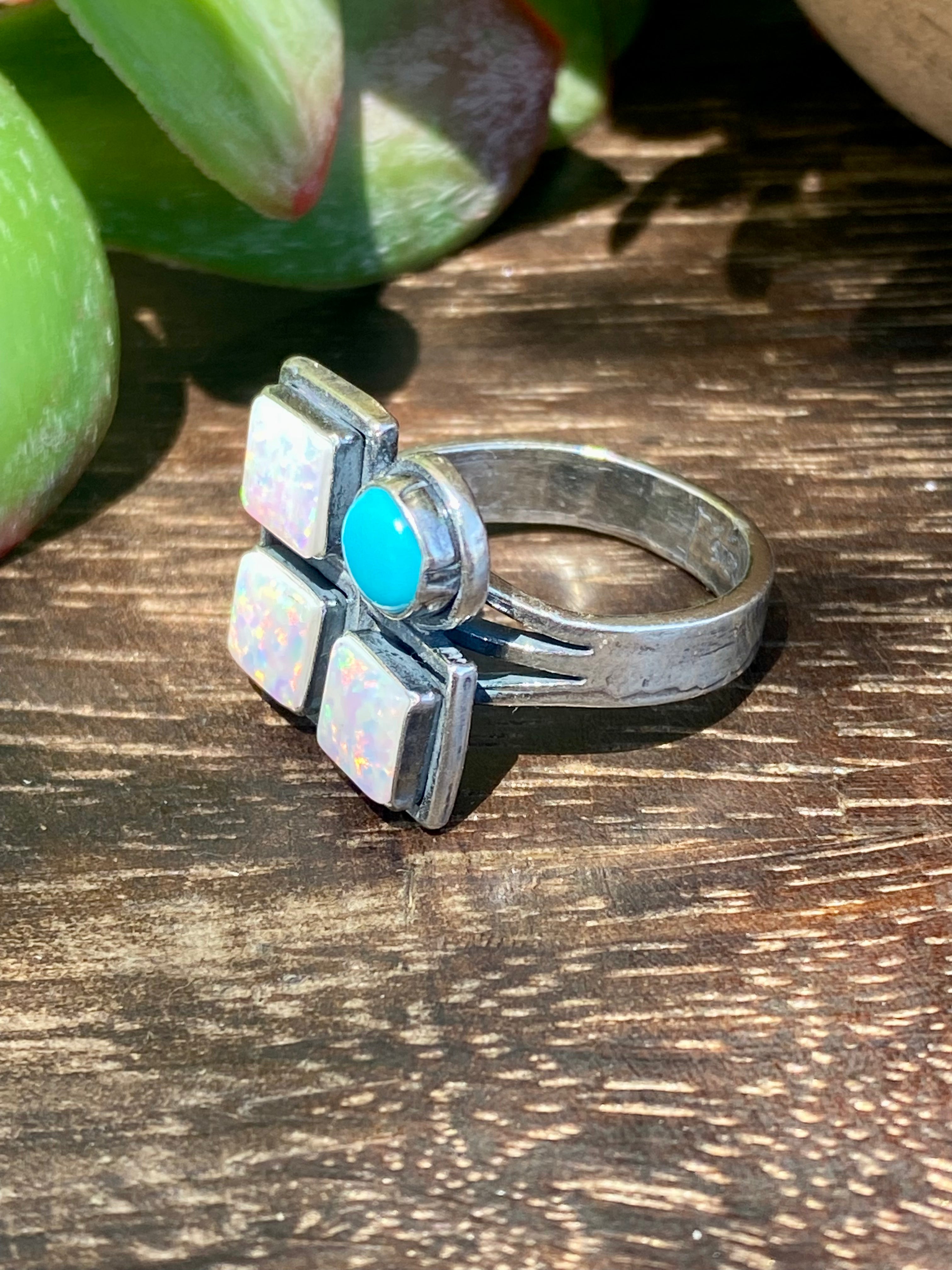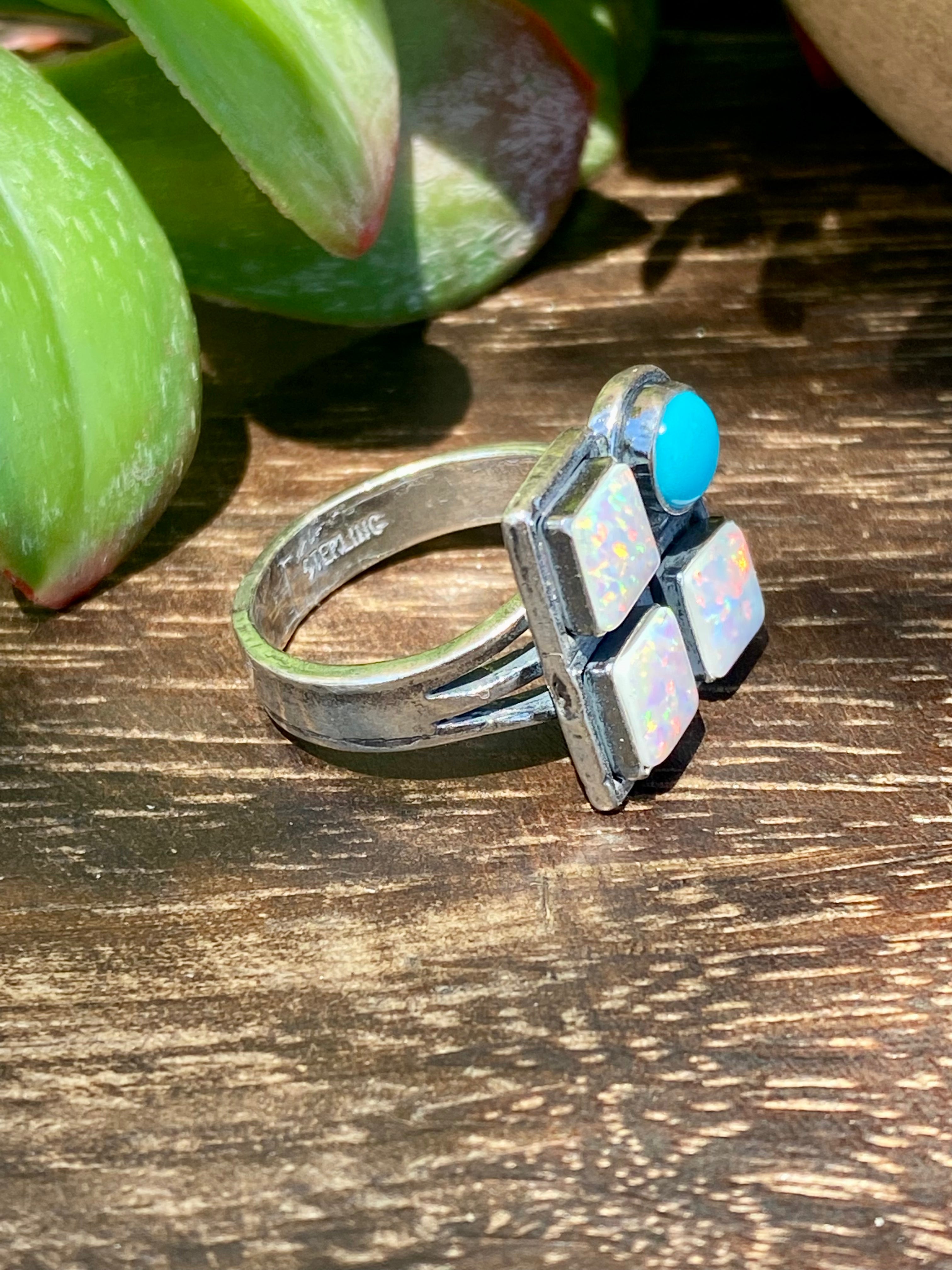 Navajo Made Kingman Turquoise & Opal Sterling Silver Ring Size 5