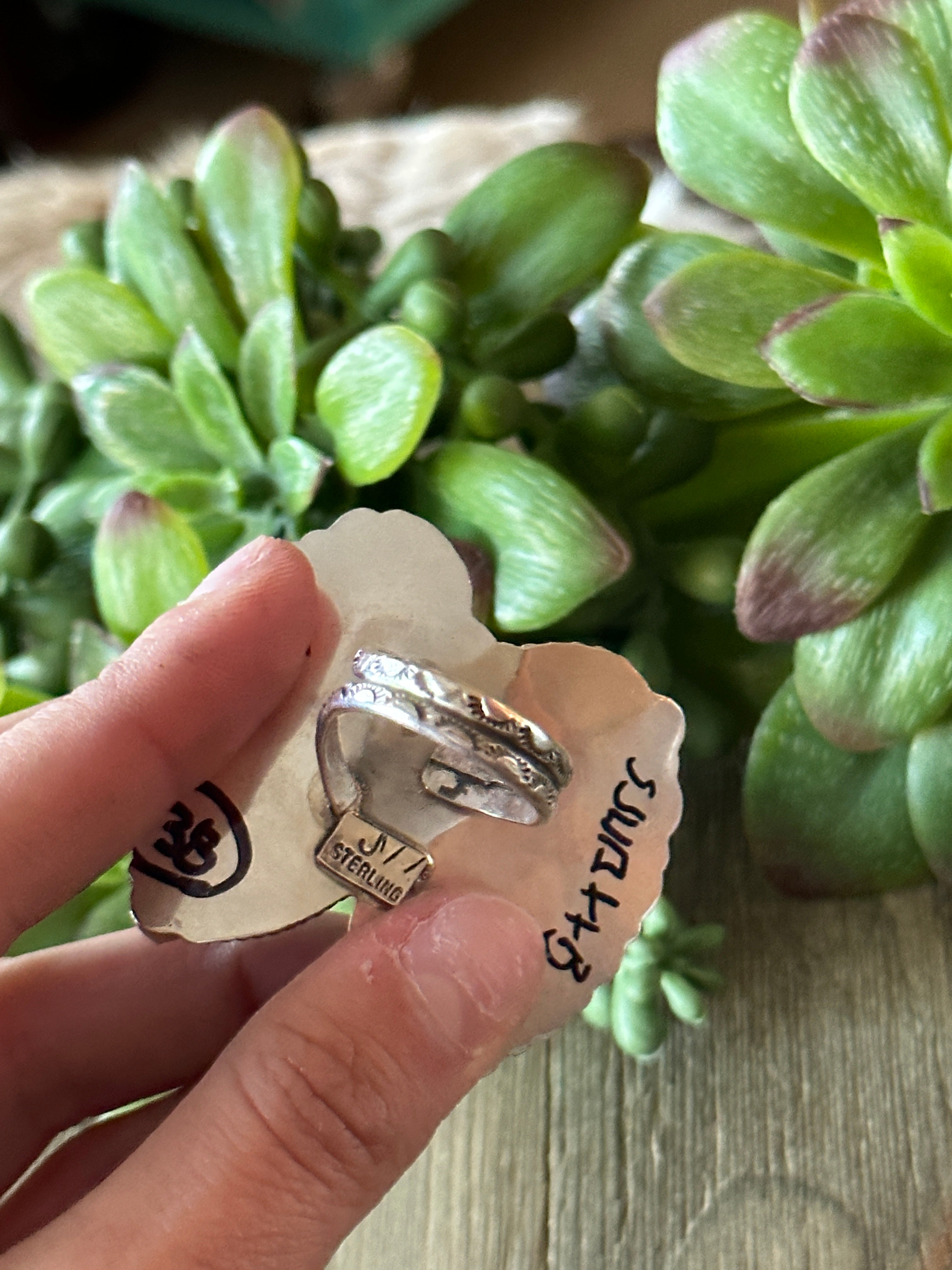 Navajo Made Kingman Turquoise & Sterling Silver Butterfly Cluster Adjustable Ring. It measures 1 7/8 inches long and just under 2 inches wide. Signed by artist and stamped sterling silver.