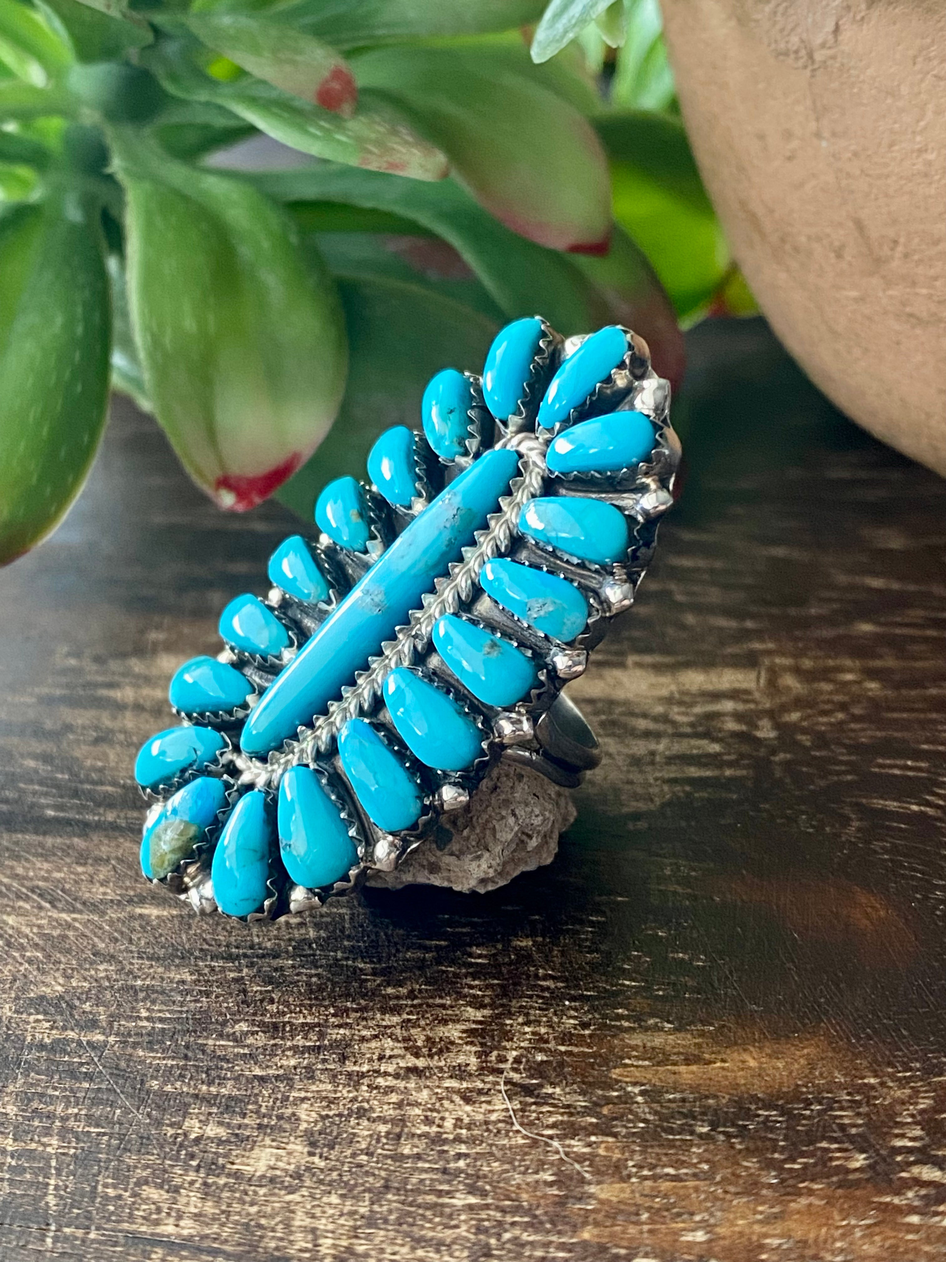 Navajo Made Kingman Turquoise & Sterling Silver Cluster Ring Size 8.5