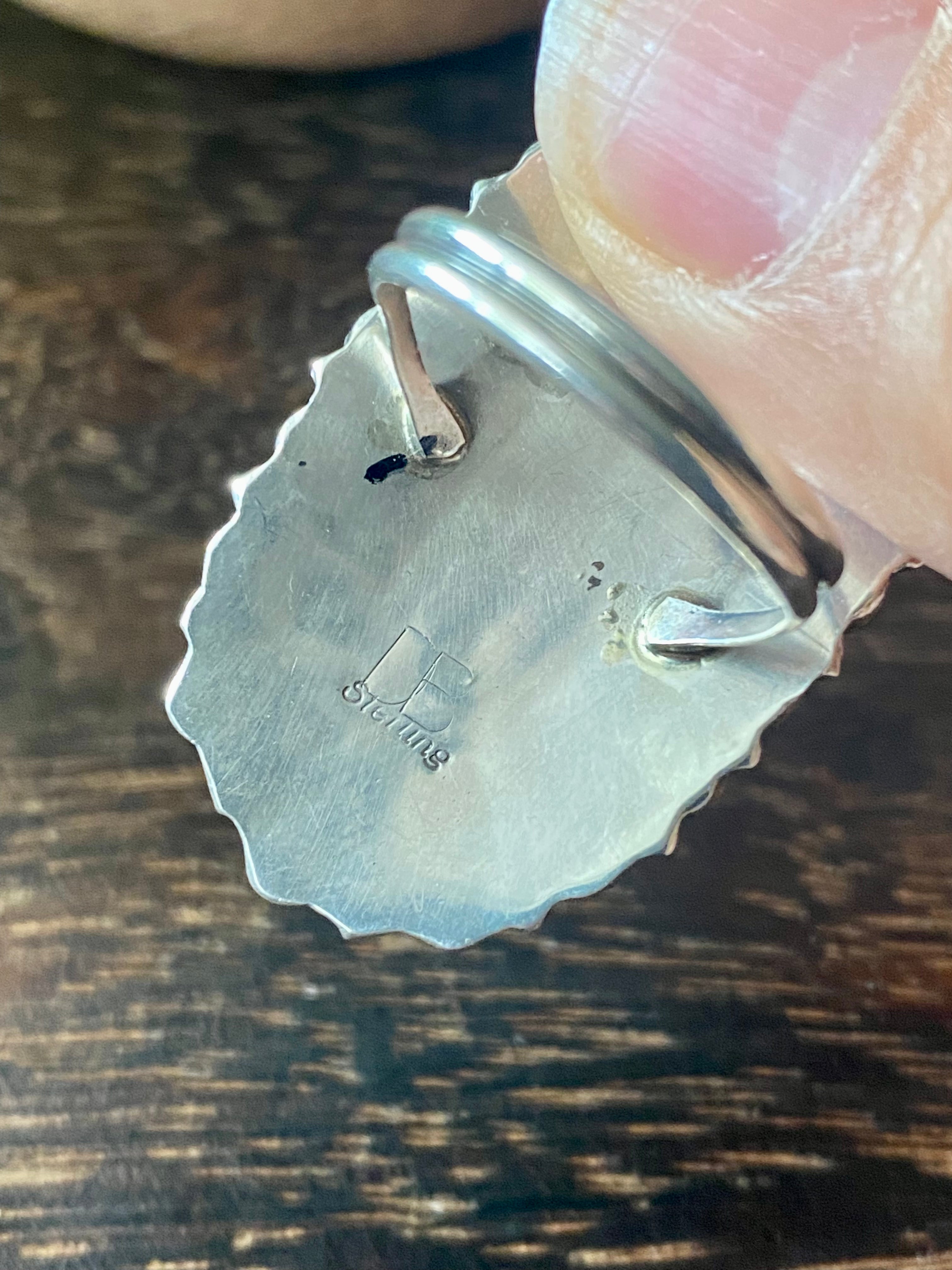 Navajo Made Kingman Turquoise & Sterling Silver Cluster Ring Size 9.25. It measures 1 3/4 inches long and 1 inch wide. Stones will differ due to natural stones. Signed by the artist and stamped sterling silver.