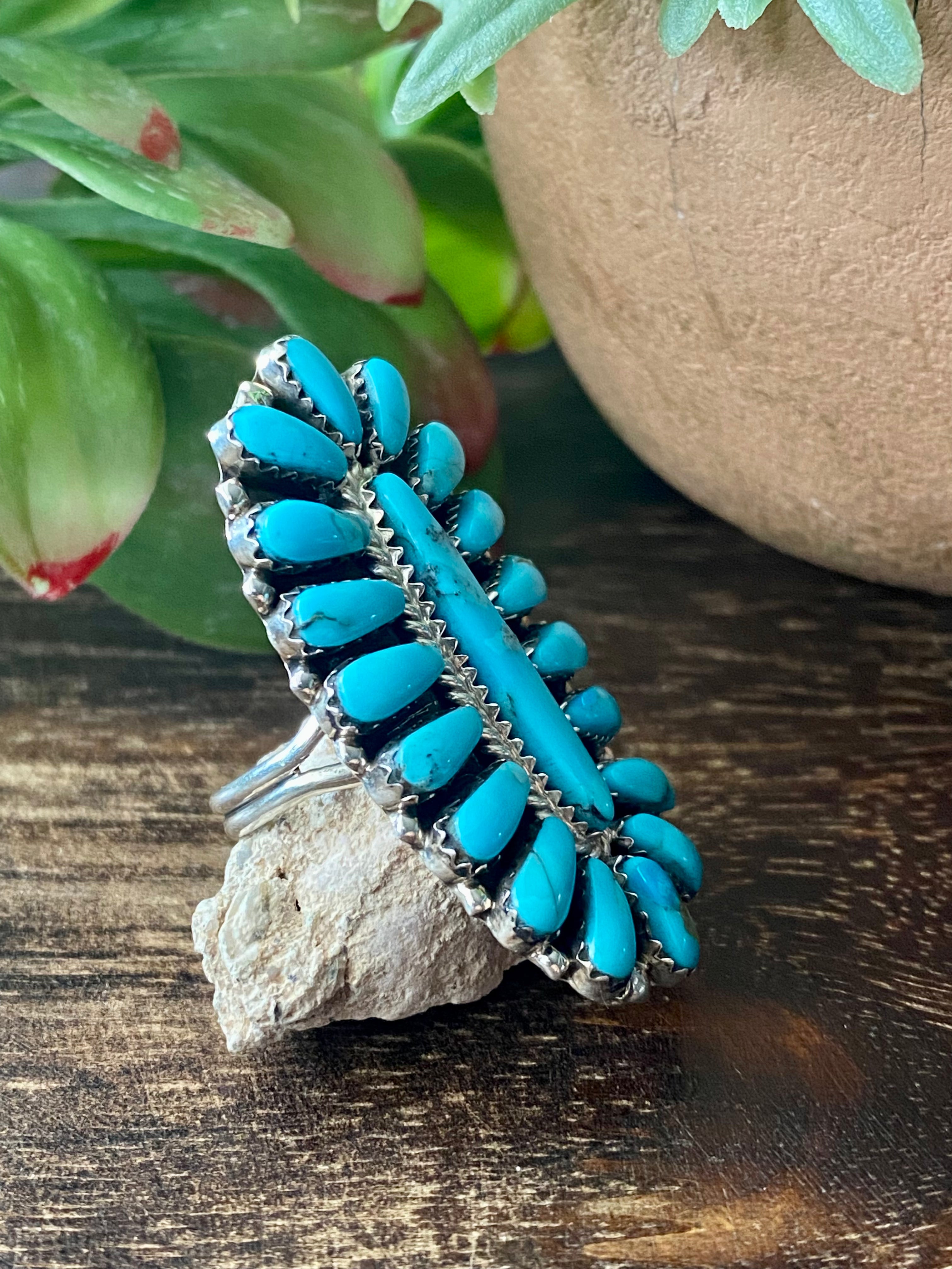 Navajo Made Kingman Turquoise & Sterling Silver Cluster Ring Size 9.25