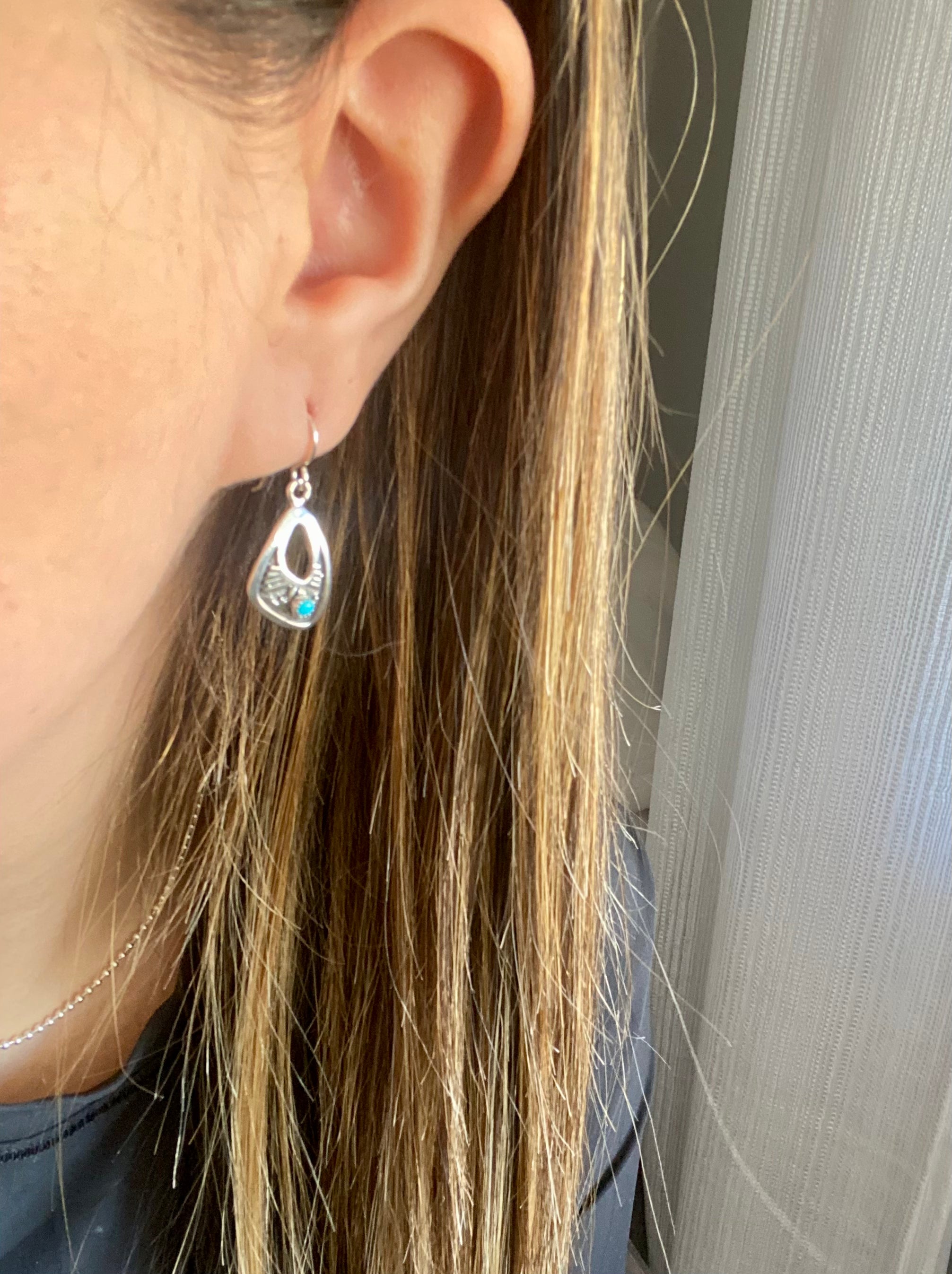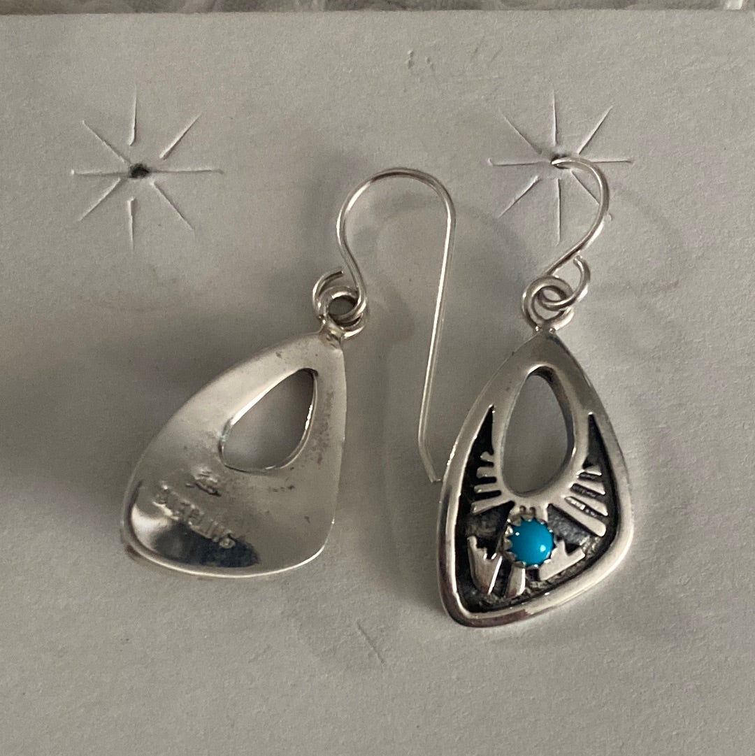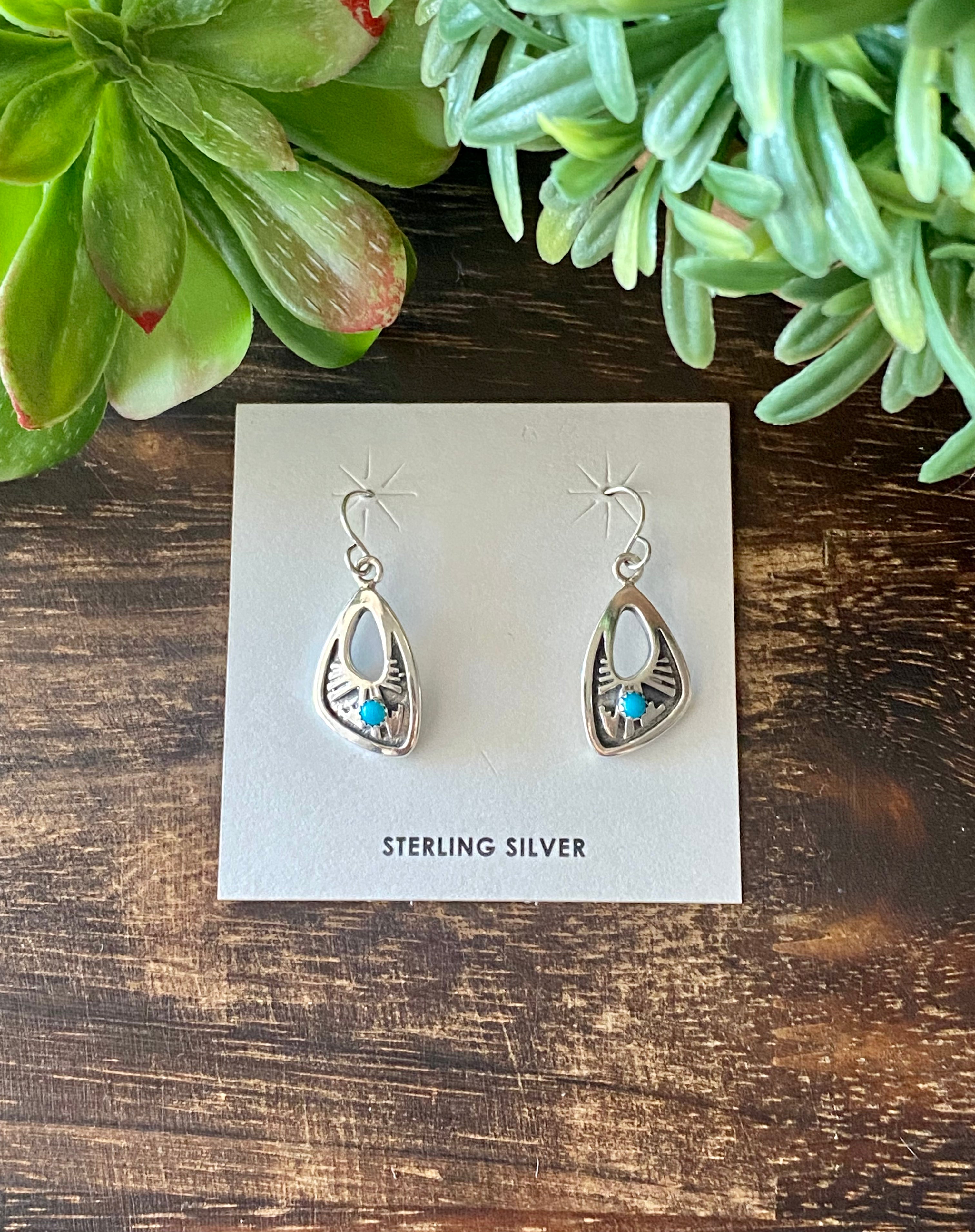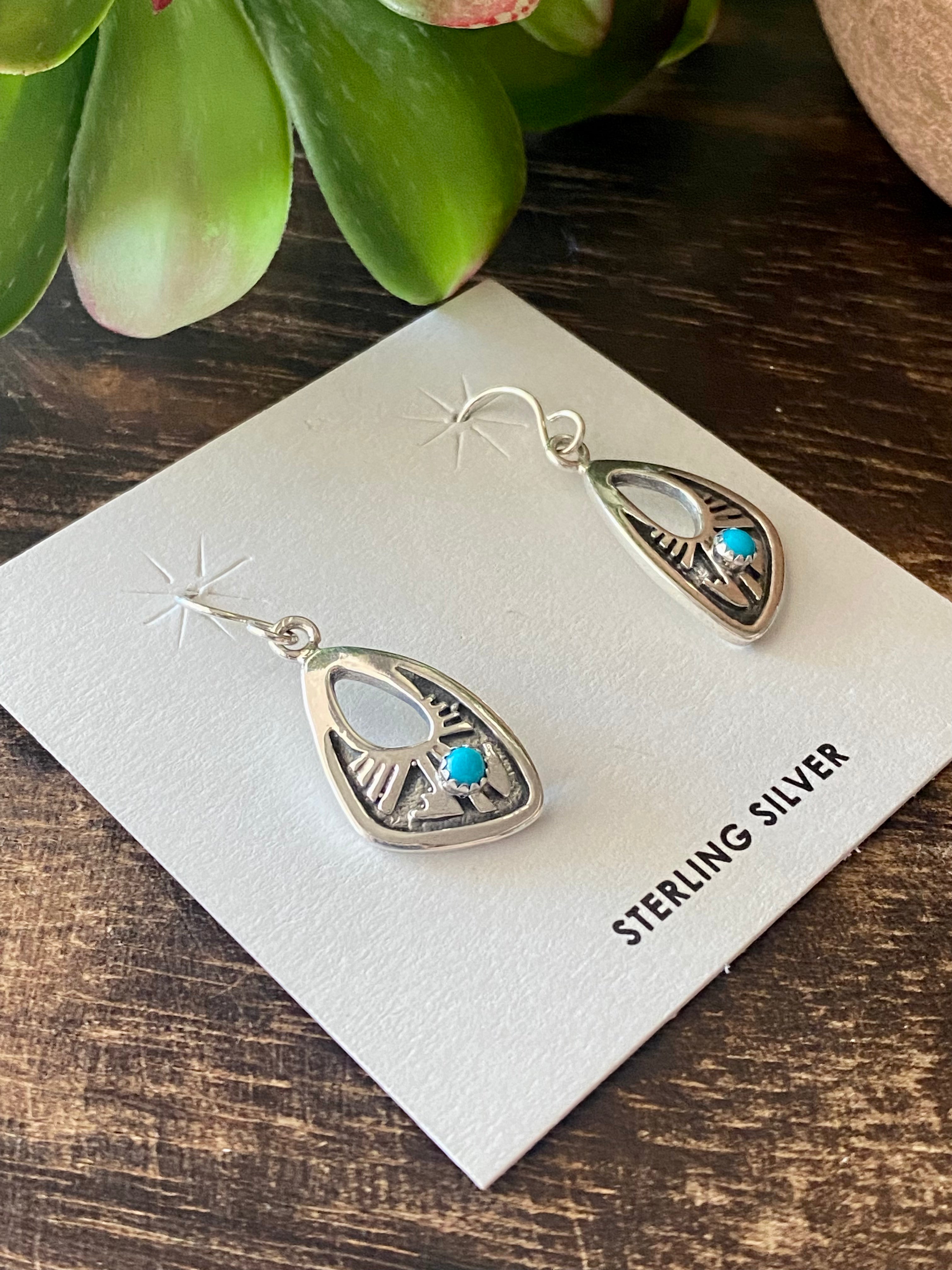 Navajo Made Kingman Turquoise & Sterling Silver Dangle Earrings. They measure just under 1 inch long and 1/2 of an inch wide. Signed by the artist and stamped sterling silver.