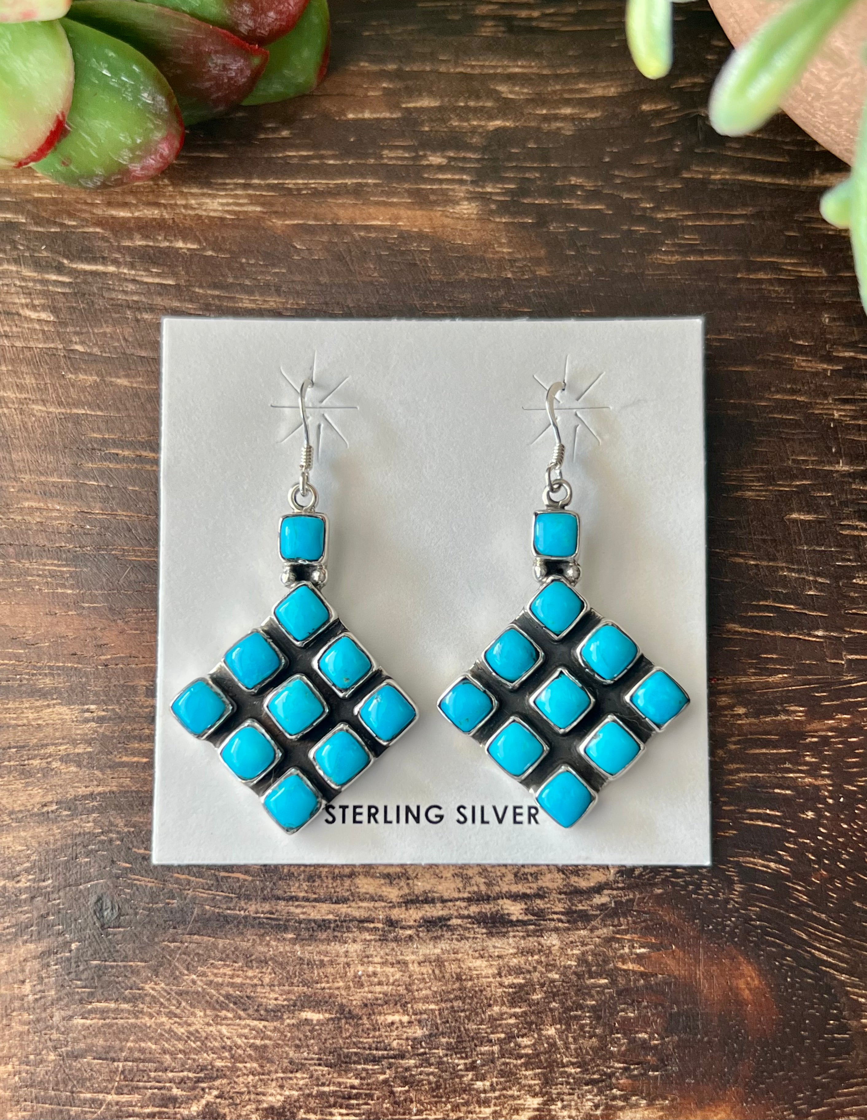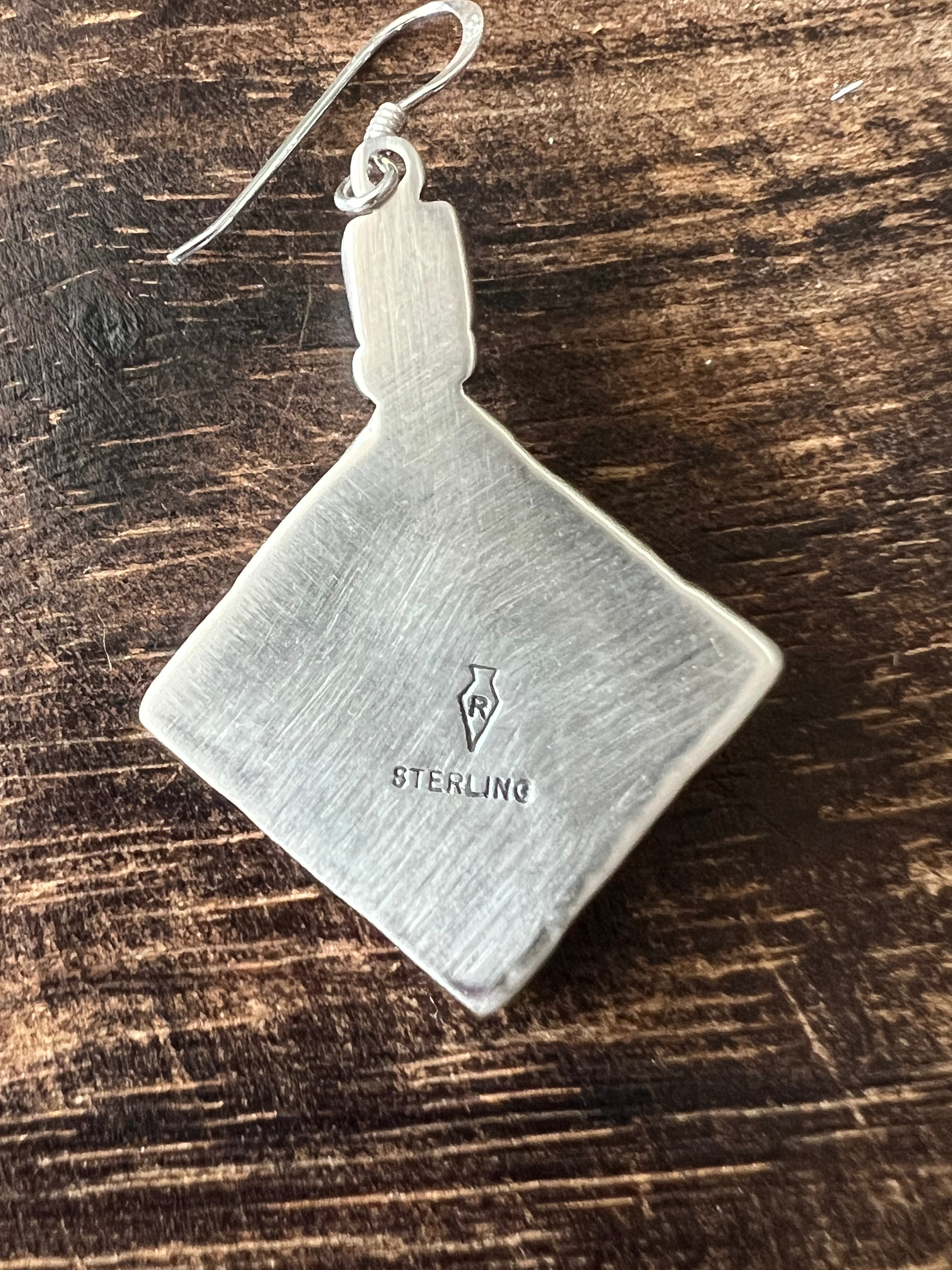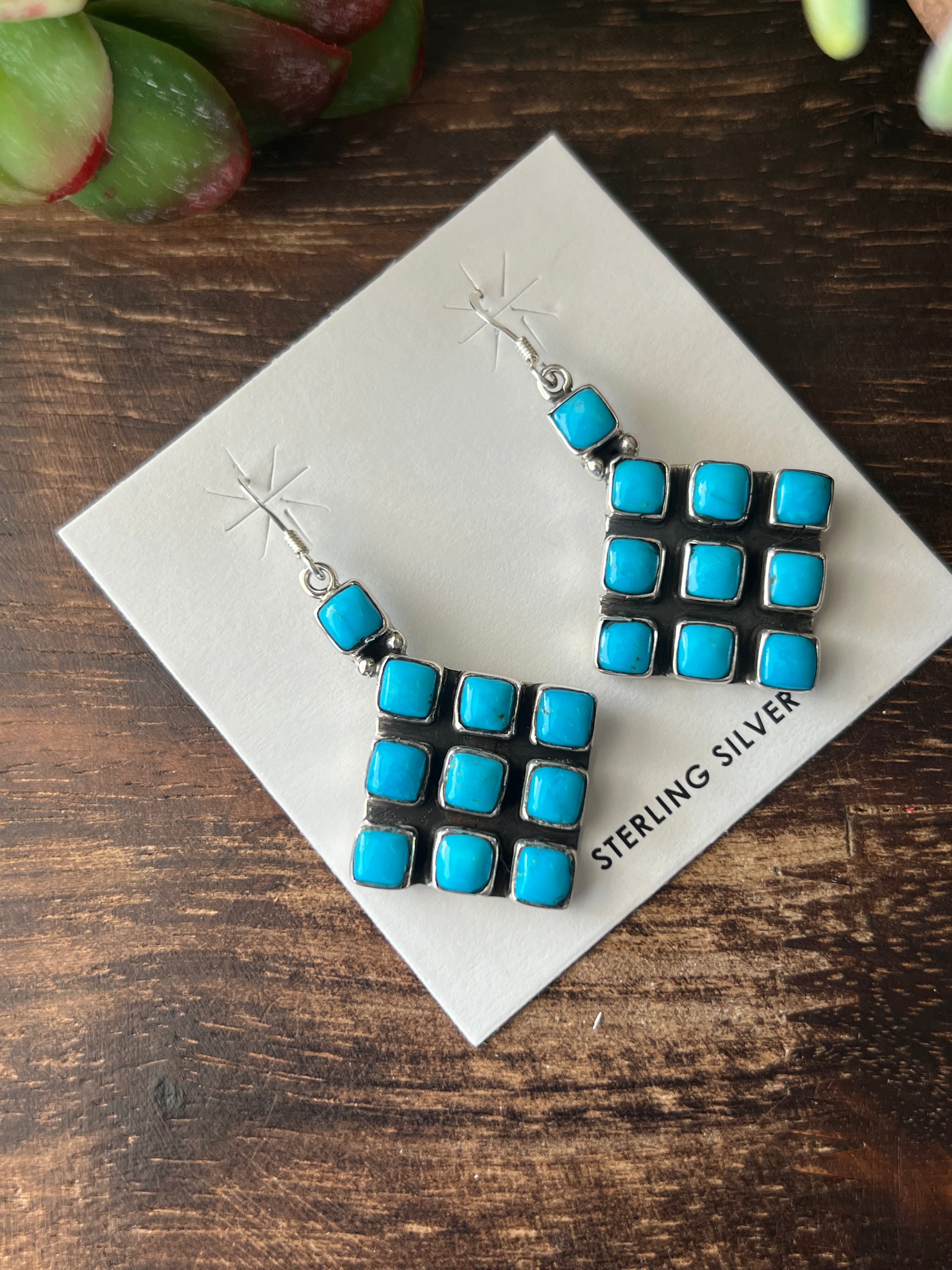 Navajo Made Kingman Turquoise & Sterling Silver Dangle Earrings. They measure 2 inches long and just over 1 inch wide. Signed by the artist and stamped sterling silver.
