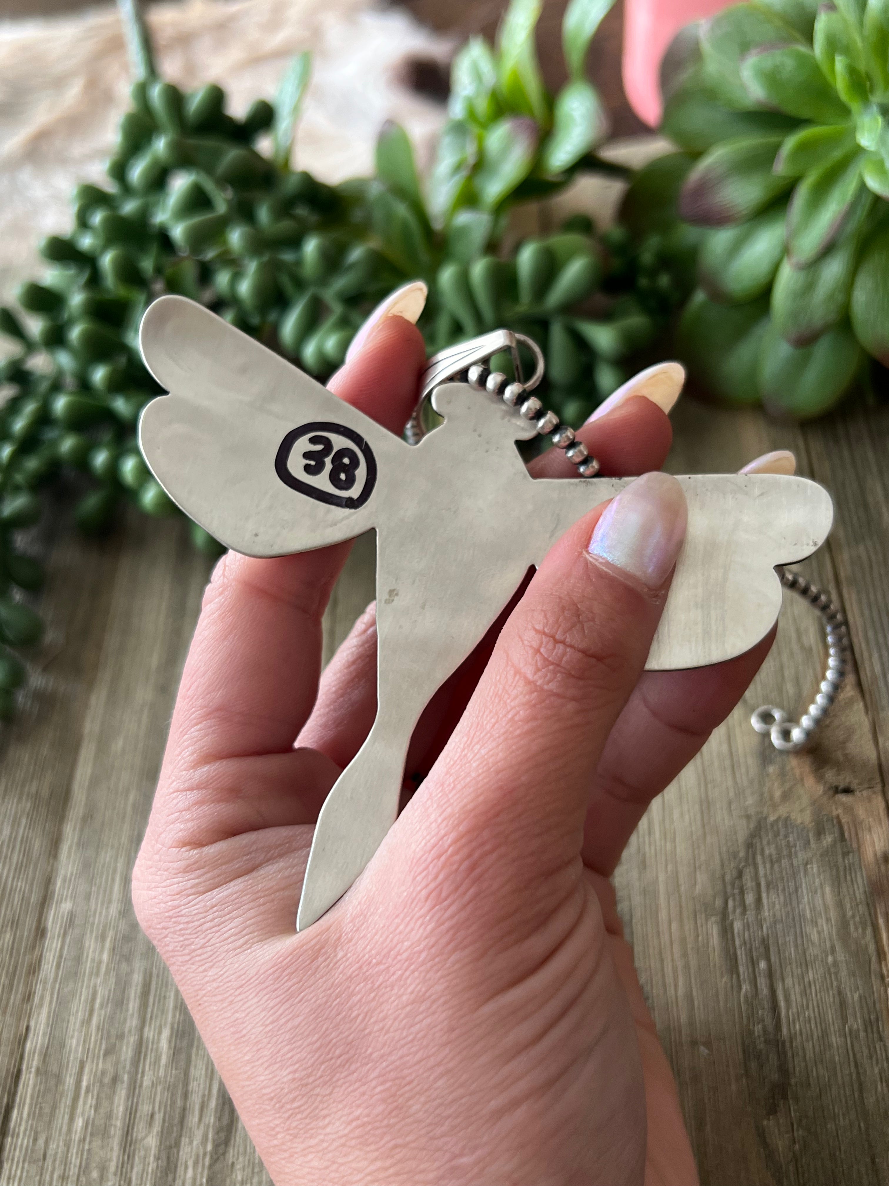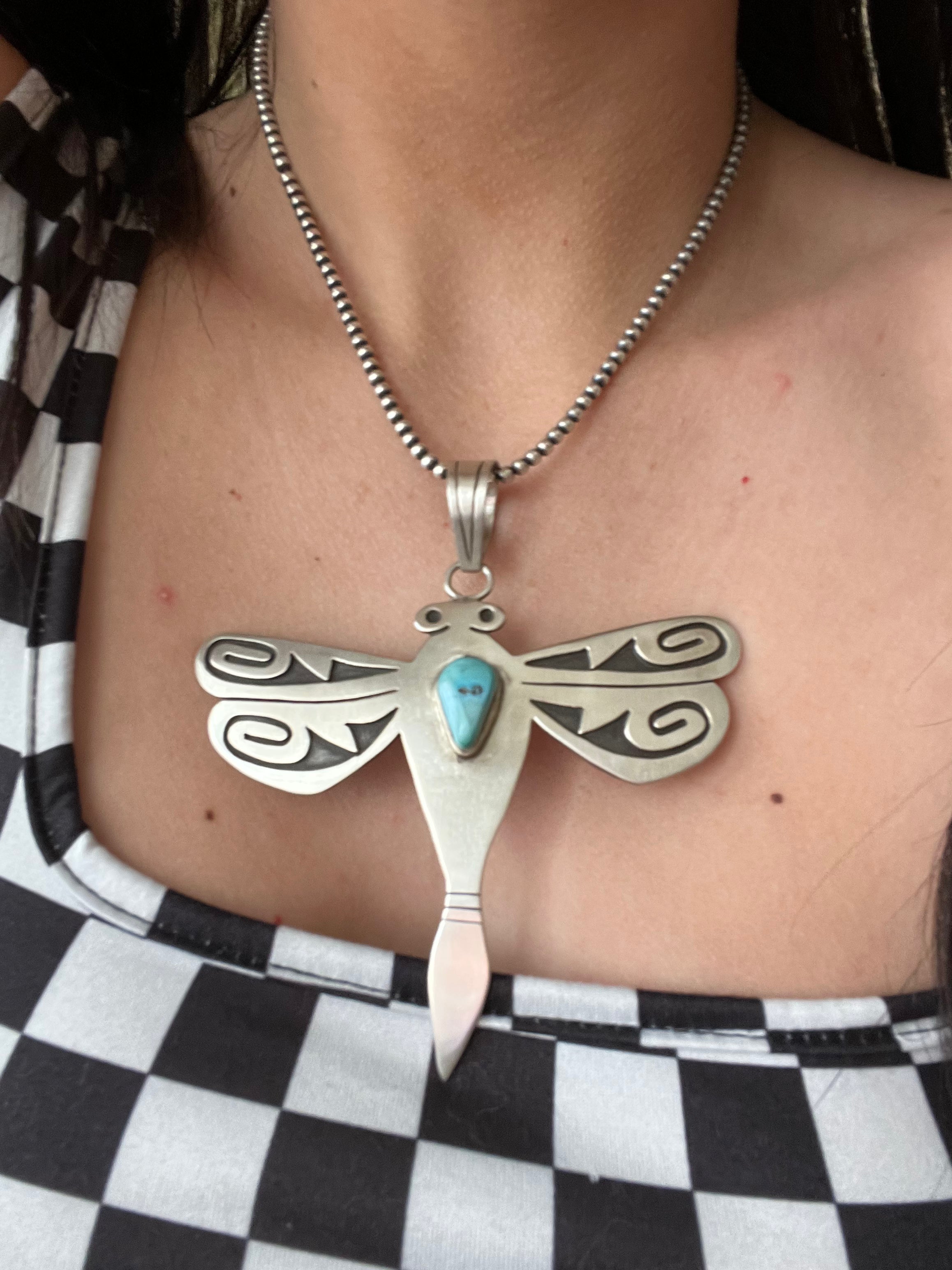 Navajo Made Kingman Turquoise & Sterling Silver Dragonfly Pendant. It measures 4 inches long and 3 3/4 inches wide. Pendant Only!! Signed by the artist and stamped sterling silver.