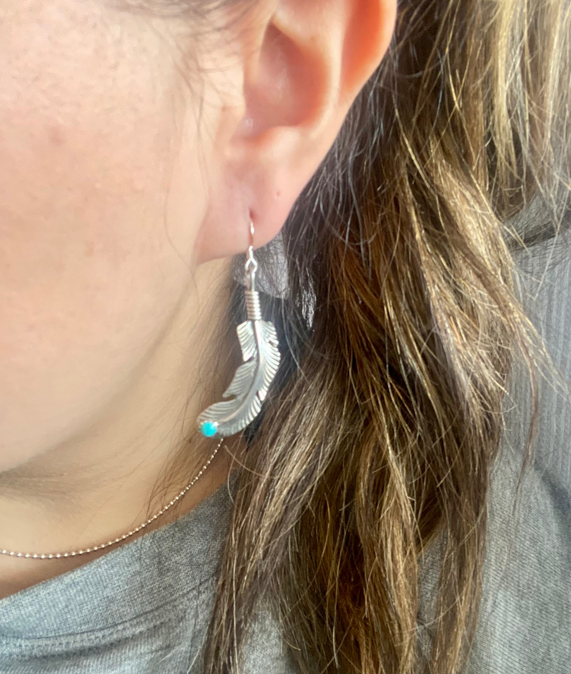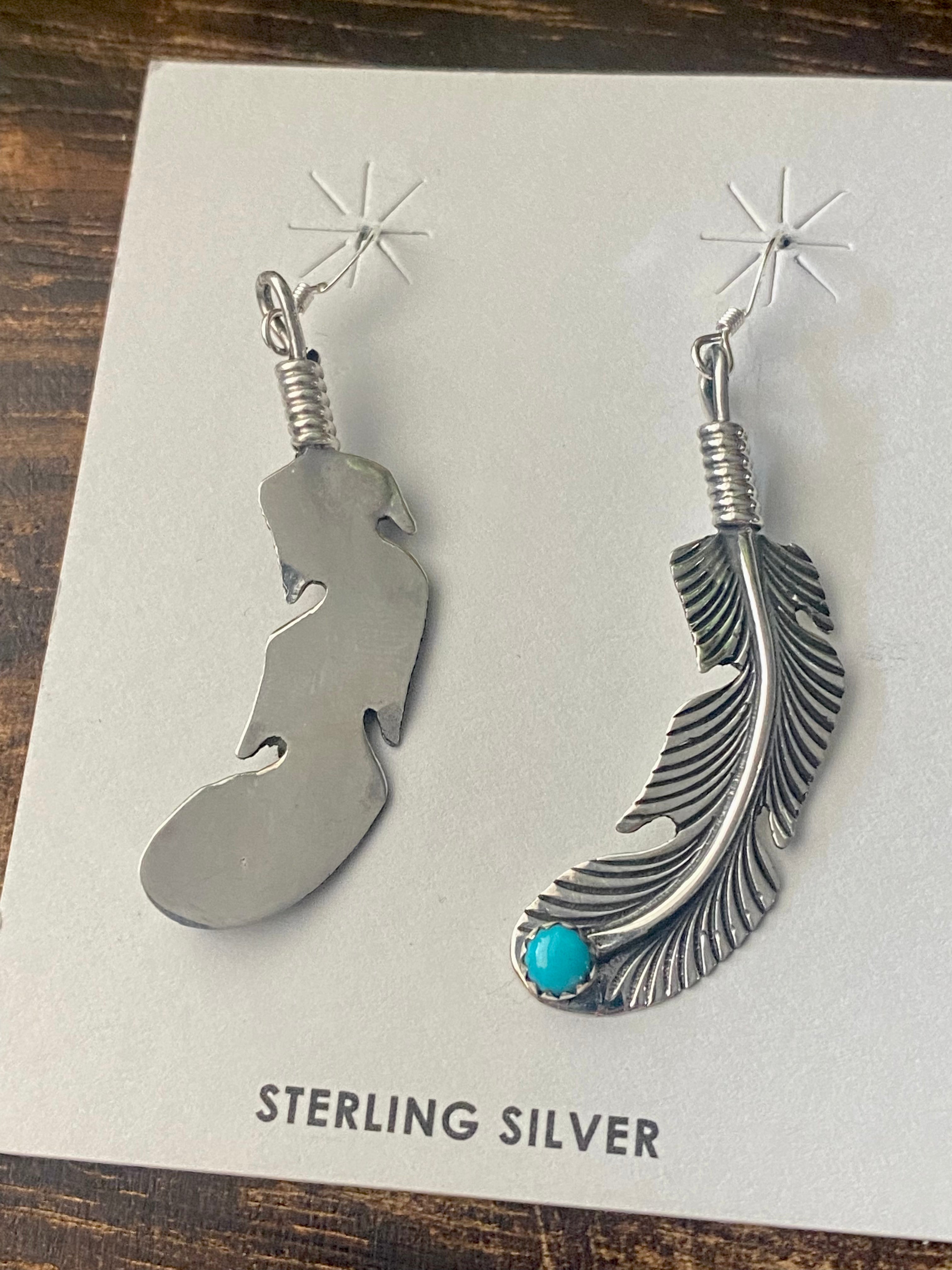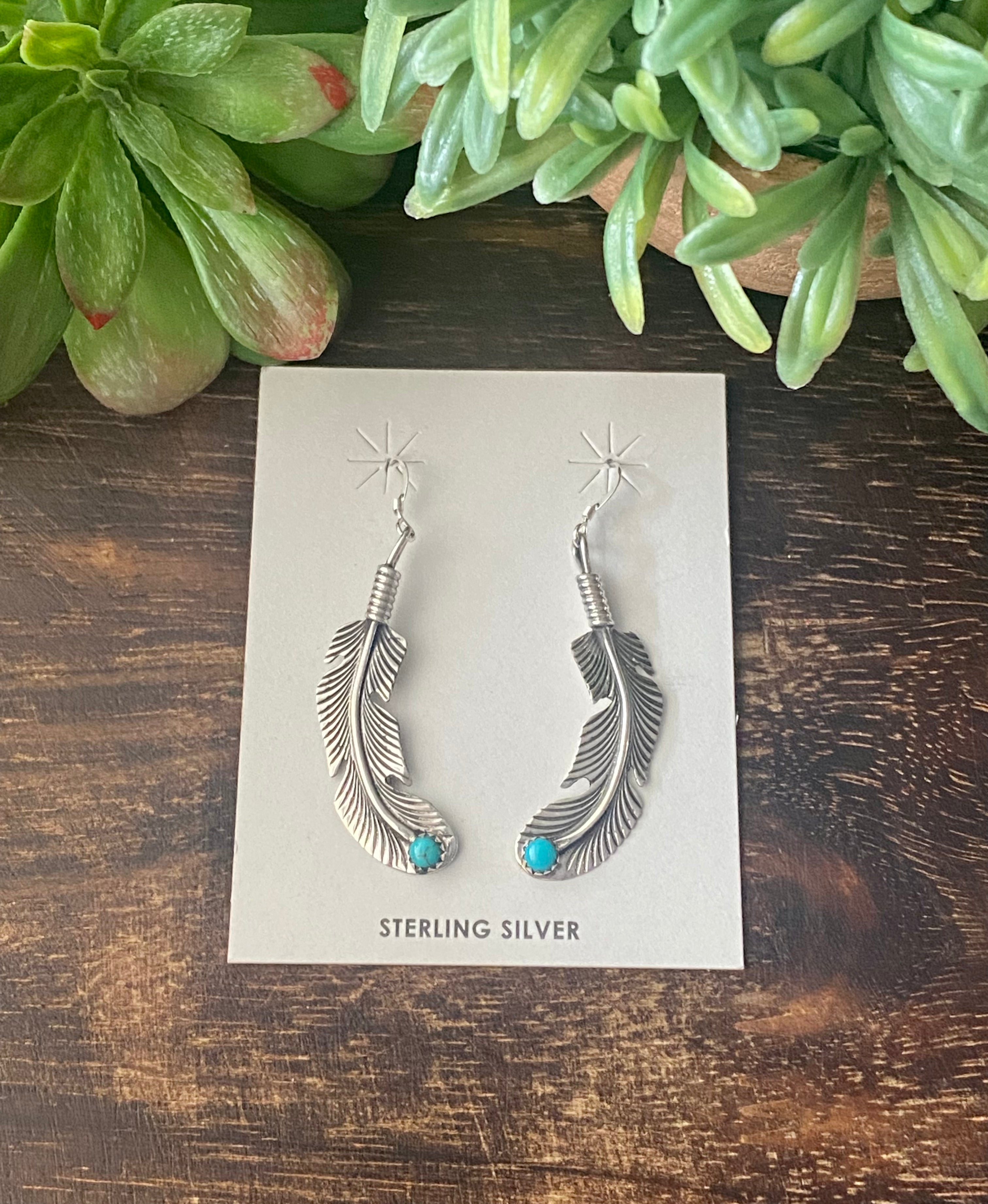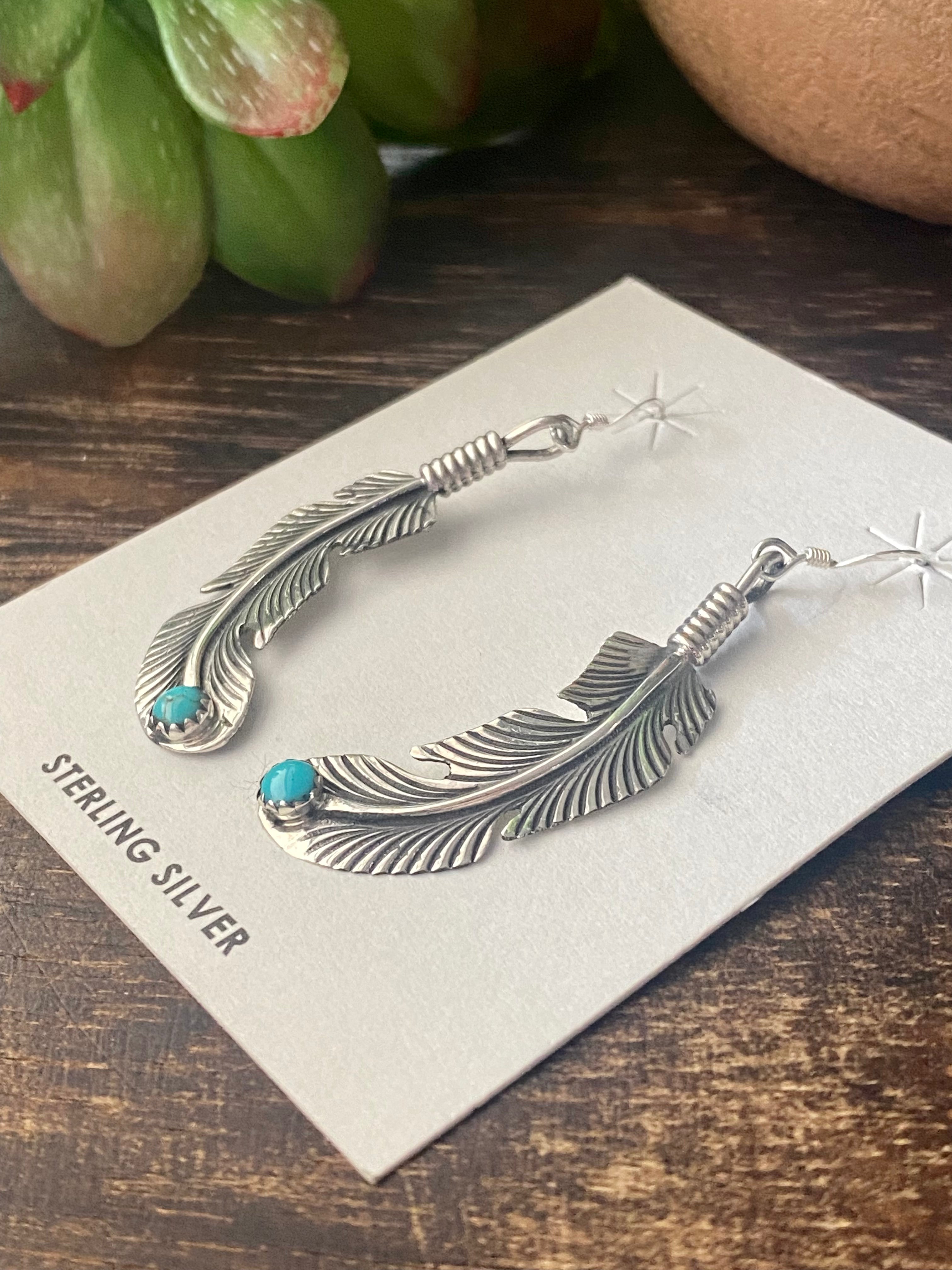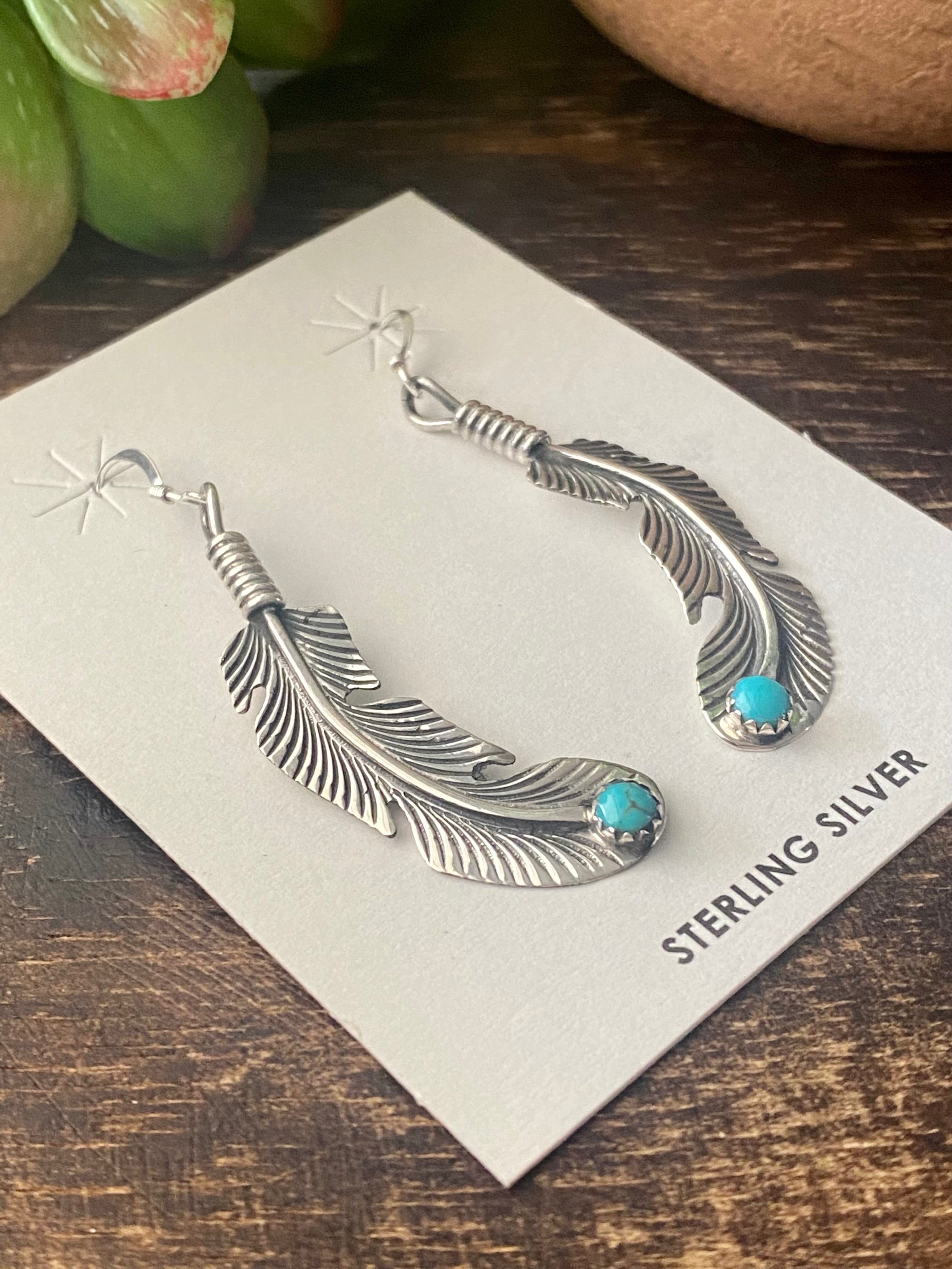 Navajo Made Kingman Turquoise & Sterling Silver Feather Dangle Earrings