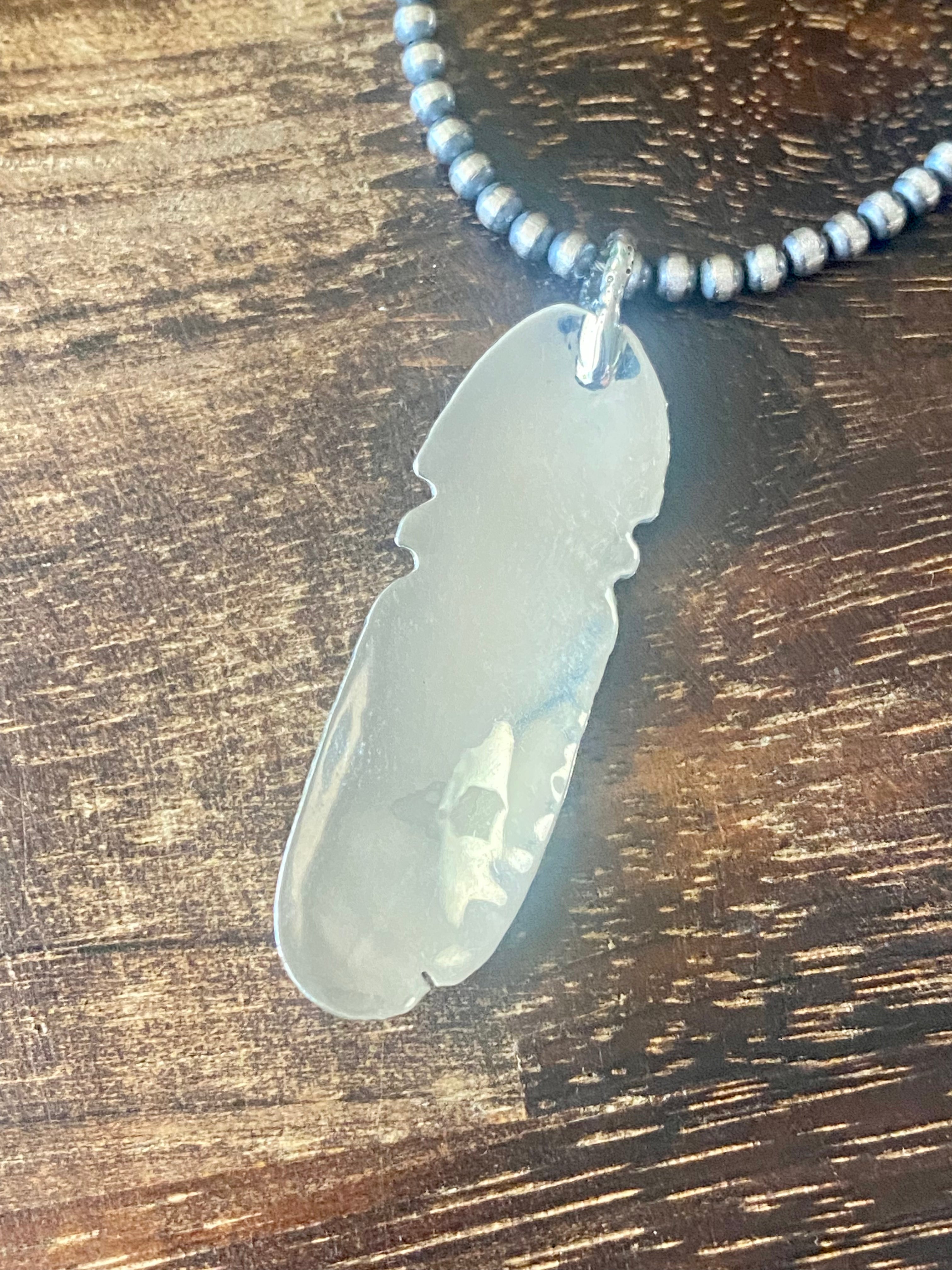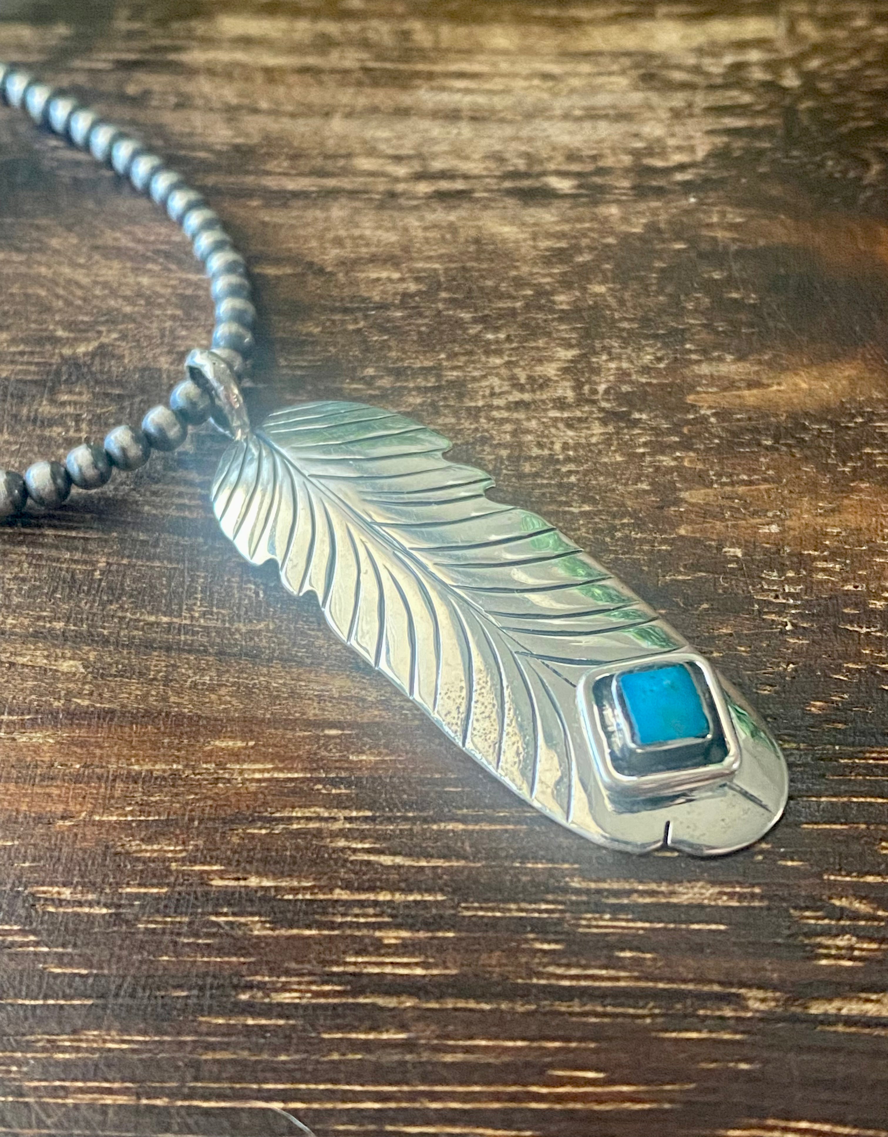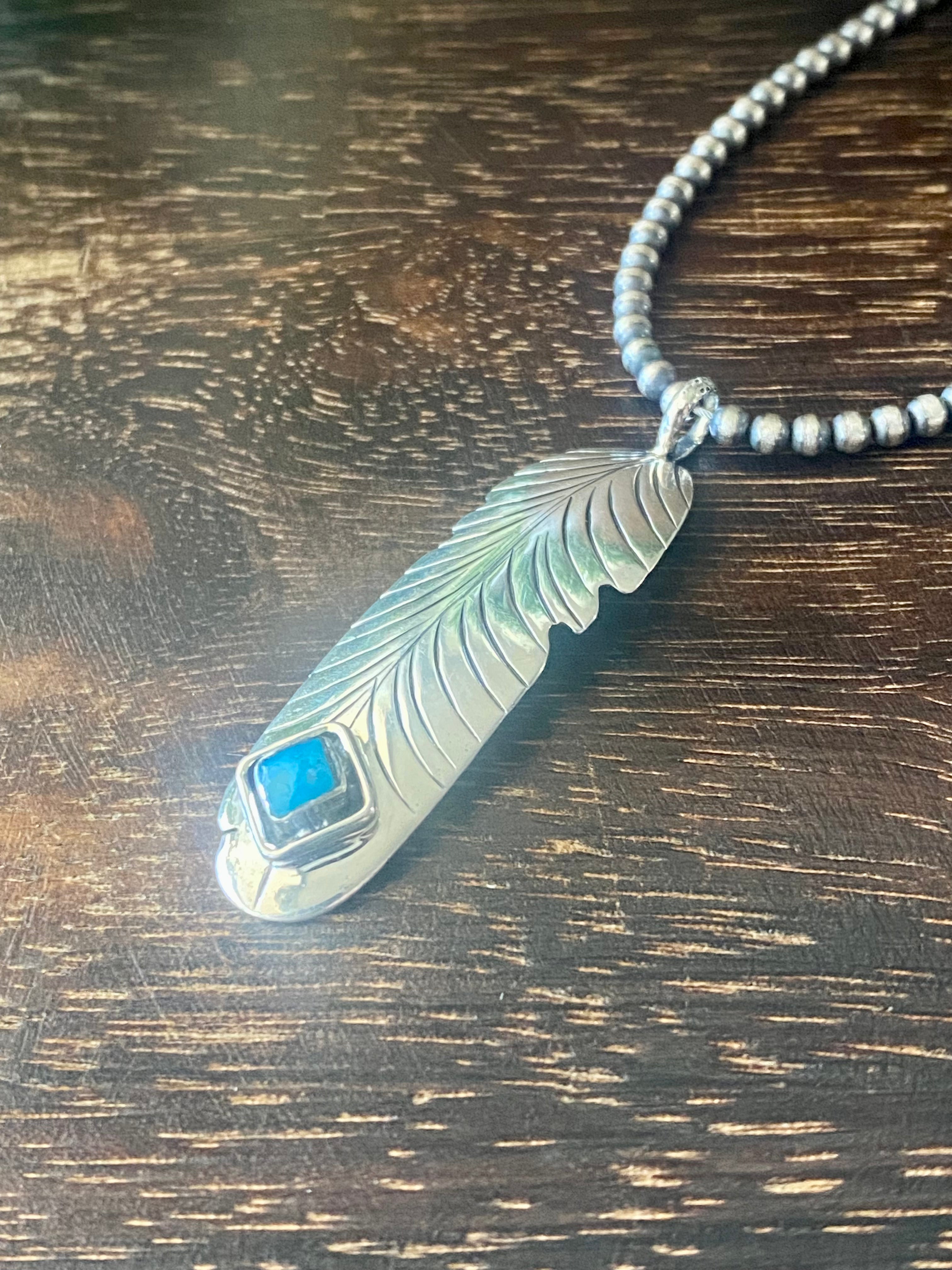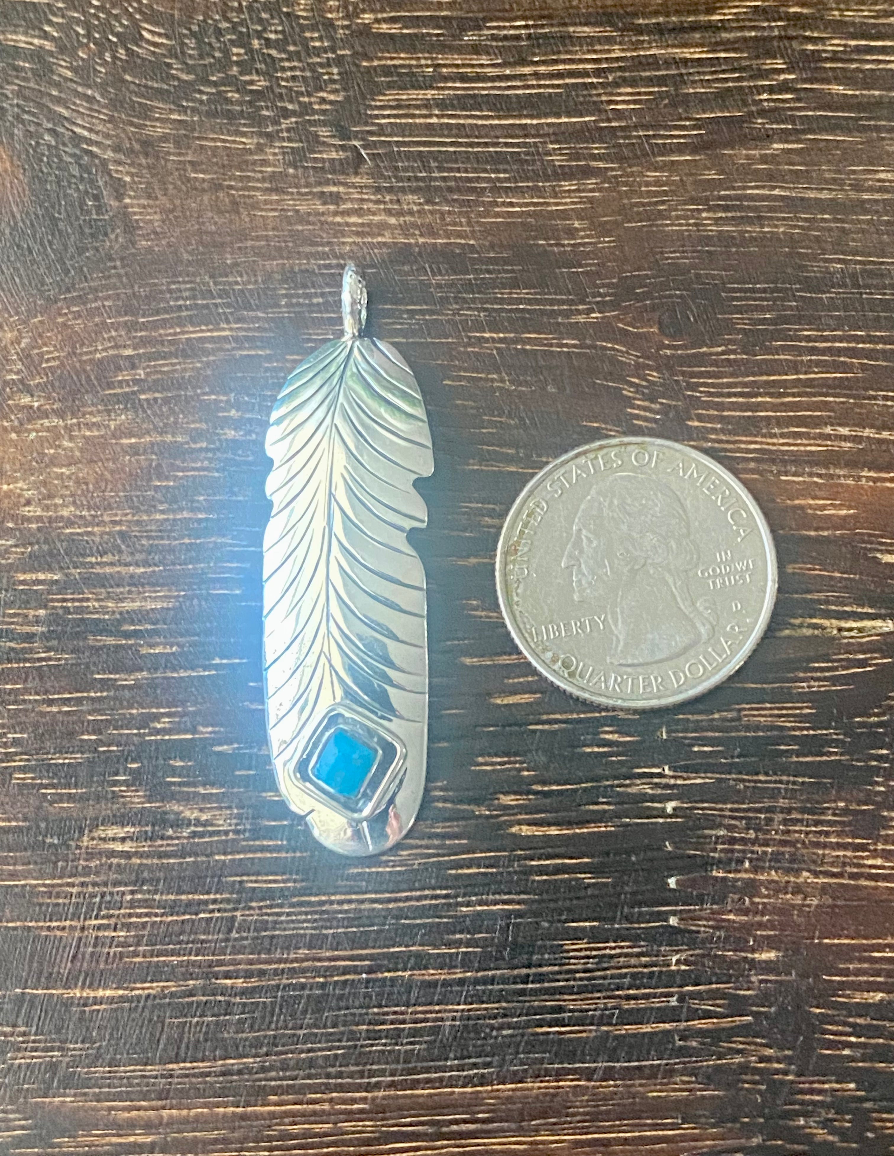 Navajo Made Kingman Turquoise & Sterling Silver Feather Pendant