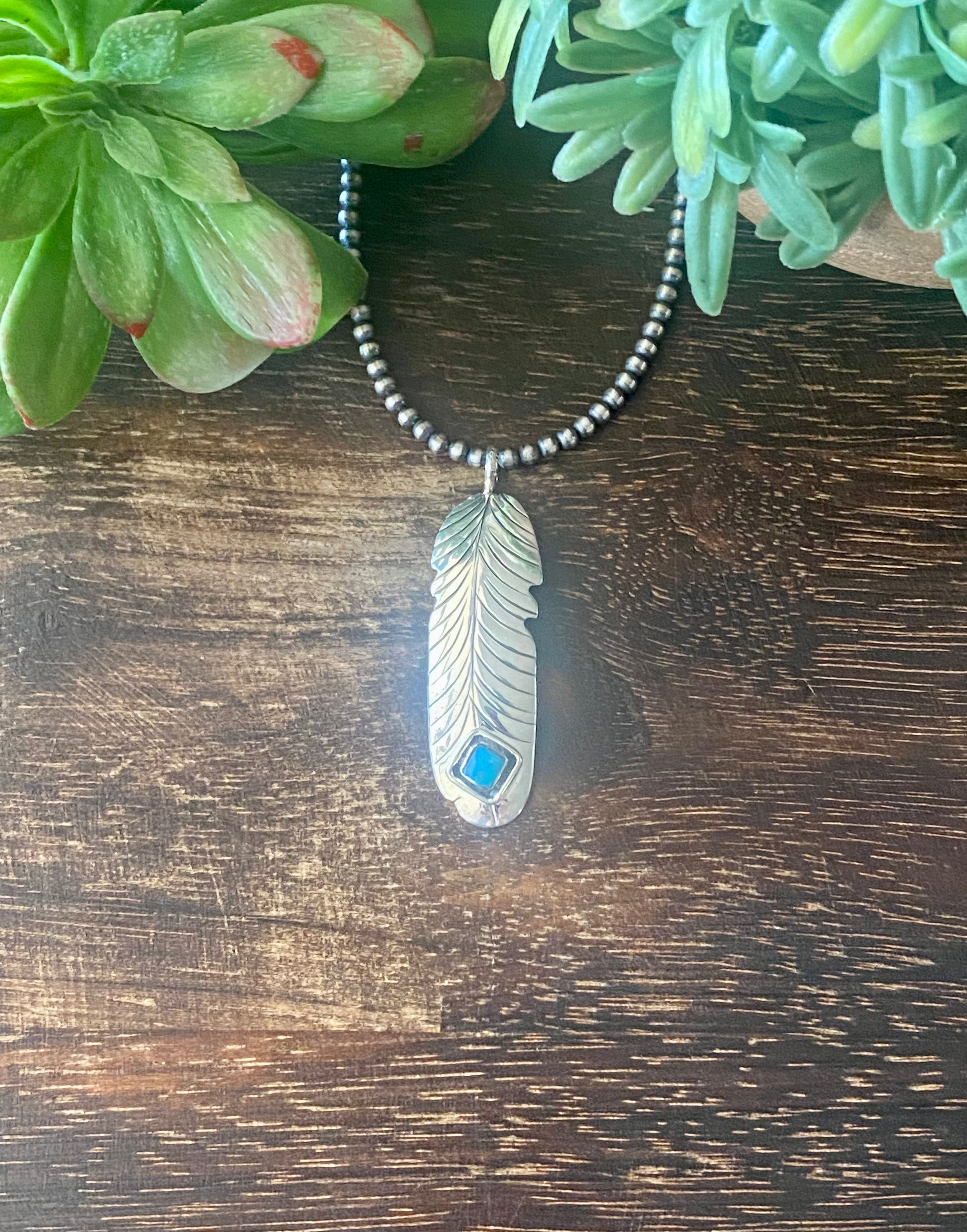 Navajo Made Kingman Turquoise & Sterling Silver Feather Pendant. They measure just over 2 inches long and 5/8 of an inch wide. Pendant Only!! Stones will differ due to natural stones.