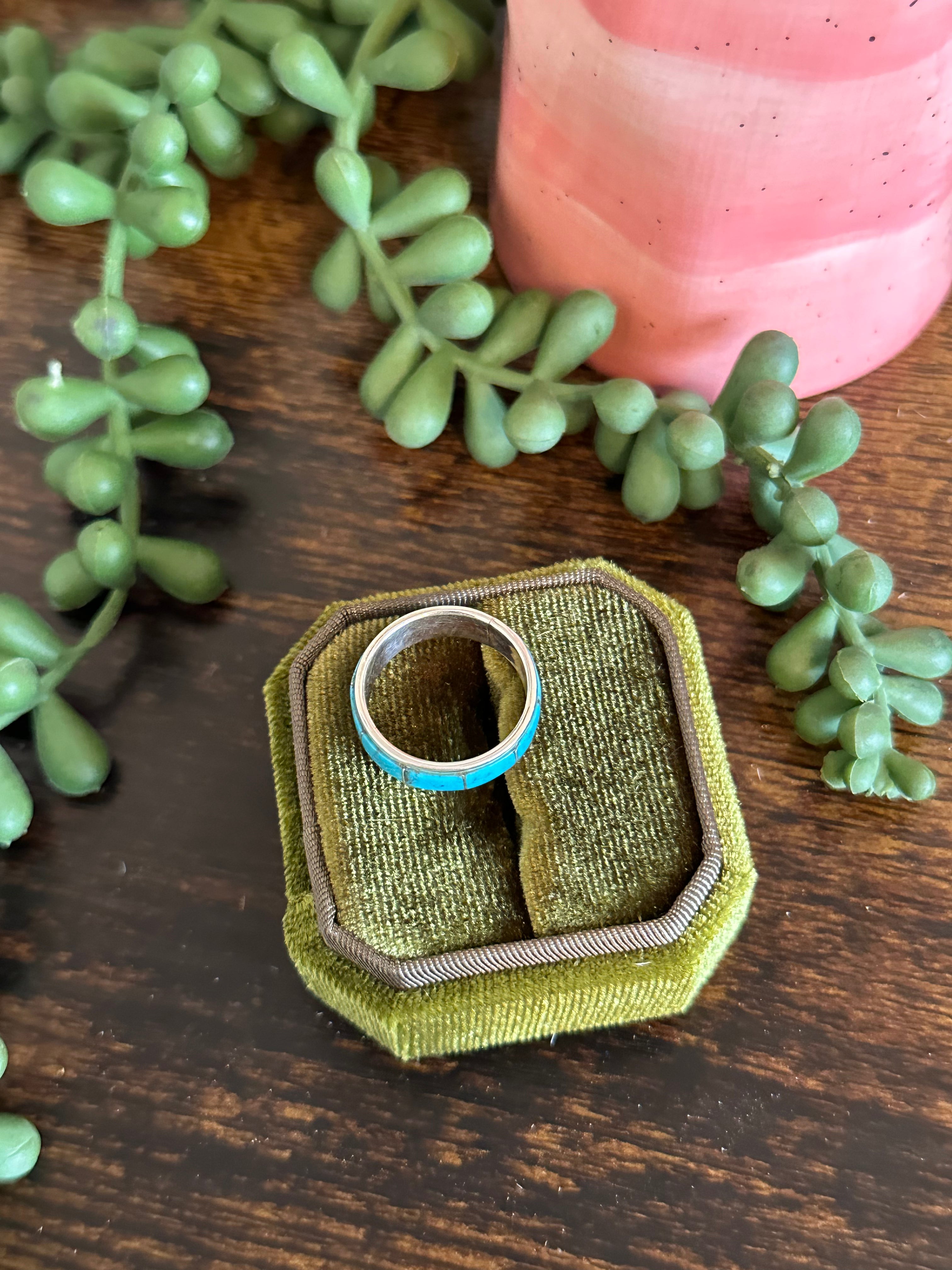 Beautiful ring. Navajo Made Kingman Turquoise & Sterling Silver Inlay Ring. It measures 1/4 of an inch long. Signed and stamped. Stones will differ due to natural stones.