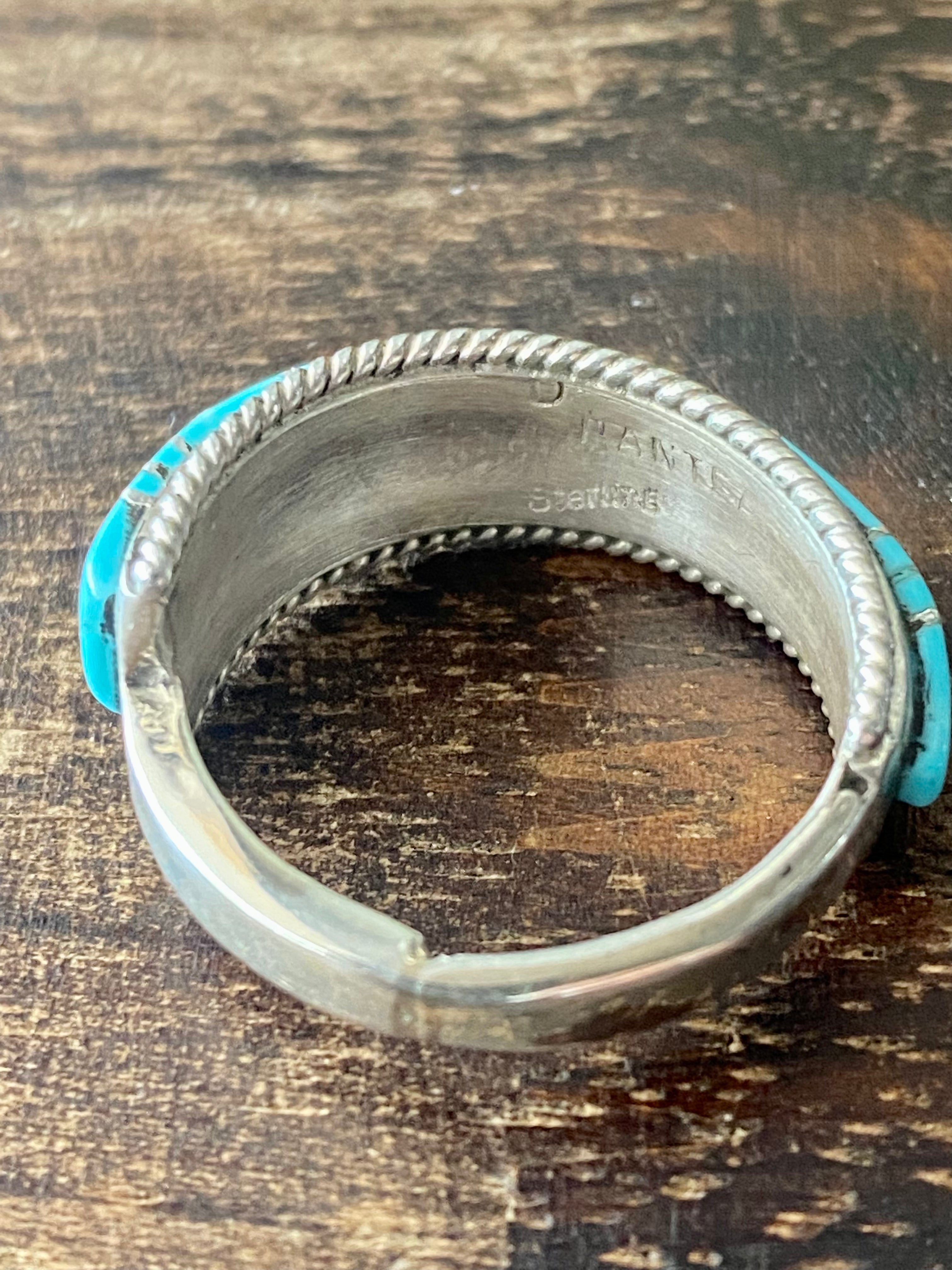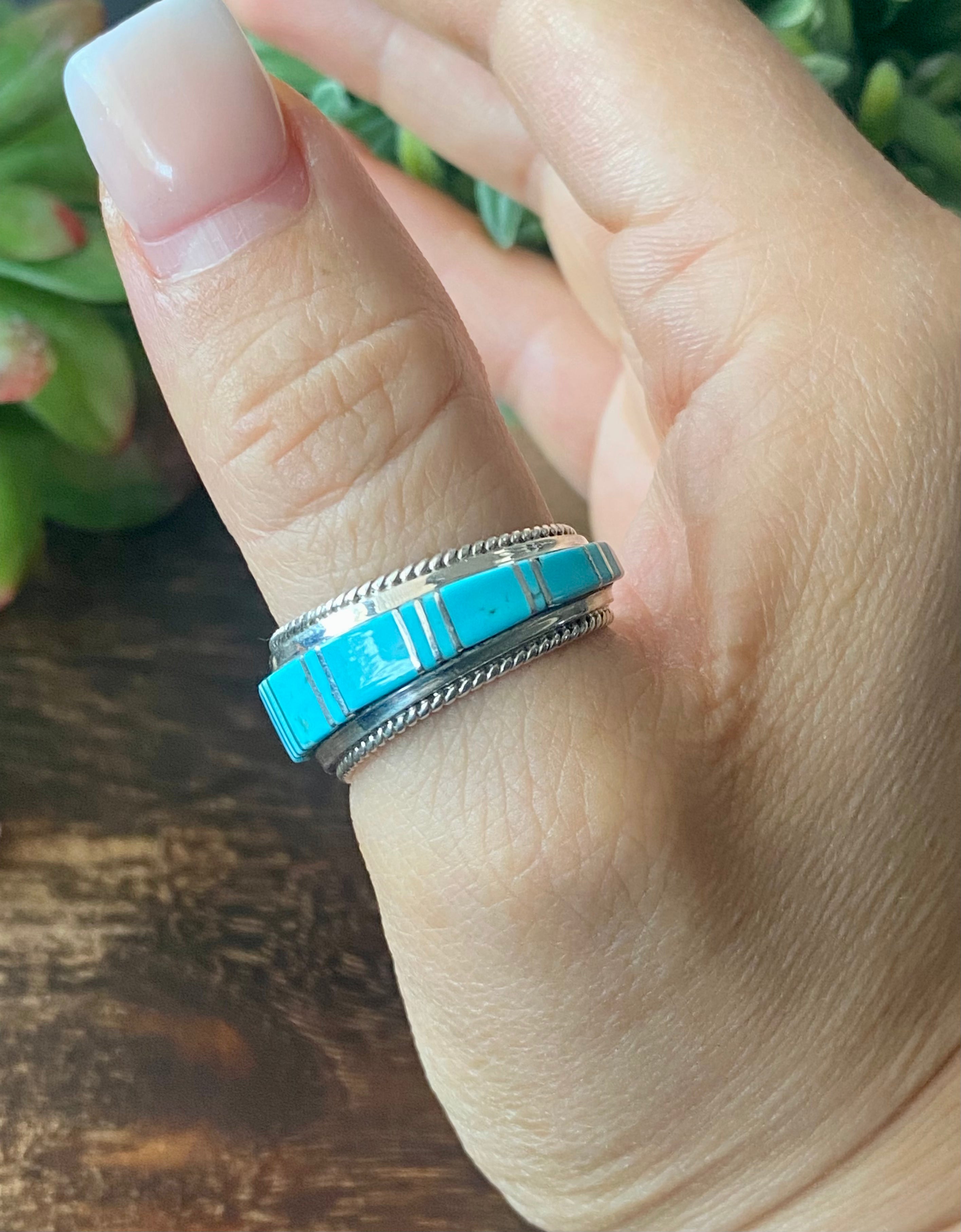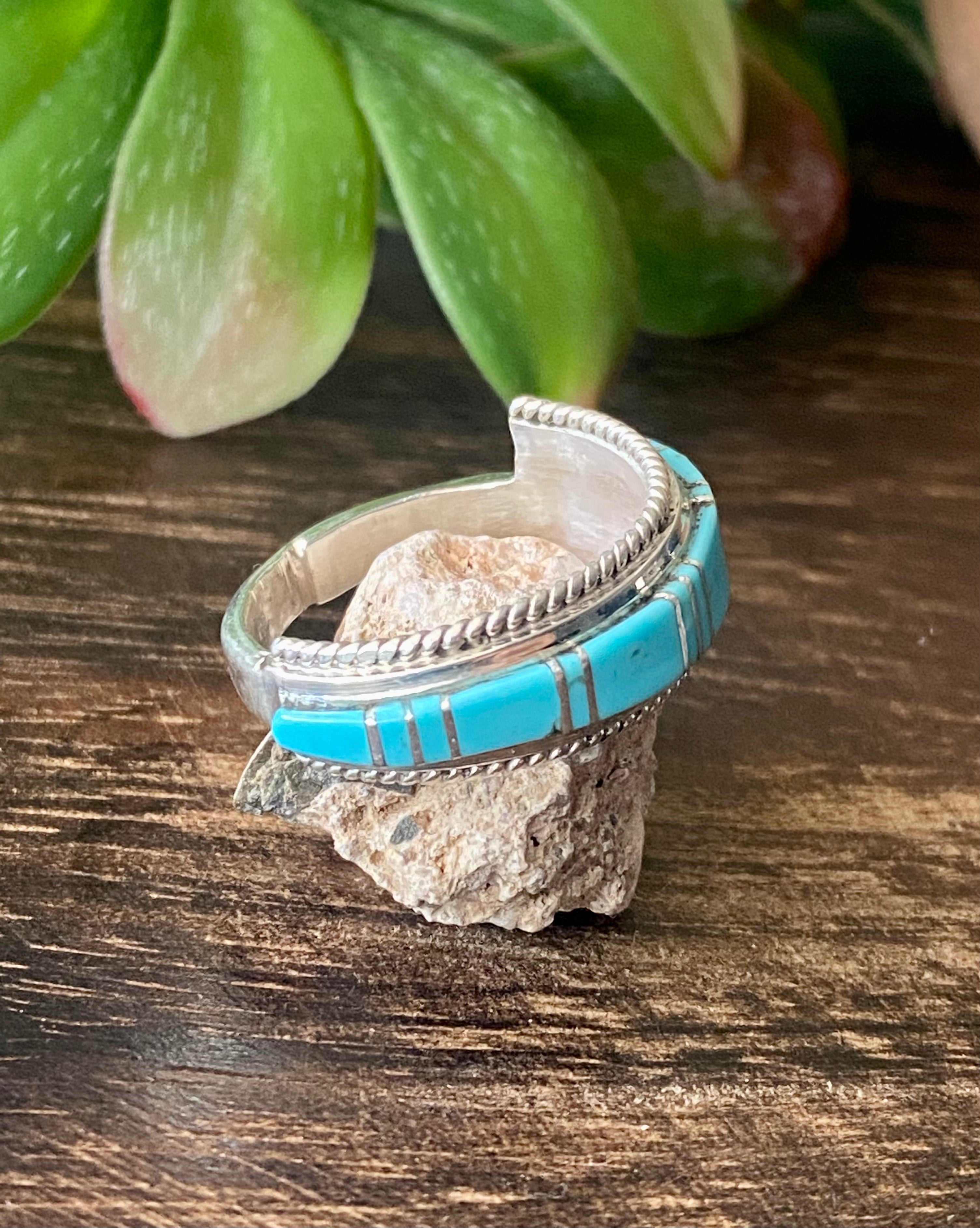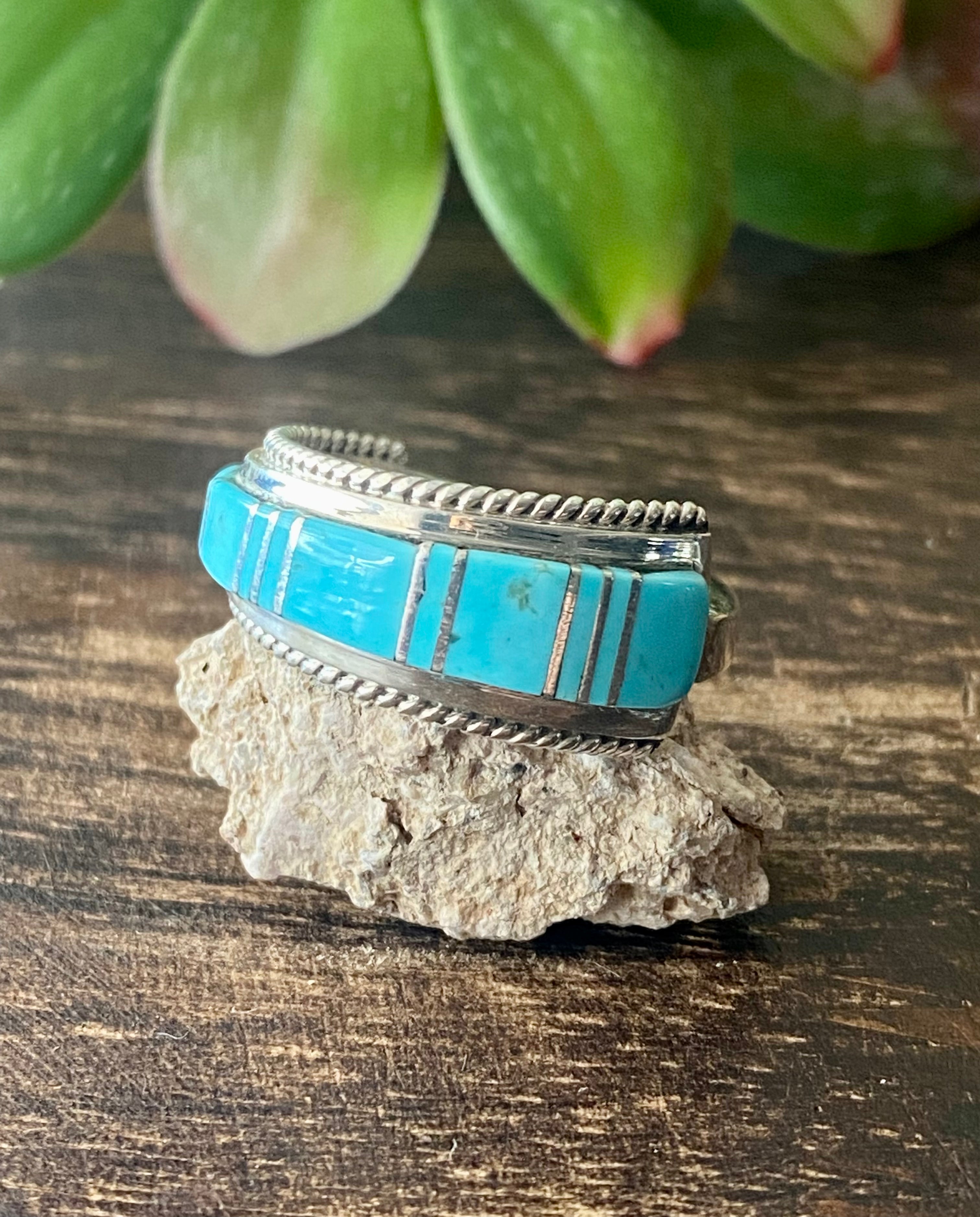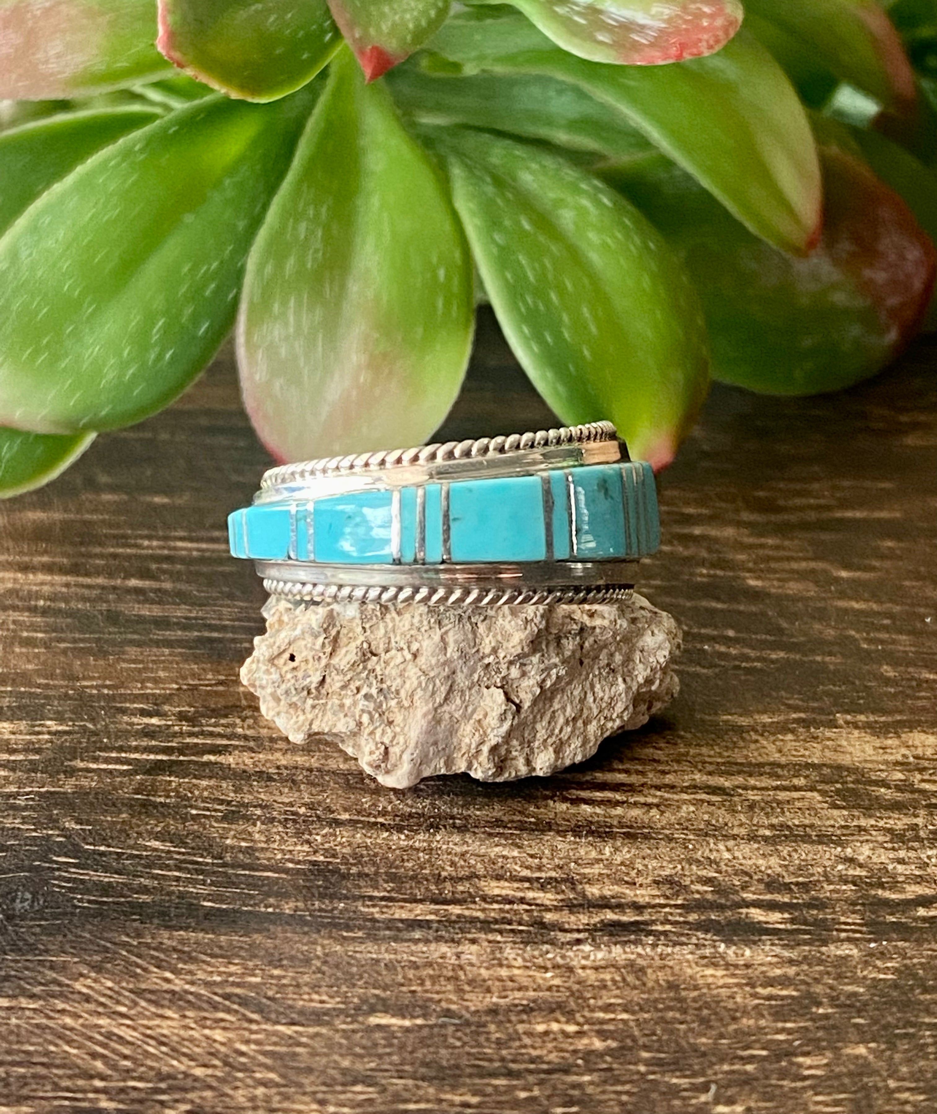 Navajo Made Kingman Turquoise & Sterling Silver Inlay Ring Size 11. It measures 1/2 of an inch long and 7/8 of an inch wide. Signed by the artist and stamped sterling silver.