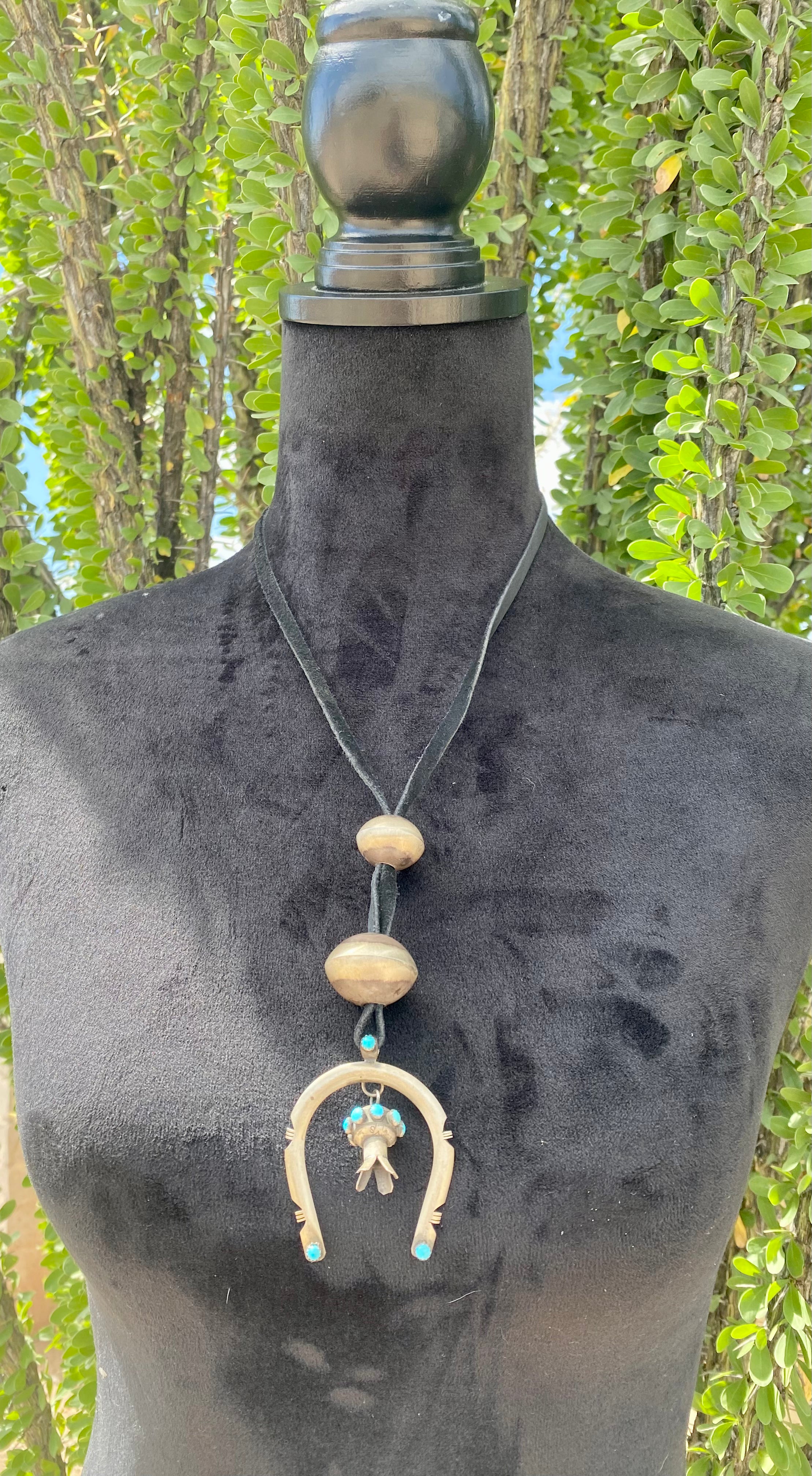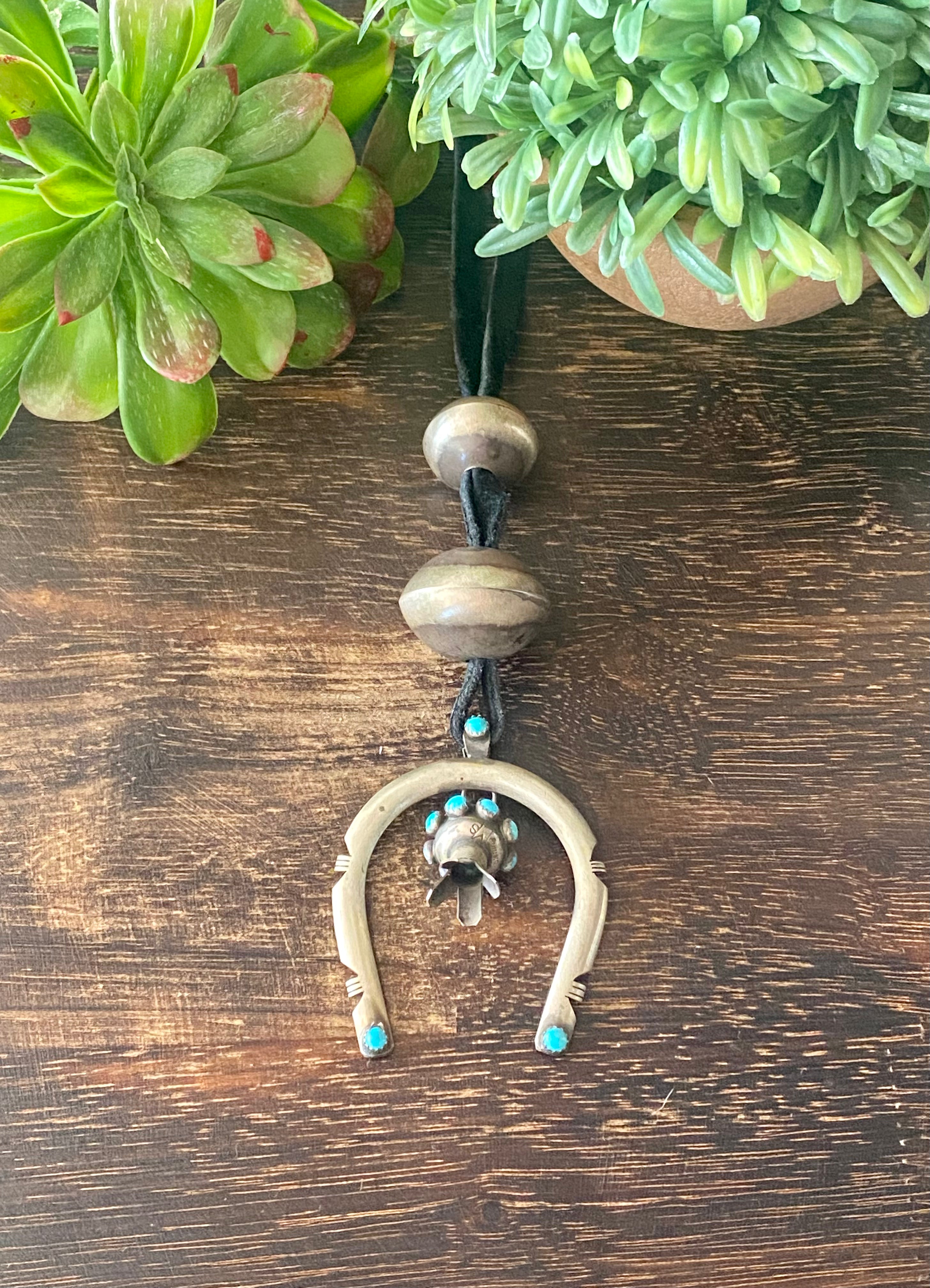 Navajo Made Kingman Turquoise & Sterling Silver Leather Naja Necklace. It measures 43 inches long with hang while the necklace by itself measures 38 inches long but can adjust down. Signed by the artist and stamped sterling silver.