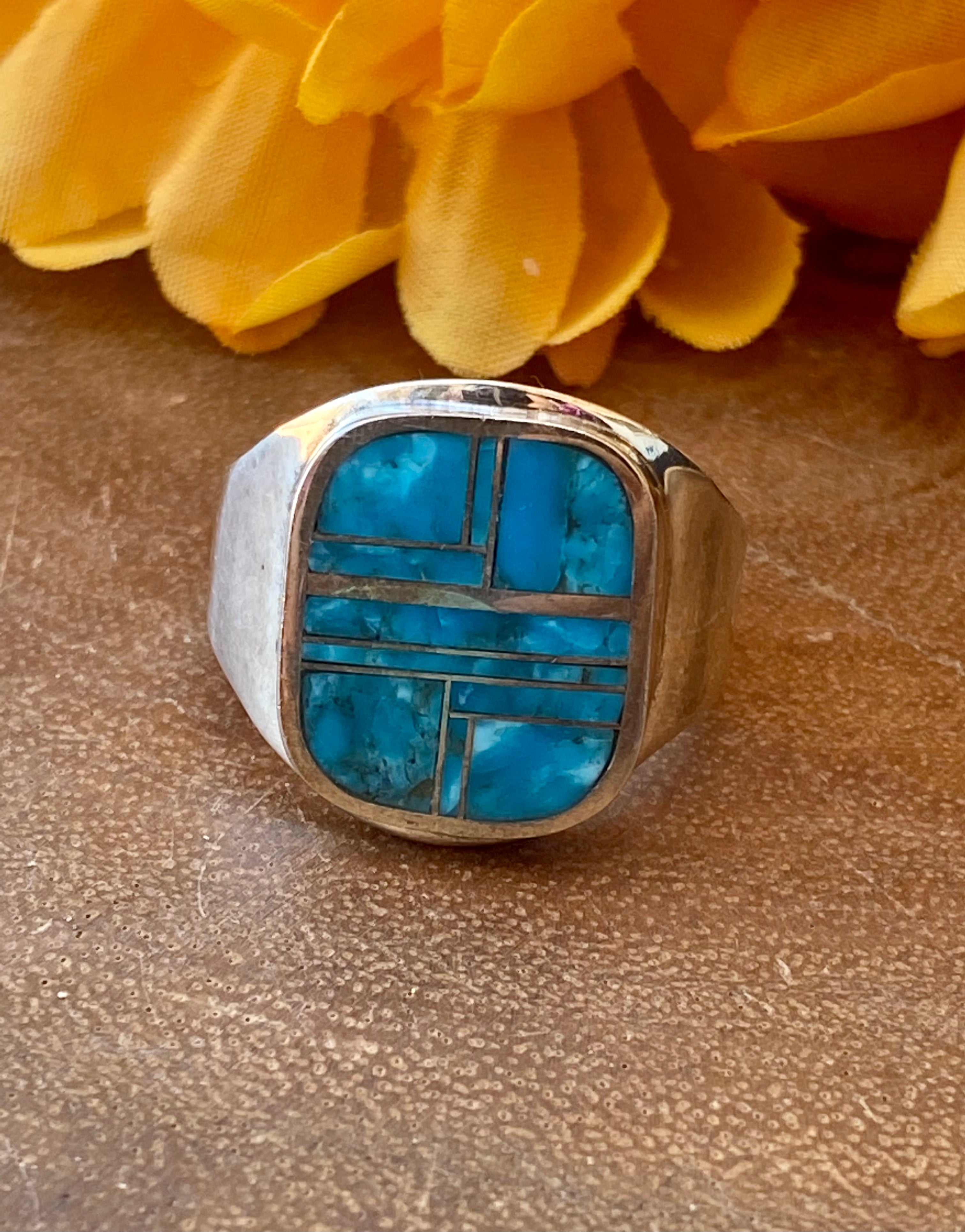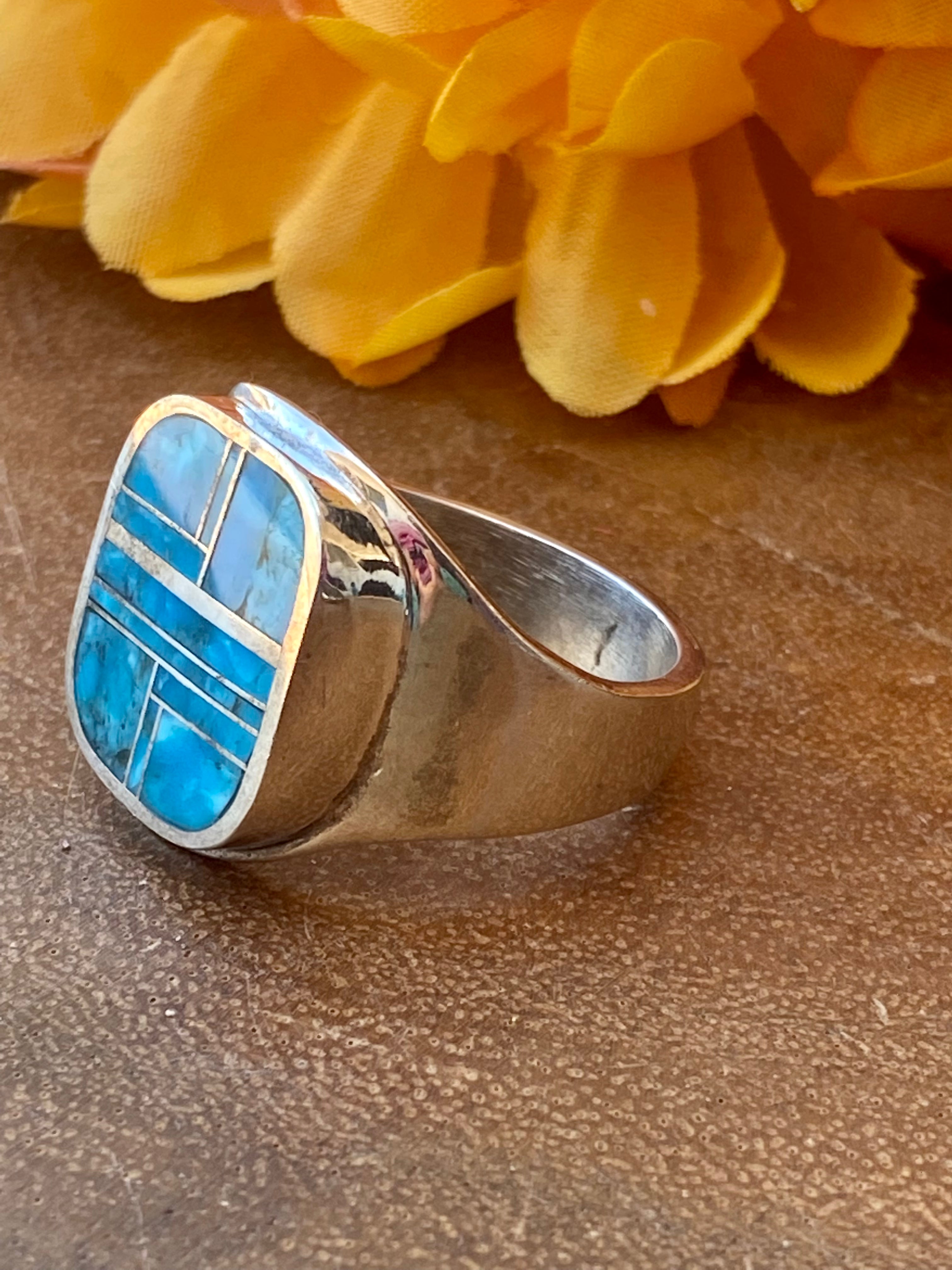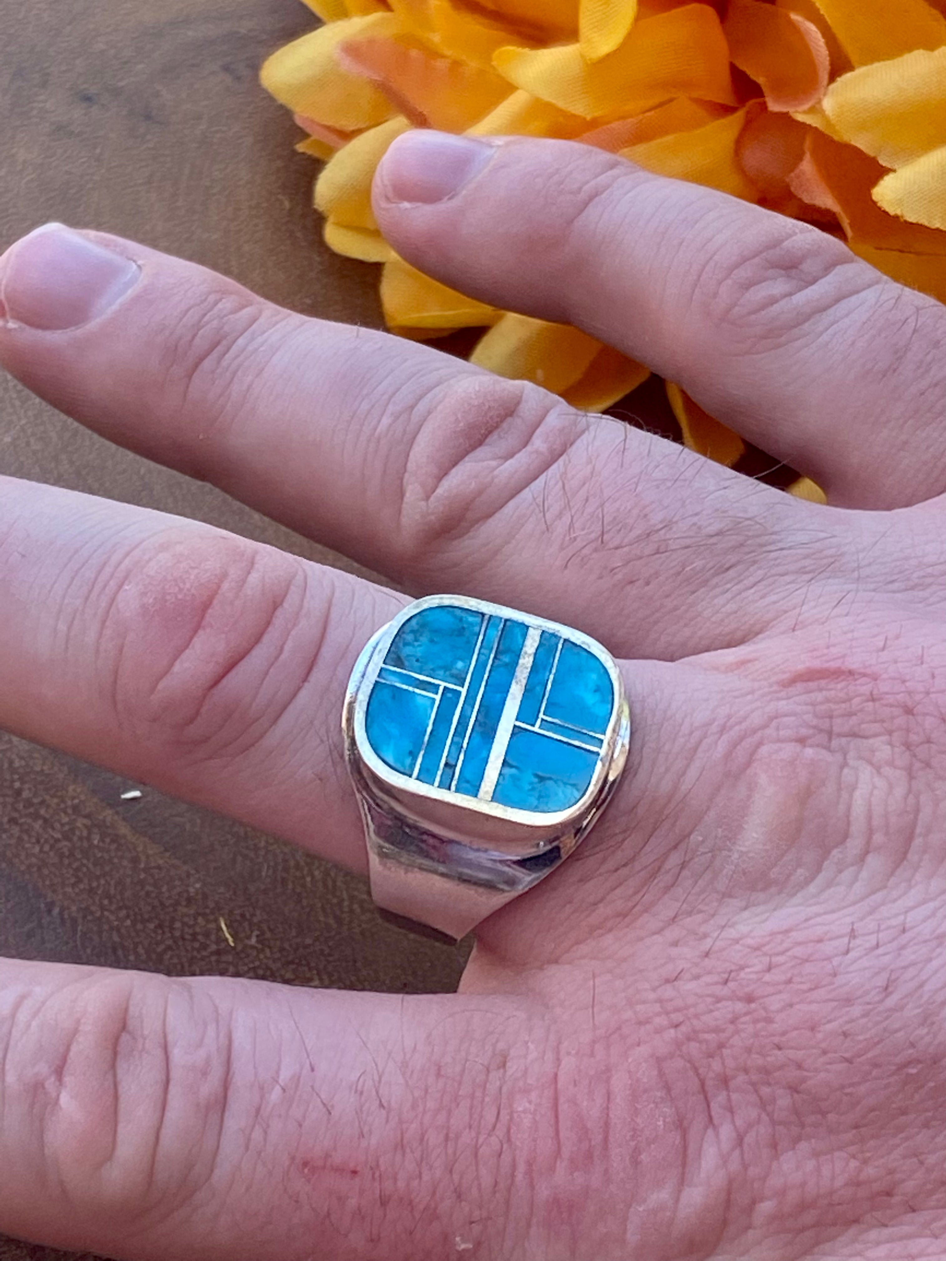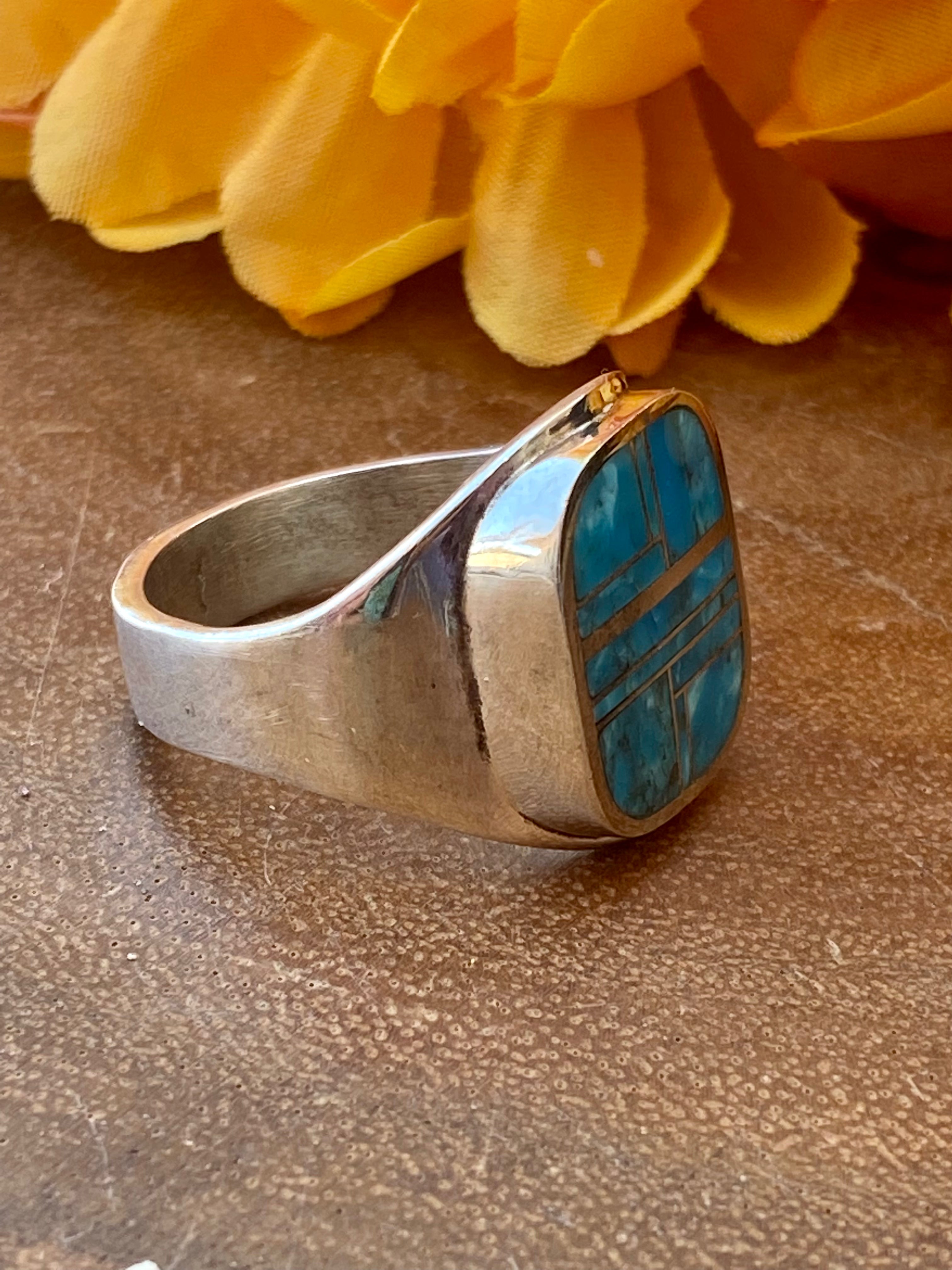Navajo Made Kingman Turquoise & Sterling Silver Men’s Inlay Ring Size 13.75