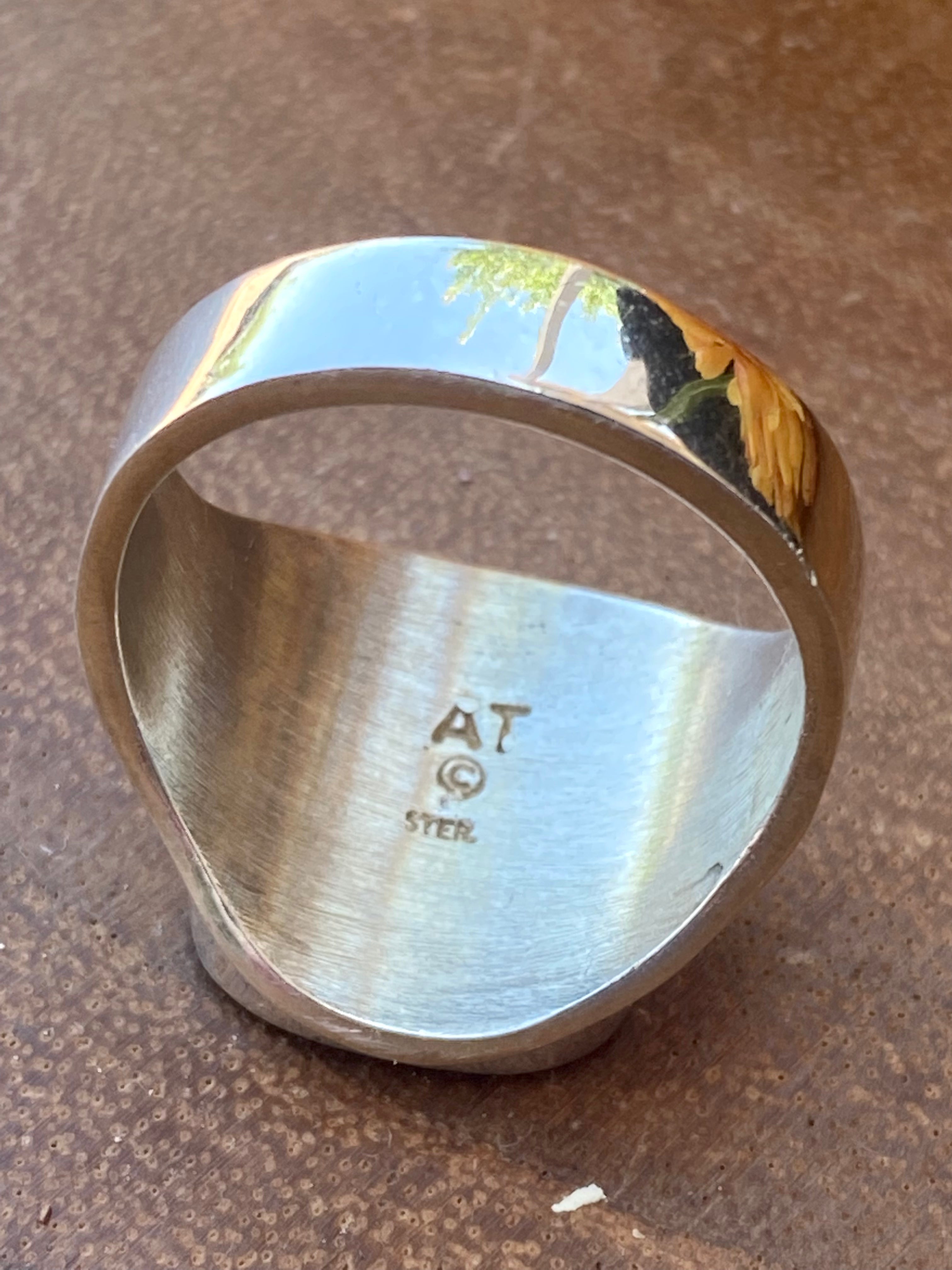 Navajo Made Kingman Turquoise & Sterling Silver Men’s Inlay Ring Size 13.75. It measures just under 7/8 of an inch long and just over 5/8 of an inch wide. Signed by the artist and stamped sterling silver.