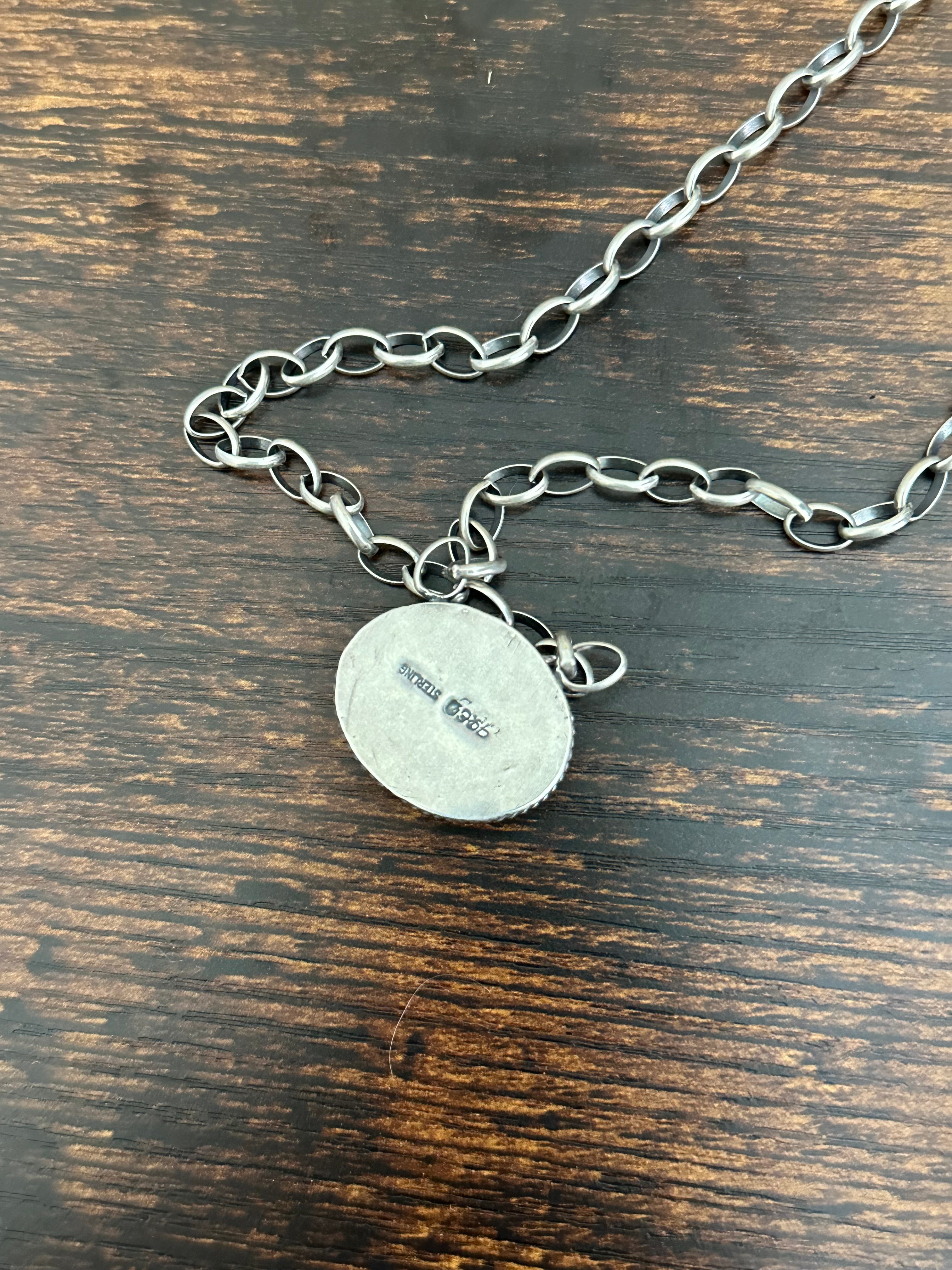 Beautiful Necklace. Navajo Made Kingman Turquoise & Sterling Silver Necklace. It measures 19 inches long with hang while the chain measures 17 inches long. Signed by the artist and stamped sterling silver.