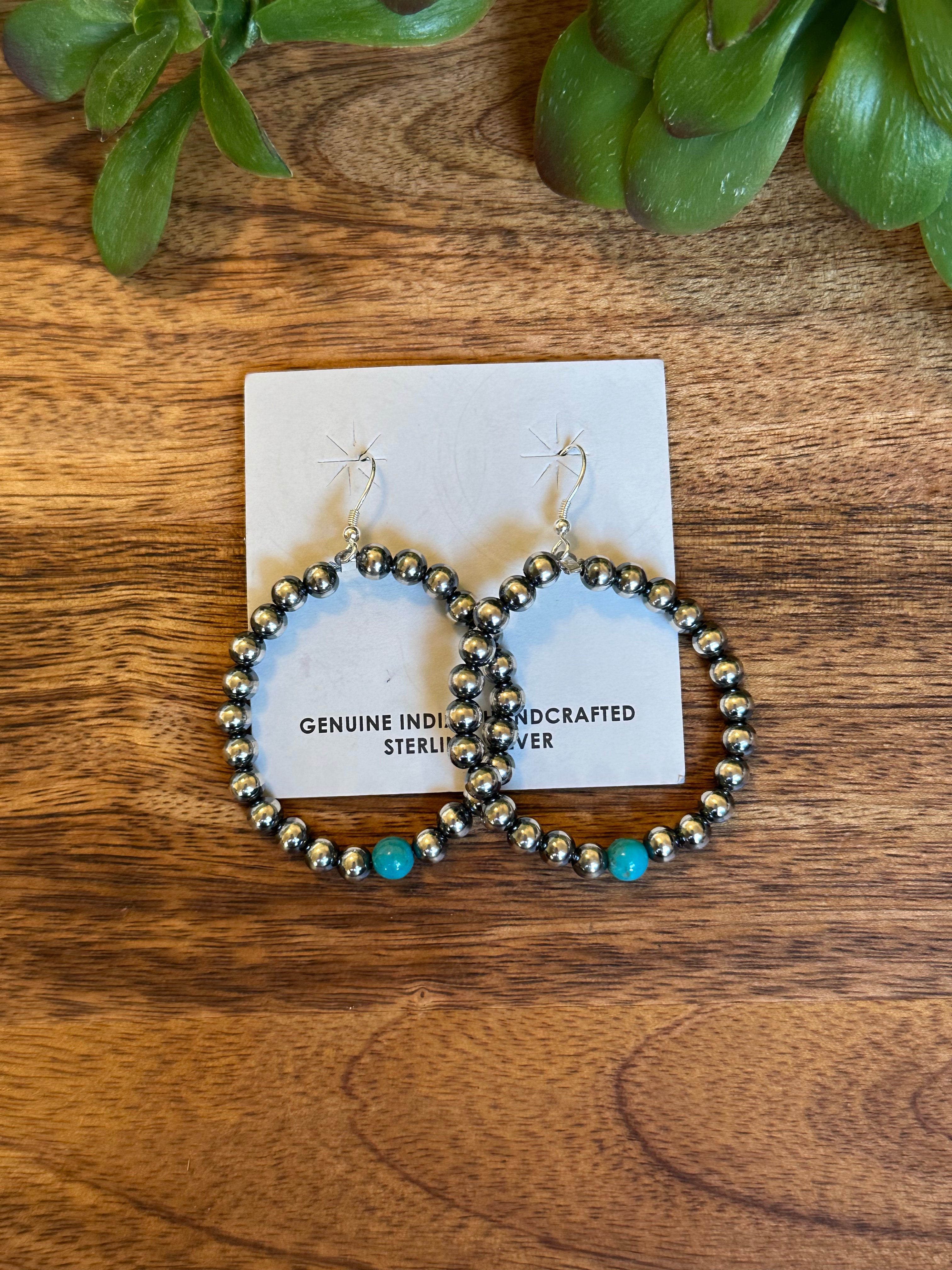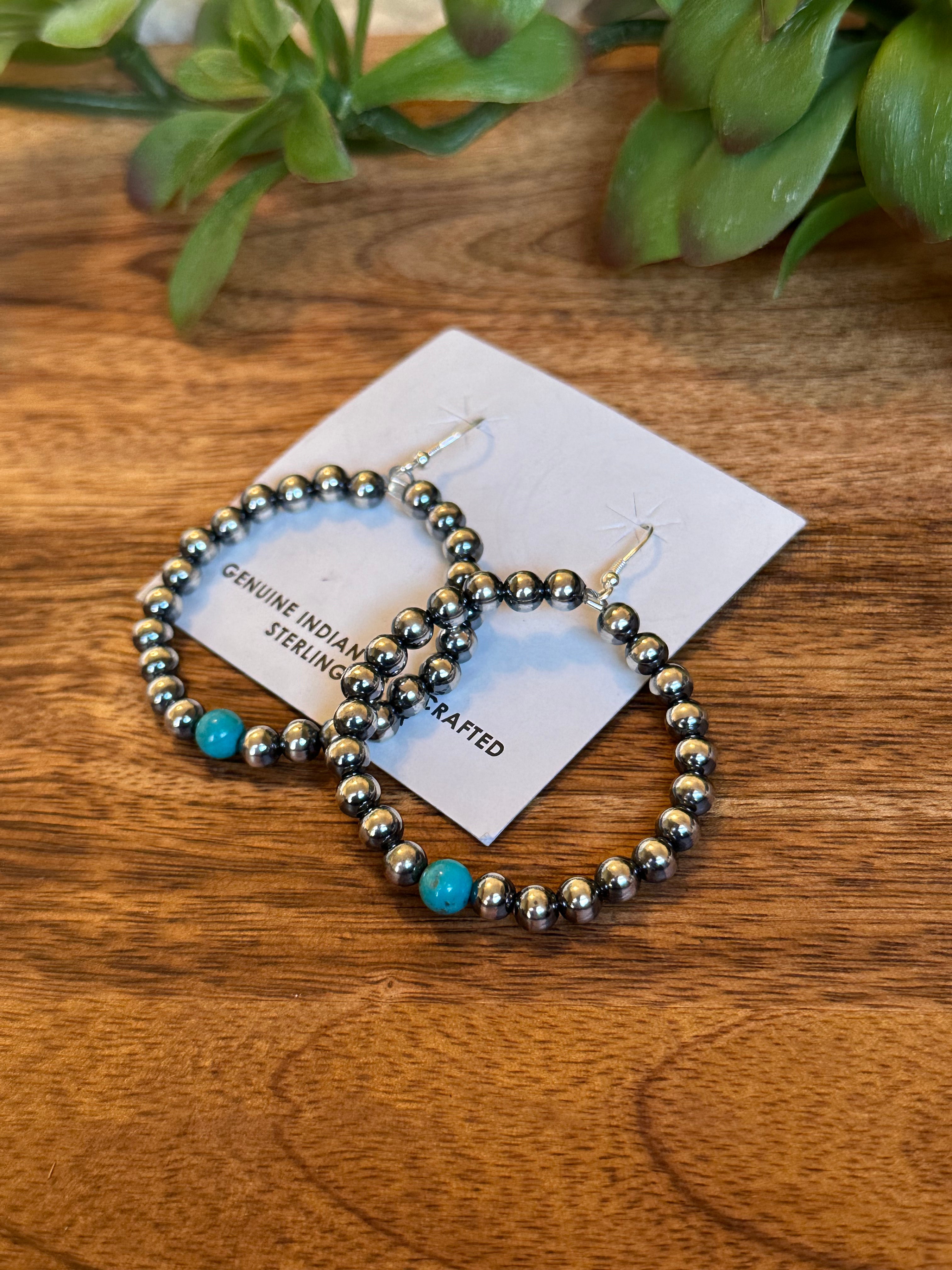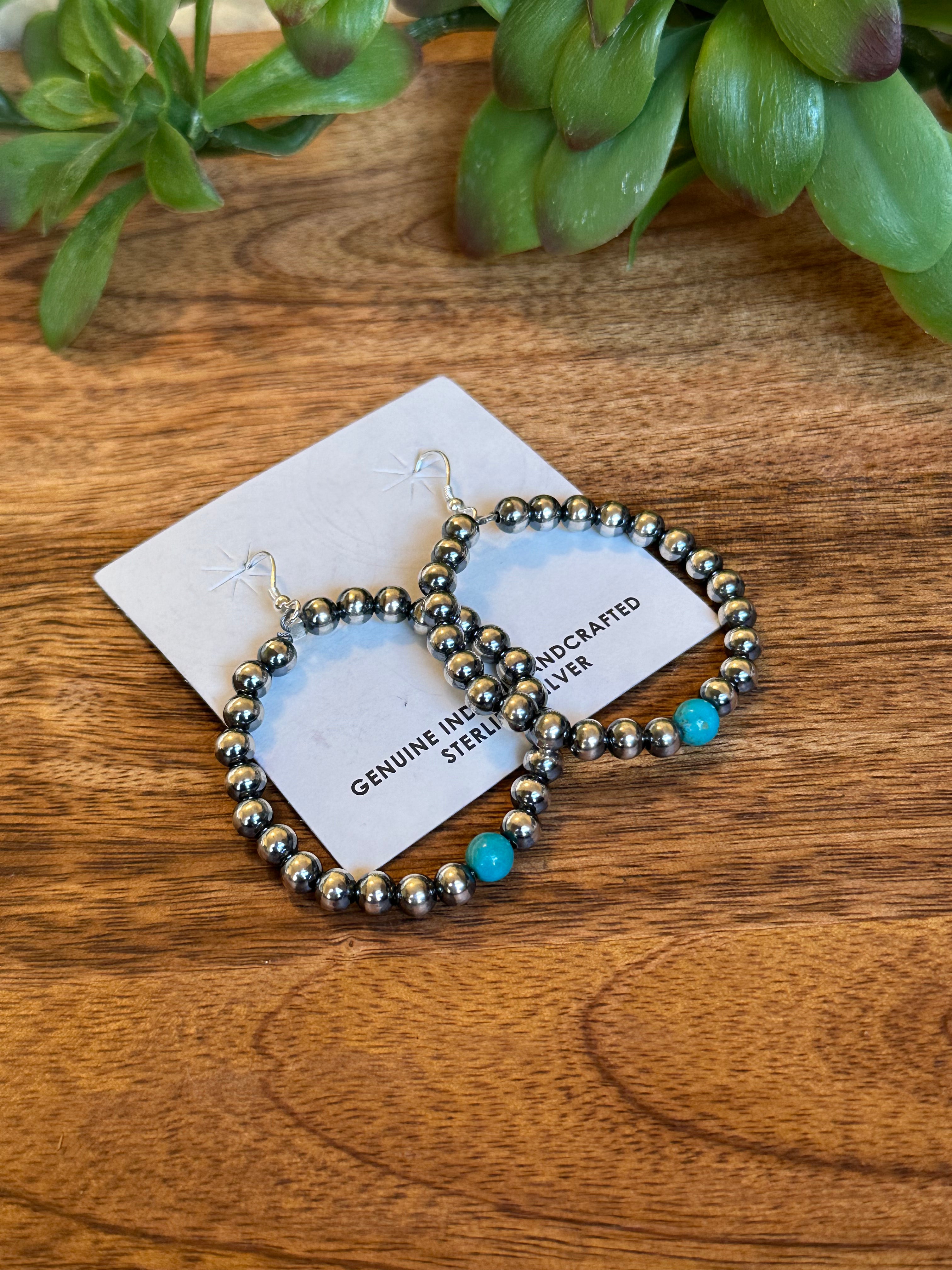 Navajo Made Kingman Turquoise & Sterling Silver Pearls Dangle Hoop Earrings