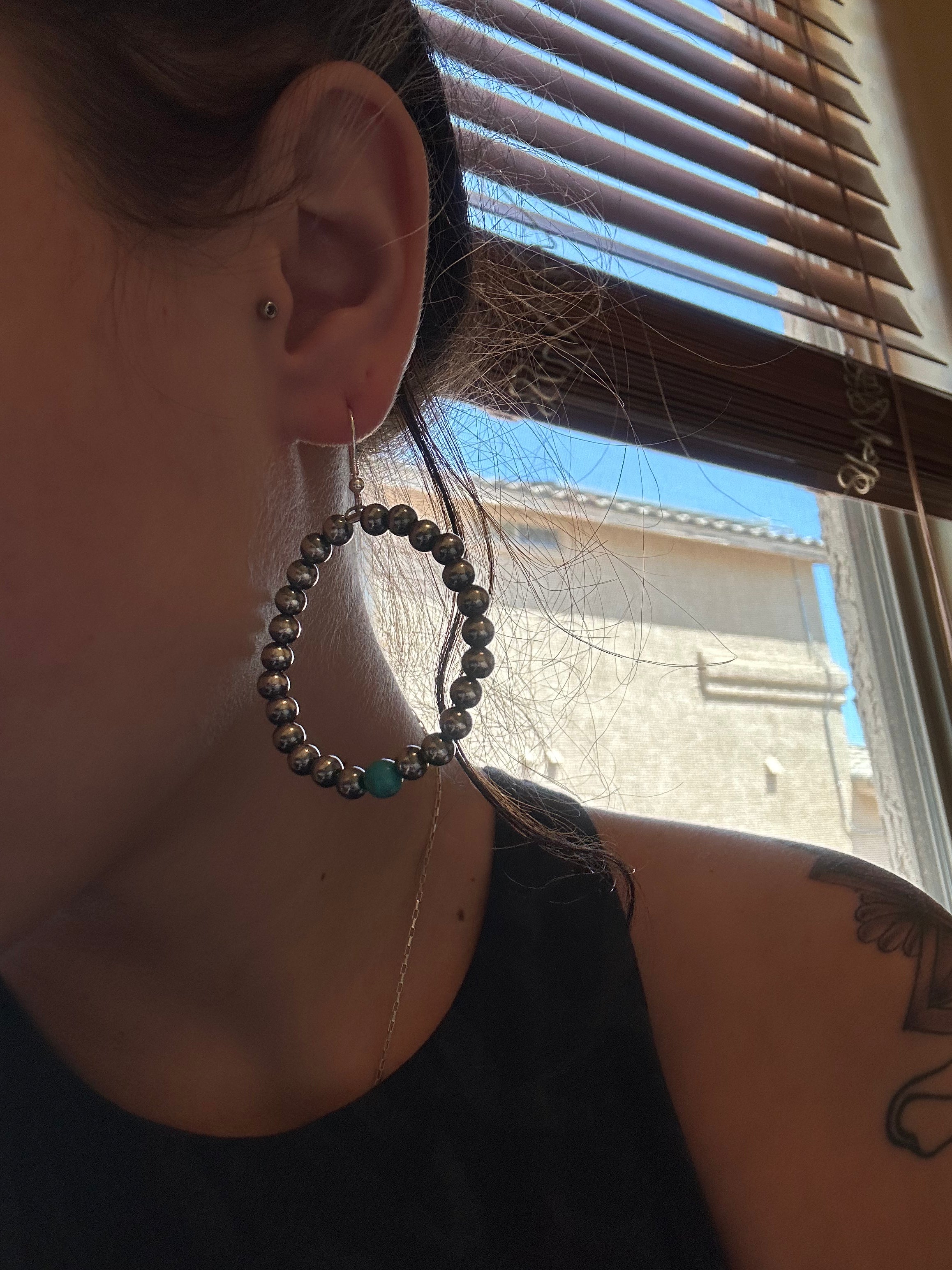 Beautiful earrings, perfect for your everyday wear. Navajo Made Kingman Turquoise & Sterling Silver Pearls Dangle Hoop Earrings. It measures 2 1/2 inches long and 1 5/8 inches wide.