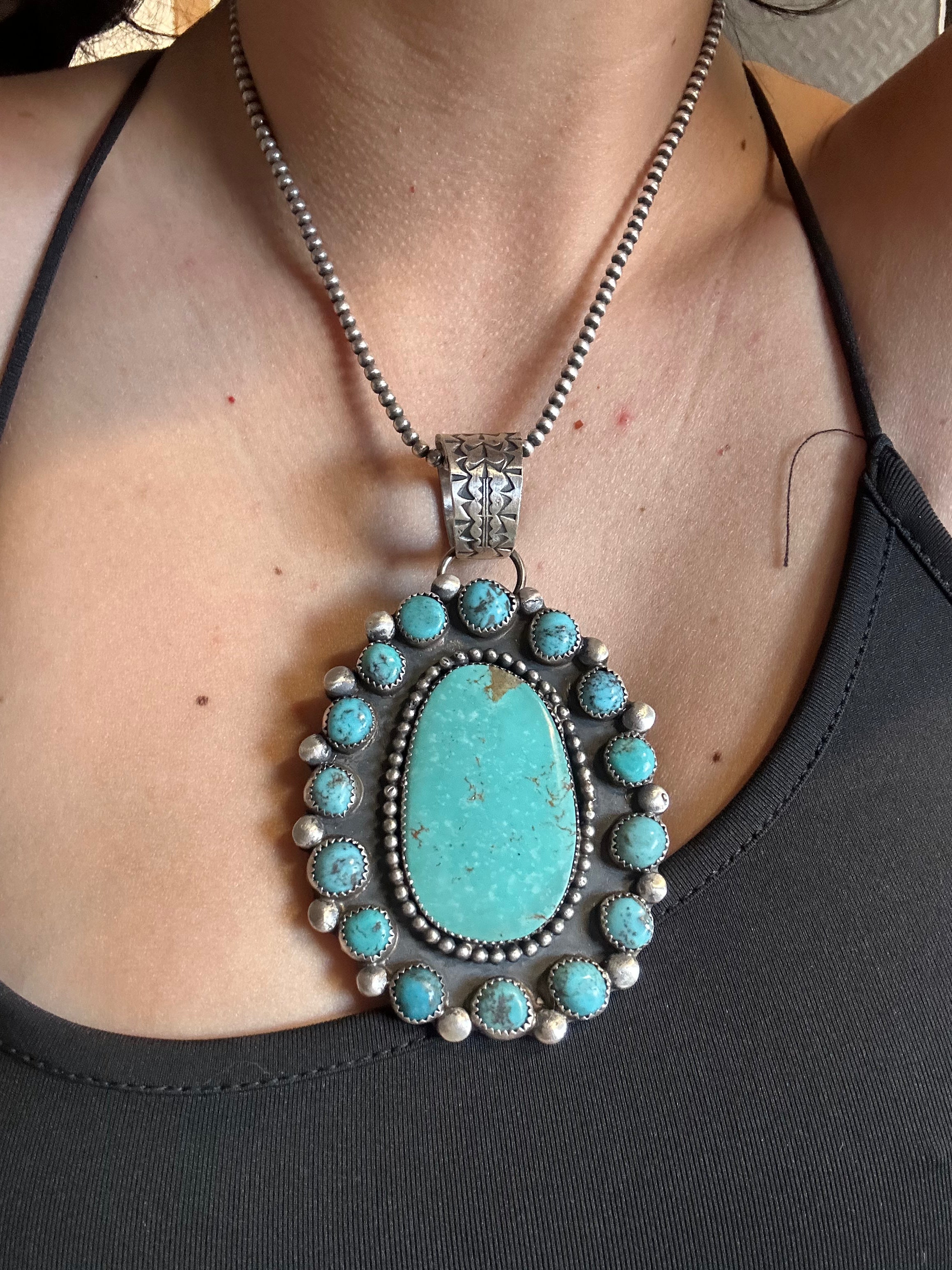 Check out these amazing stone. Navajo Made Kingman Turquoise & Sterling Silver Pendant. It measures 3 7/8 inches long and 2 3/8 inches wide. Signed by the artist and stamped sterling silver. Pendant only!