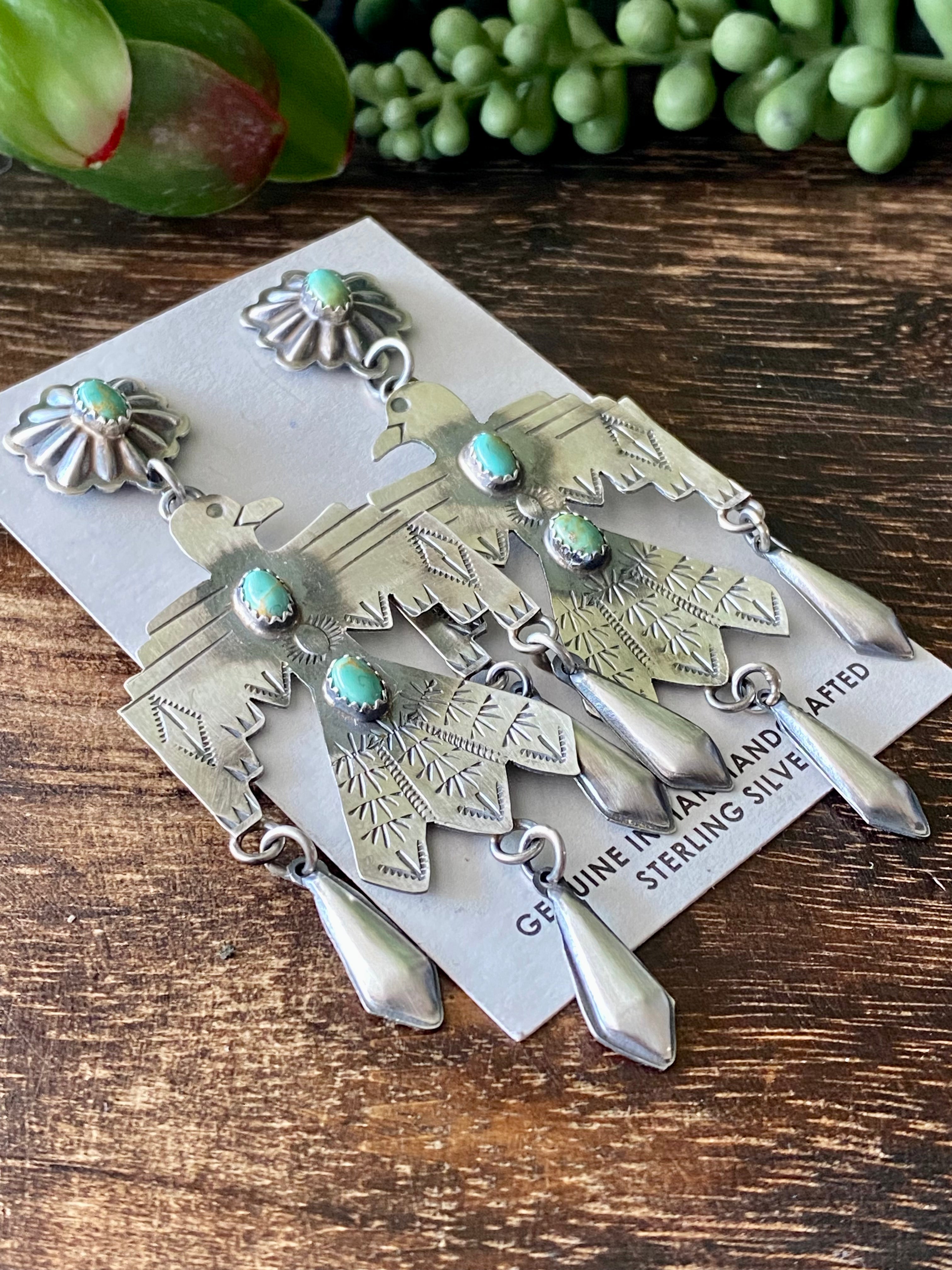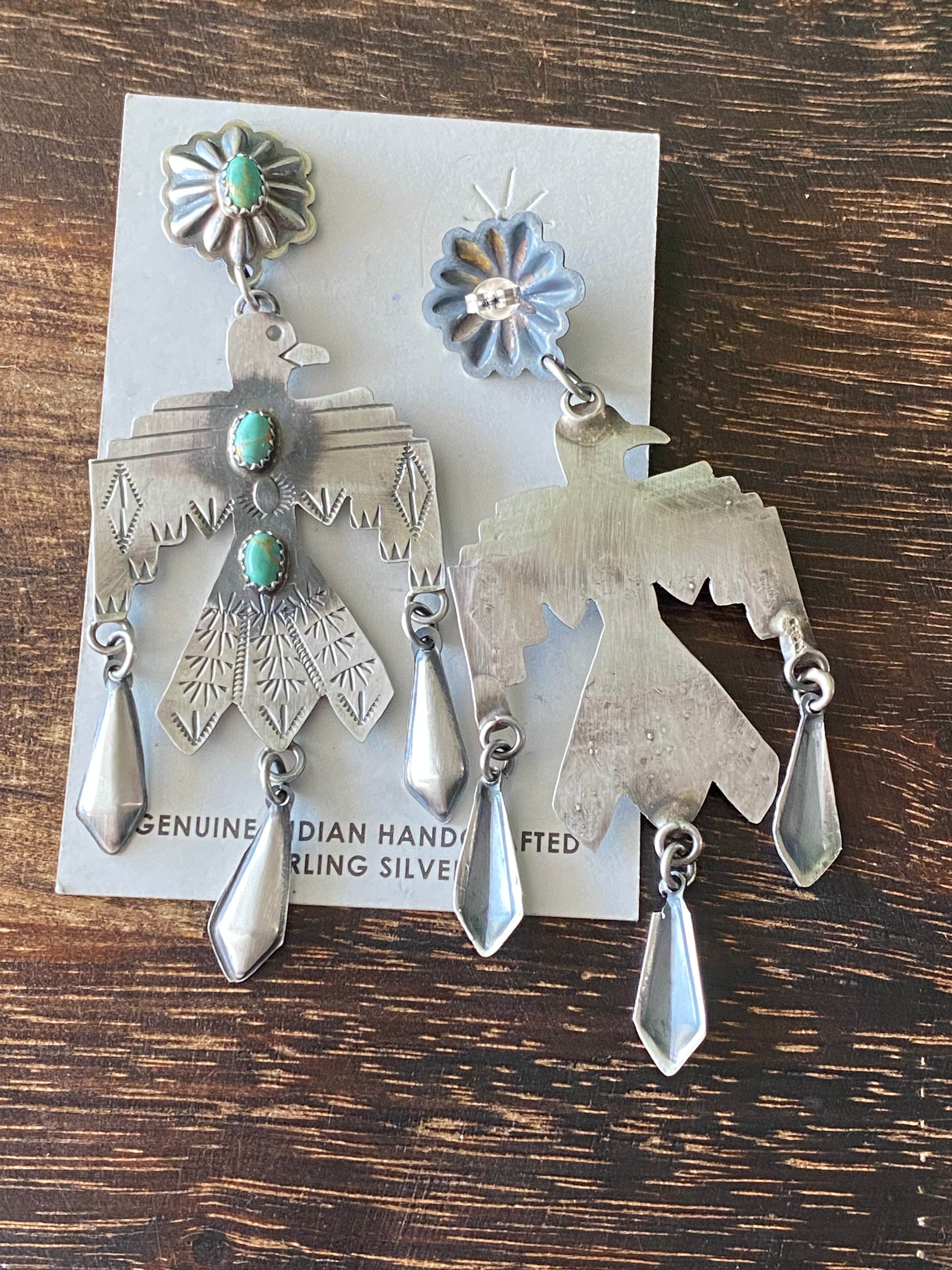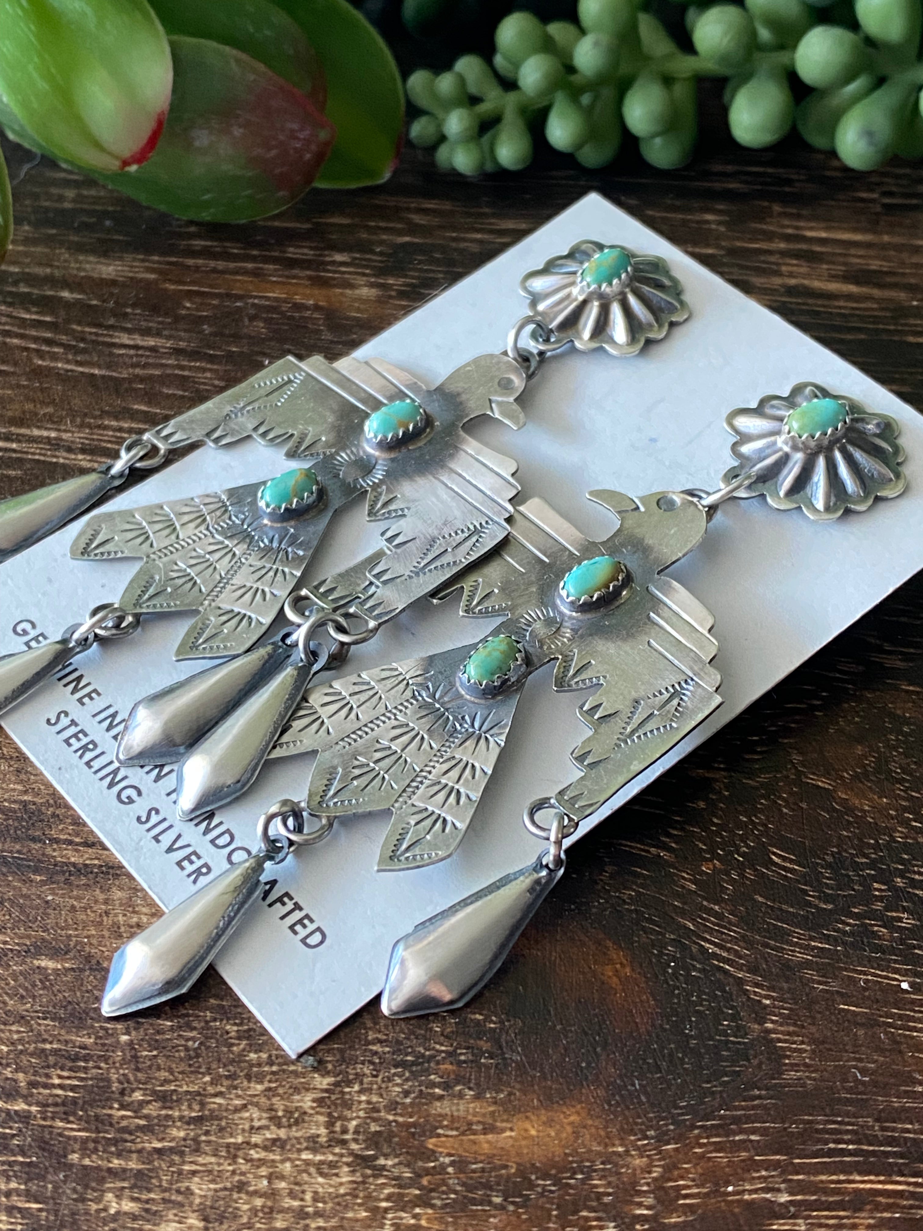 Navajo Made Kingman Turquoise & Sterling Silver Post Dangle Earrings. They measure 3 7/8 inches long and 1 1/2 inches wide. Stones will differ due to natural stones.