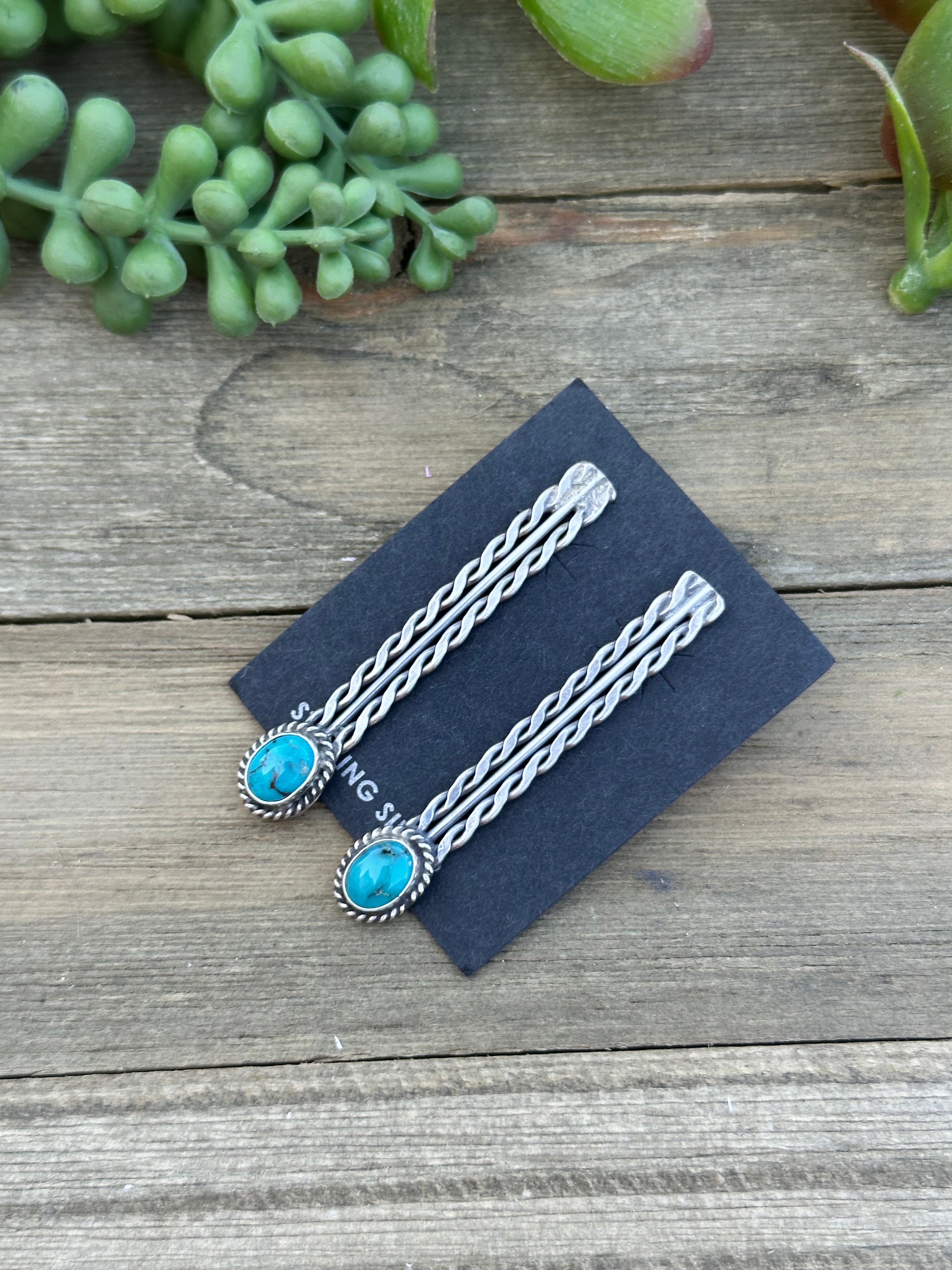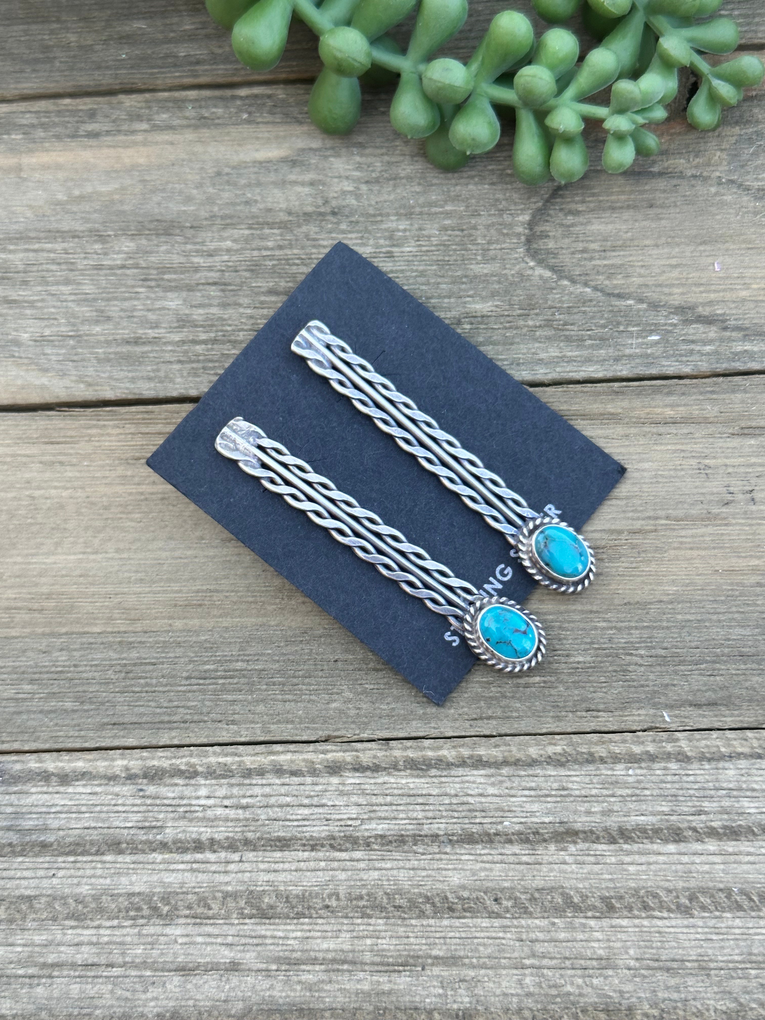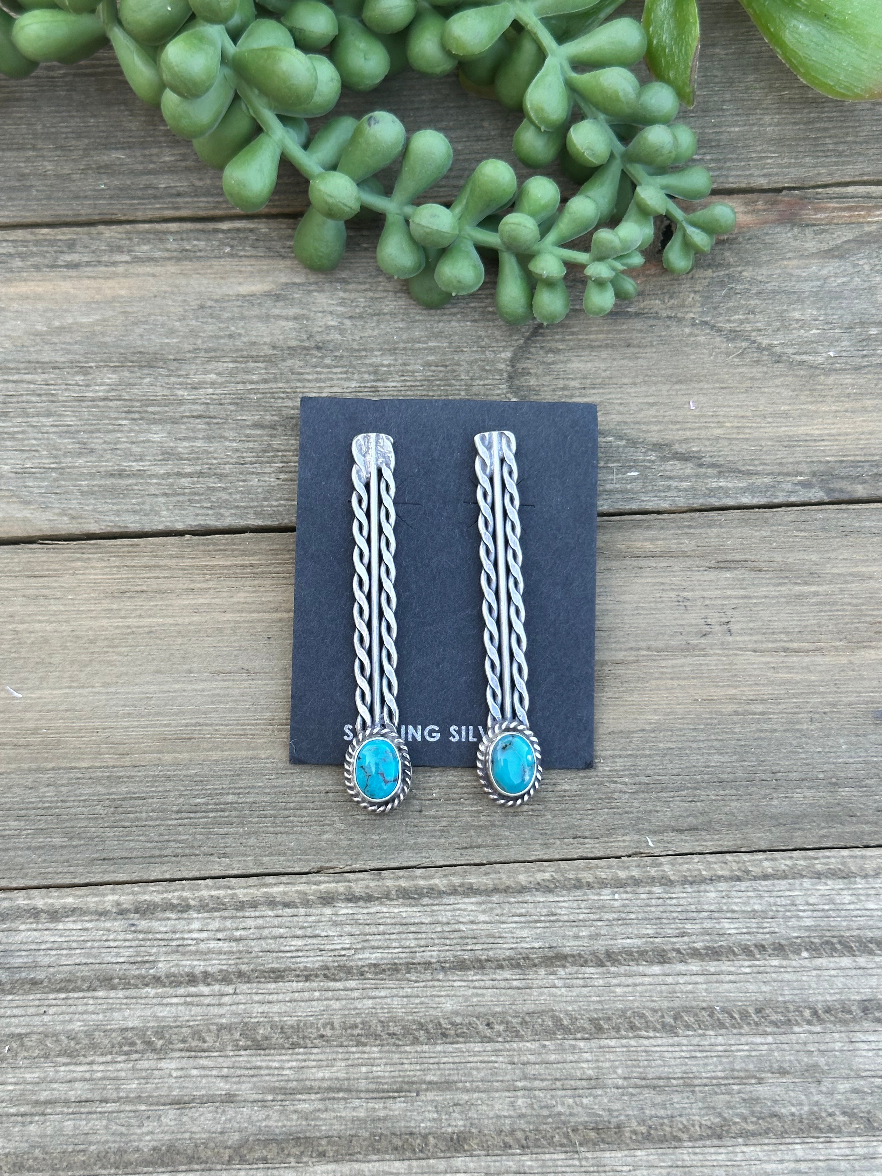 Navajo Made Kingman Turquoise & Sterling Silver Post Dangle Earrings. It measures 2 1/8 inches long and 1/4 of an inch wide. Stamped sterling silver. Stones will differ due to natural stones.