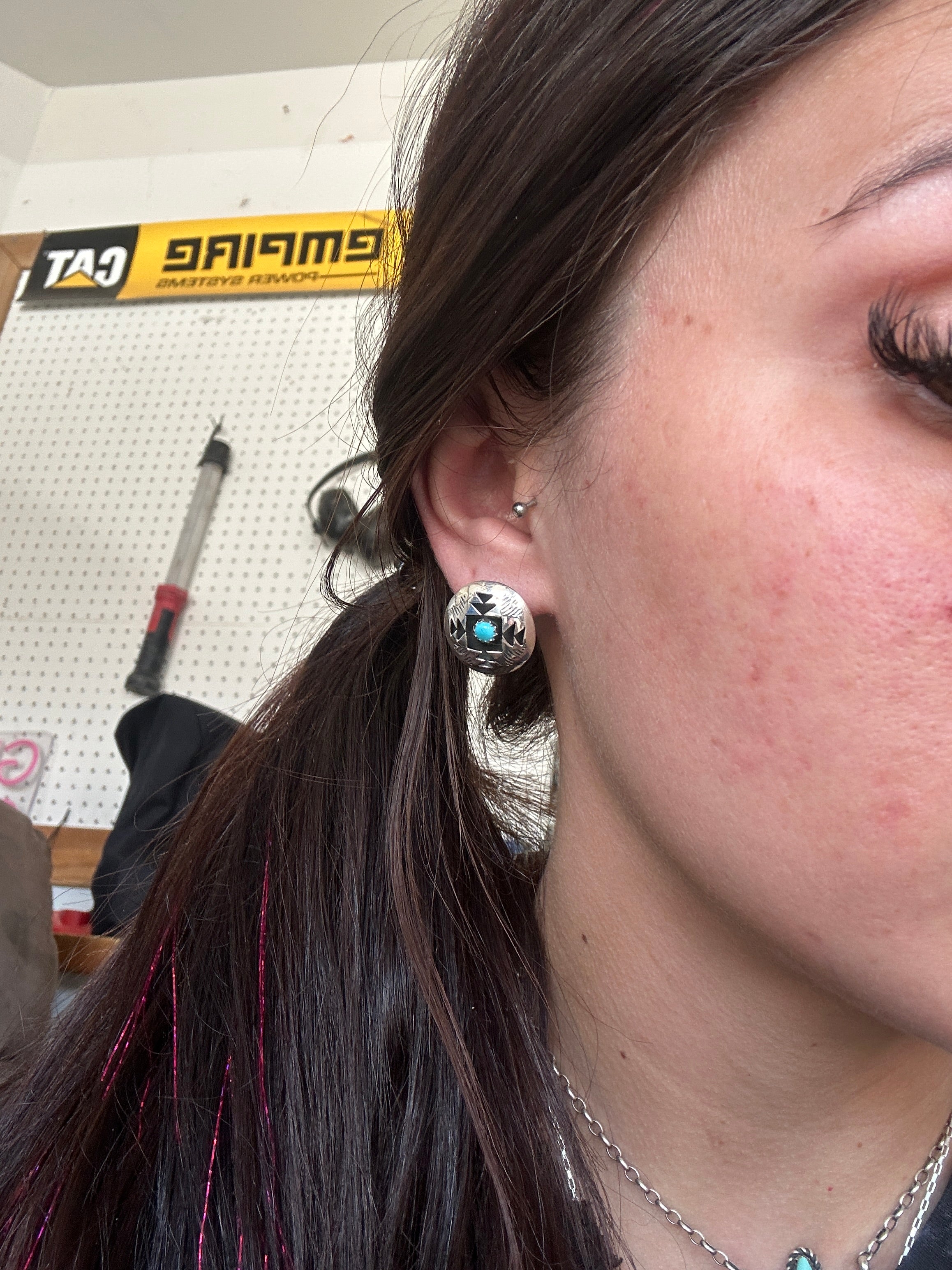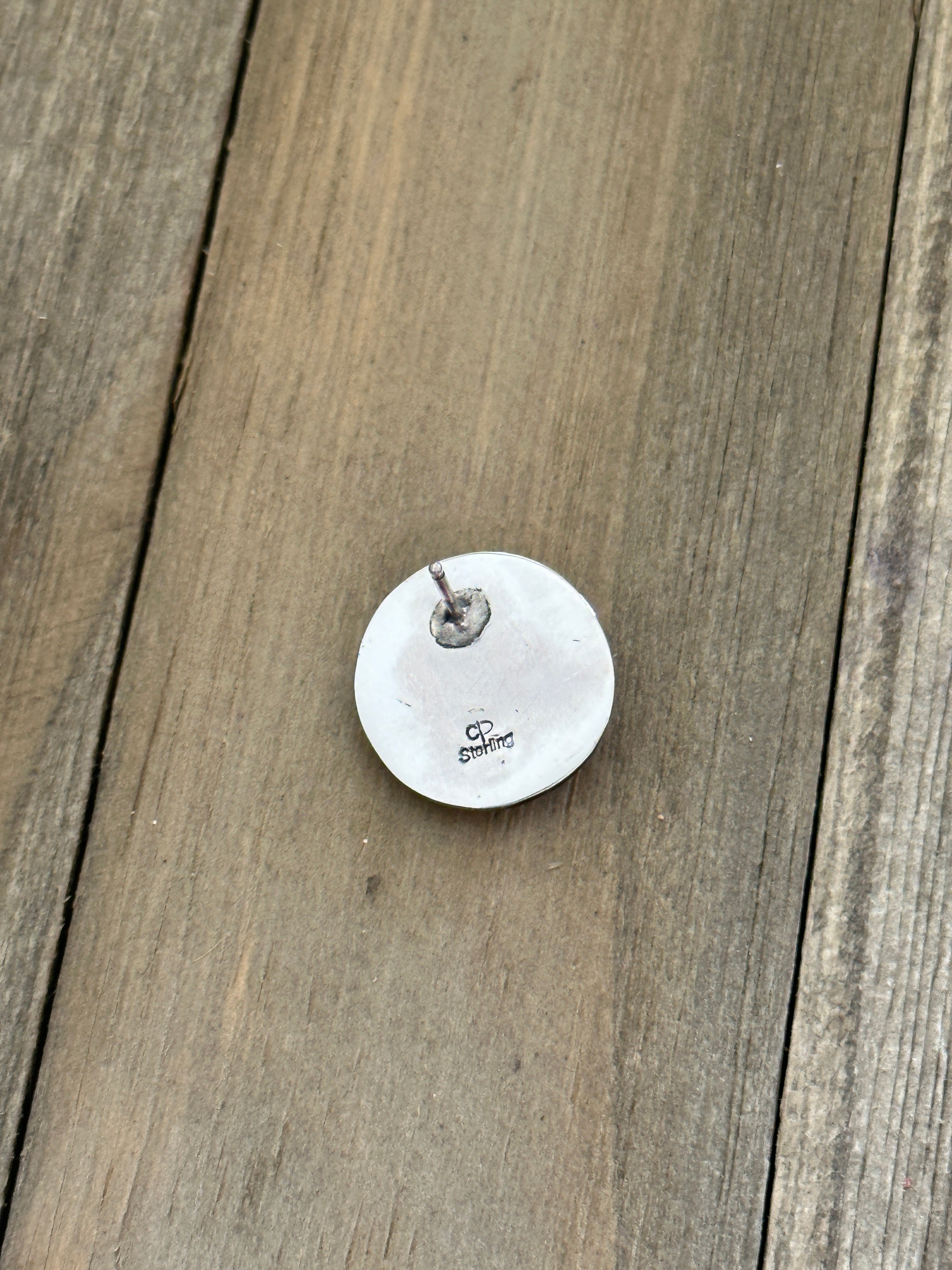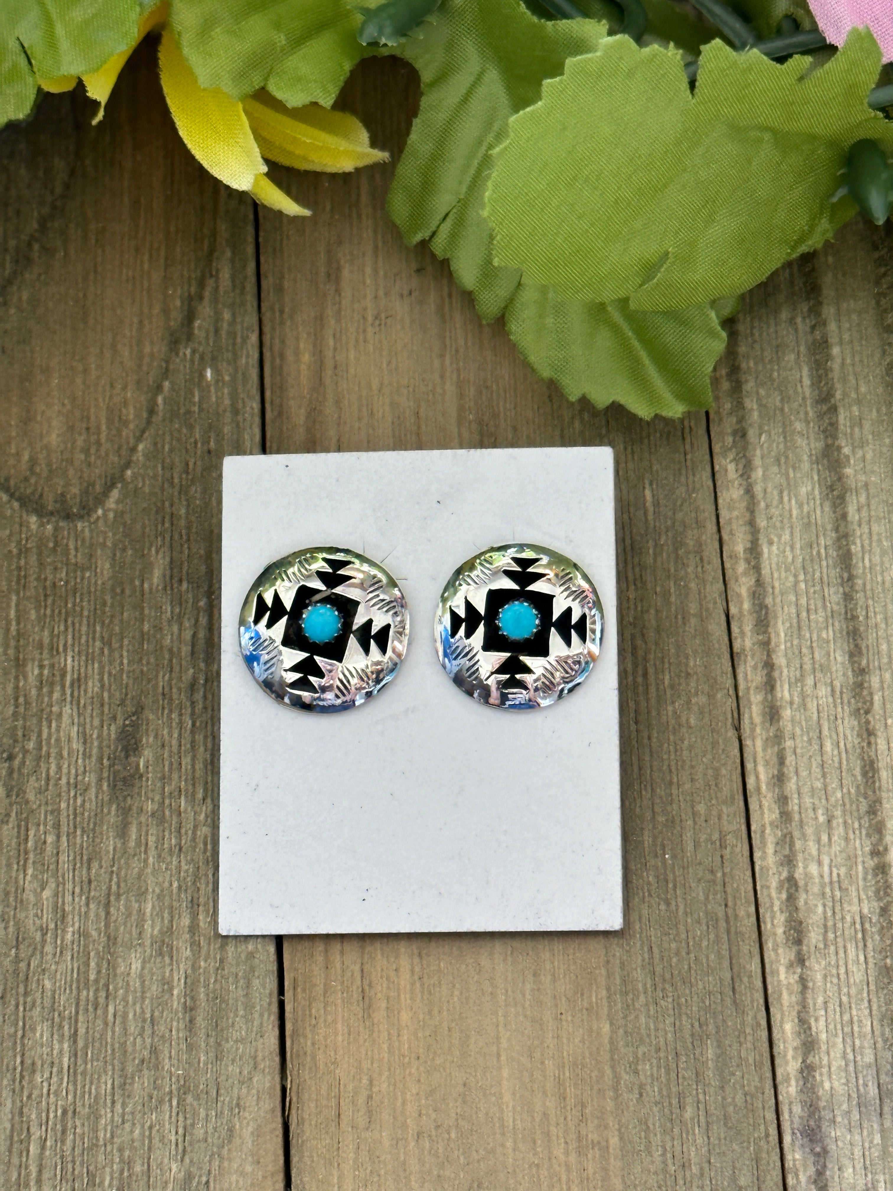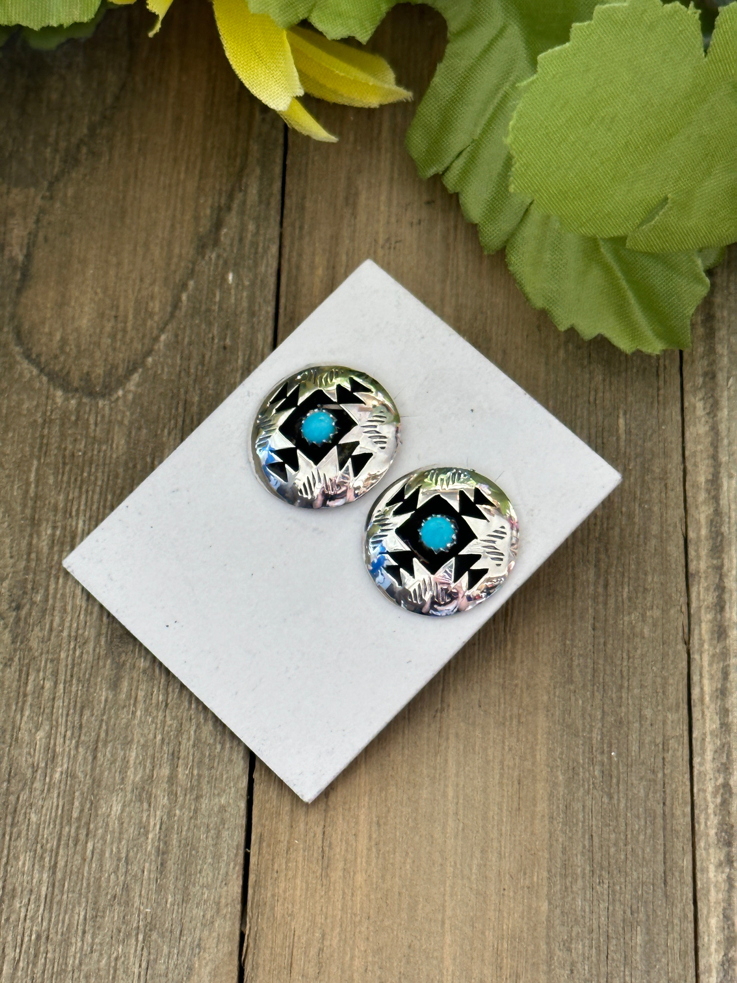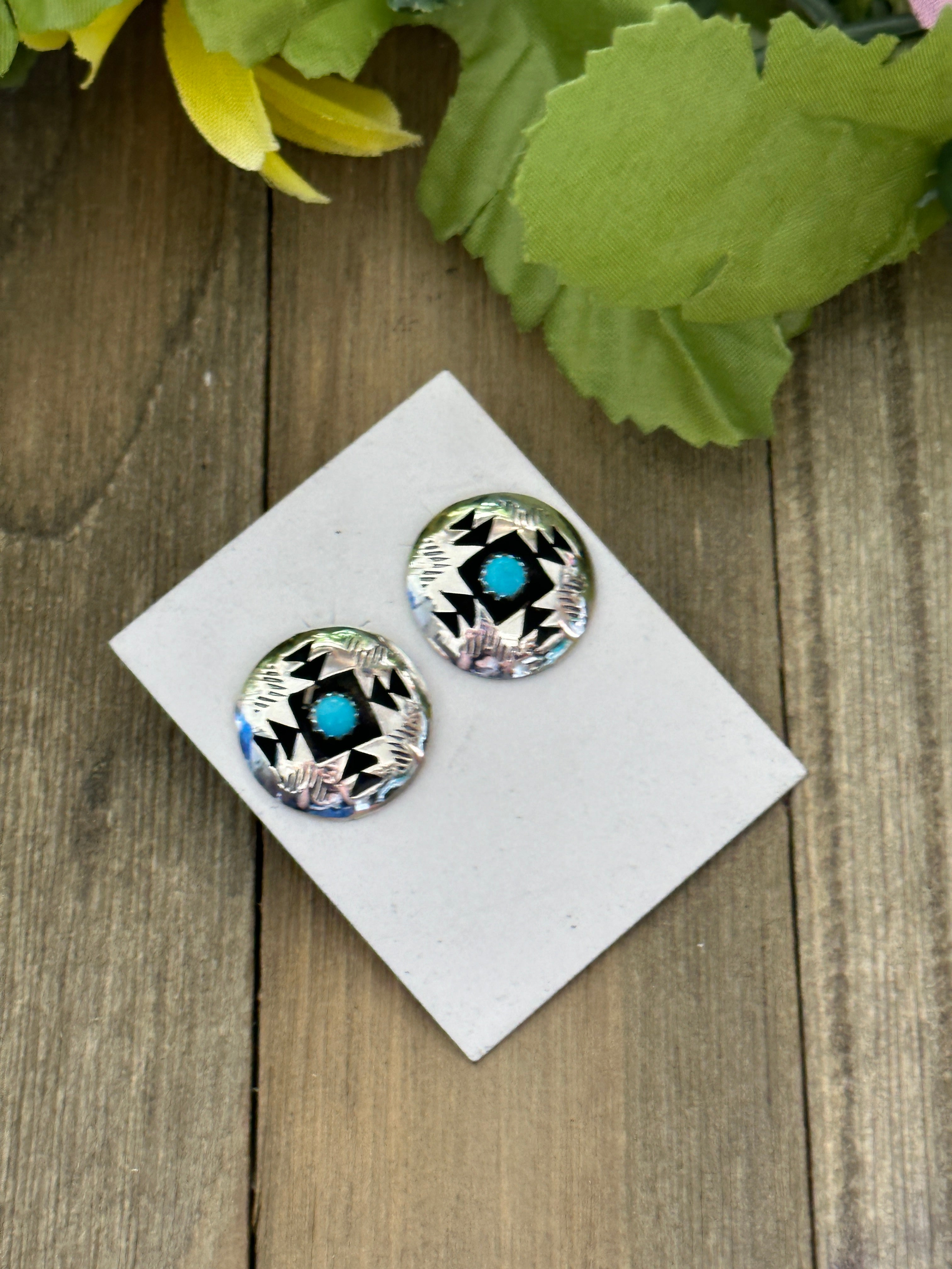 Navajo Made Kingman Turquoise & Sterling Silver Post Earrings. It measures 3/4 of an inch round. Signed by artist and stamped sterling silver.