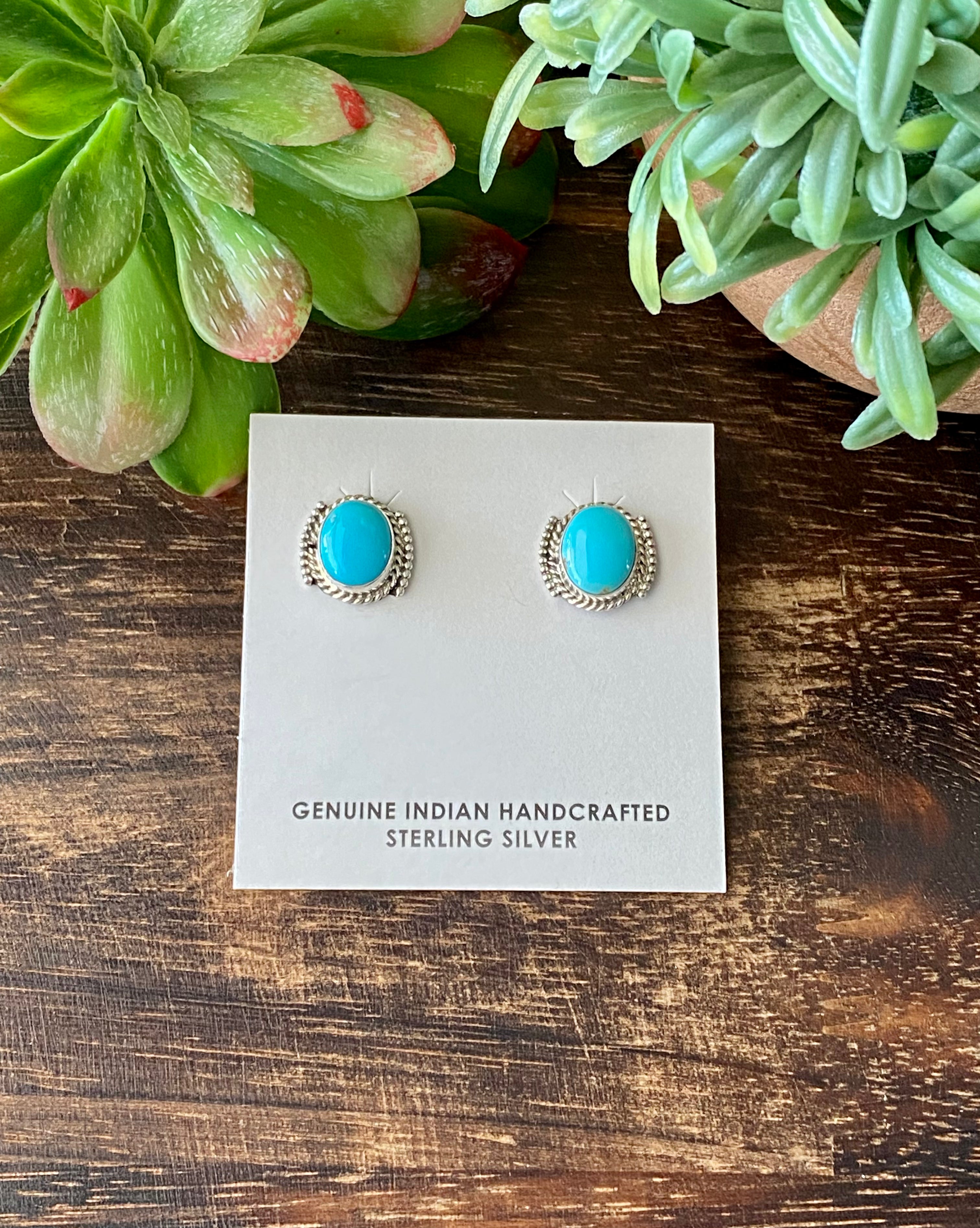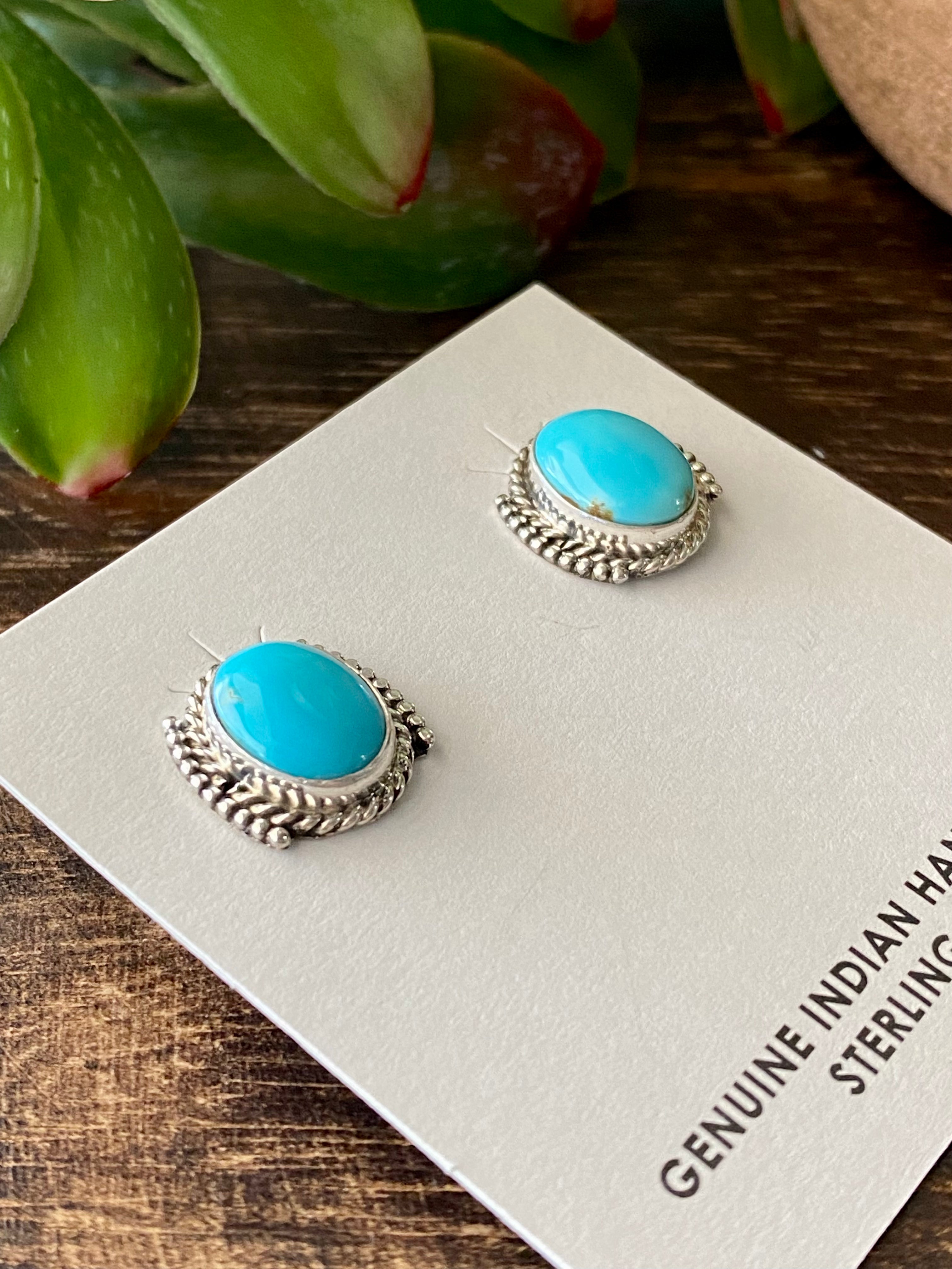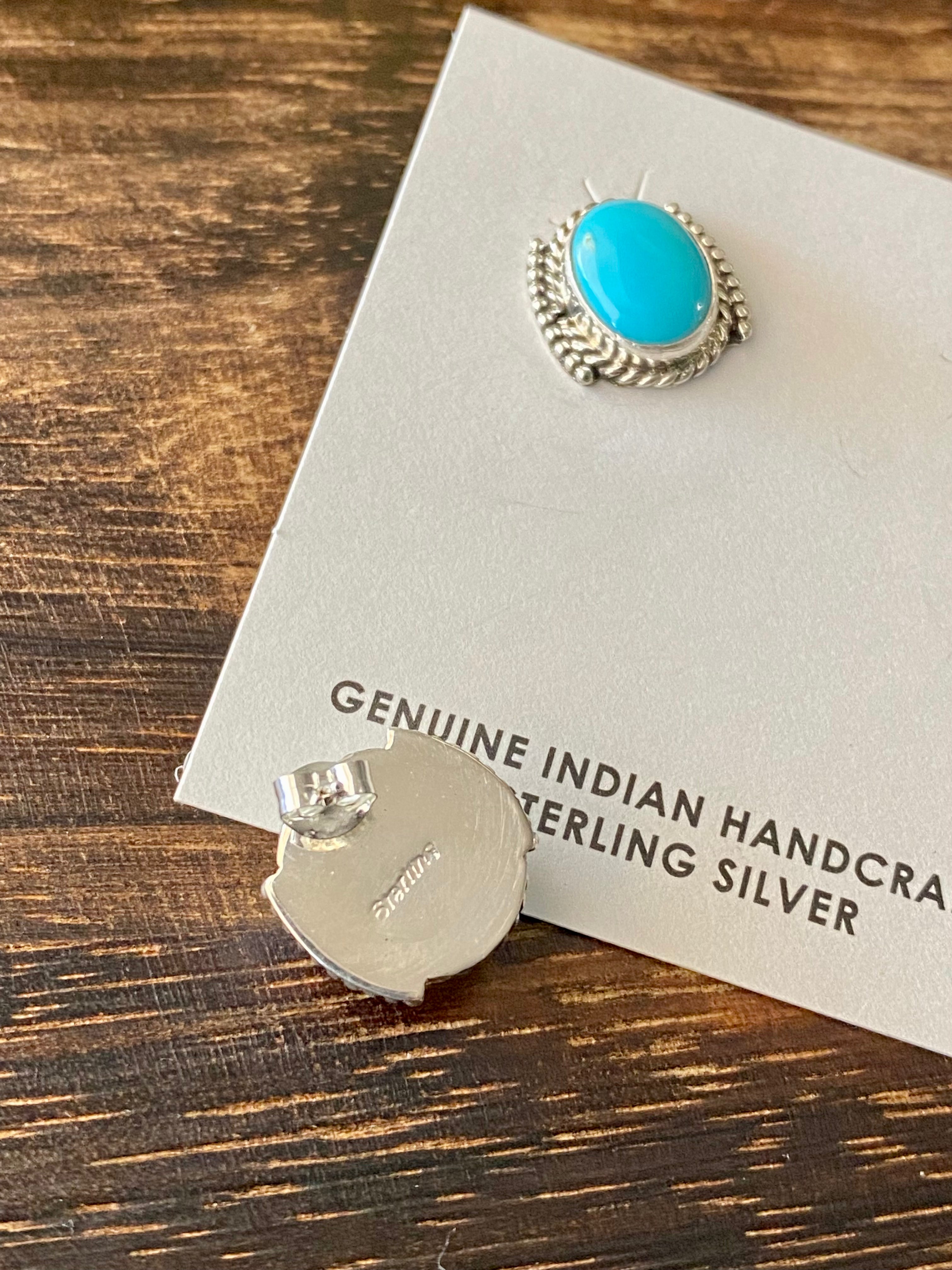 Navajo Made Kingman Turquoise & Sterling Silver Post Earrings. They measure just over 1/2 of an inch long and just over 1/2 of an inch wide. Stamped sterling silver.