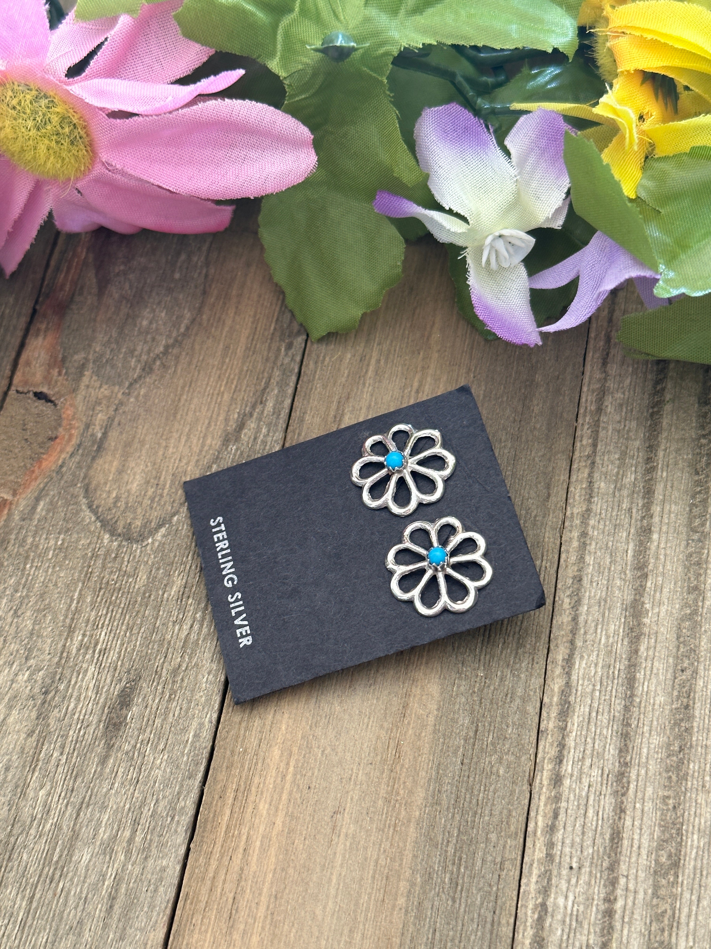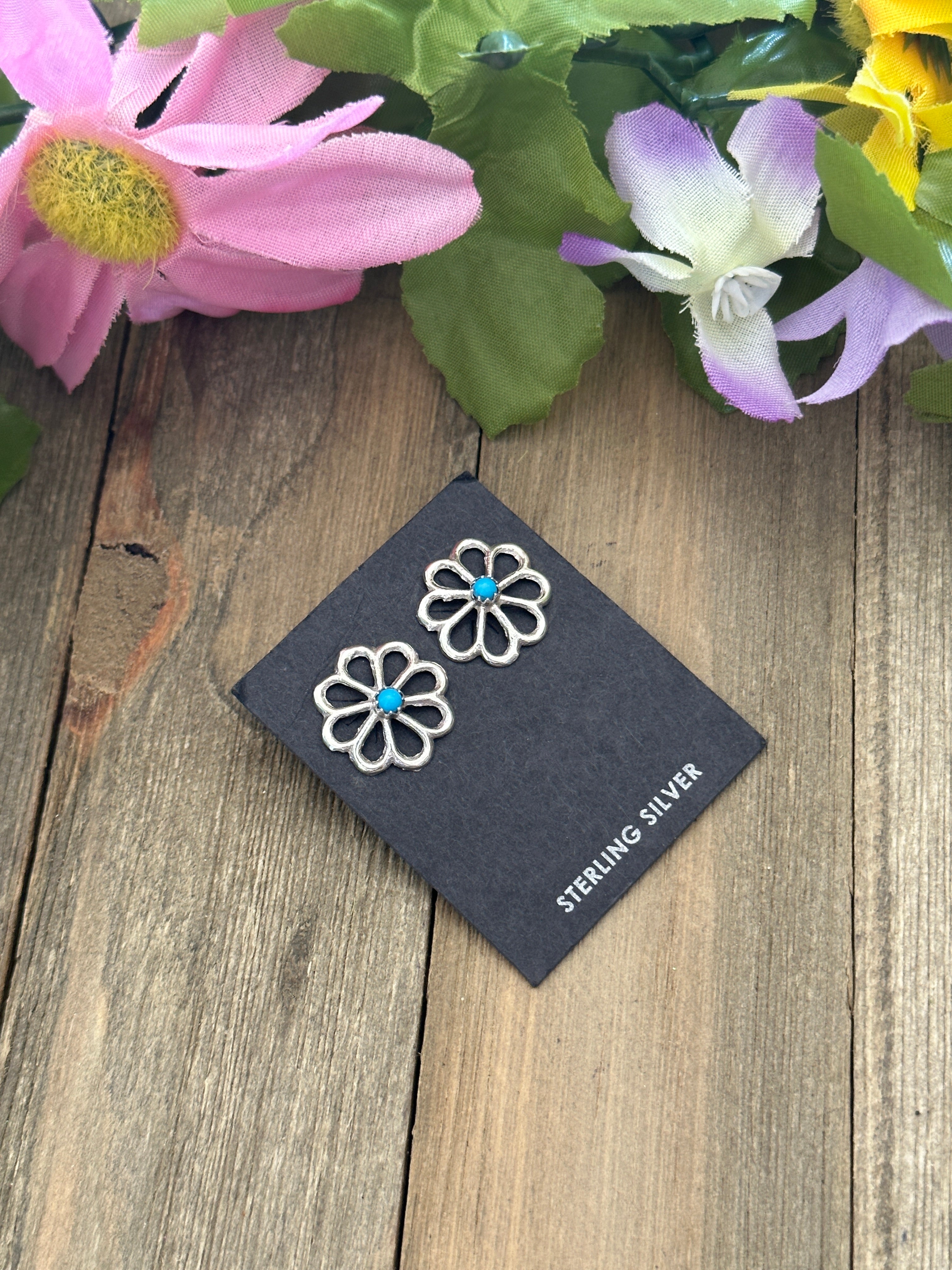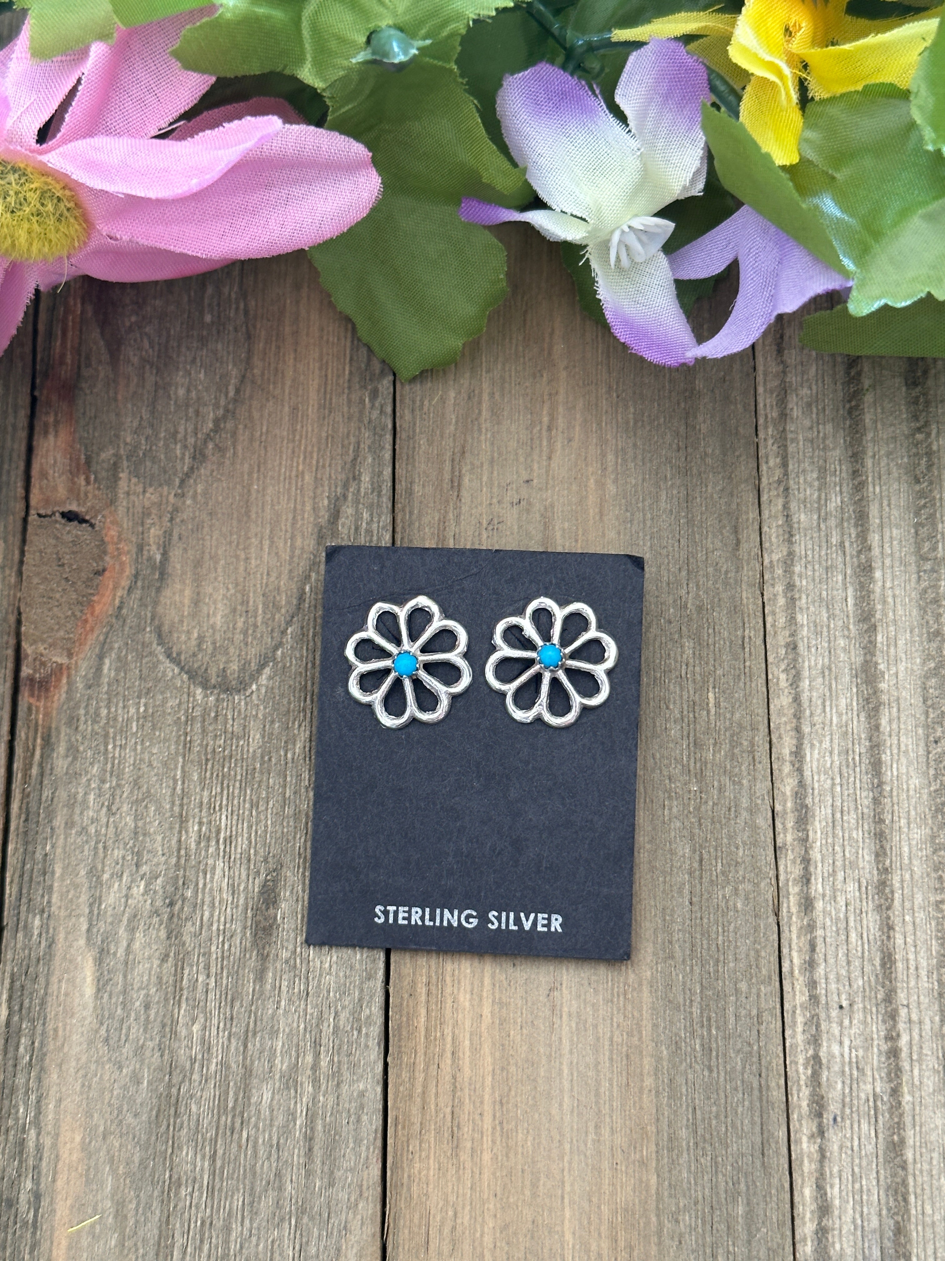 Navajo Made Kingman Turquoise & Sterling Silver Post Flower Earrings