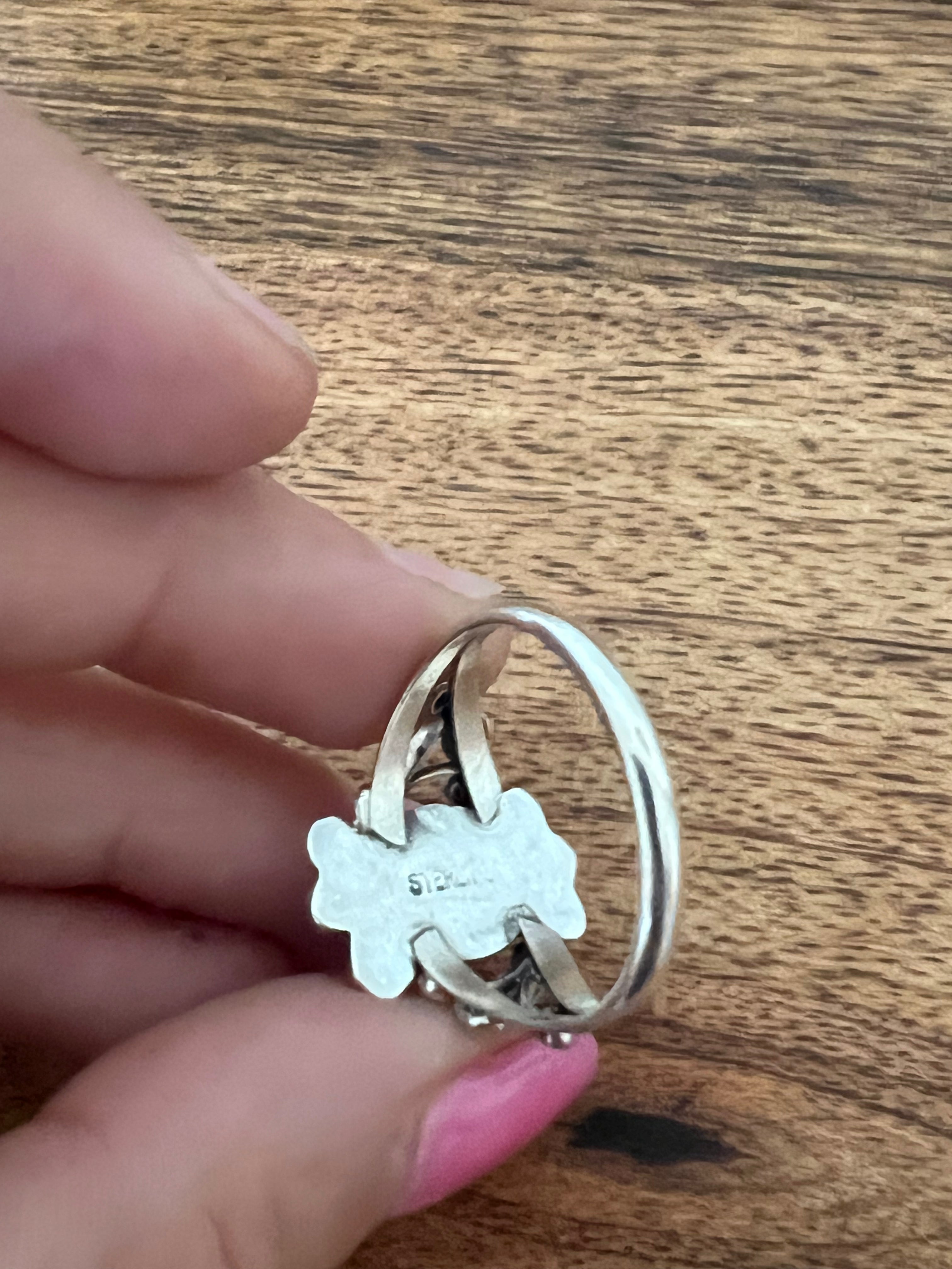 Navajo Made Kingman Turquoise & Sterling Silver Ring Size 9. It measures just over 5/8 of an inch long and 1/2 of an inch wide. Signed by the artist and stamped sterling silver.