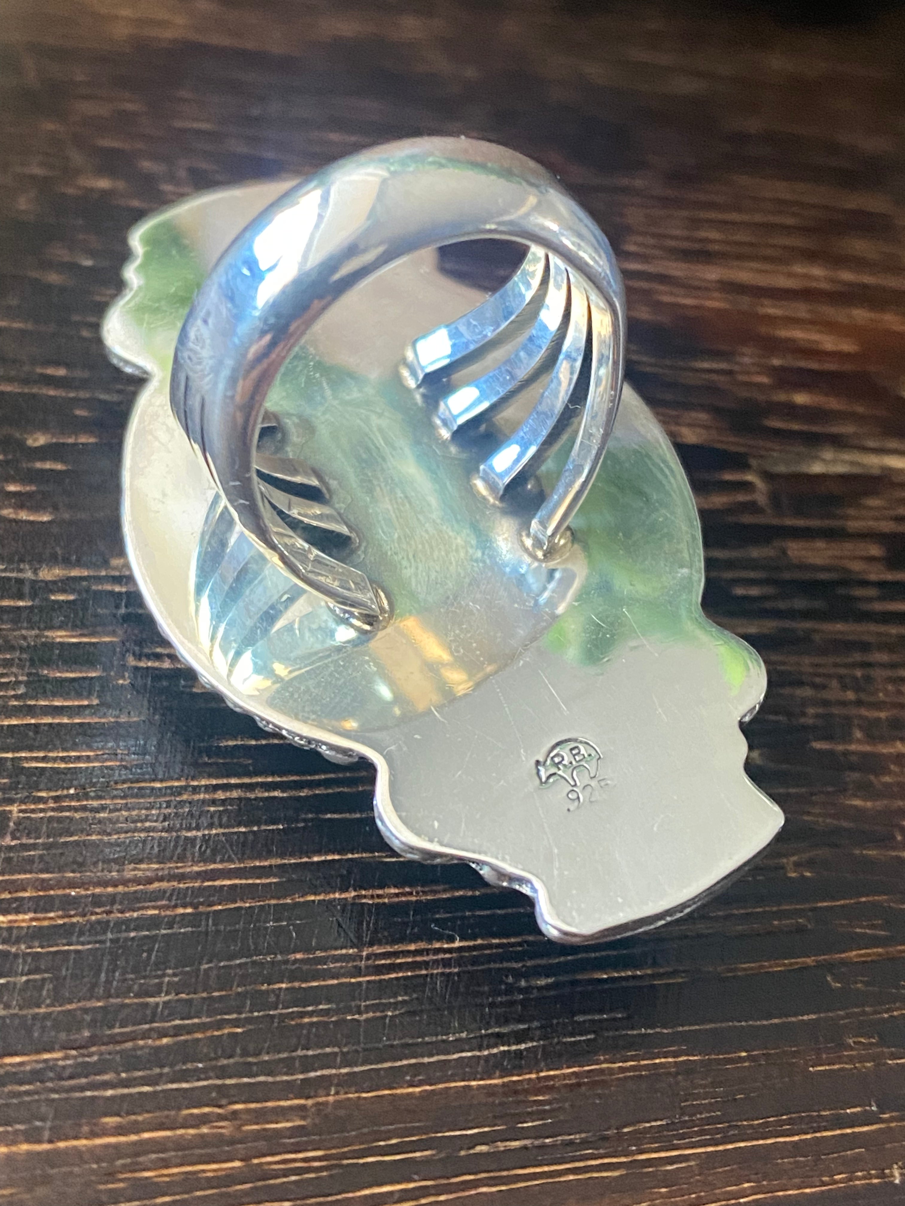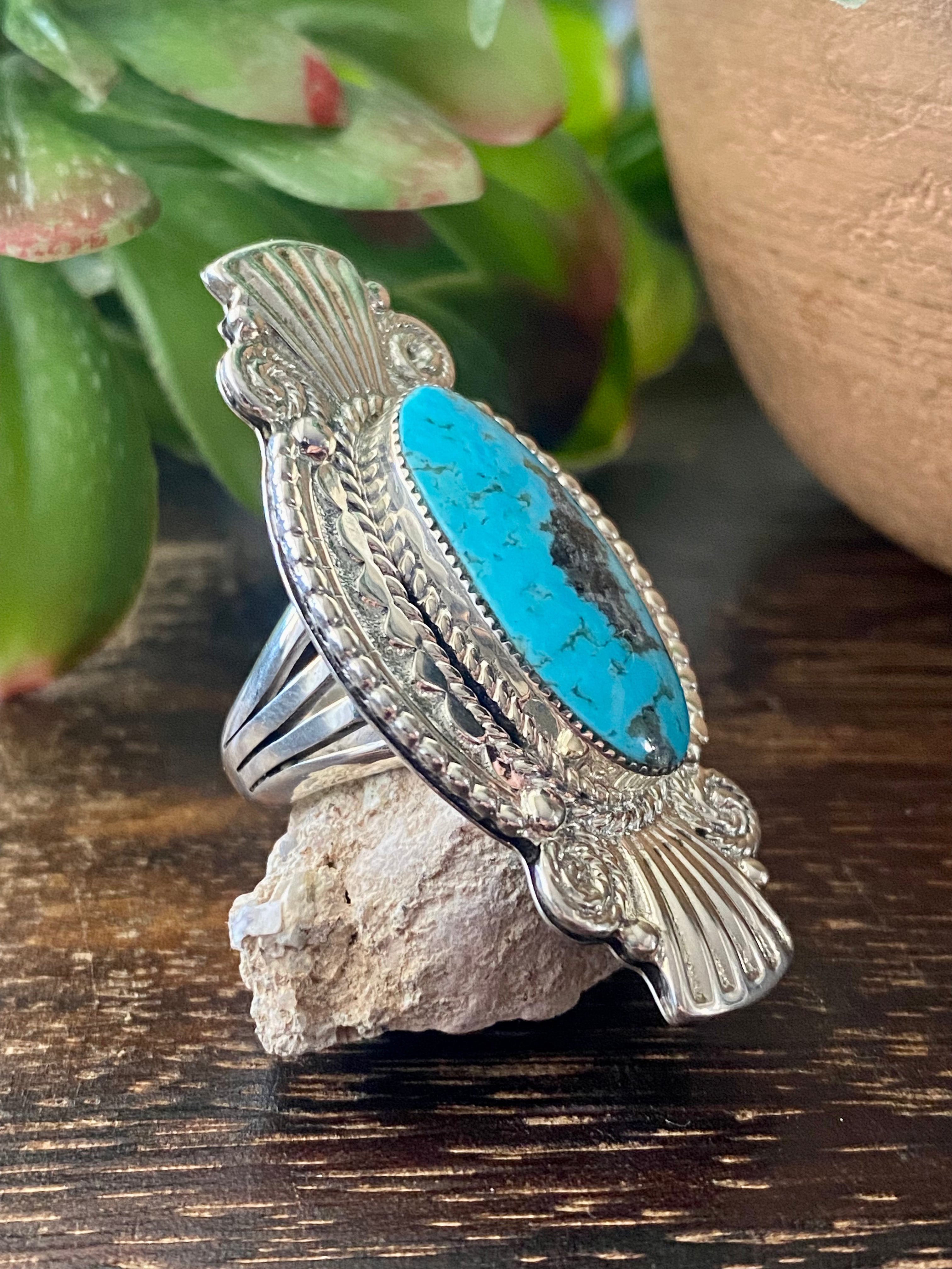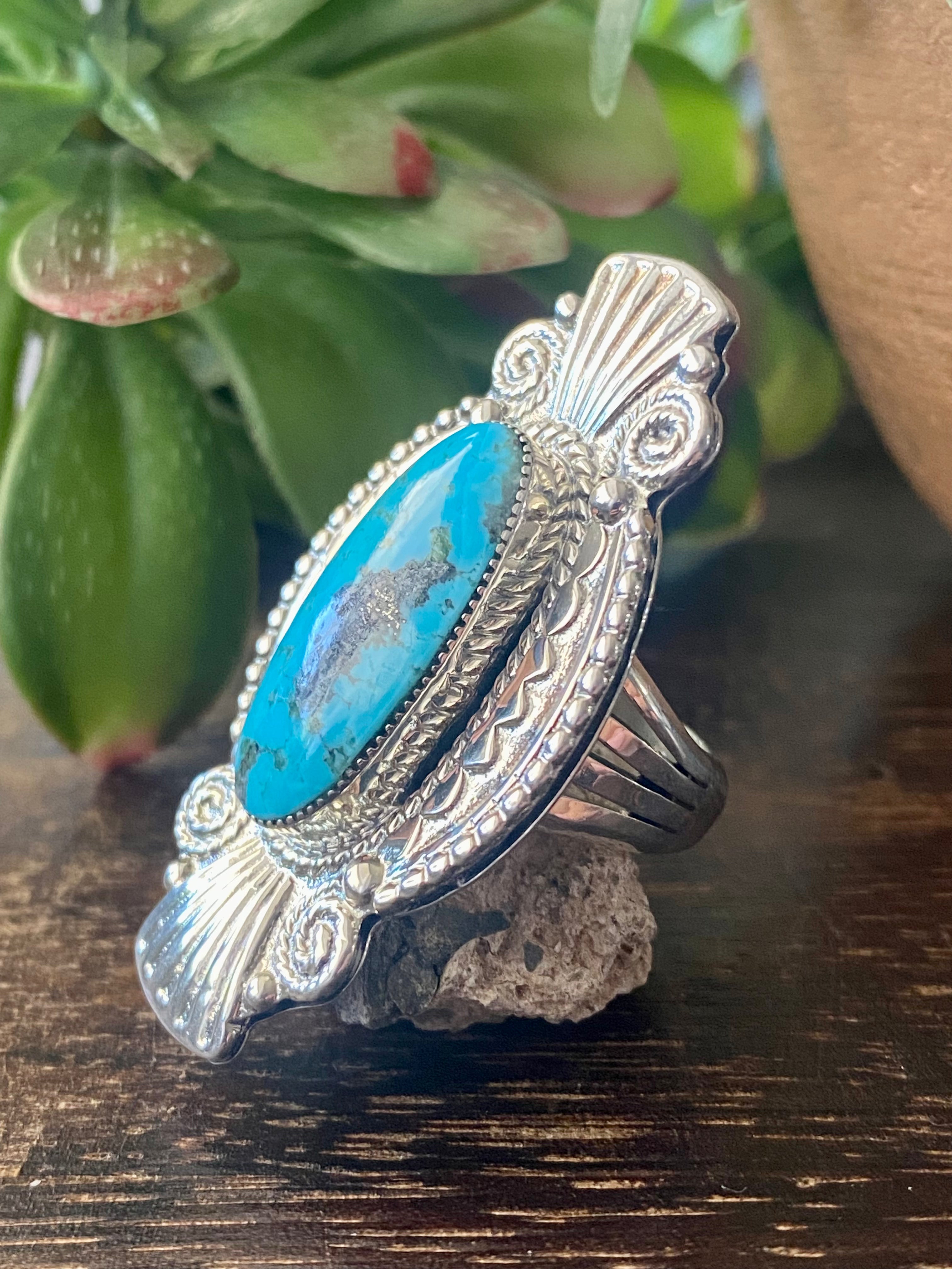 Navajo Made Kingman Turquoise & Sterling Silver Ring Size 6. It measures just under 2 inches long and 1 1/8 inches wide. Signed by the artist and stamped sterling silver.